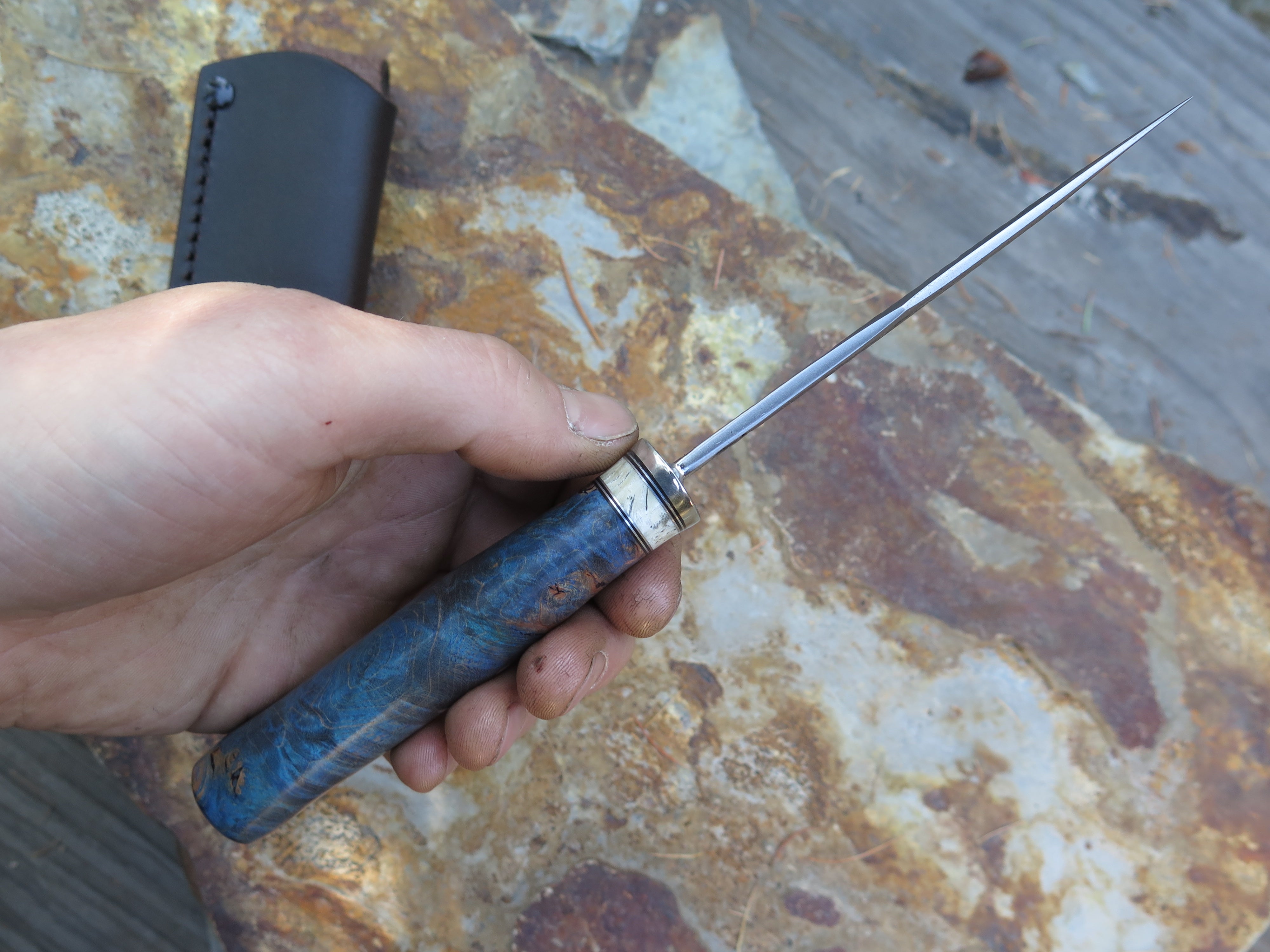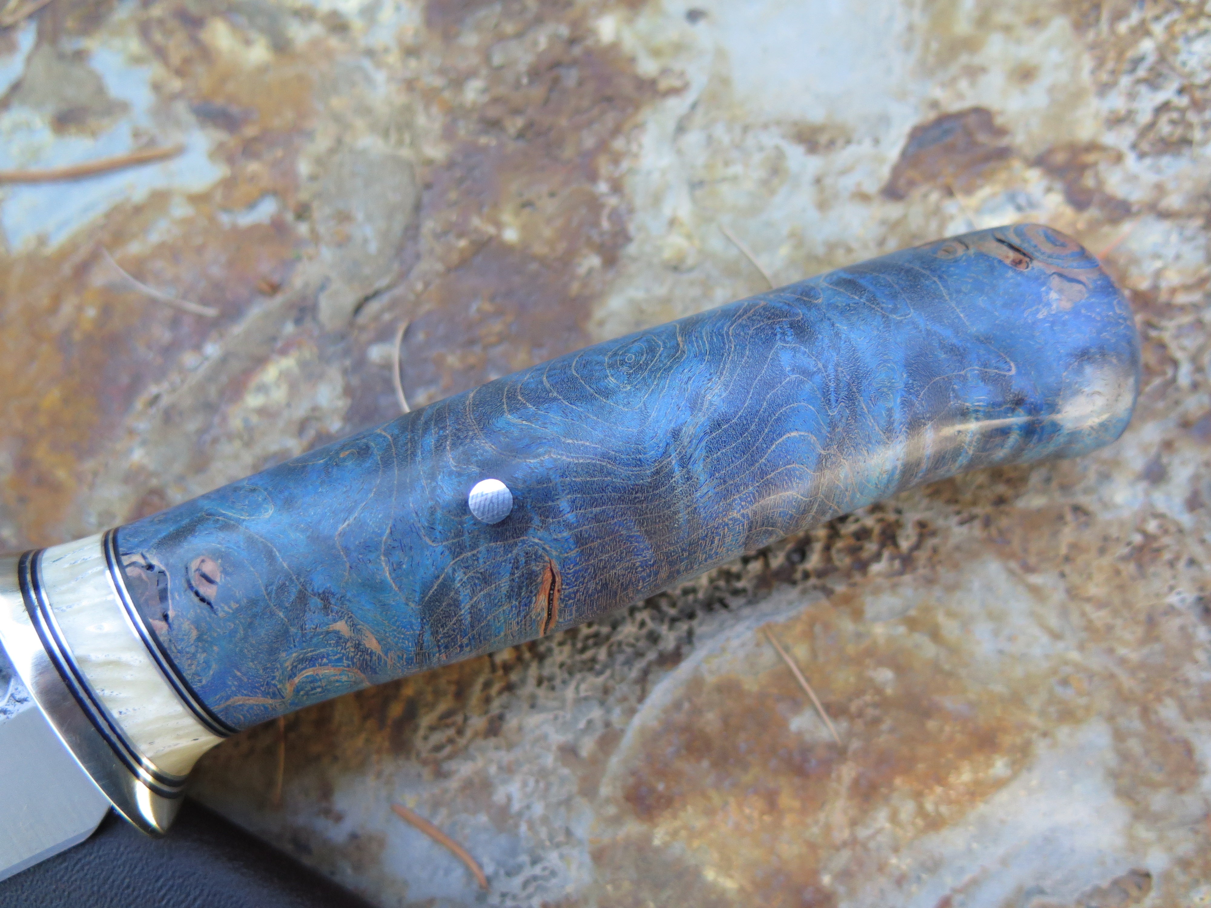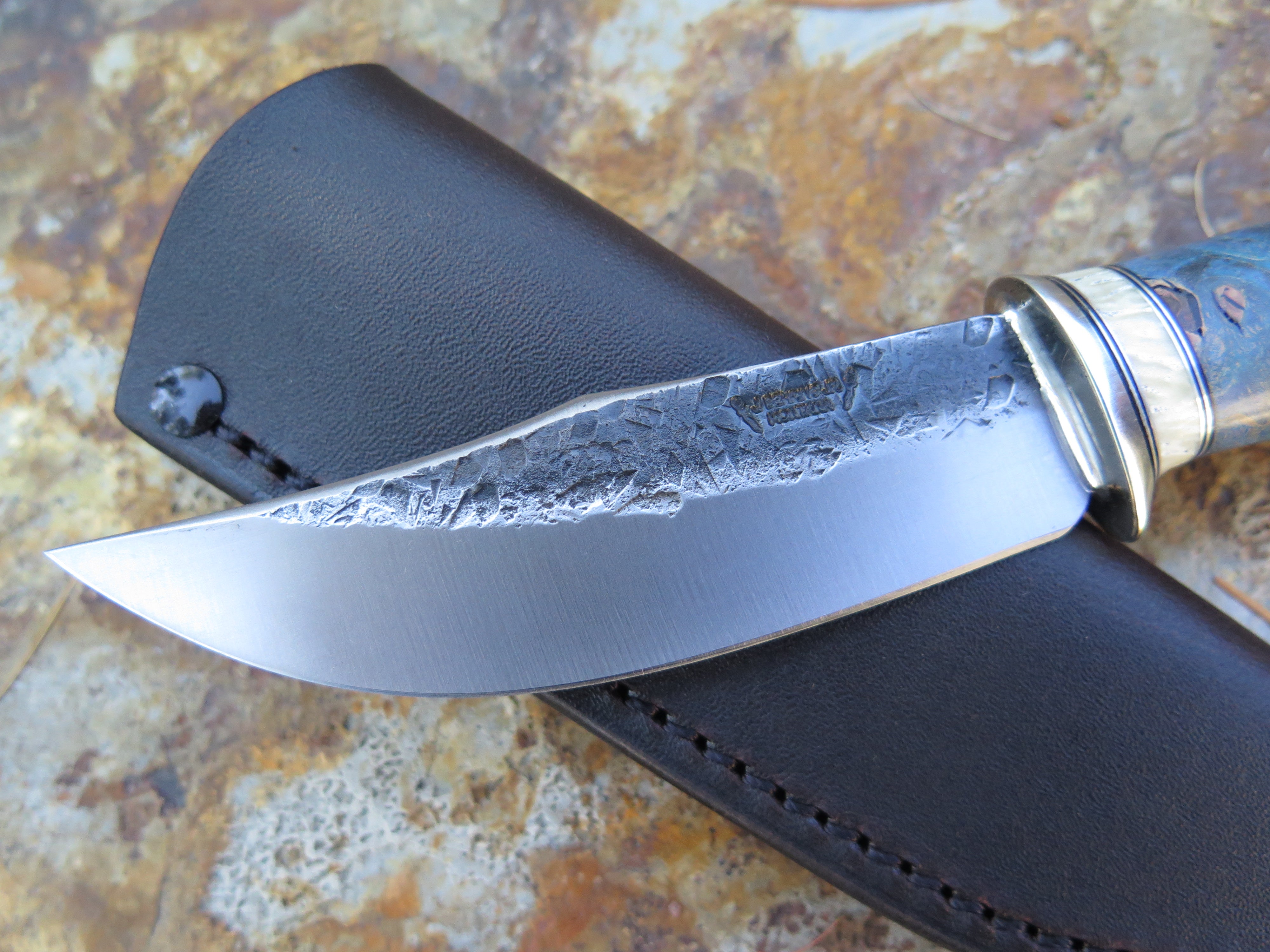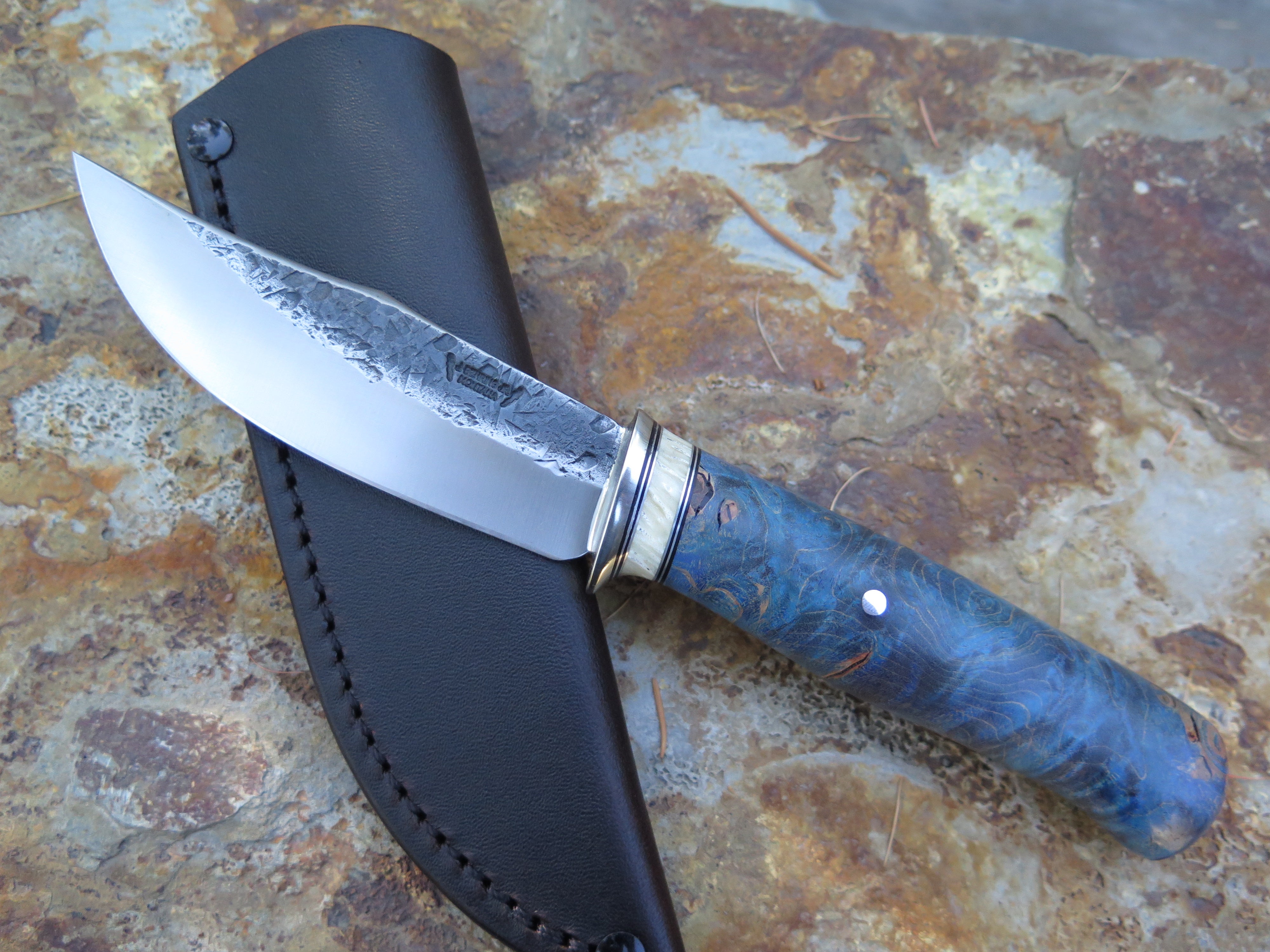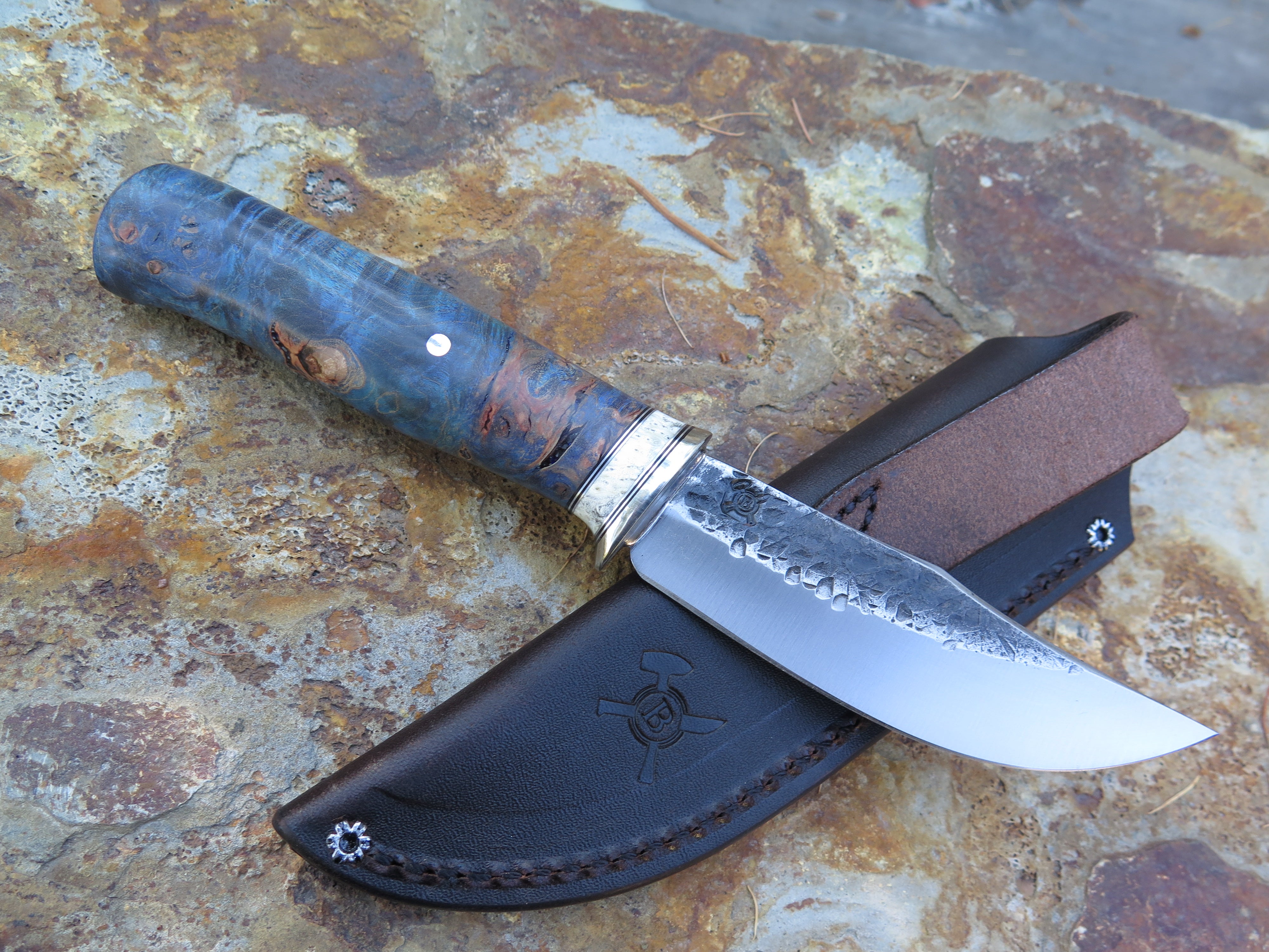 This unique new addition to the Behring Made© Archives is a Clip Point that is hand forged from 1/8” thick high carbon 01 tool steel and measures 4 1/4” from tip to guard with a razor sharp hollow grind and a hammermark finish. The nickel silver guard is soldered in place above black, musk ox boss and aluminum spacers with a premium stabilized maple burl handle that is pinned through the tang with aluminum. The overall length measures 8 3/8” and it comes in a classic leather belt pouch sheath. Please allow 4-8 weeks for production and delivery. Material figure will slightly vary and we 100% guarantee satisfaction. Contact for more info or mods!