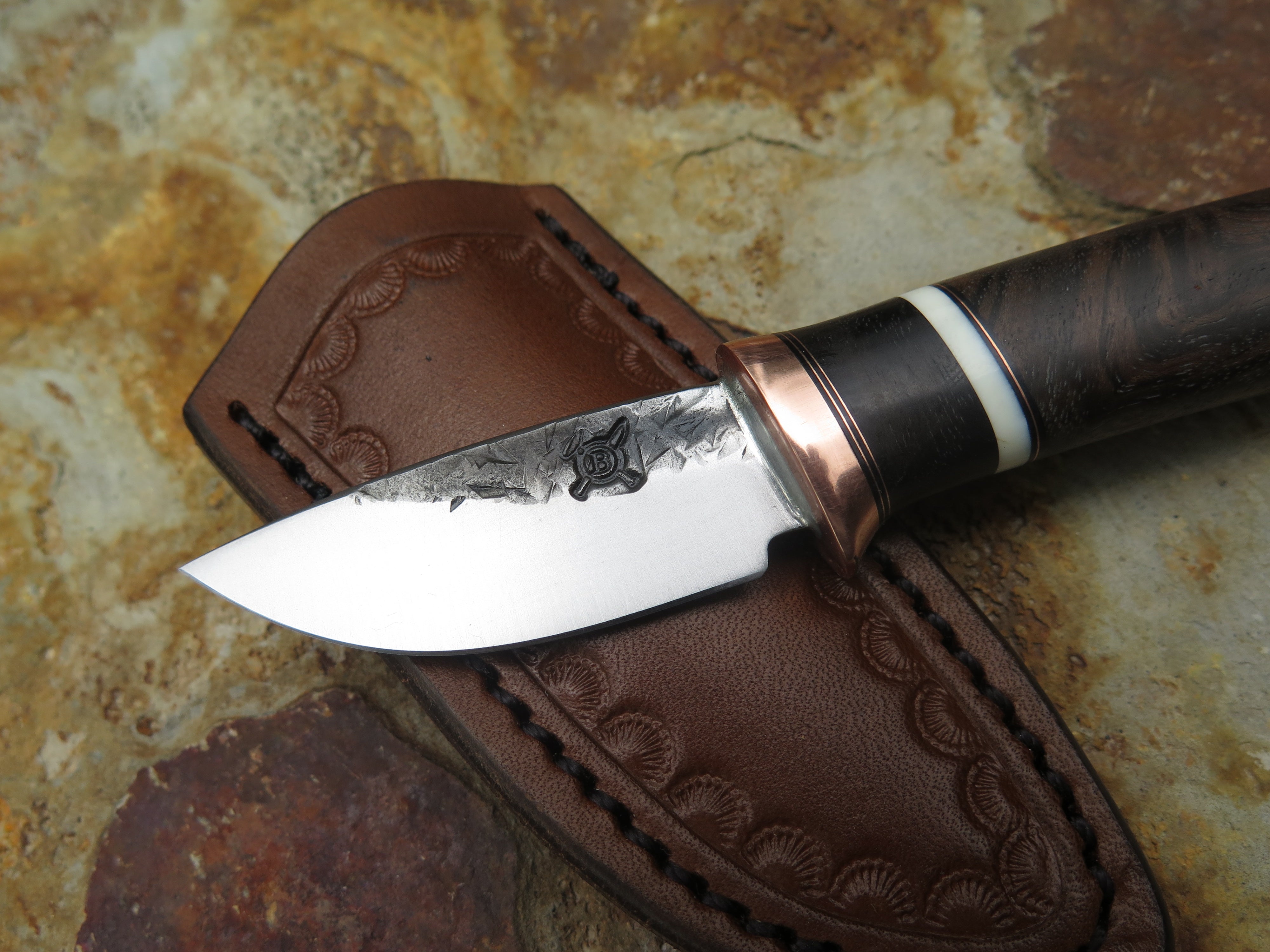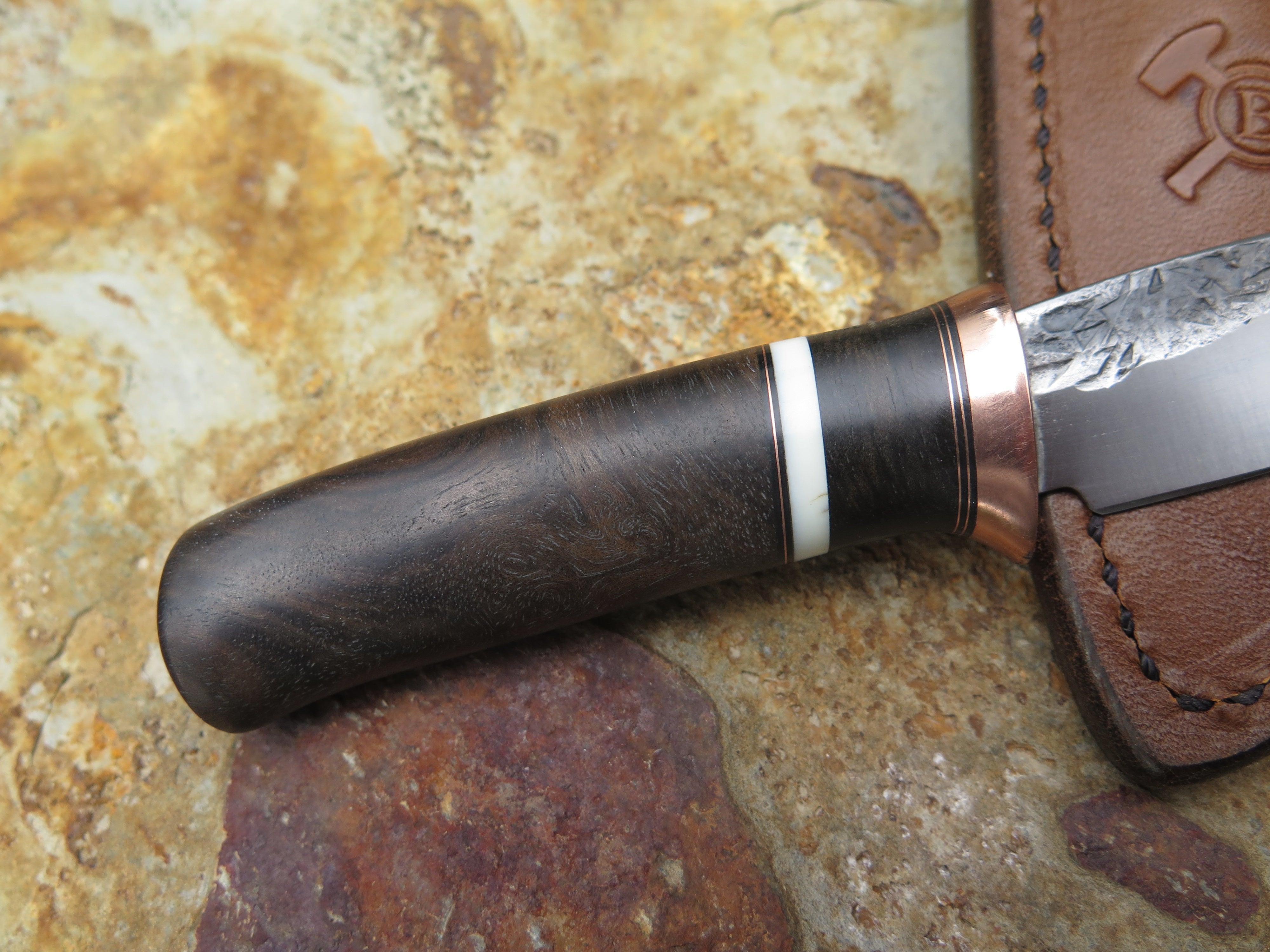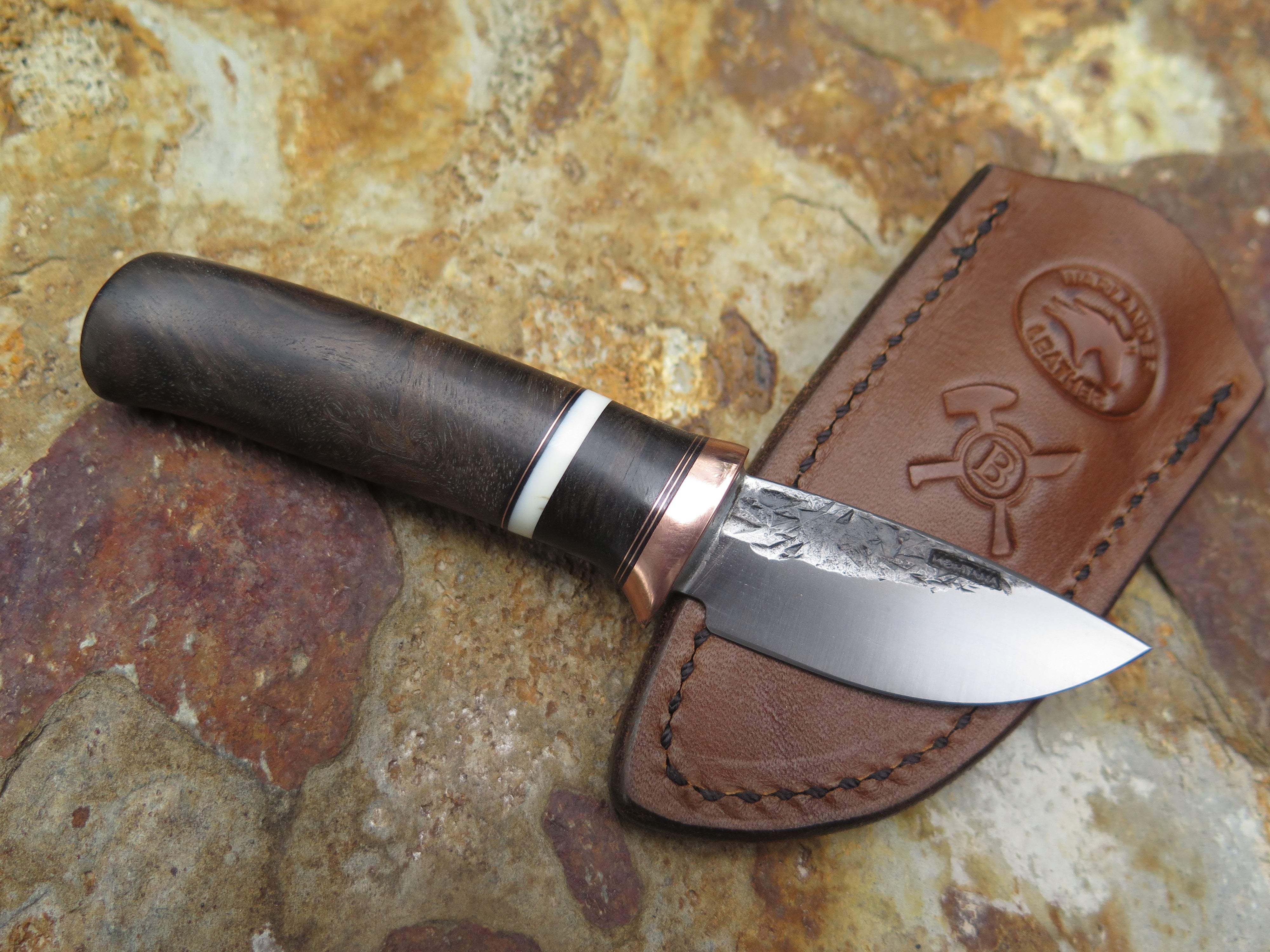 This beautiful new 5th pocket from Behring Made© is hand forged from 1/8" thick high carbon 01 tool steel and it measures 2 1/4" from tip to guard with a razor sharp hollow grind and our hammermark finish. The copper guard is soldered in place above black fiber, copper, ebony and mammoth ivory spacers as well as a walnut handle that brings the overall length out to 5 1/4". This one comes in a 5th pocket sleeve from Warlander and we guarantee this rig for life!