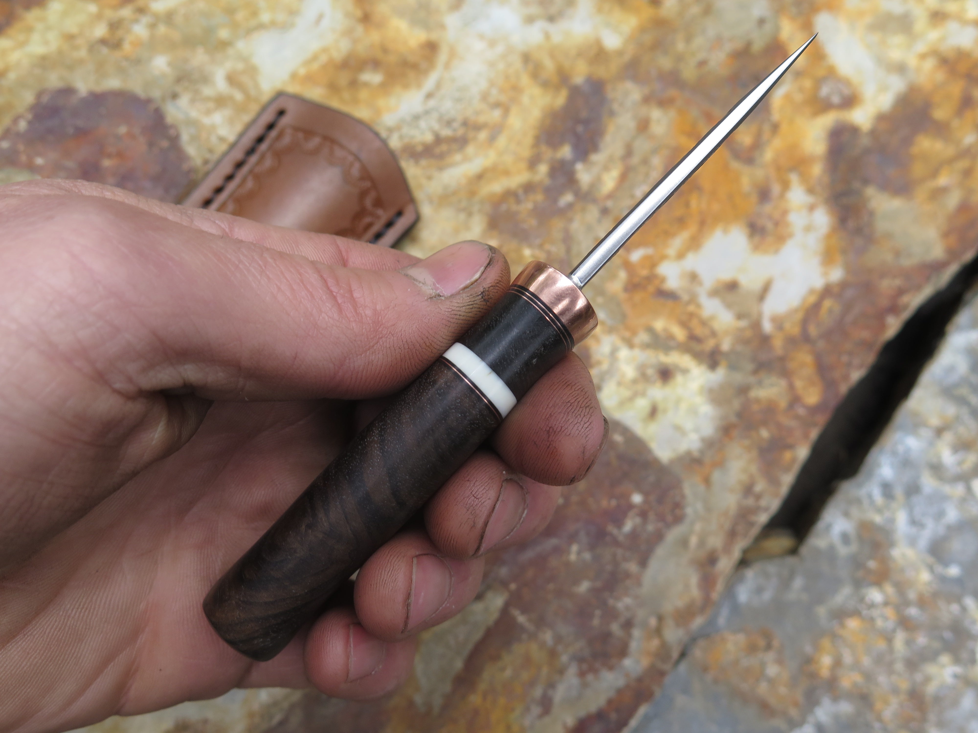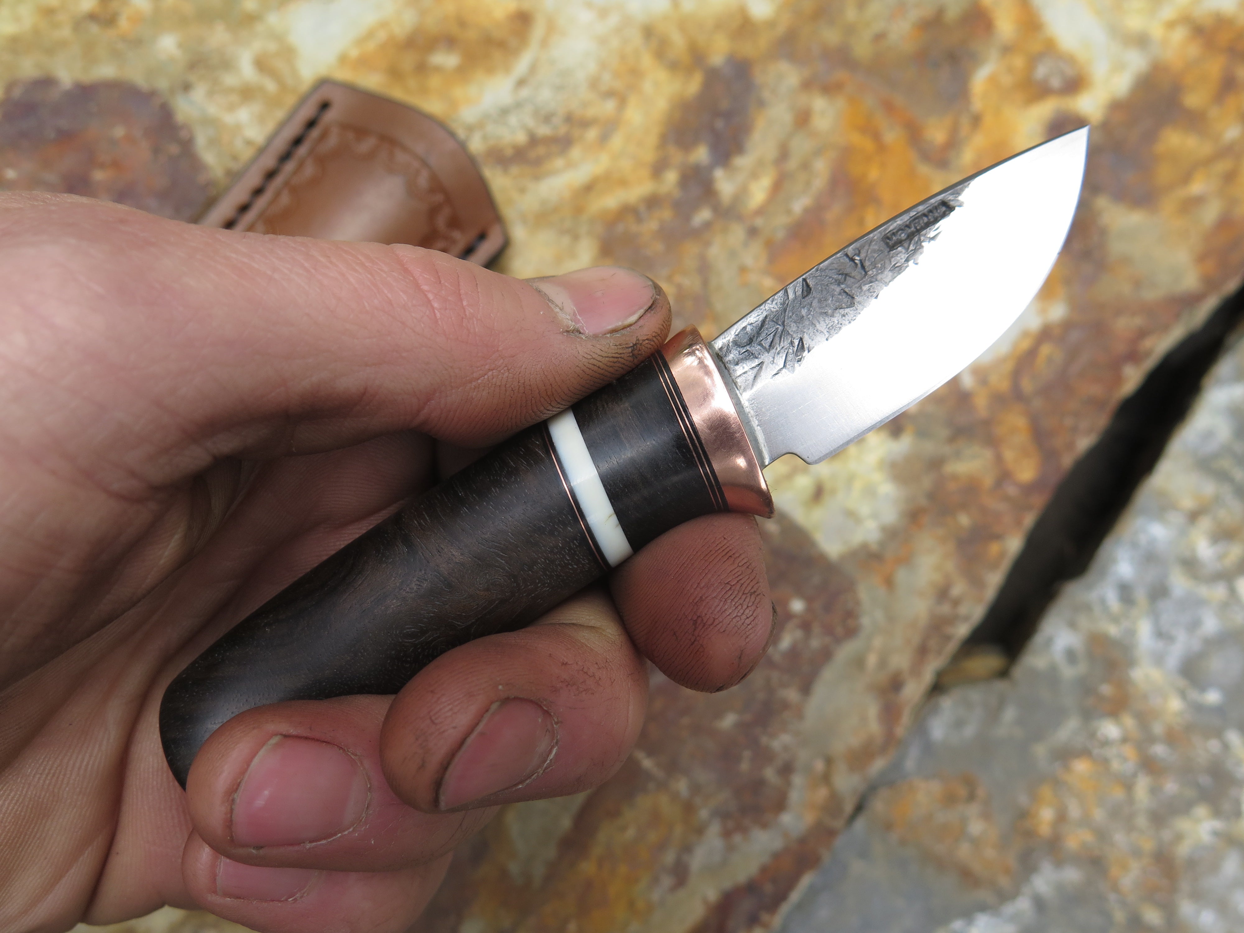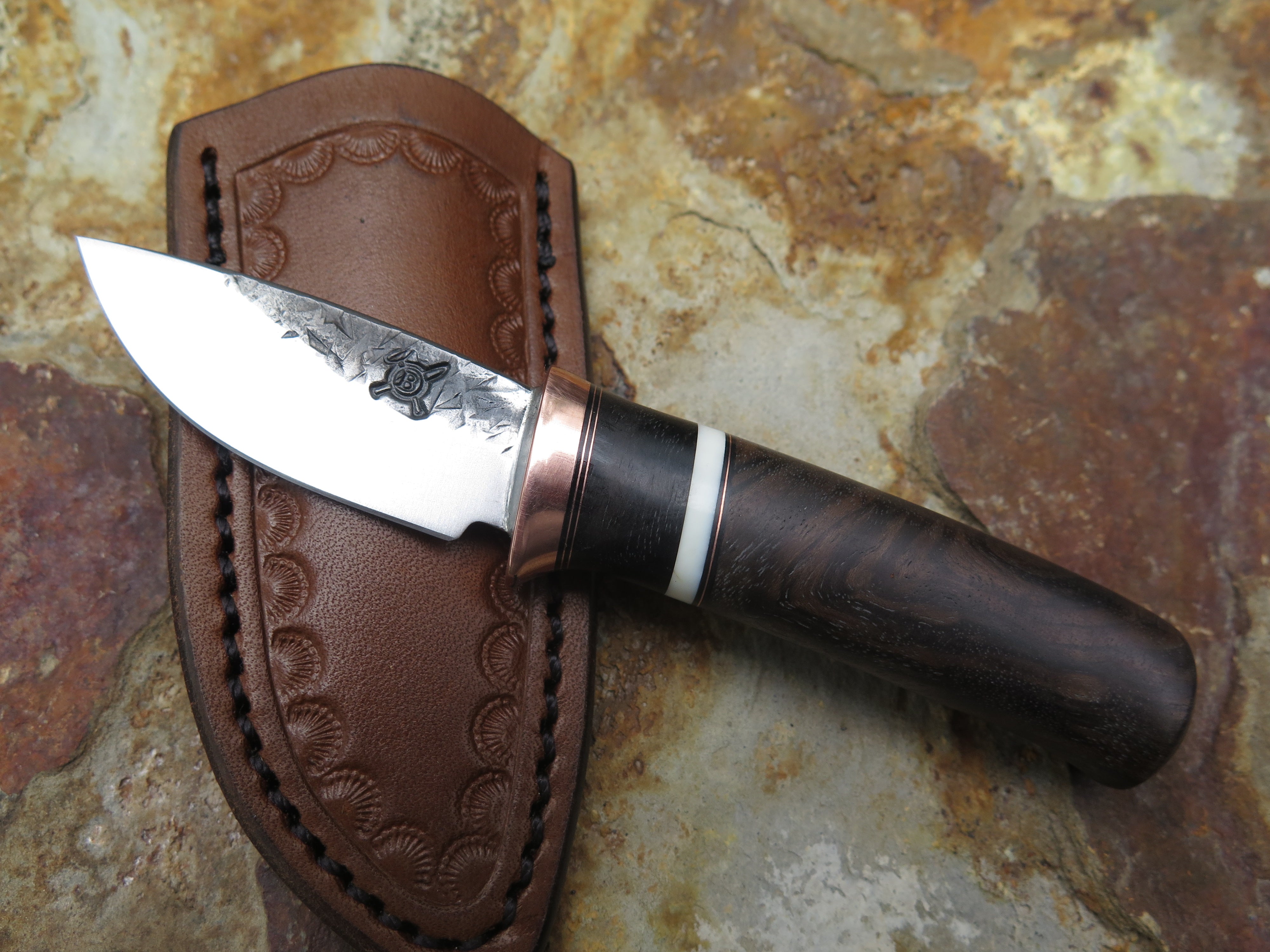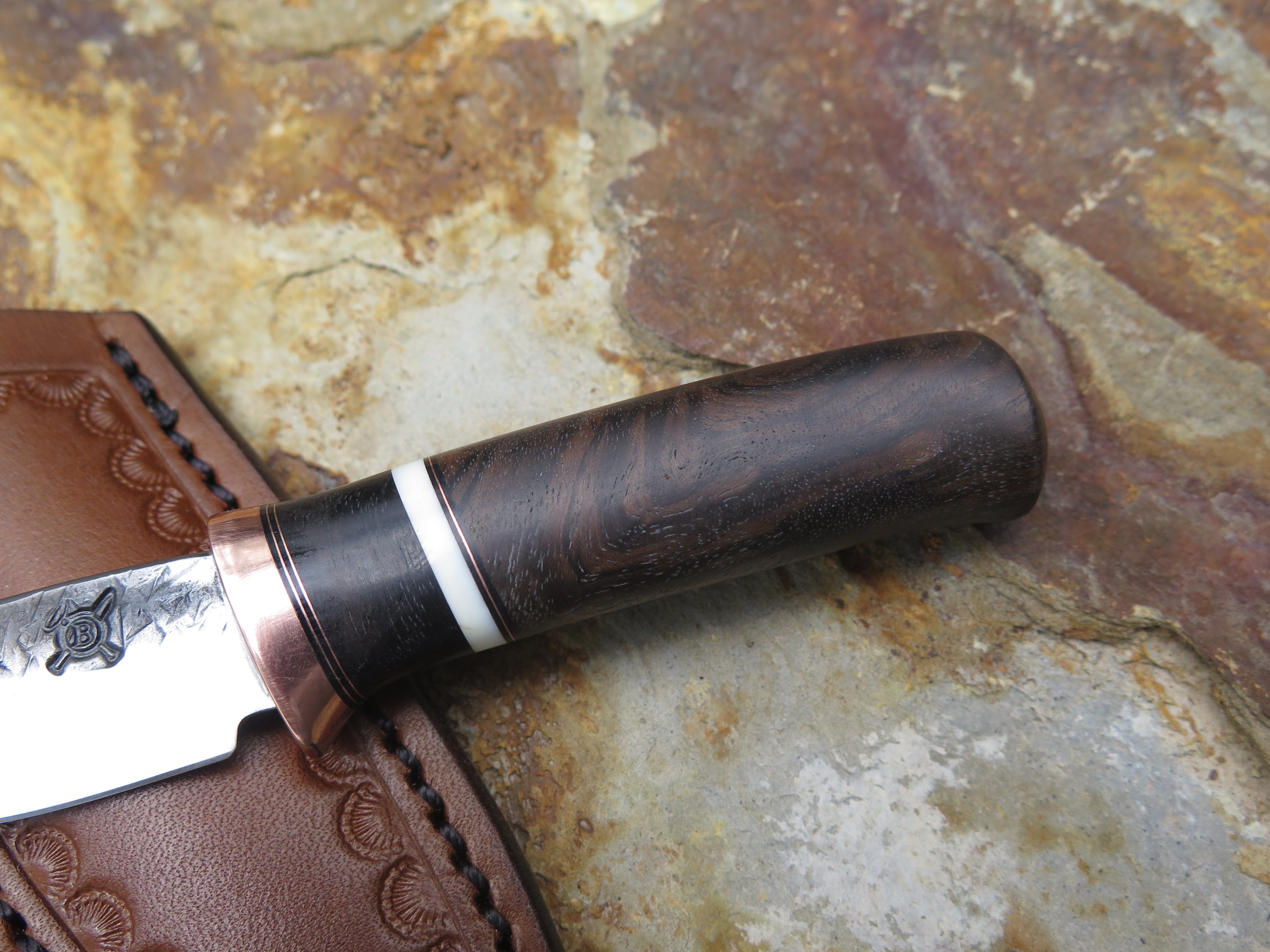 This beautiful new 5th pocket from Behring Made© is hand forged from 1/8" thick high carbon 01 tool steel and it measures 2 1/4" from tip to guard with a razor sharp hollow grind and our hammermark finish. The copper guard is soldered in place above black fiber, copper, ebony and mammoth ivory spacers as well as a walnut handle that brings the overall length out to 5 1/4". This one comes in a 5th pocket sleeve from Warlander and we guarantee this rig for life!