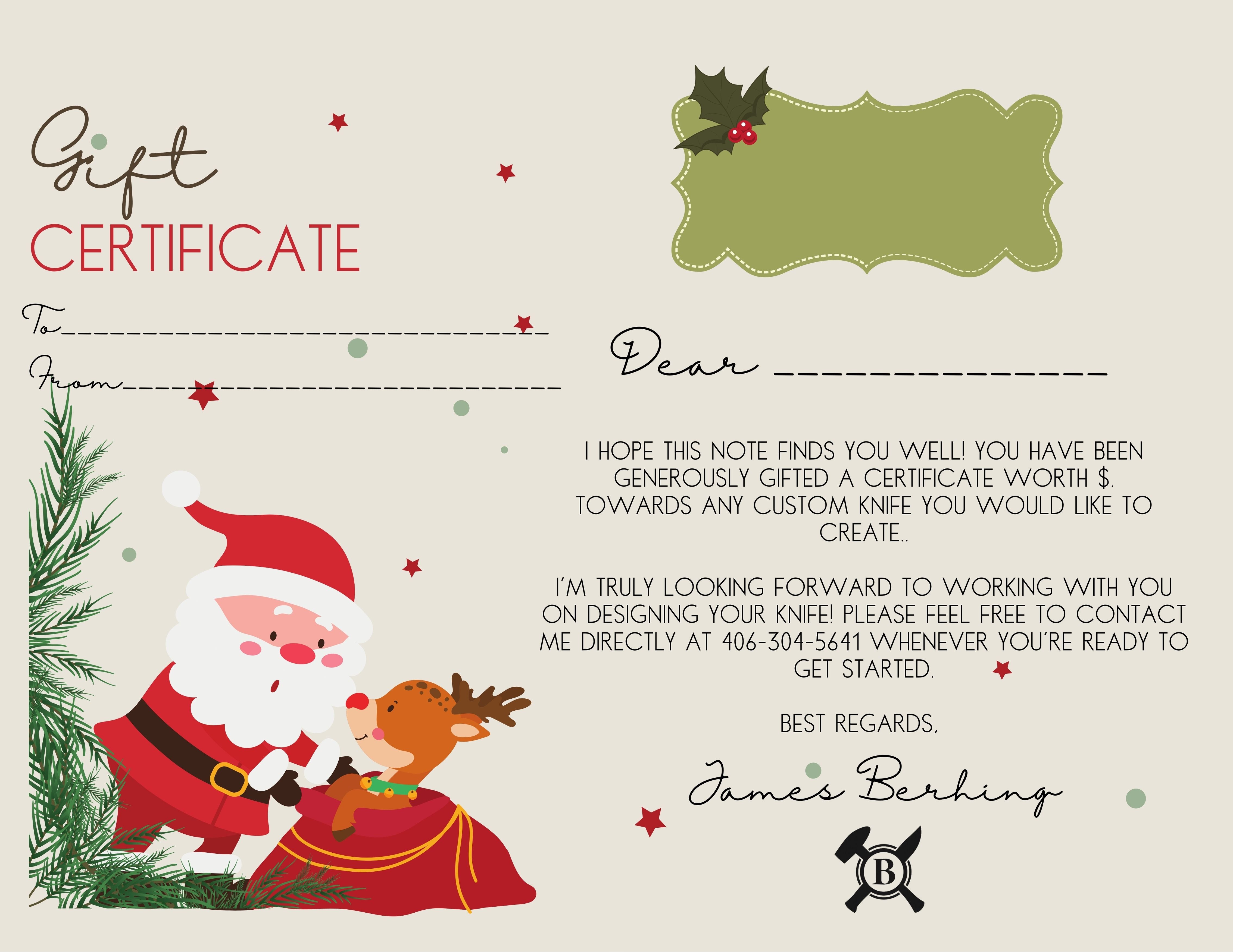 Give your loved ones the ultimate gift of choice with the Christmas Gift Card from Behring Made. Personalized and printed on a high-quality postcard, this gift card is perfect for any knife collector or Behring Made fan. With quick shipping to the lower 48 and longer delivery times to Hawaii, Alaska, and Puerto Rico, you can give the gift of luxury and exclusivity this holiday season. This gift card is also an E-Card, therefore a record of the card will be on file with us for your convenience.