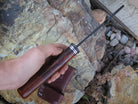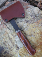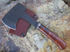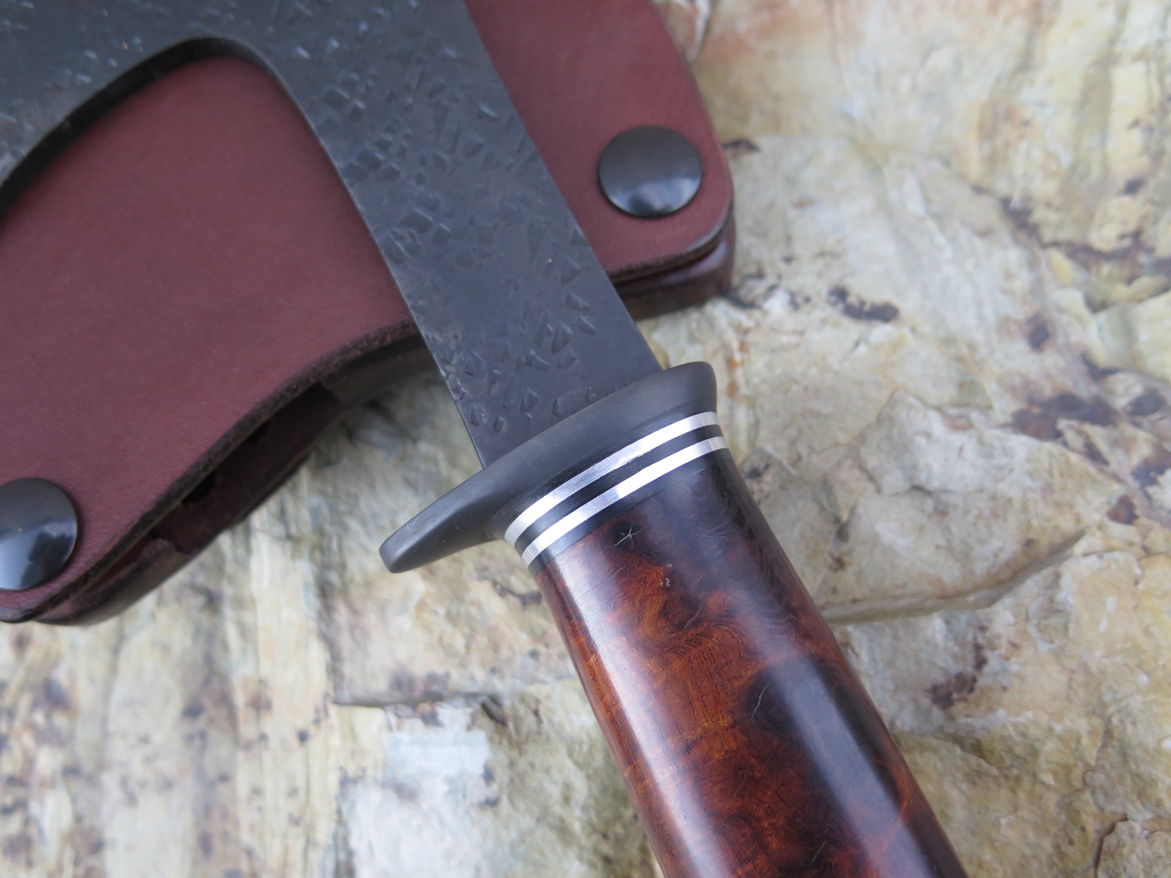 This incredible new hatchet from Behring Made© is hand forged from 3/16" thick high carbon 01 tool steel and it measures a 3 1/8" bit and 5 1/2" from the top of the head to the guard with a razor sharp hollow grind, hammermarks and our forced patina blued finish. The blued steel guard is soldered in place above black fiber and aluminum spacers with a premium desert ironwood burl handle that is also pinned with aluminum. The overall length measures 11 3/4" and it comes in custom Warlander Leather.