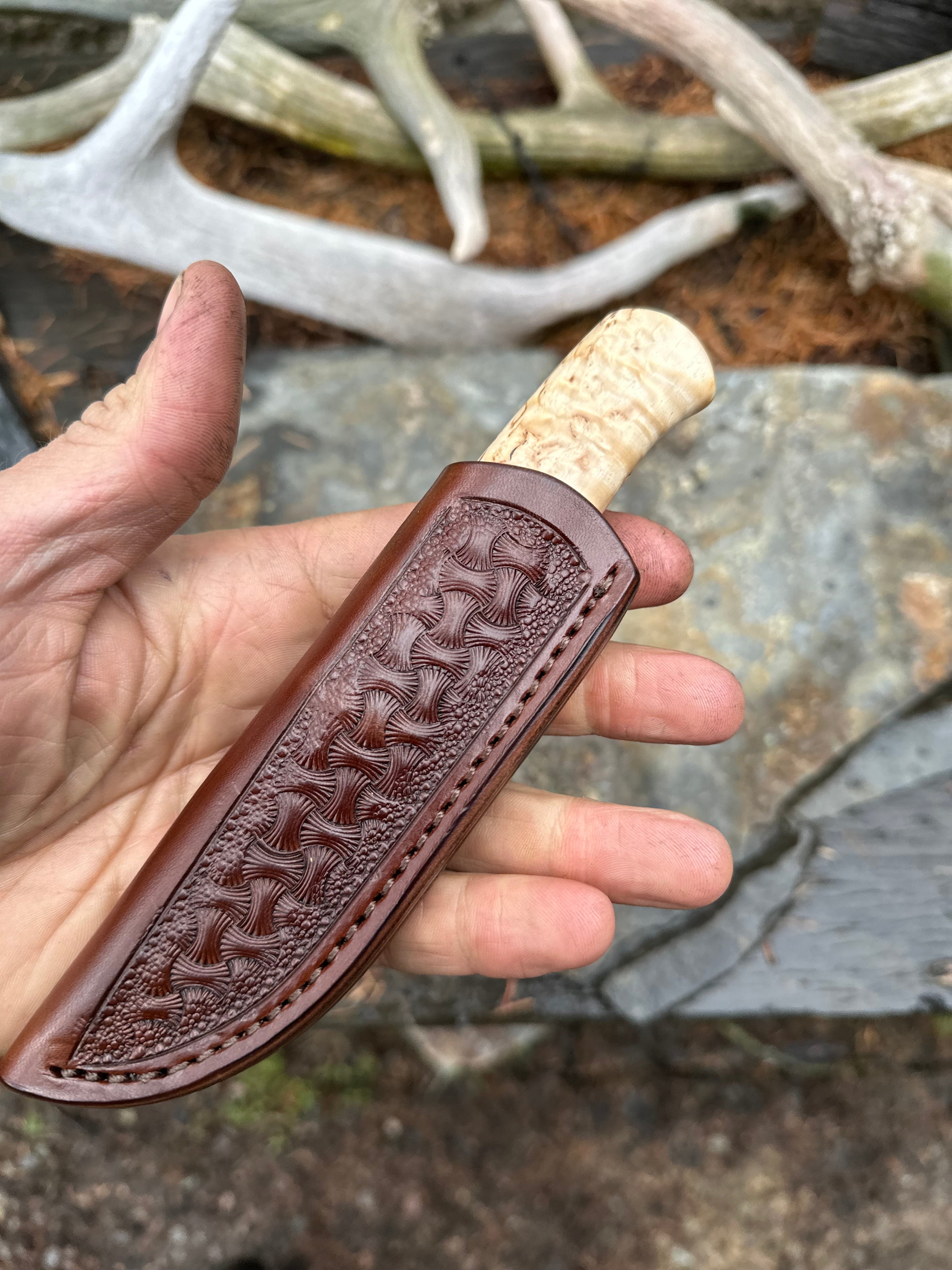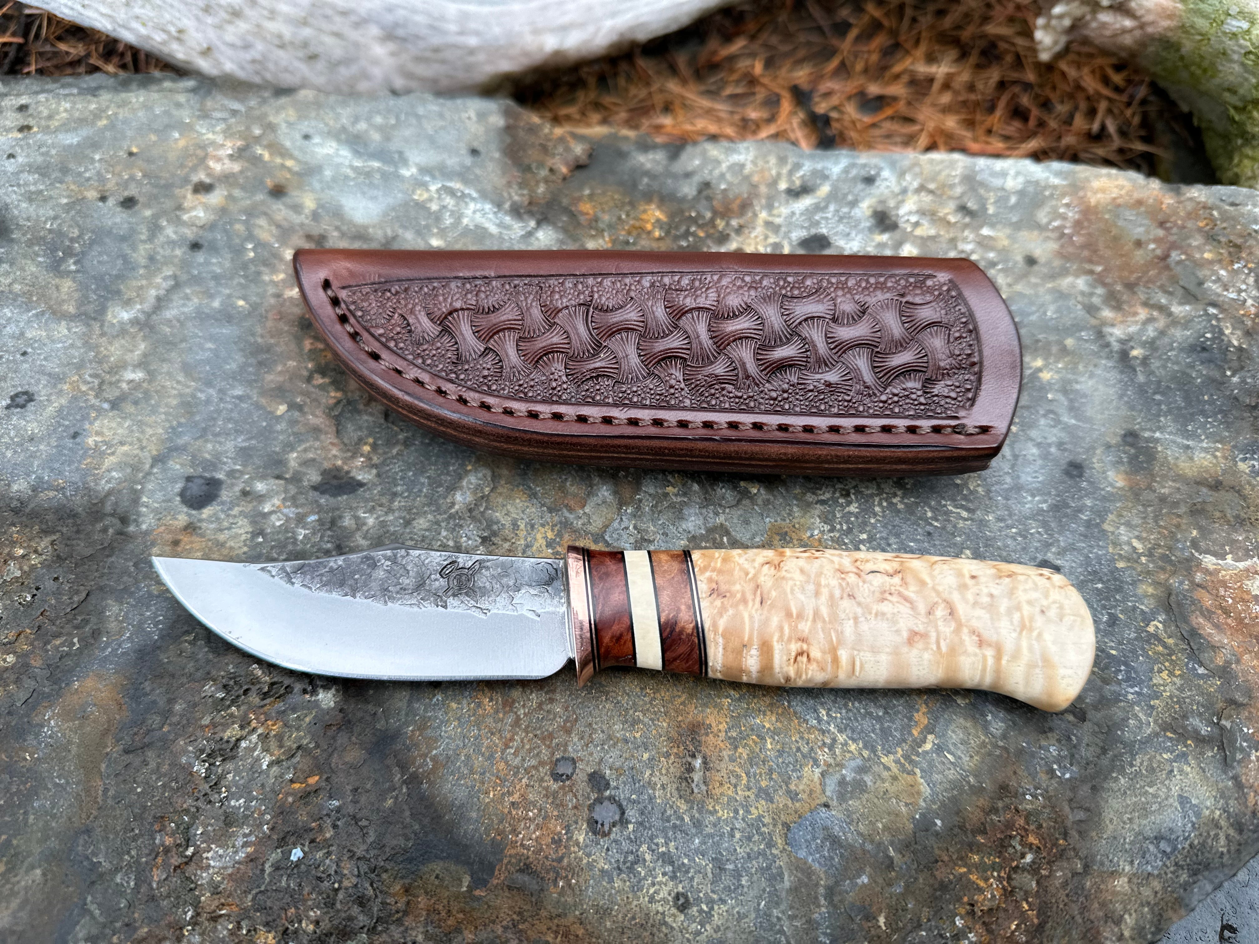 Karelian Birch, Amboyna, & Mammoth Ivory Clip Point Pocket Hunter