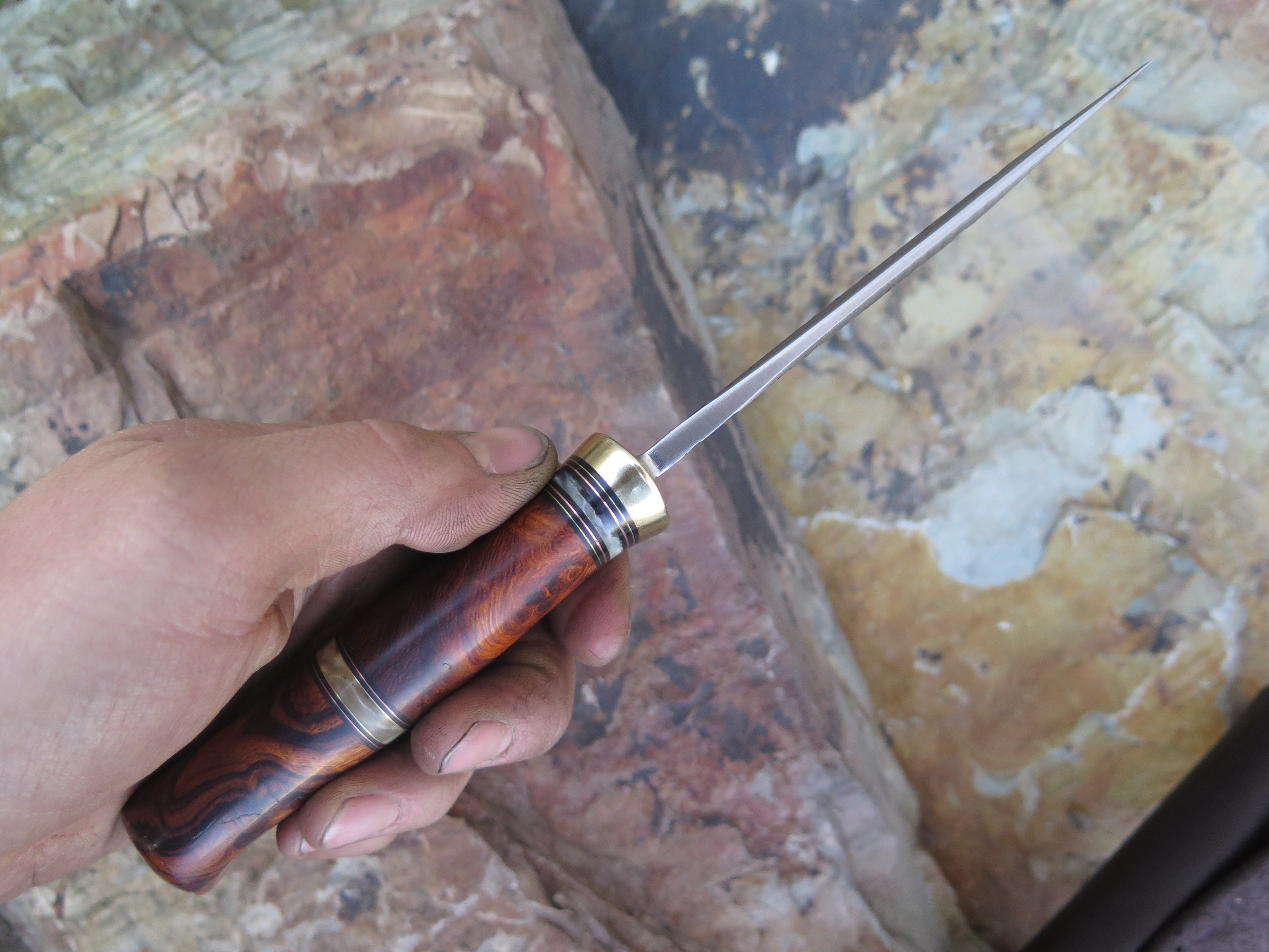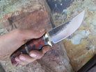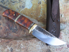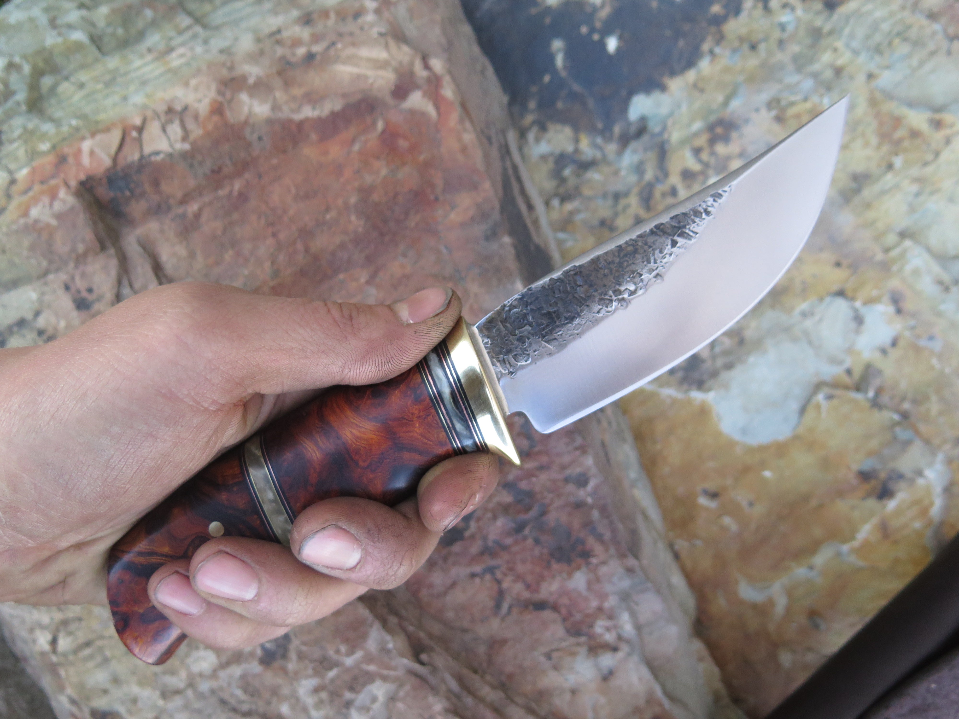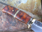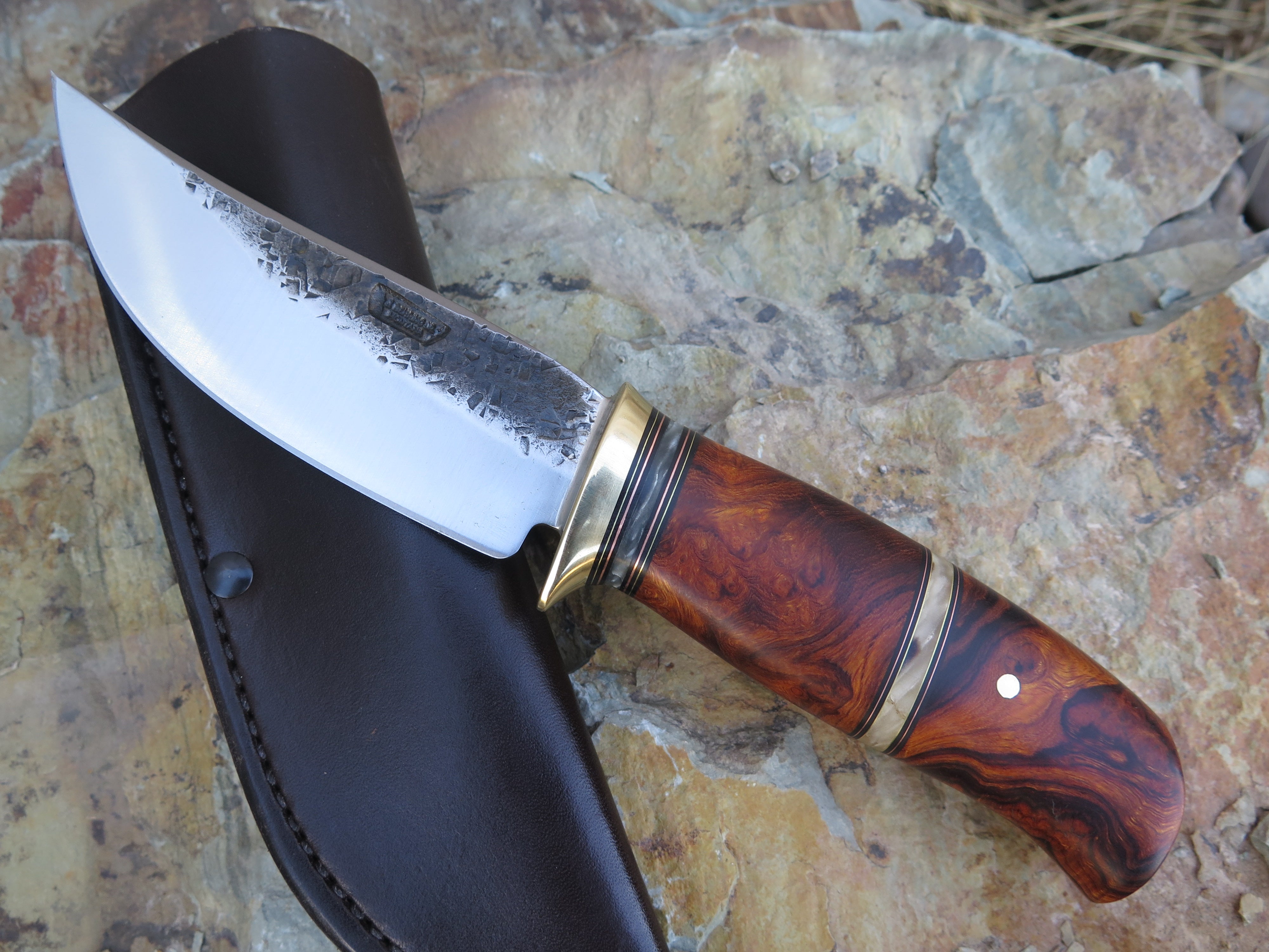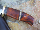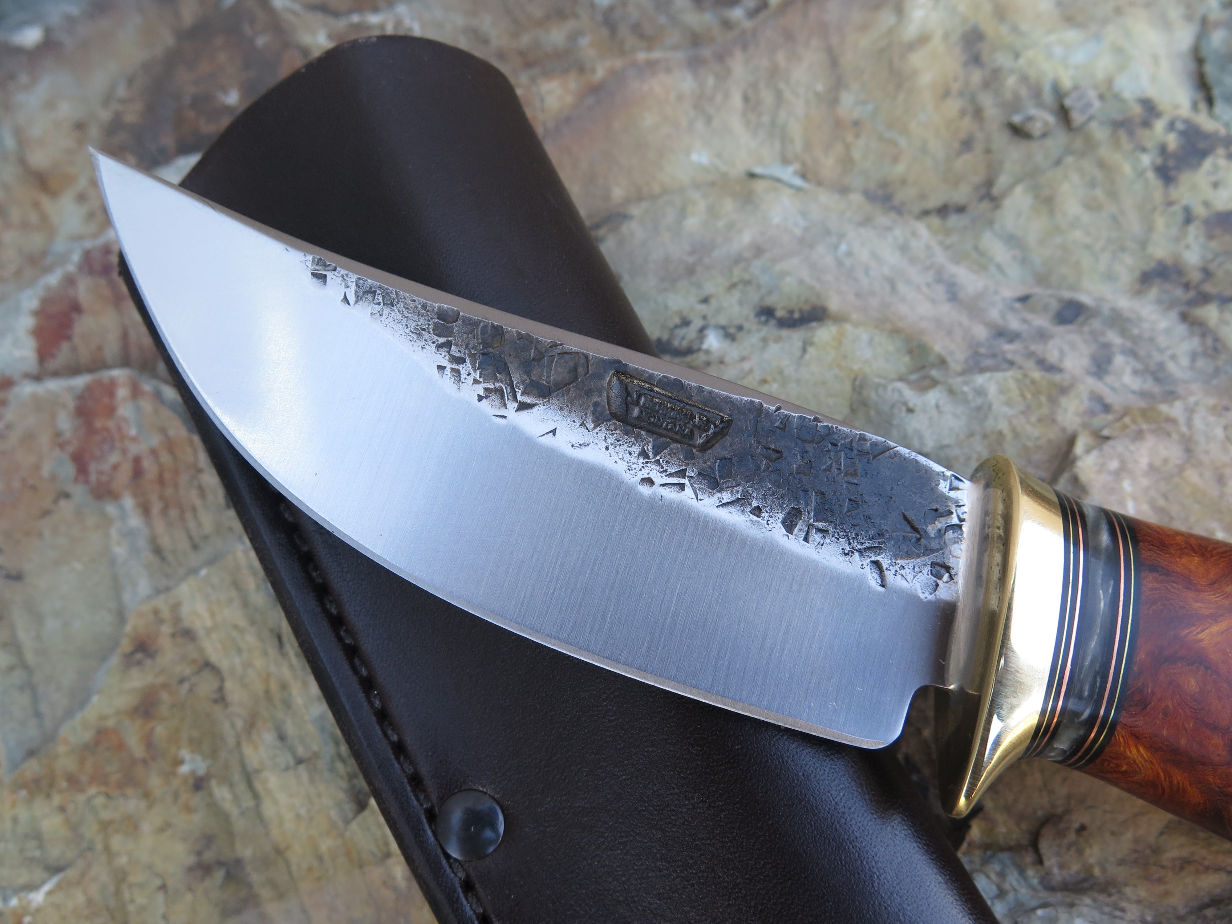 This remarkable new Hunter from Behring Made™ is hand forged from 3/16" thick high carbon 01 tool steel and it measures 4 1/2" from tip to guard with a razor sharp hollow grind and our hammermark finish. The brass guard is silver soldered in place above black fiber, brass, copper and two beautiful Dall sheep horn spacers and a two-piece desert ironwood burl handle that's pinned through the tang with brass. The overall length measures 9" and it comes in a Warlander Leather pouch sheath.
