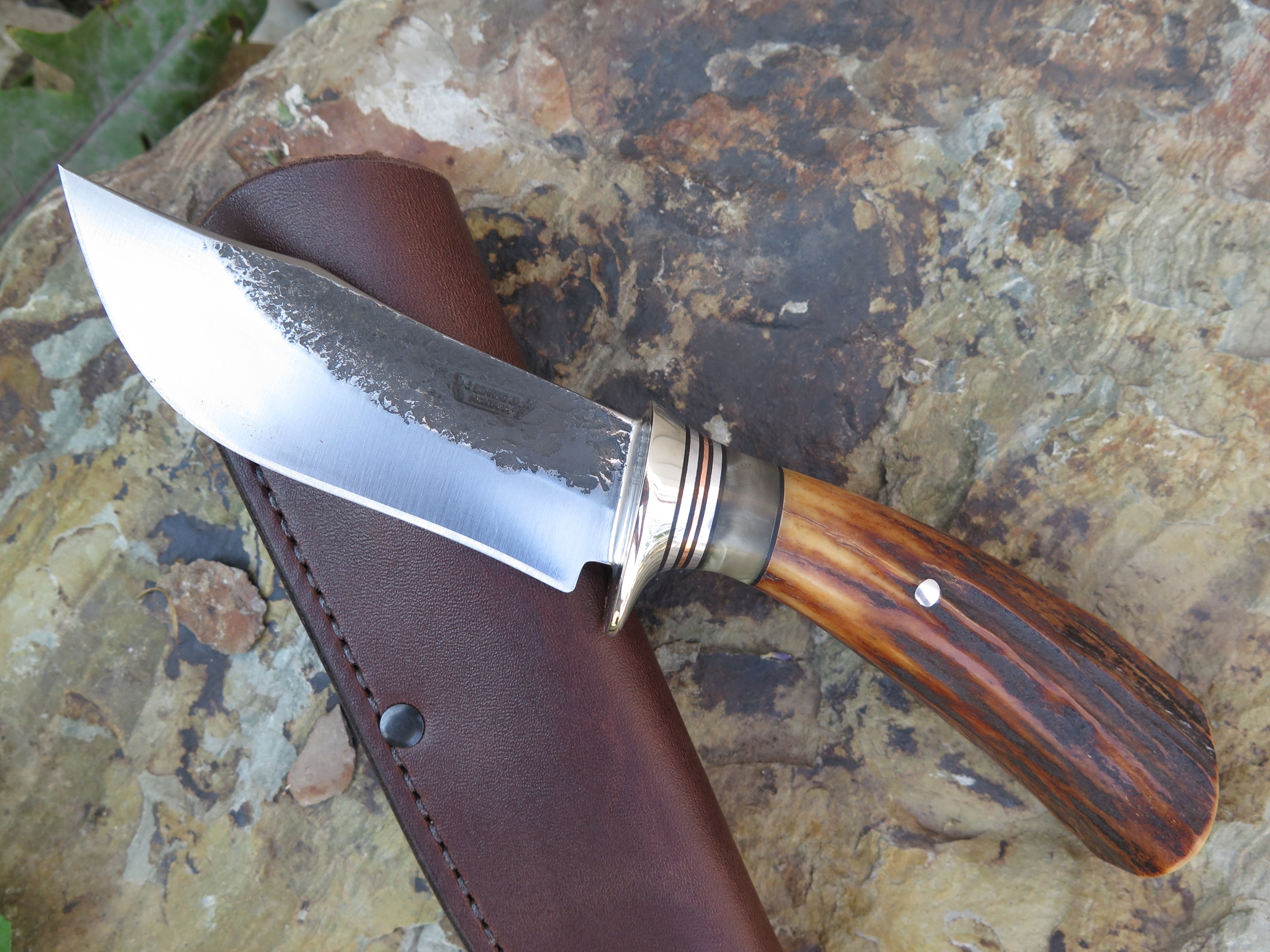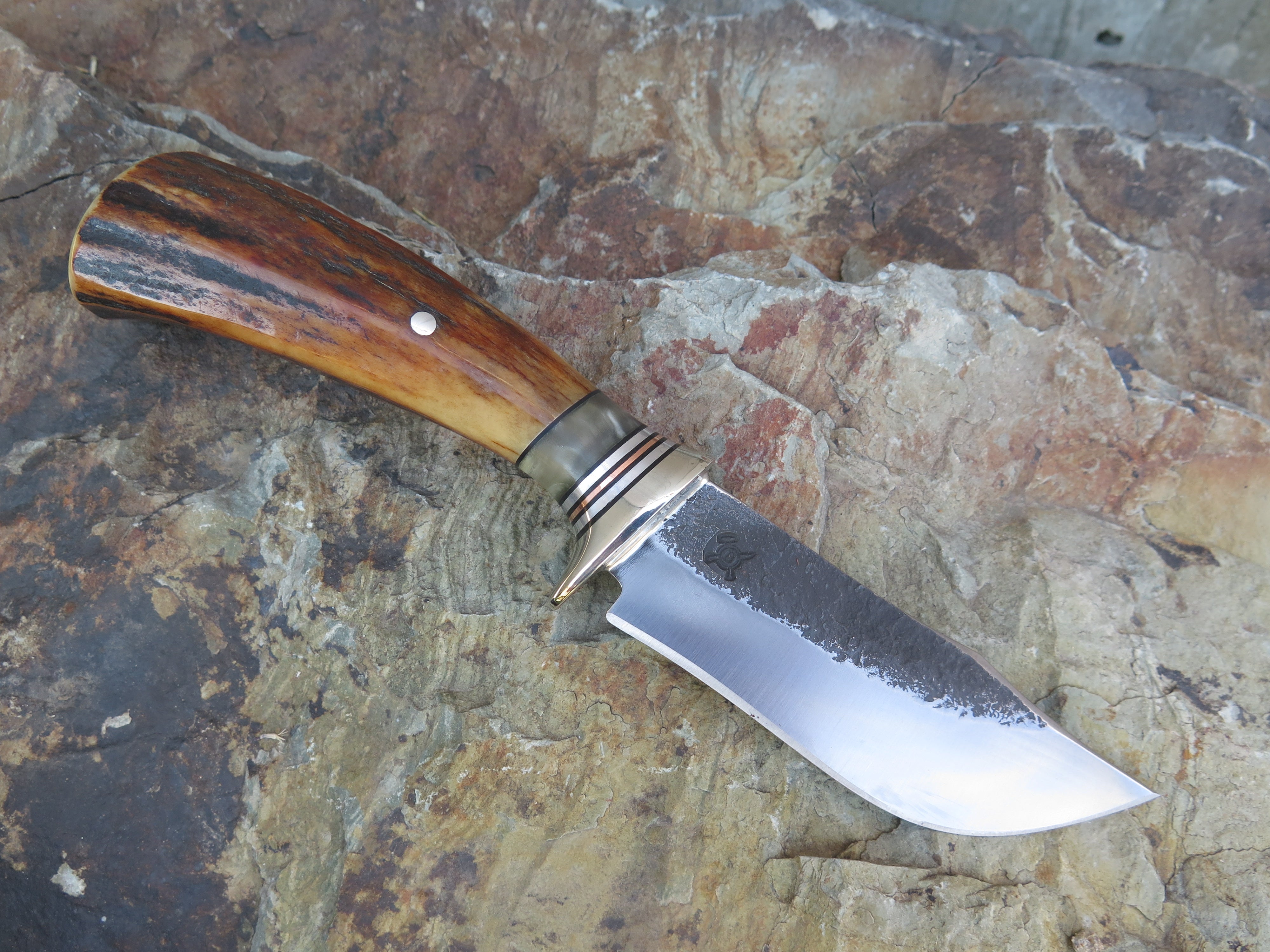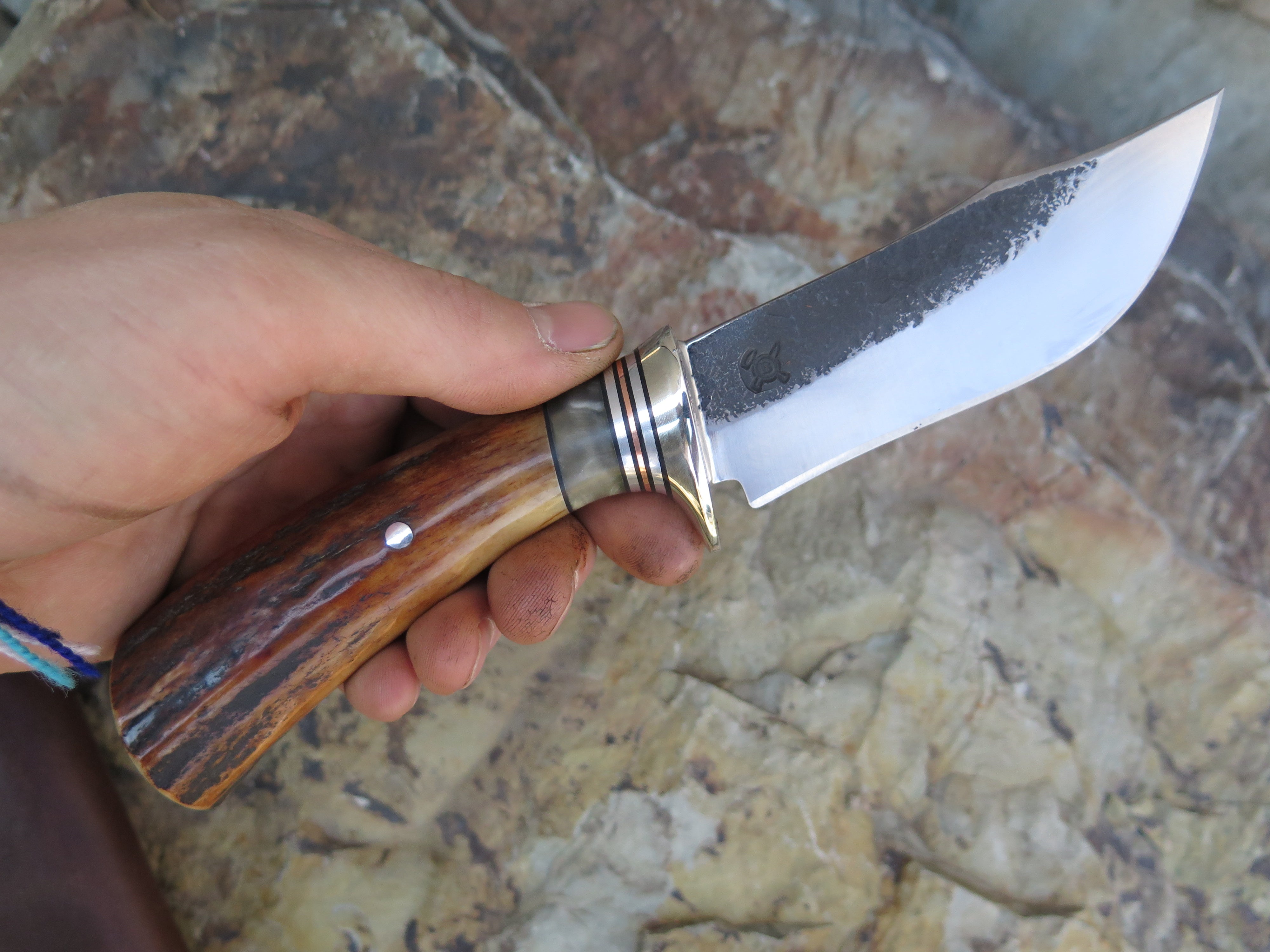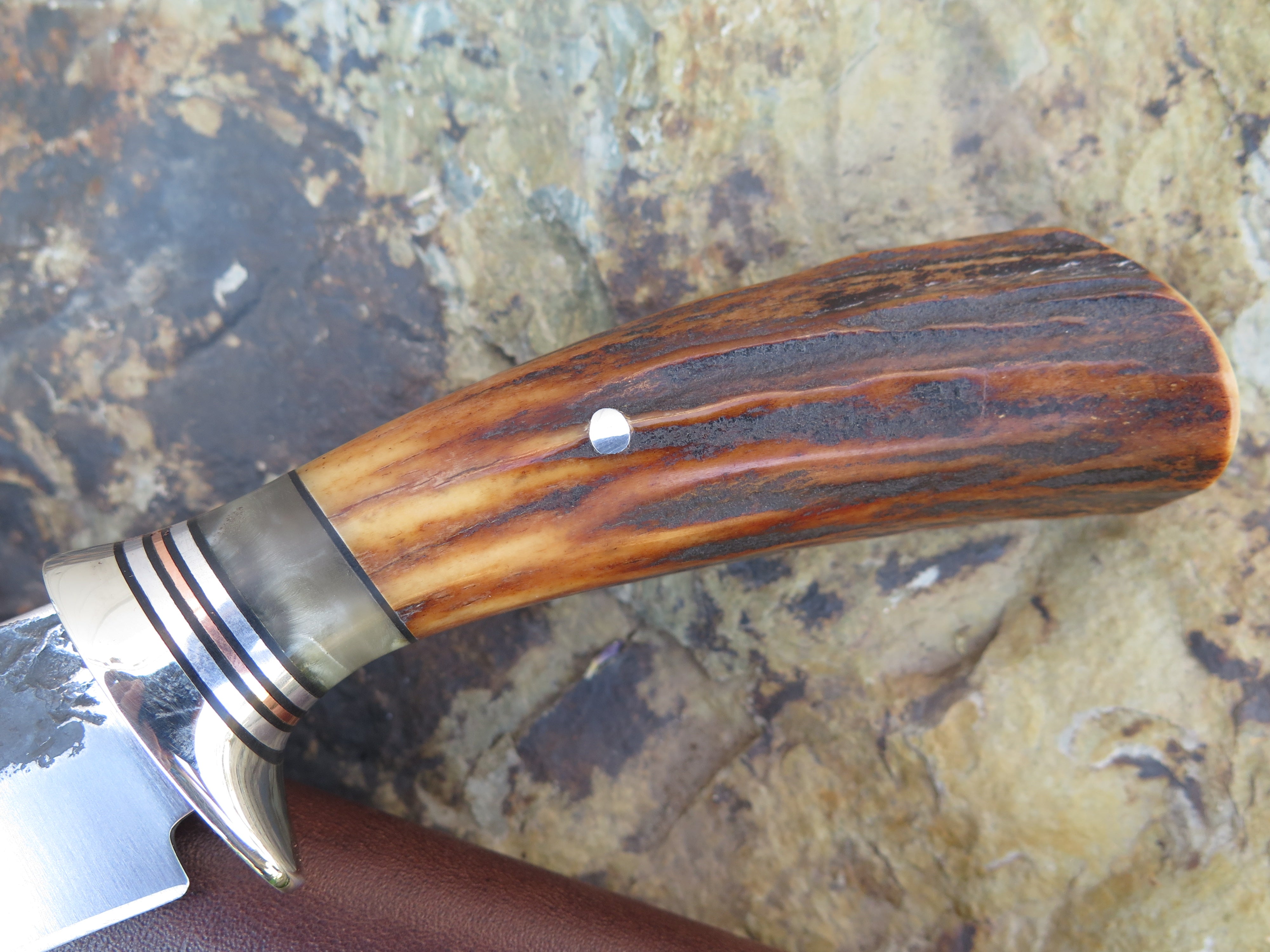 This bad ass new Hunter from Behring Made™ features an old school style clip point with a recurve edge that's truly razor sharp- be careful!! The 3/16" thick high carbon 01 tool steel blade measures 4" from tip to guard with a hammermarked hollow grind. The nickel silver guard is soldered in place above black fiber, aluminum, copper and beautiful musk ox boss spacers. The premium sambar stag handle is pinned through the tang with aluminum and the overall length measures out to 8 1/2". This one comes in a Warlander Leather pouch sheath and we guarantee the set up for life.