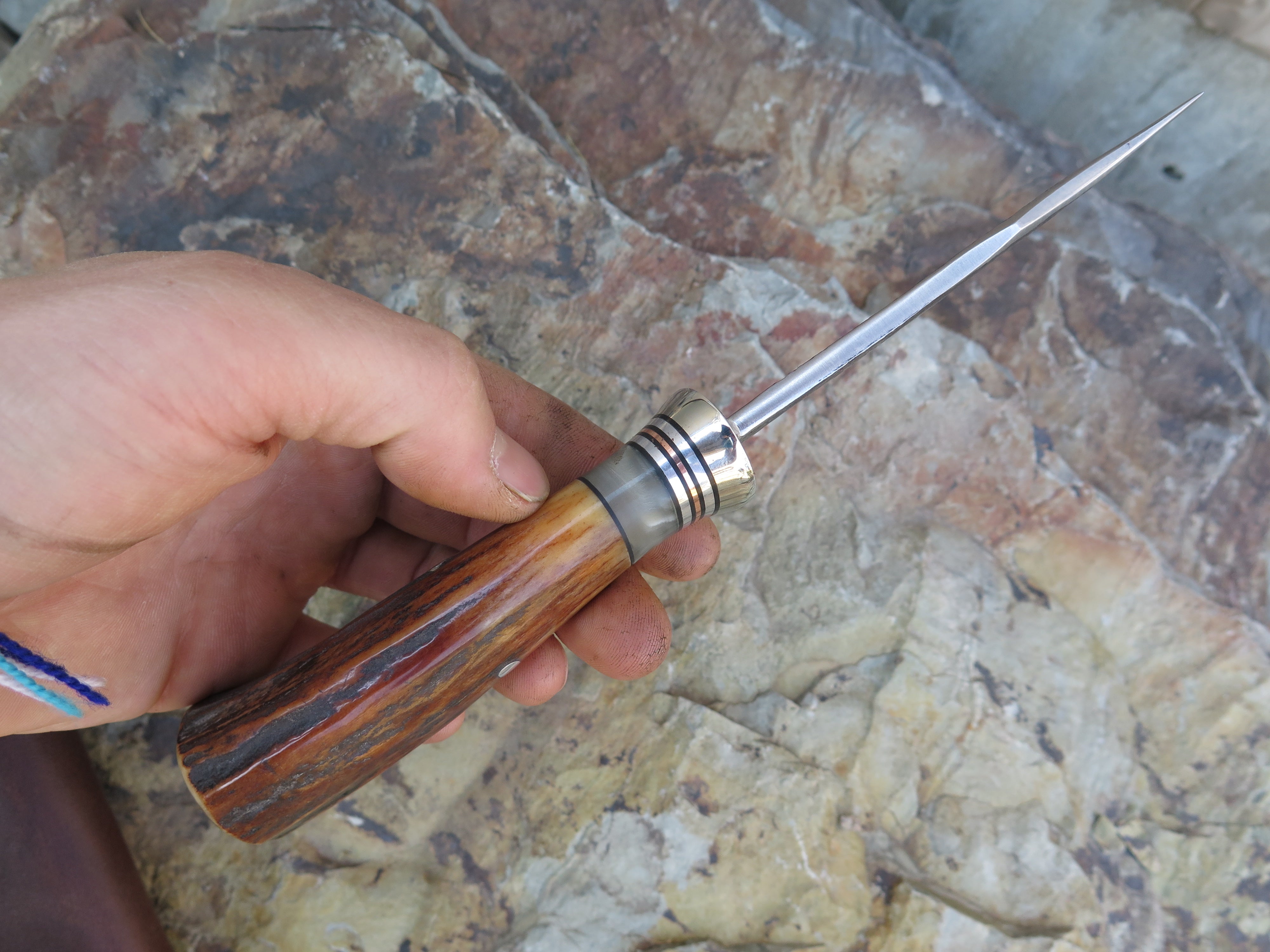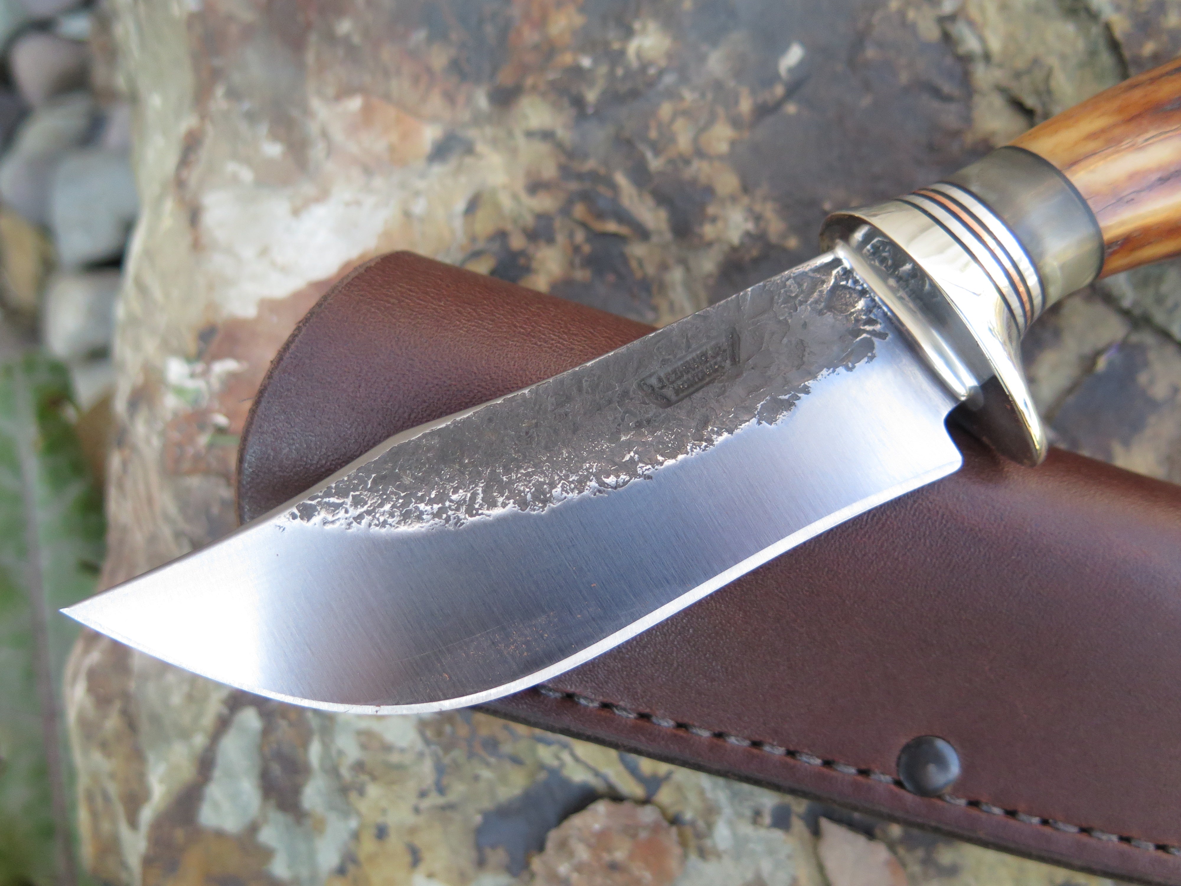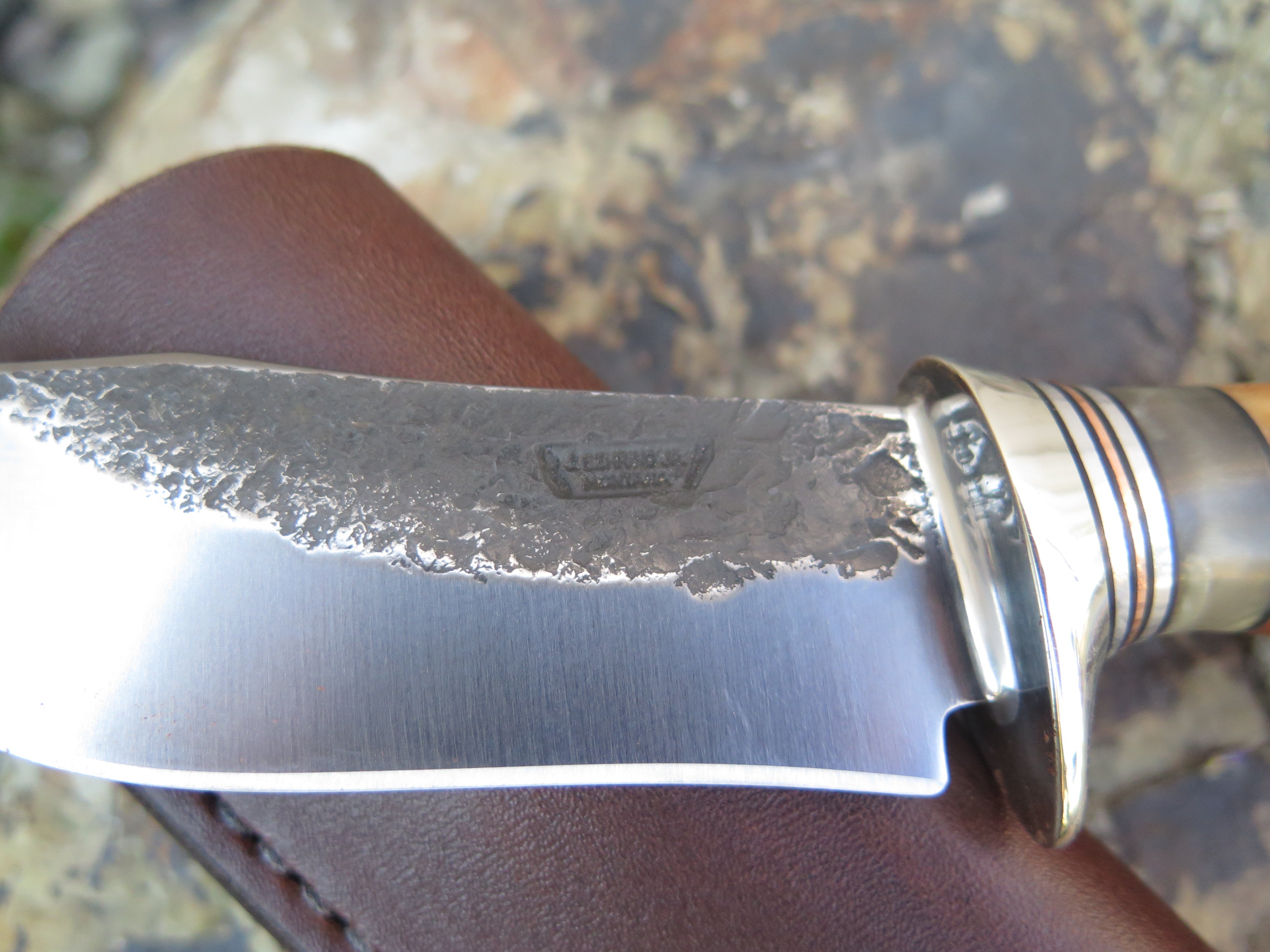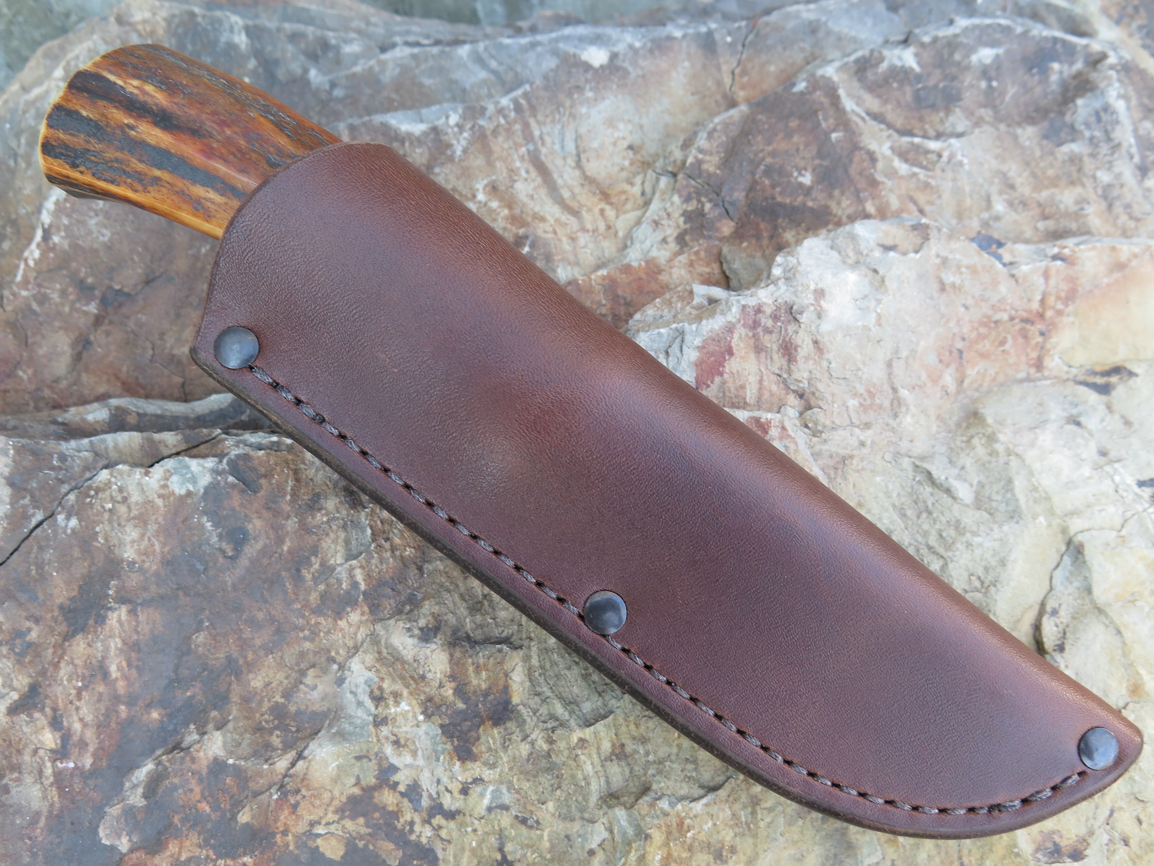 This bad ass new Hunter from Behring Made™ features an old school style clip point with a recurve edge that's truly razor sharp- be careful!! The 3/16" thick high carbon 01 tool steel blade measures 4" from tip to guard with a hammermarked hollow grind. The nickel silver guard is soldered in place above black fiber, aluminum, copper and beautiful musk ox boss spacers. The premium sambar stag handle is pinned through the tang with aluminum and the overall length measures out to 8 1/2". This one comes in a Warlander Leather pouch sheath and we guarantee the set up for life.