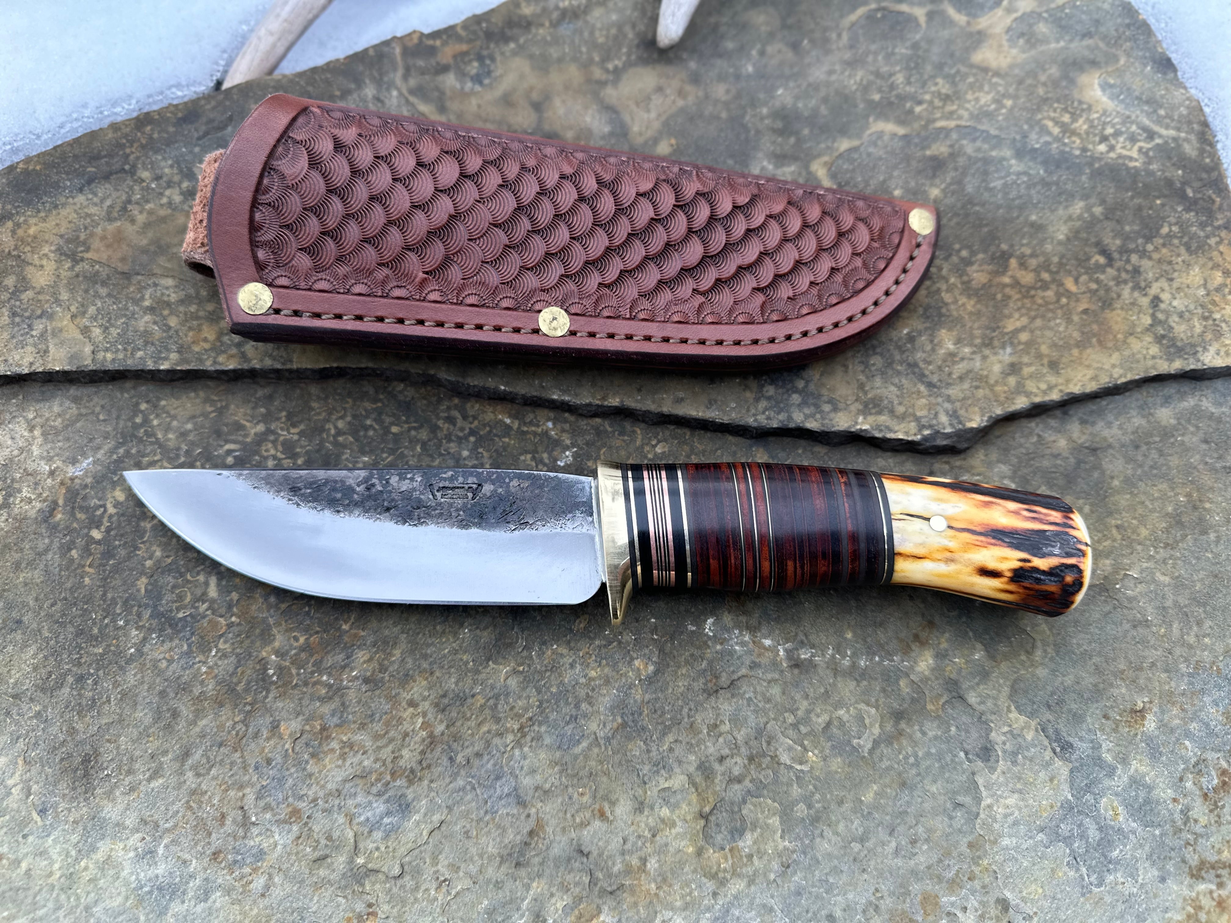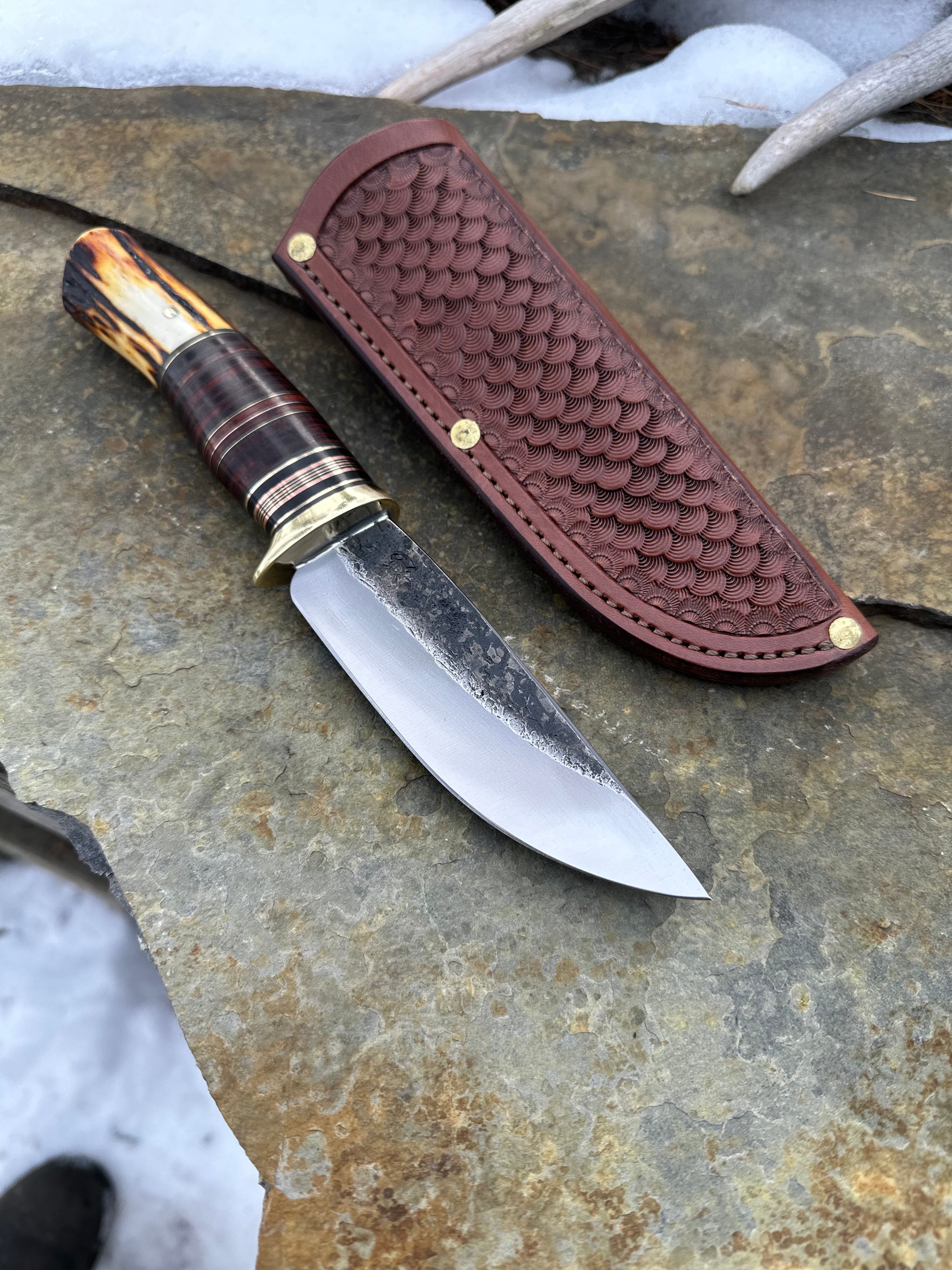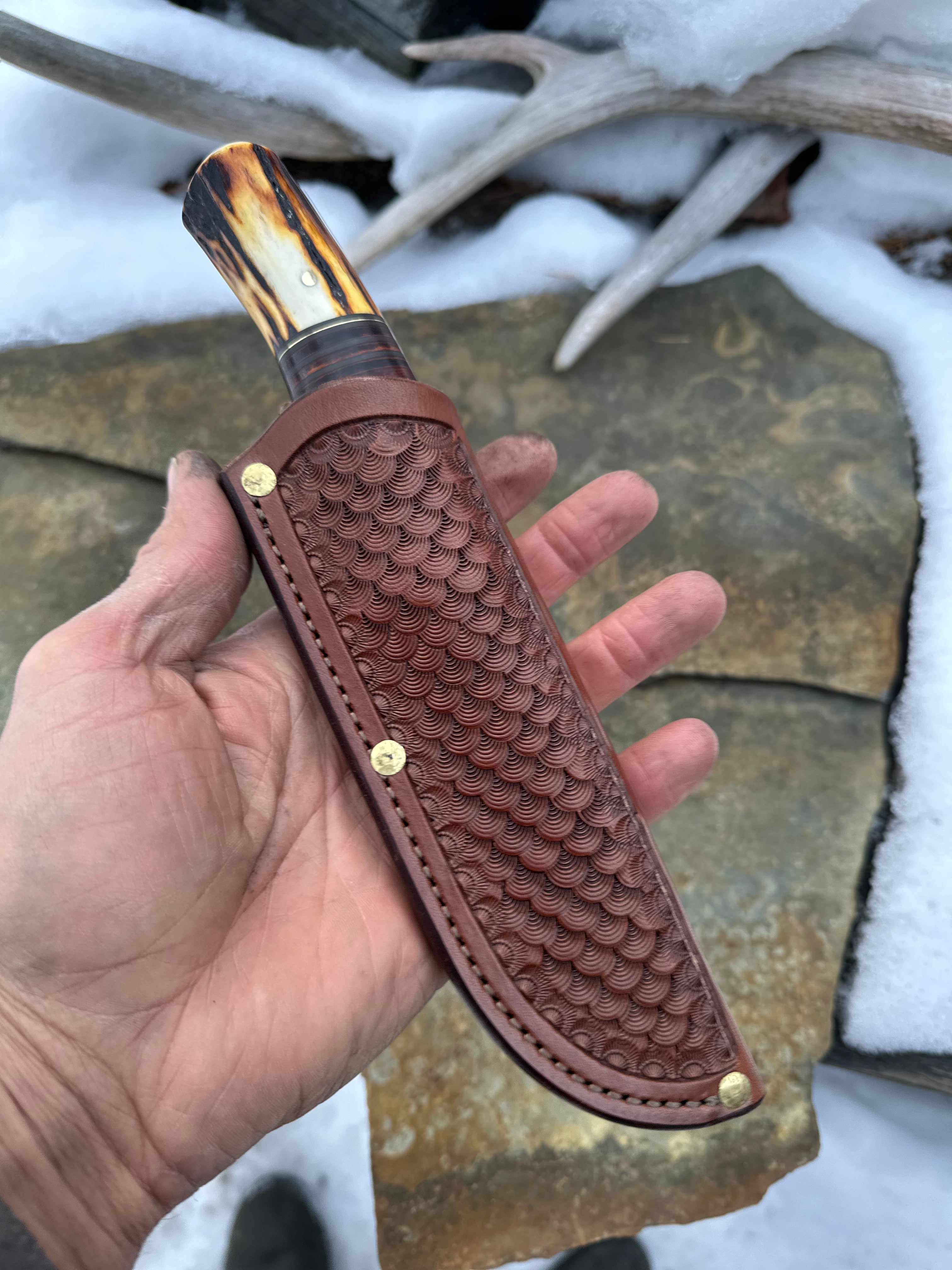 - Horsehide, Brass, Copper, and Black Fiber Handle