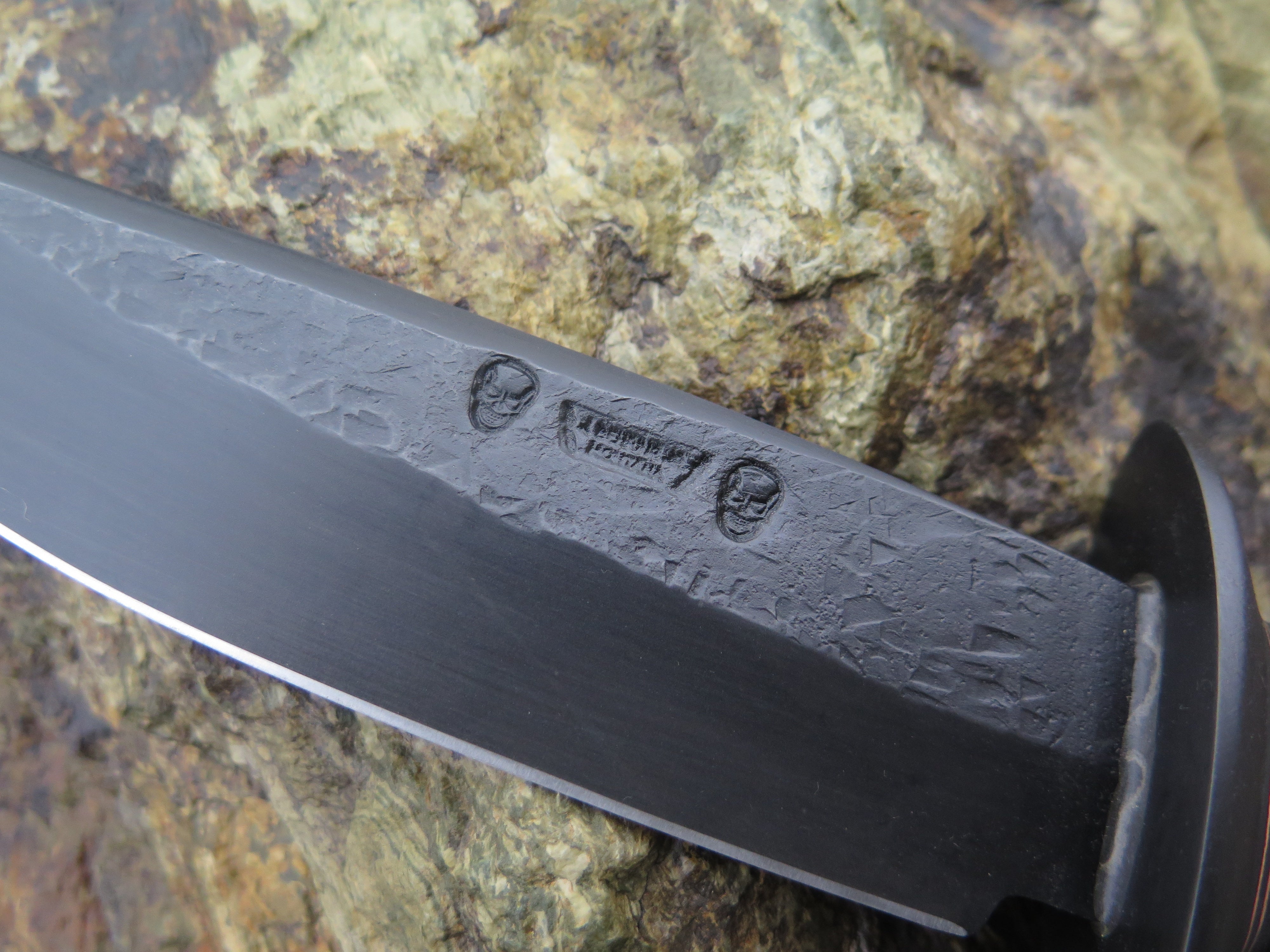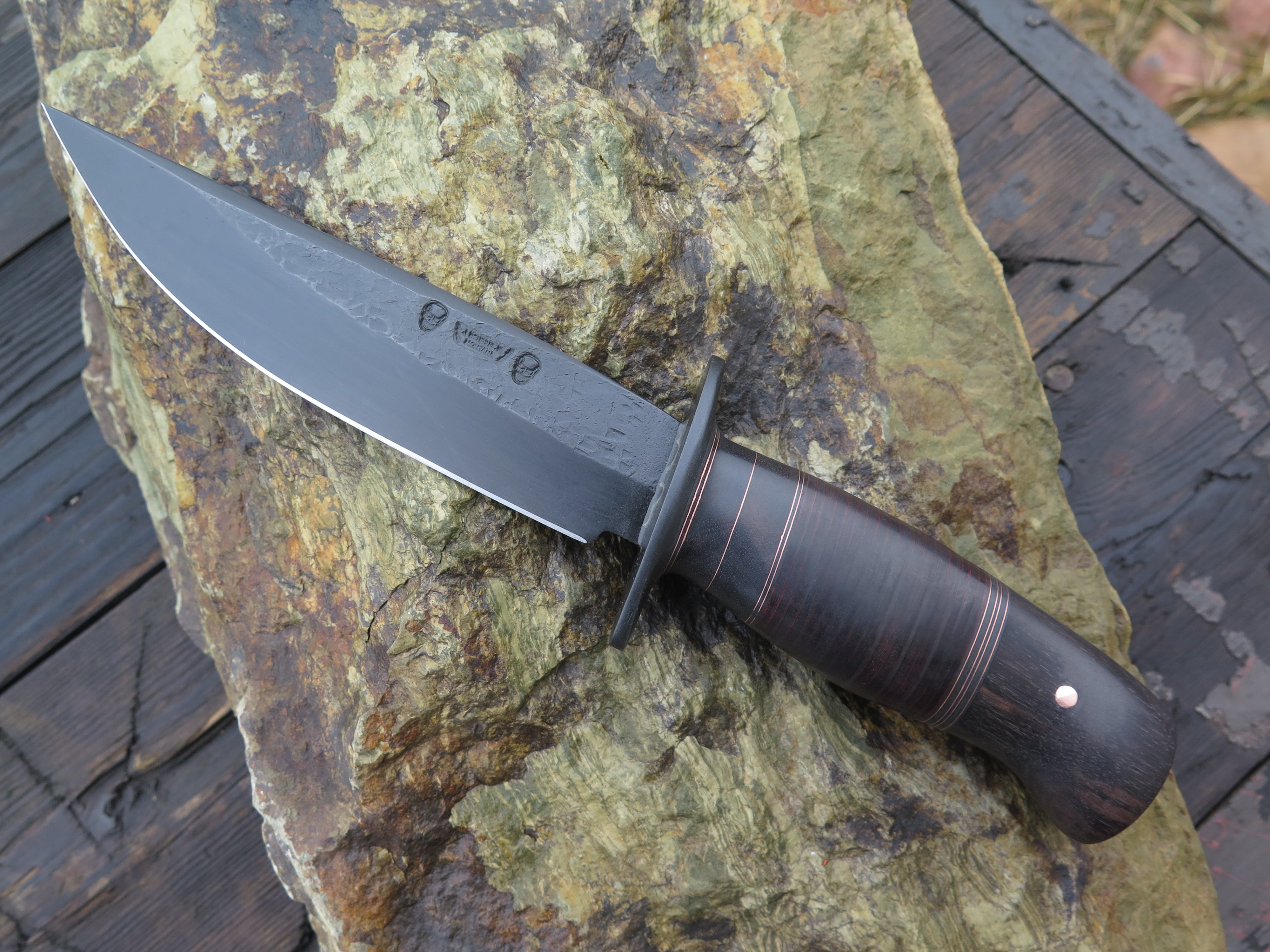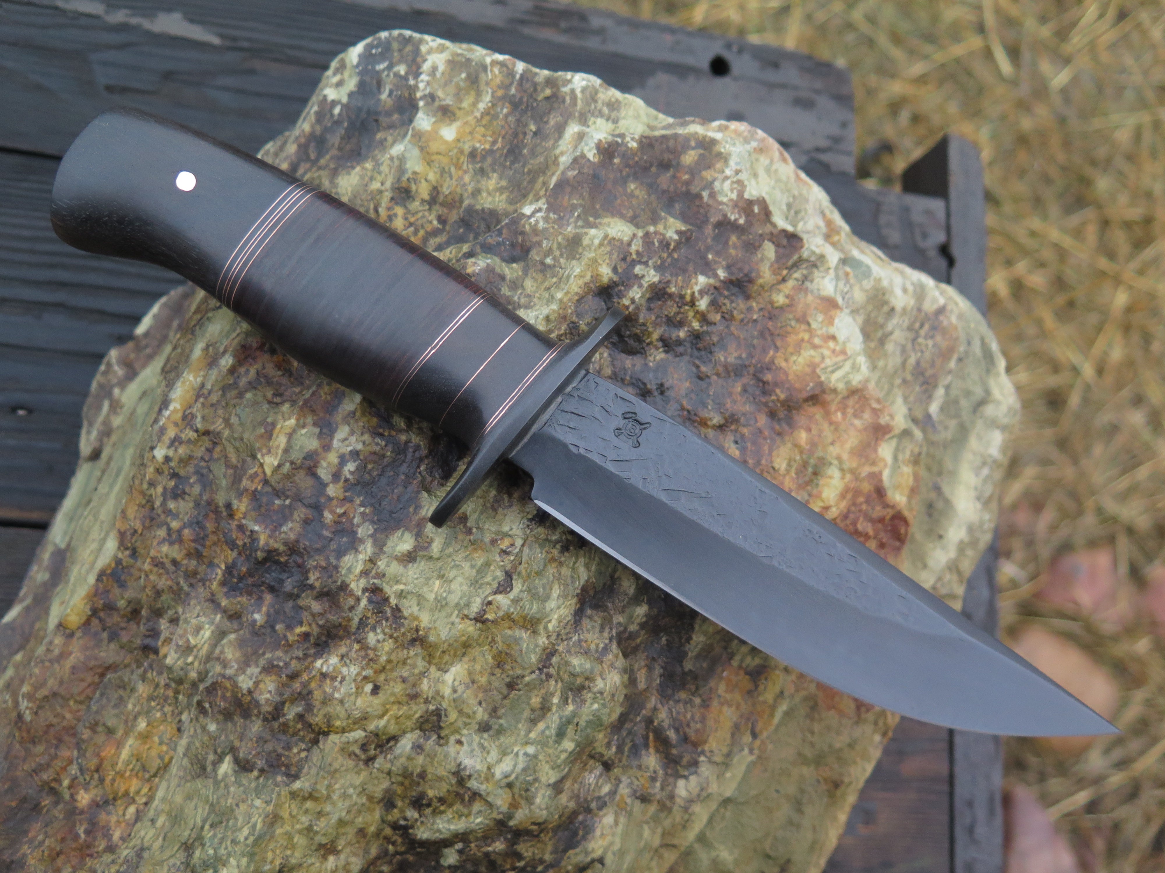 This bad ass Mission knife from Behring Made© is hand forged from 13/64" thick 5160 spring steel and it measures 6 1/4" from tip to guard with a razor sharp hollow grind, hammermarks and our forced patina blued finish. The blued steel guard is soldered in place above black fiber, ebony wood, copper and horsehide spacers with an ebony butt that's pinned with copper. The overall length measures 10 7/8" and it will come in a custom sheath from Warlander Leather.