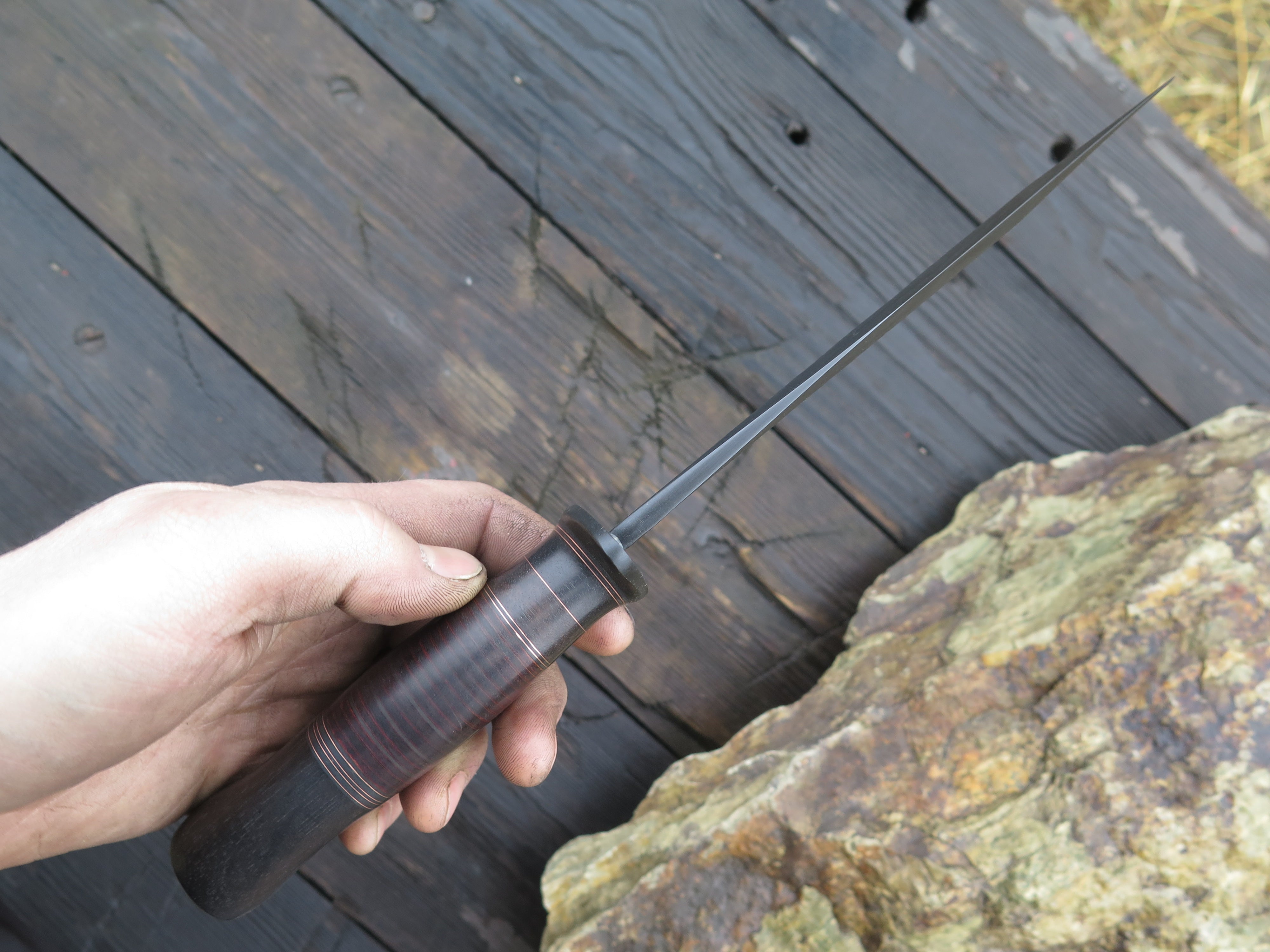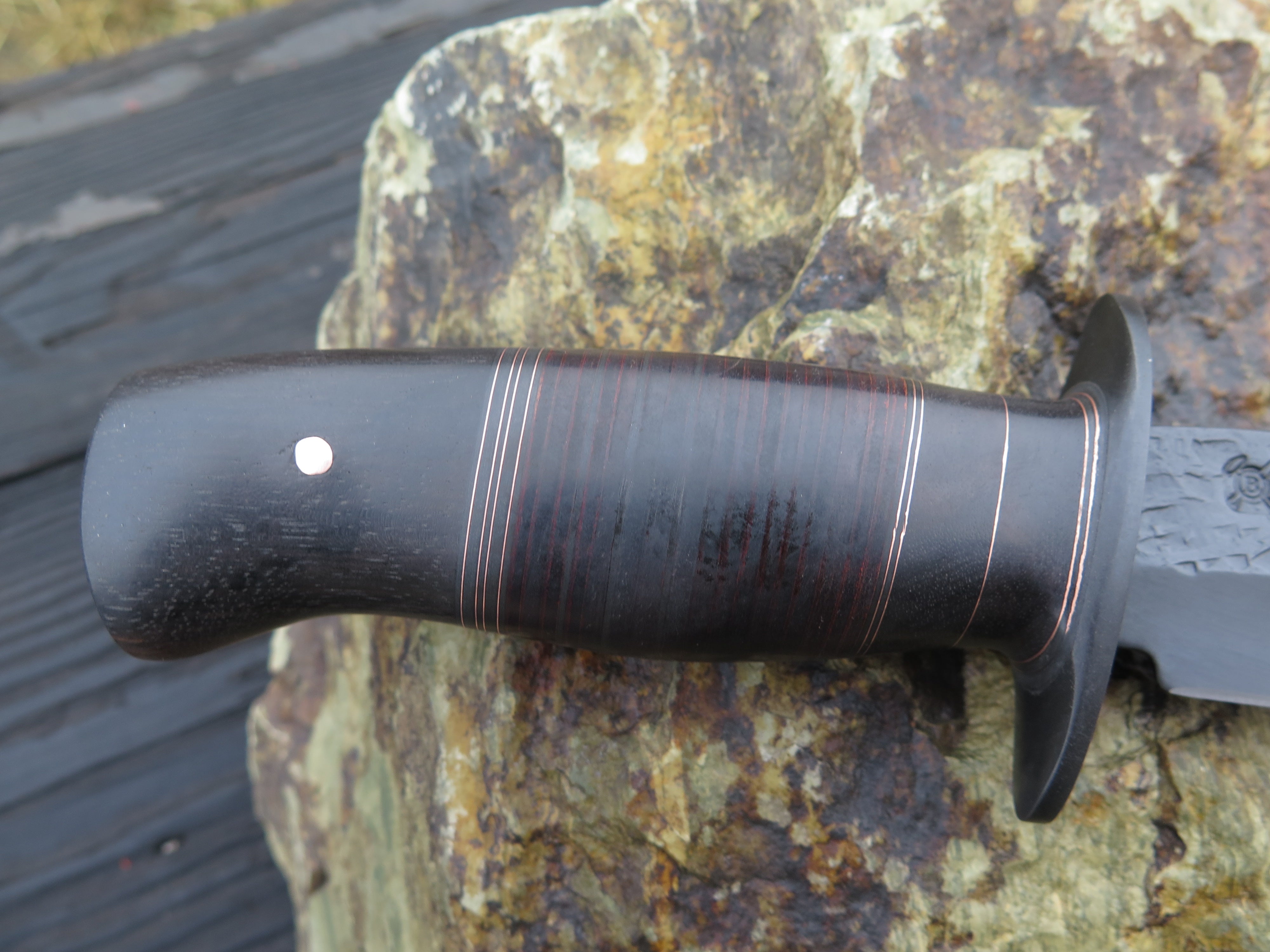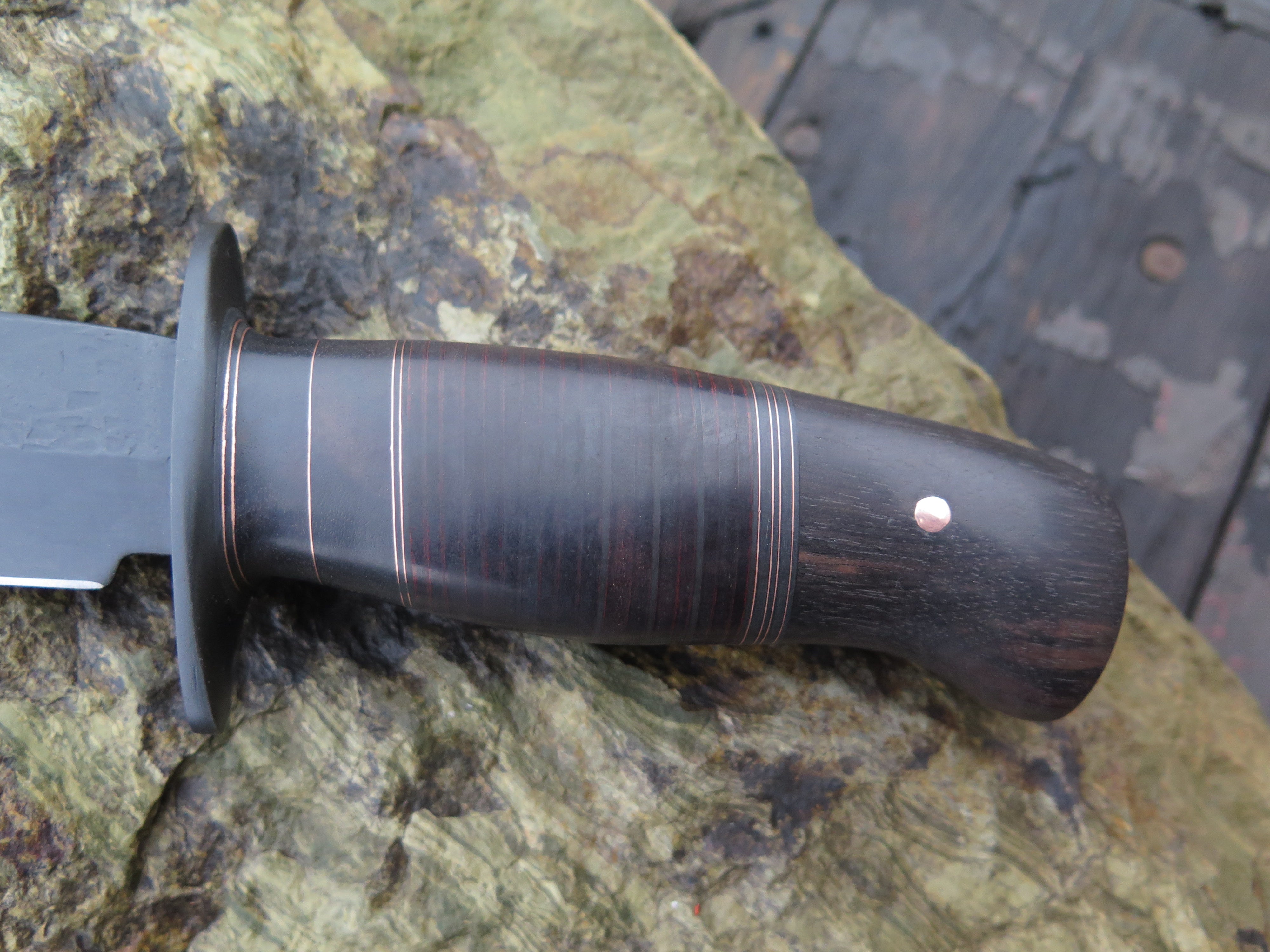 This bad ass Mission knife from Behring Made© is hand forged from 13/64" thick 5160 spring steel and it measures 6 1/4" from tip to guard with a razor sharp hollow grind, hammermarks and our forced patina blued finish. The blued steel guard is soldered in place above black fiber, ebony wood, copper and horsehide spacers with an ebony butt that's pinned with copper. The overall length measures 10 7/8" and it will come in a custom sheath from Warlander Leather.