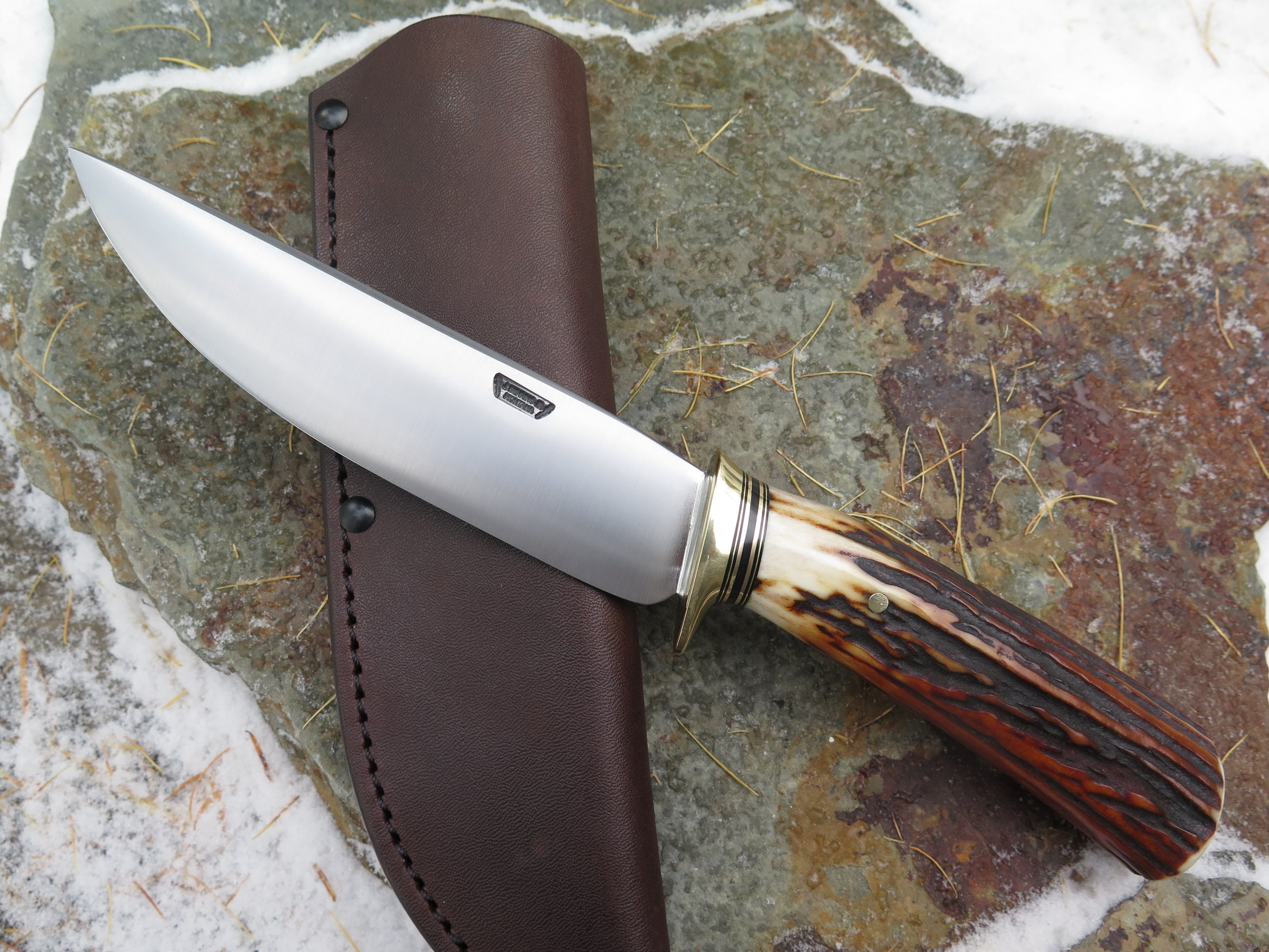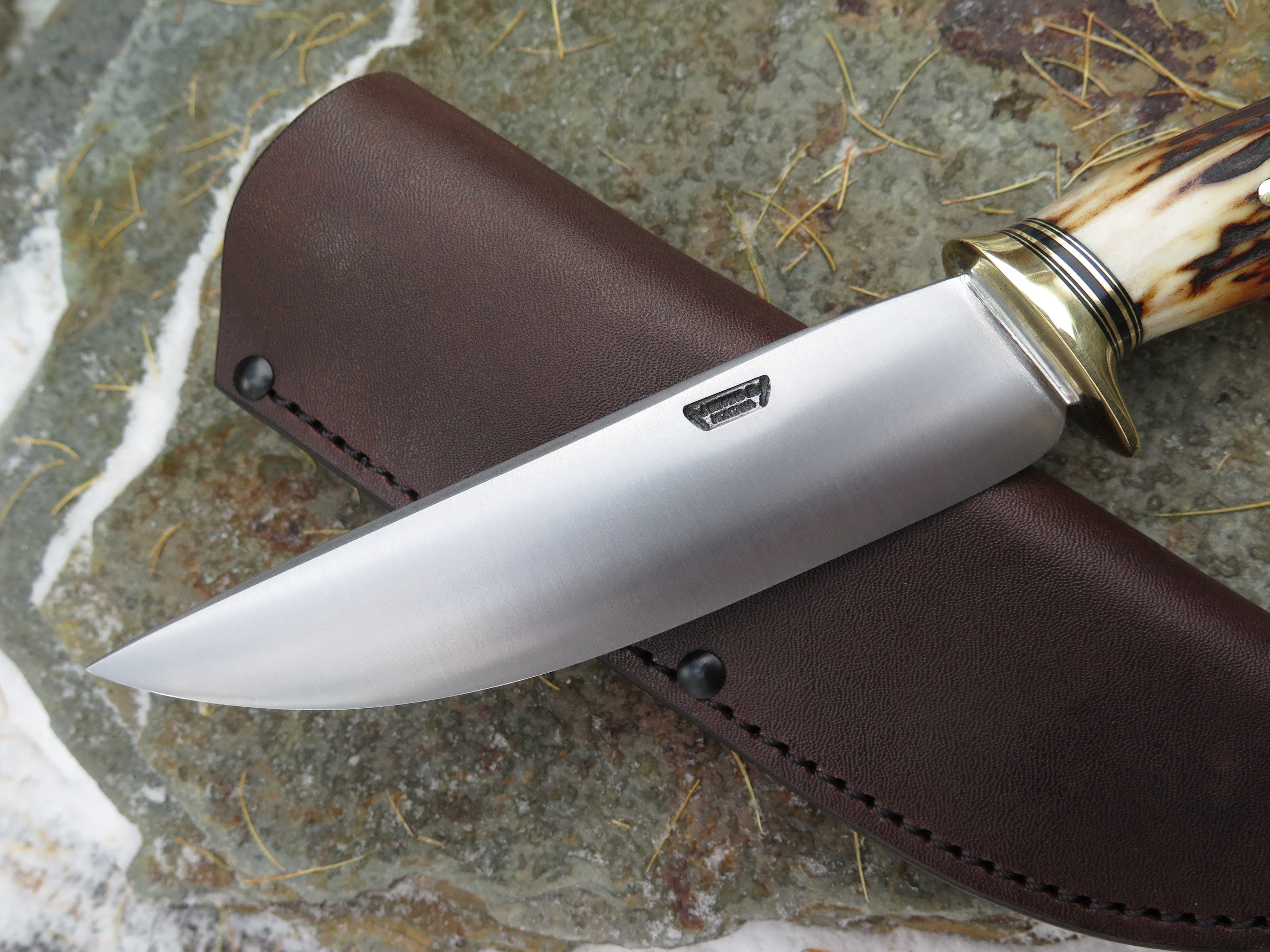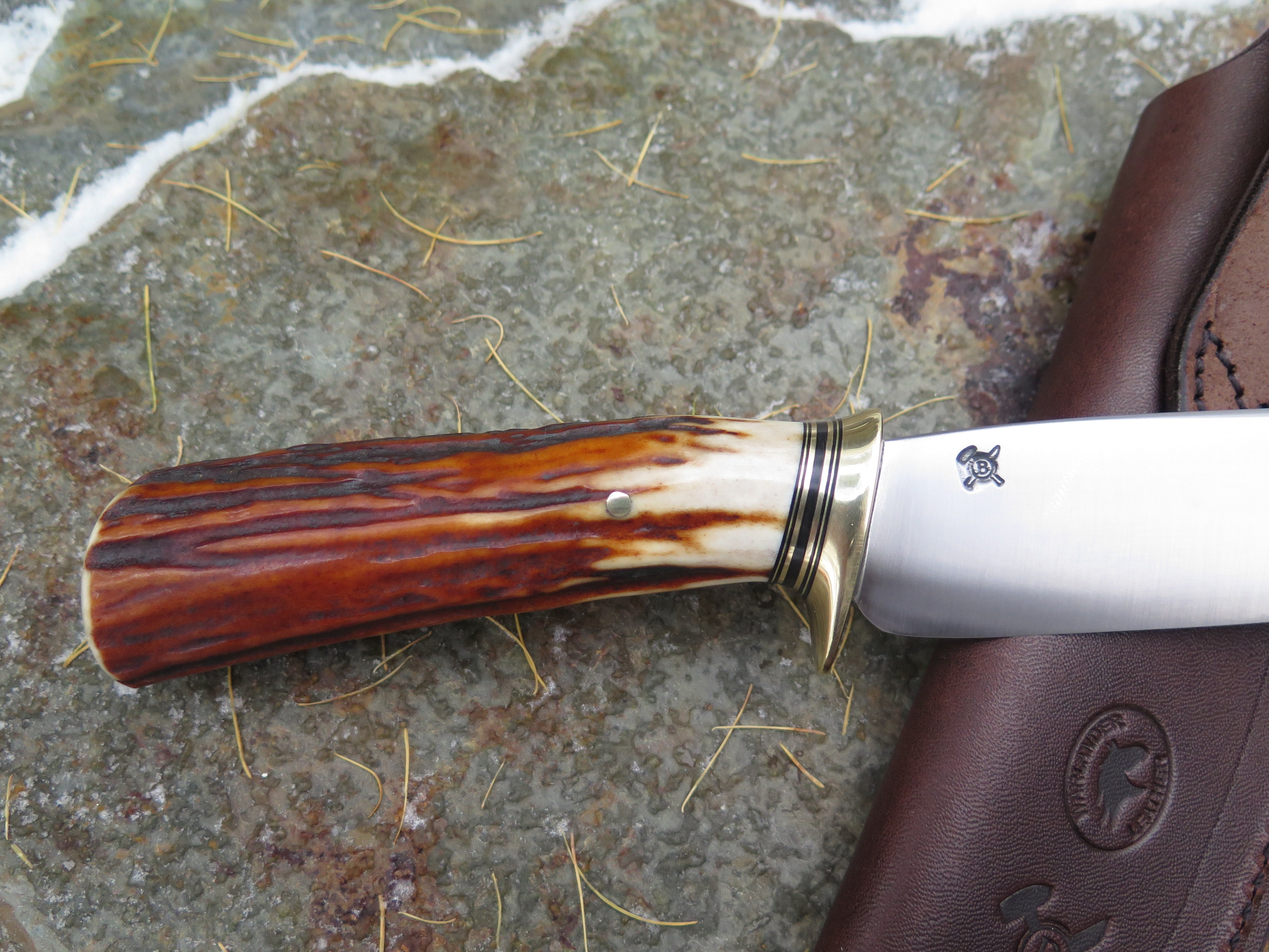 This handsome new Mission Knife from Behring Made© is hand forged from 13/64" thick 5160 spring steel and measures 6" from tip to guard with a razor sharp convex grind. The brass guard is soldered in place above black fiber and brass spacers as well as a premium sambar stag handle that is pinned through the tang with brass. The overall length measures just shy of 11" and it comes in the shown leather belt pouch sheath, though substitutions are available upon request.
