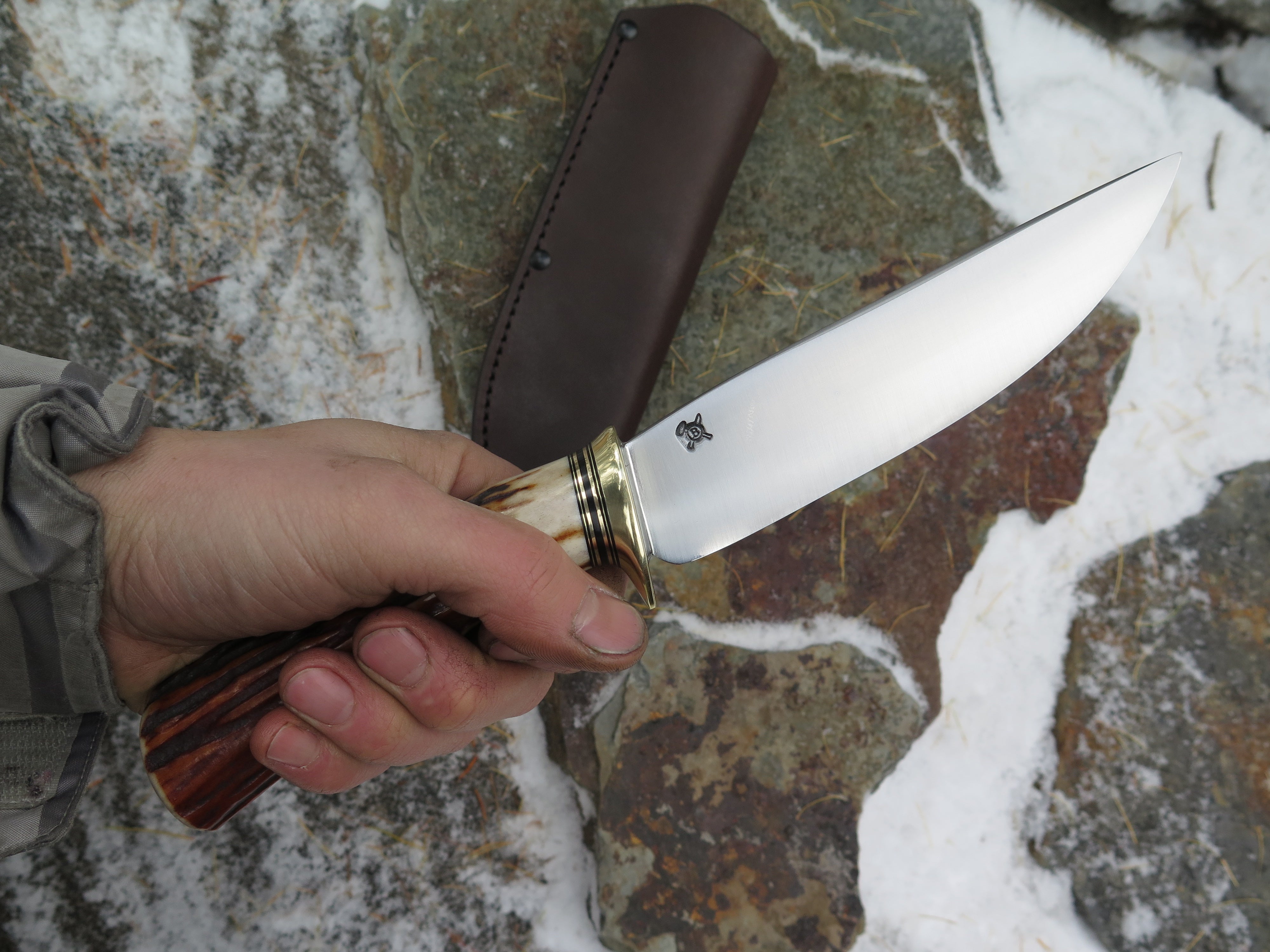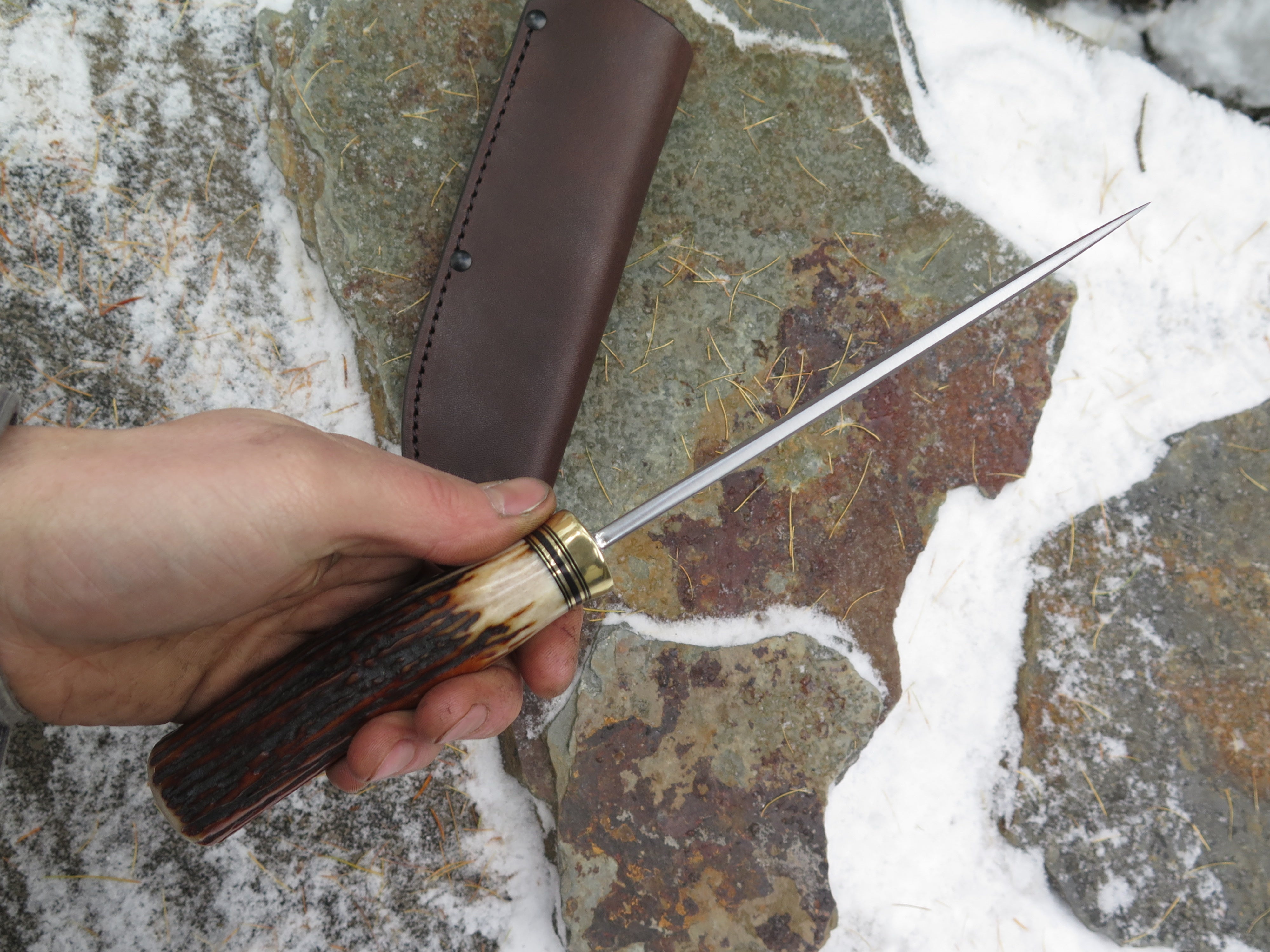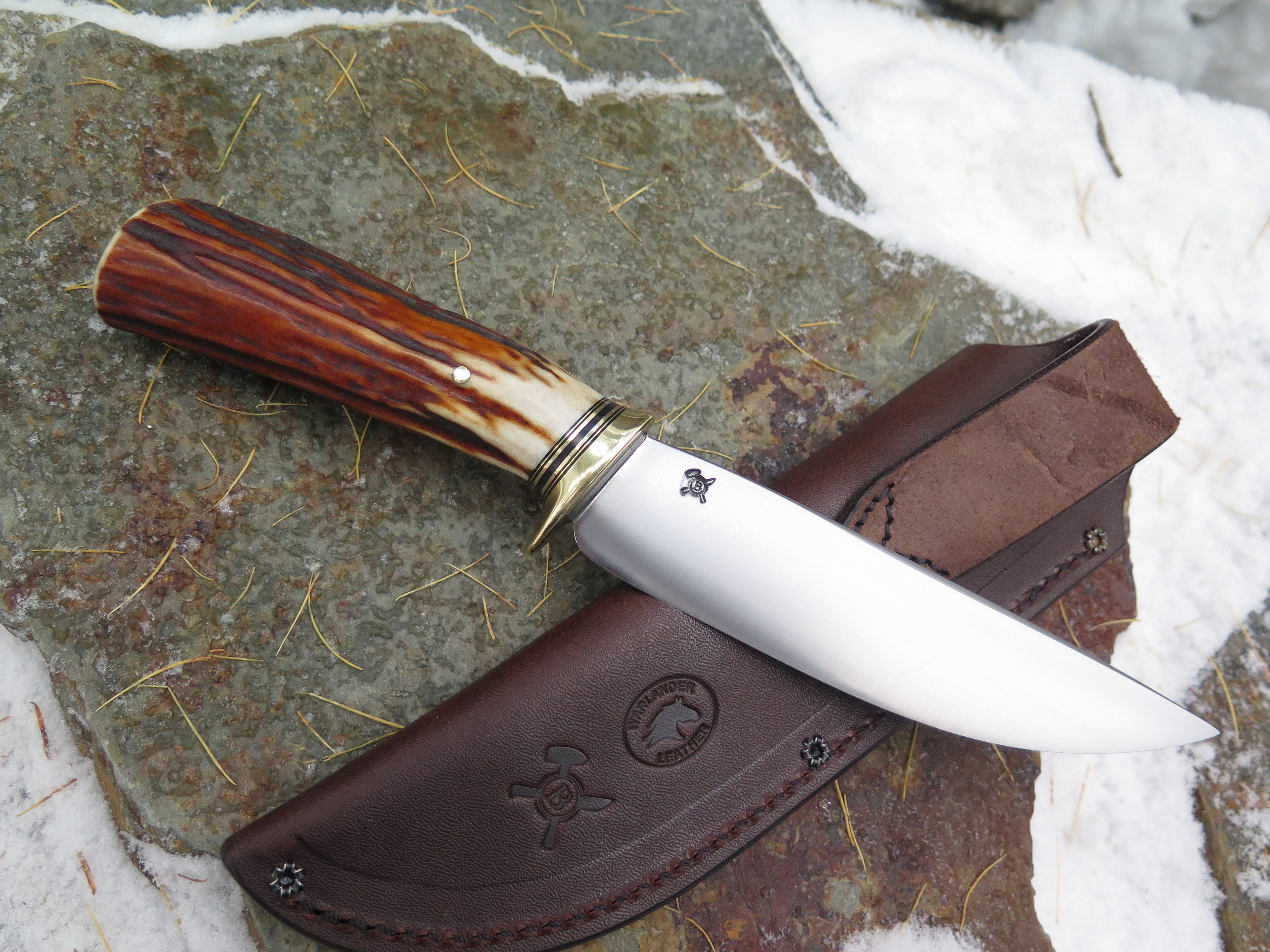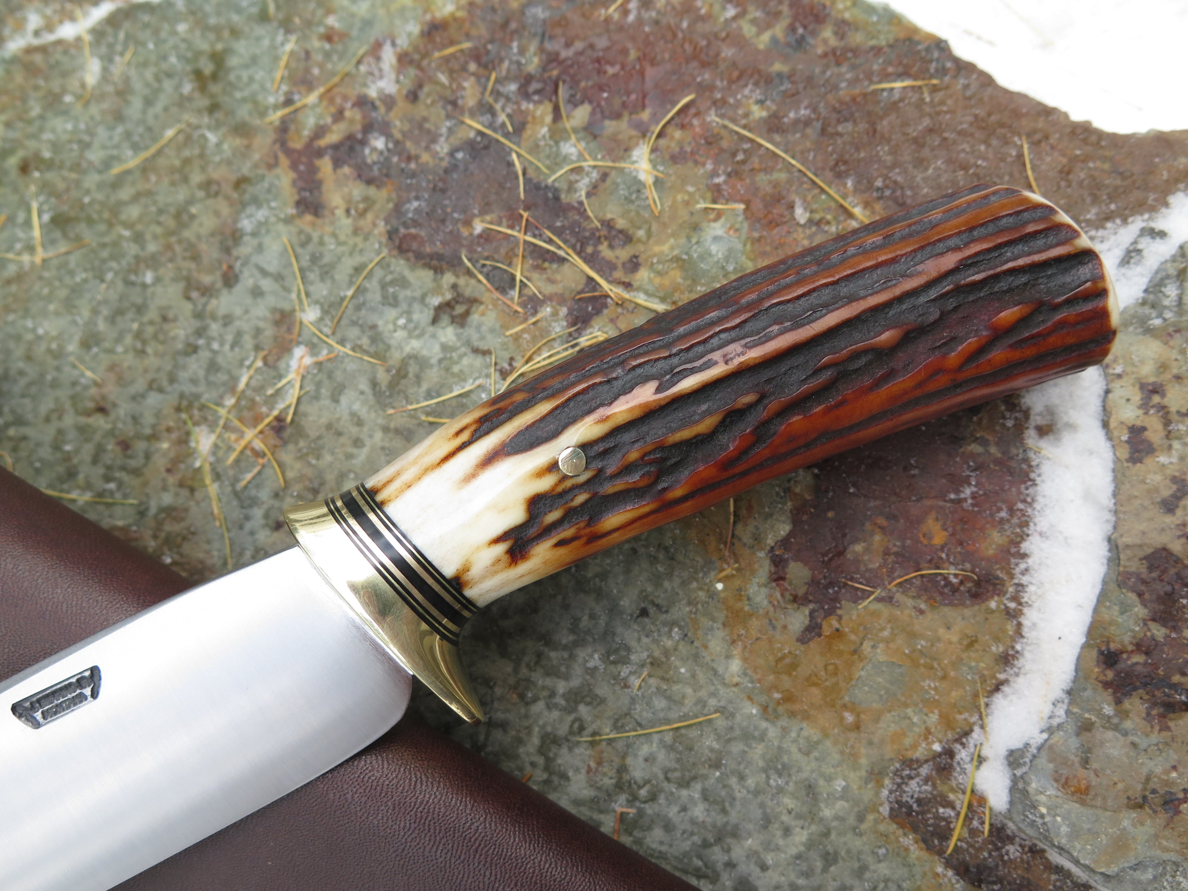 This handsome new Mission Knife from Behring Made© is hand forged from 13/64" thick 5160 spring steel and measures 6" from tip to guard with a razor sharp convex grind. The brass guard is soldered in place above black fiber and brass spacers as well as a premium sambar stag handle that is pinned through the tang with brass. The overall length measures just shy of 11" and it comes in the shown leather belt pouch sheath, though substitutions are available upon request.