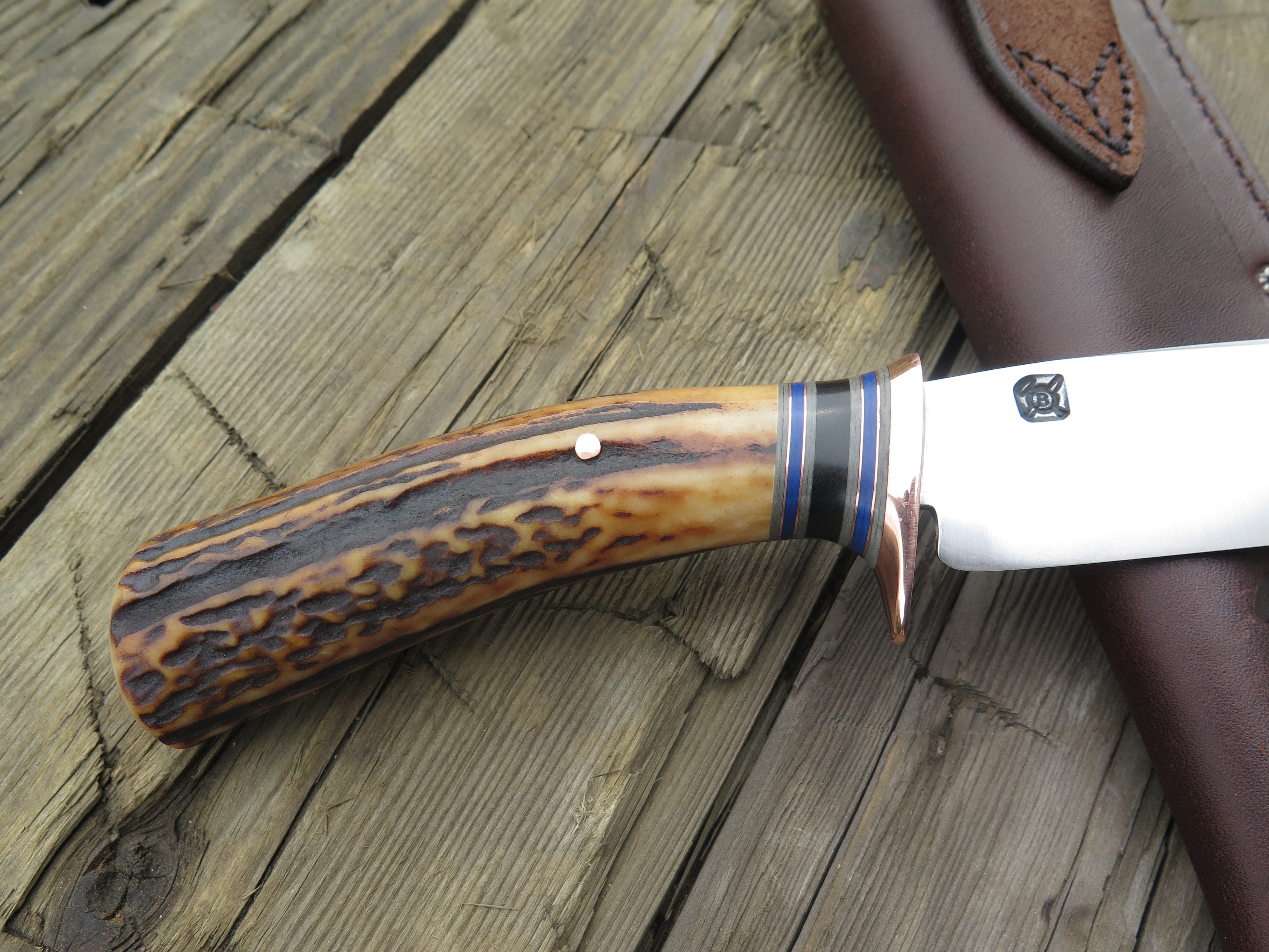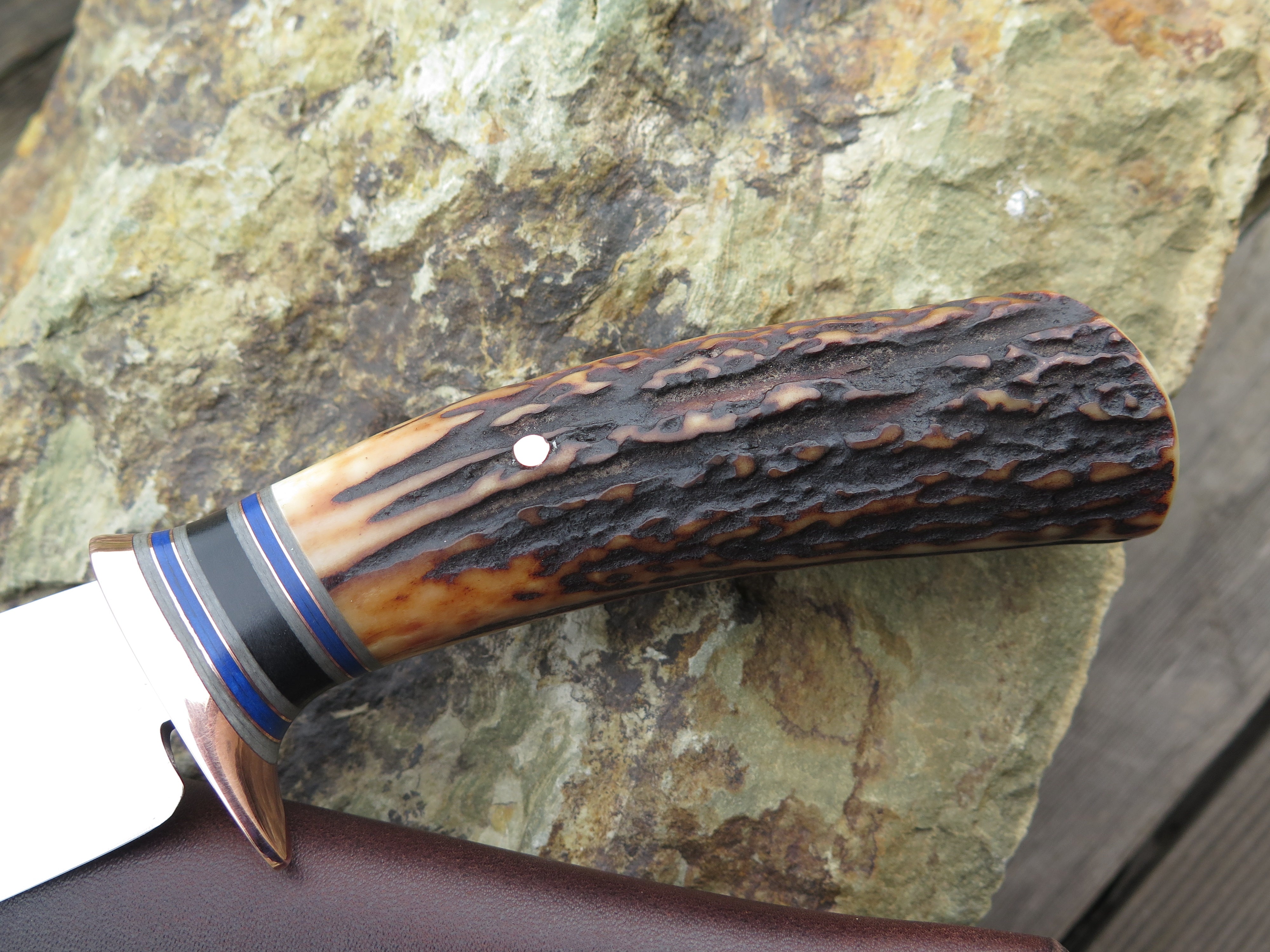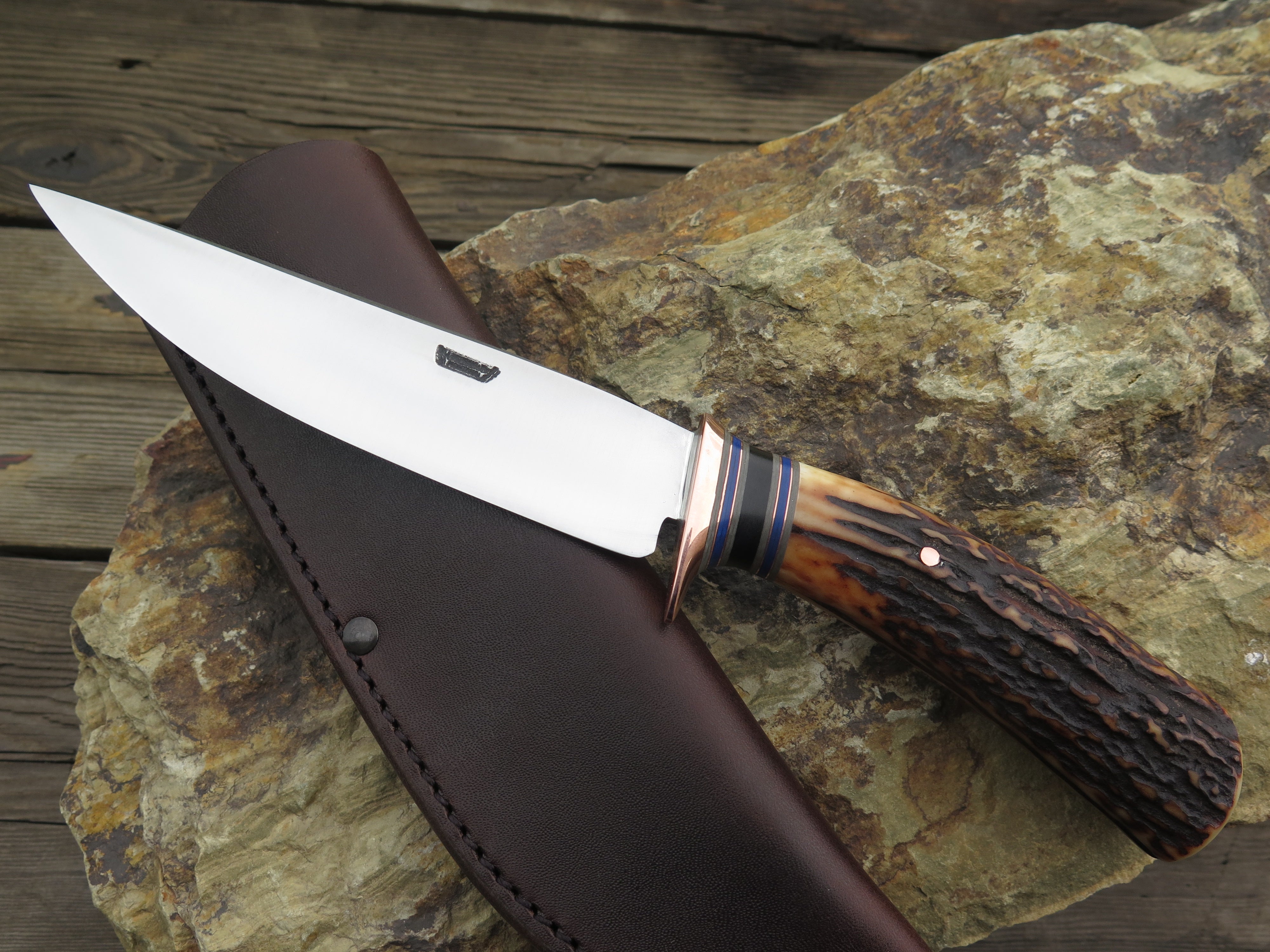 This beautiful Mission Knife from Behring Made© is hand forged from 3/16" thick high carbon 01 tool steel and it measures 6 1/4" from tip to guard with a razor sharp convex grind. The copper guard is soldered in place above black, blue, gray and copper spacers atop an arguably perfect sambar stag handle that's pinned with copper. The overall length measures just under 11" and it comes in a classic belt pouch sheath.