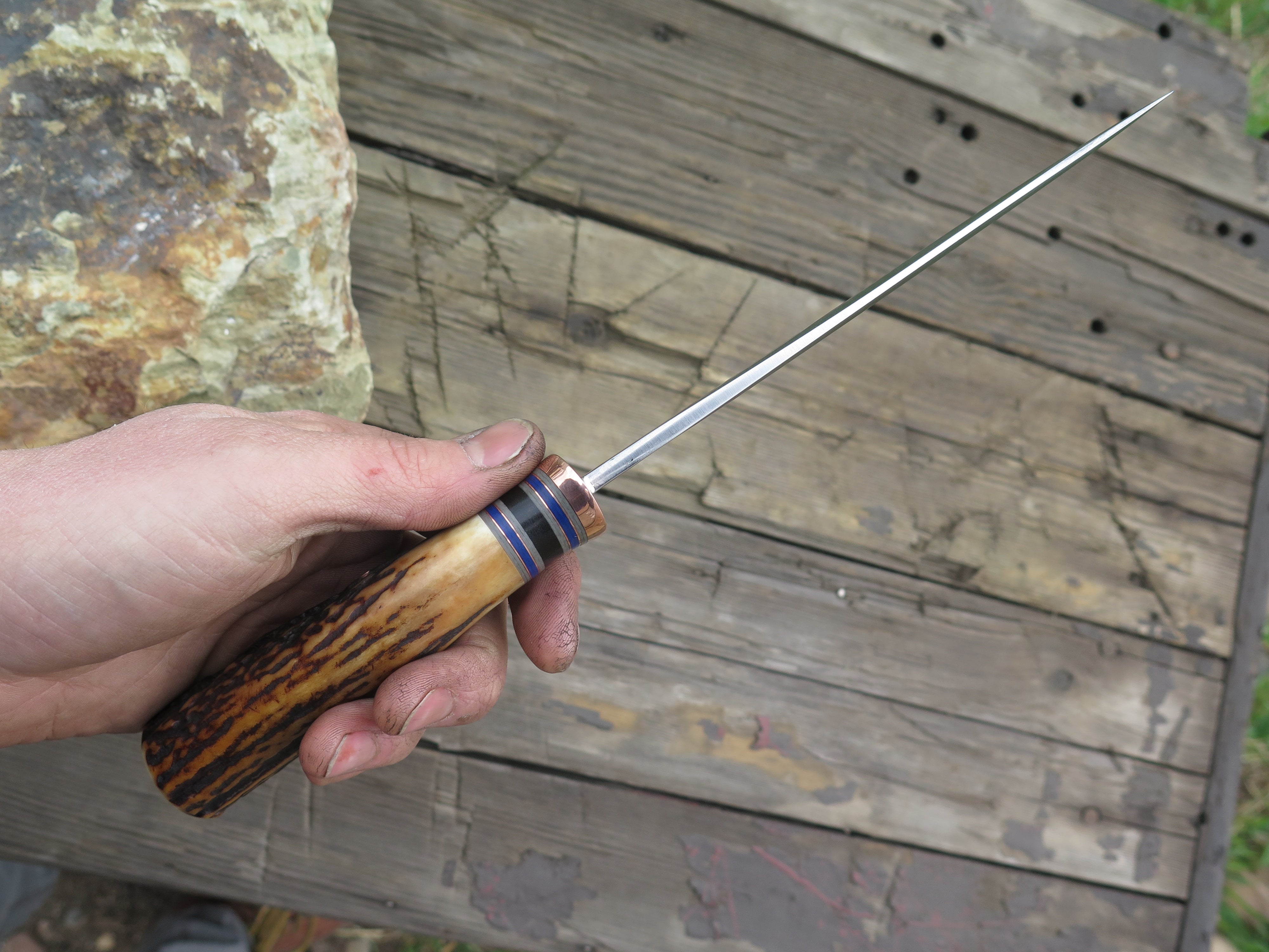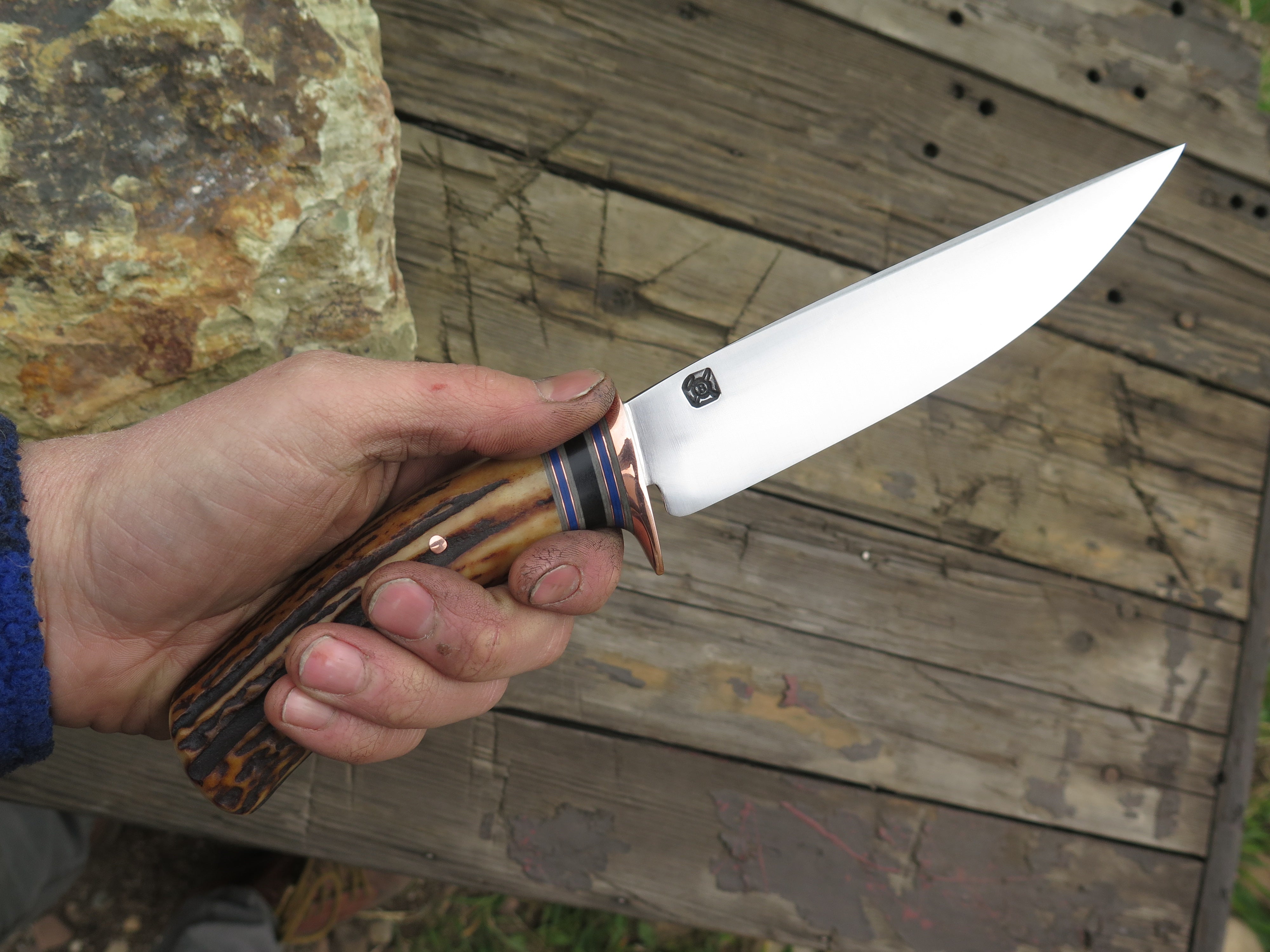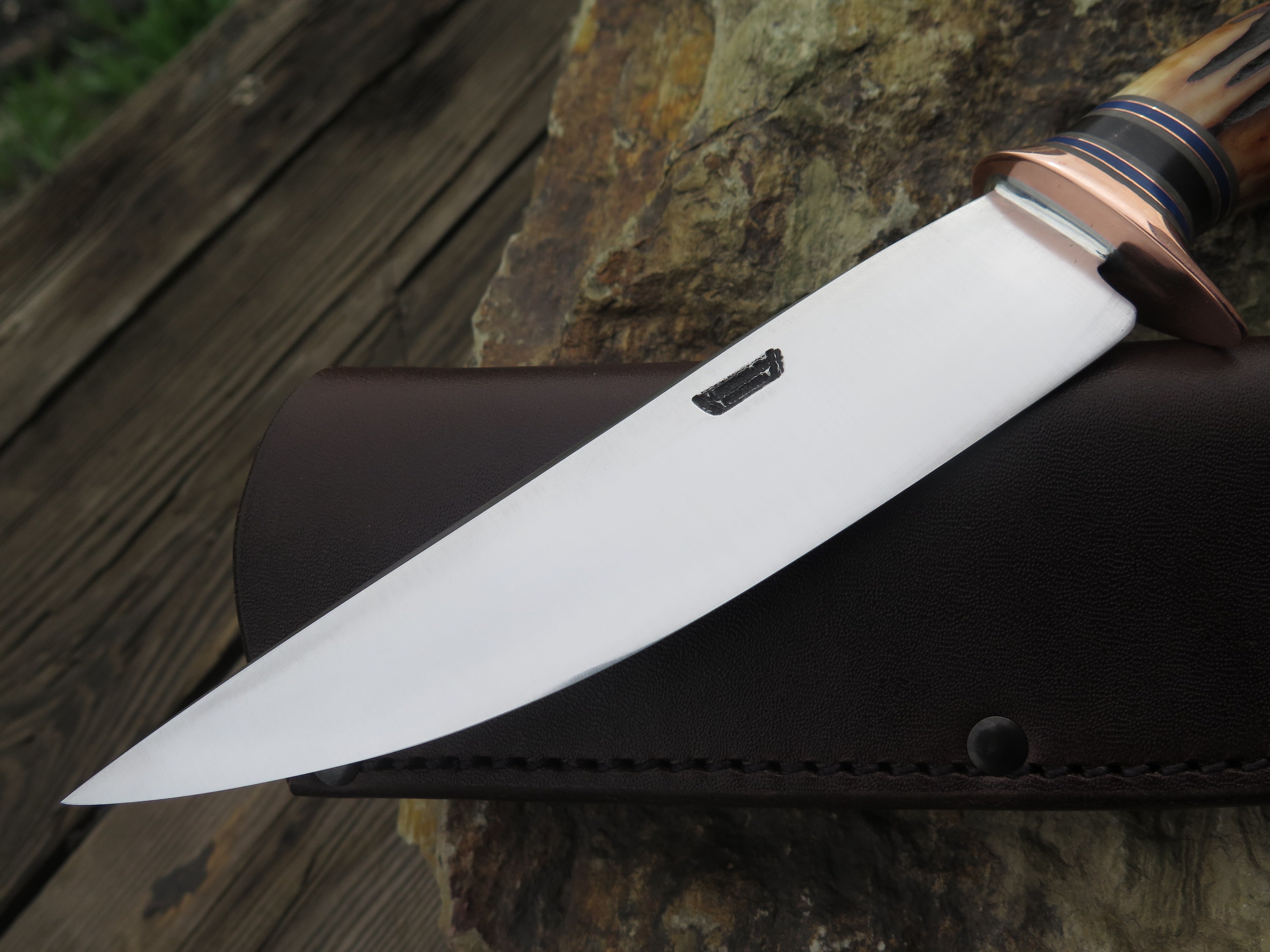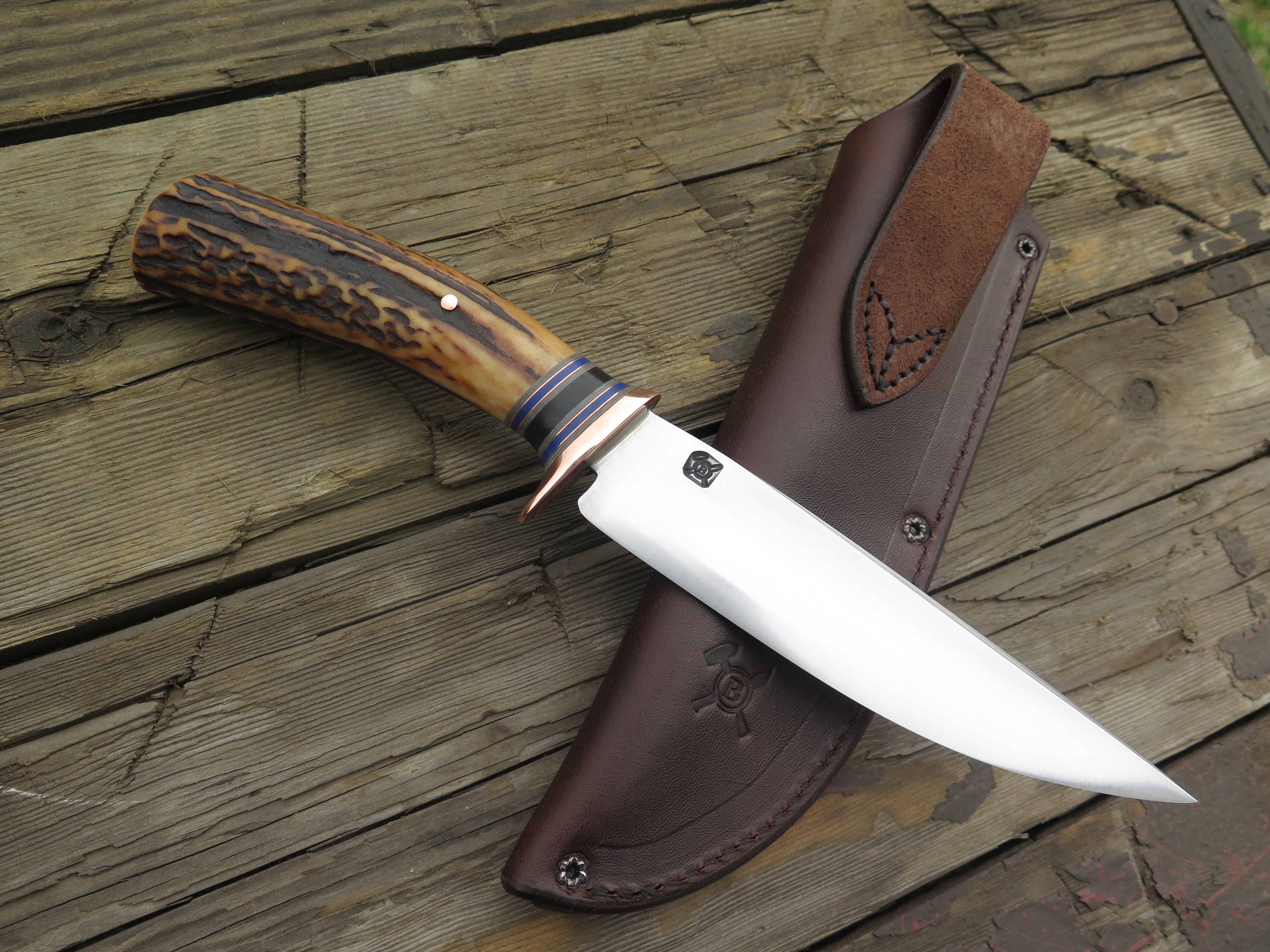 This beautiful Mission Knife from Behring Made© is hand forged from 3/16" thick high carbon 01 tool steel and it measures 6 1/4" from tip to guard with a razor sharp convex grind. The copper guard is soldered in place above black, blue, gray and copper spacers atop an arguably perfect sambar stag handle that's pinned with copper. The overall length measures just under 11" and it comes in a classic belt pouch sheath.