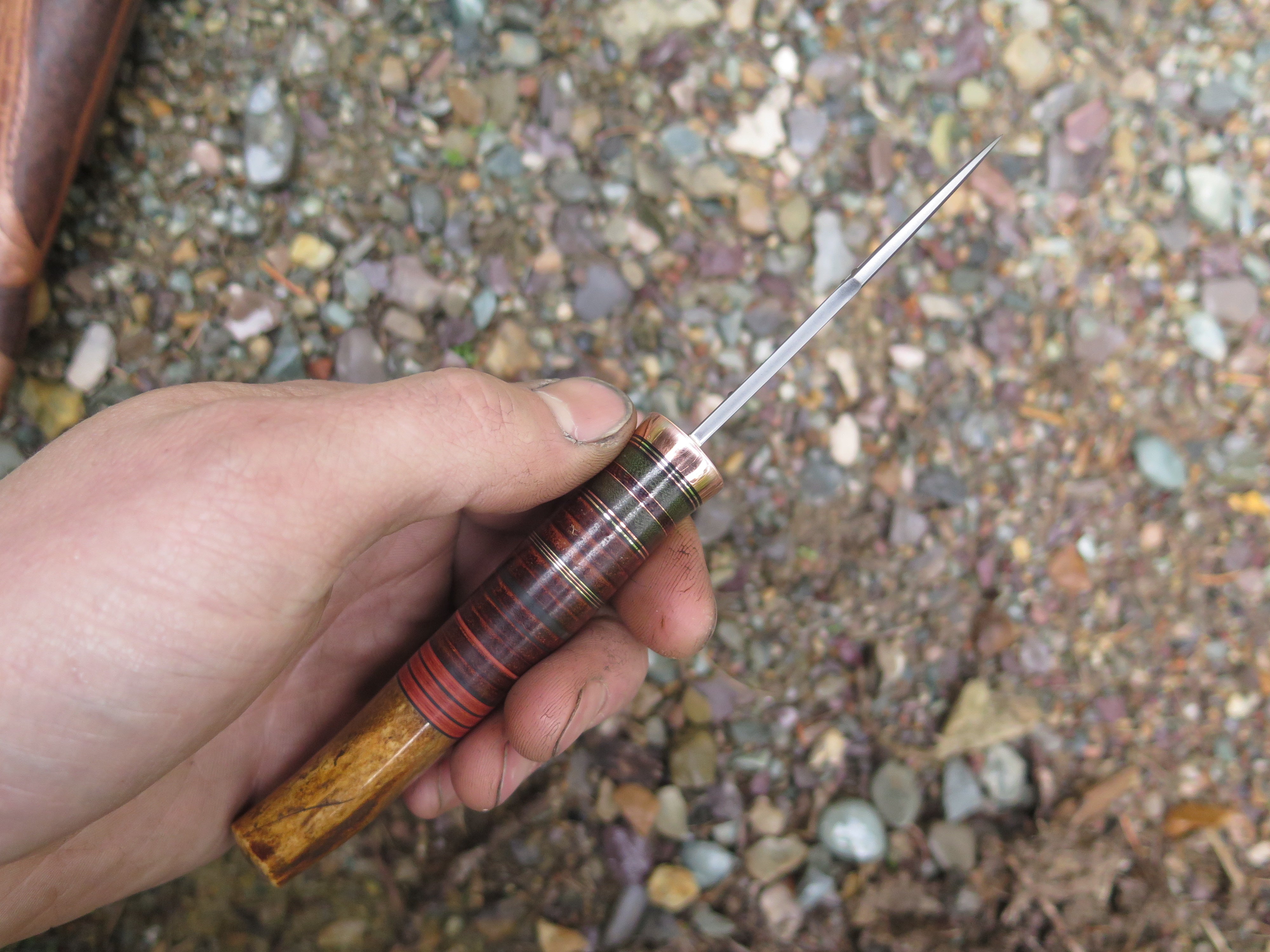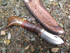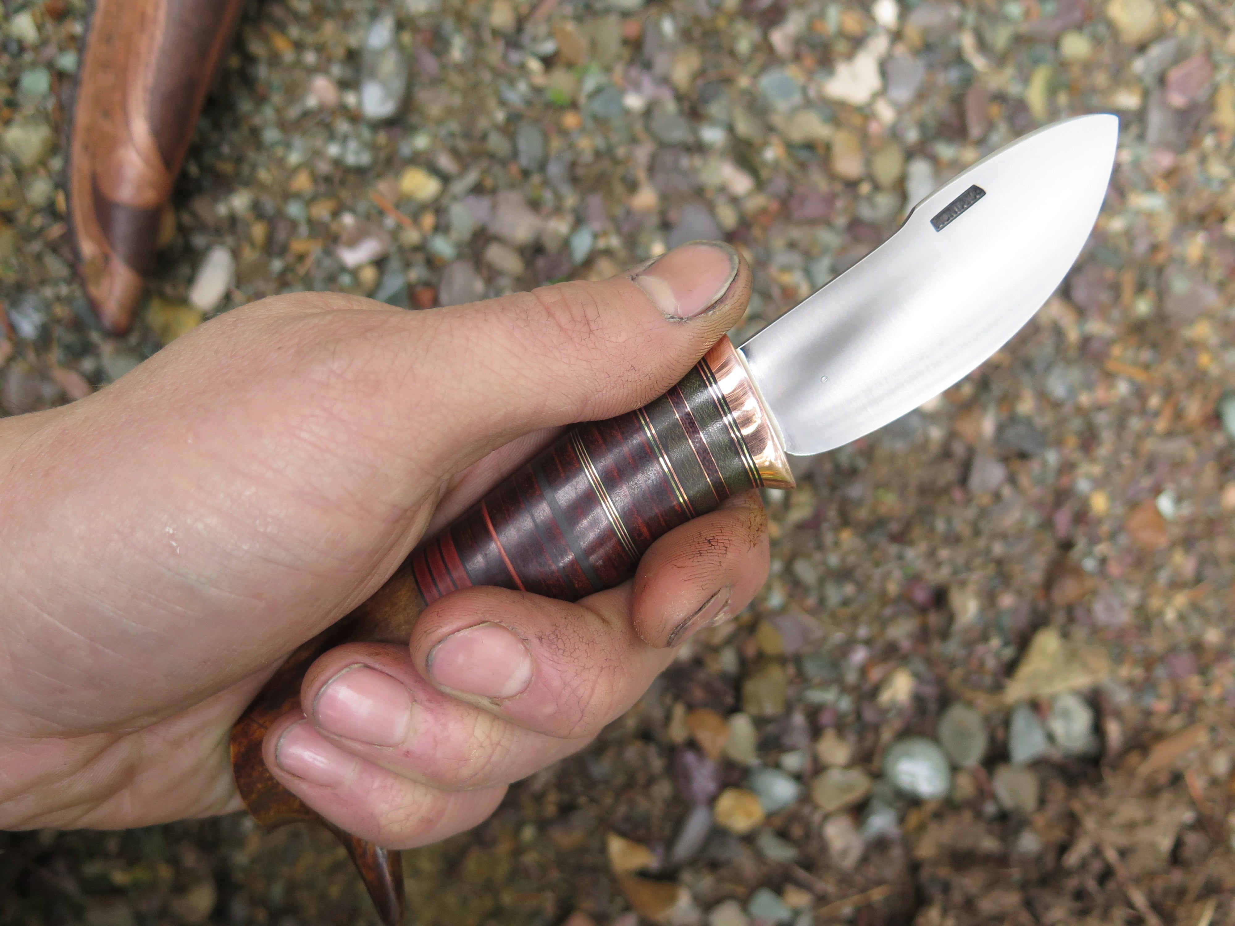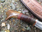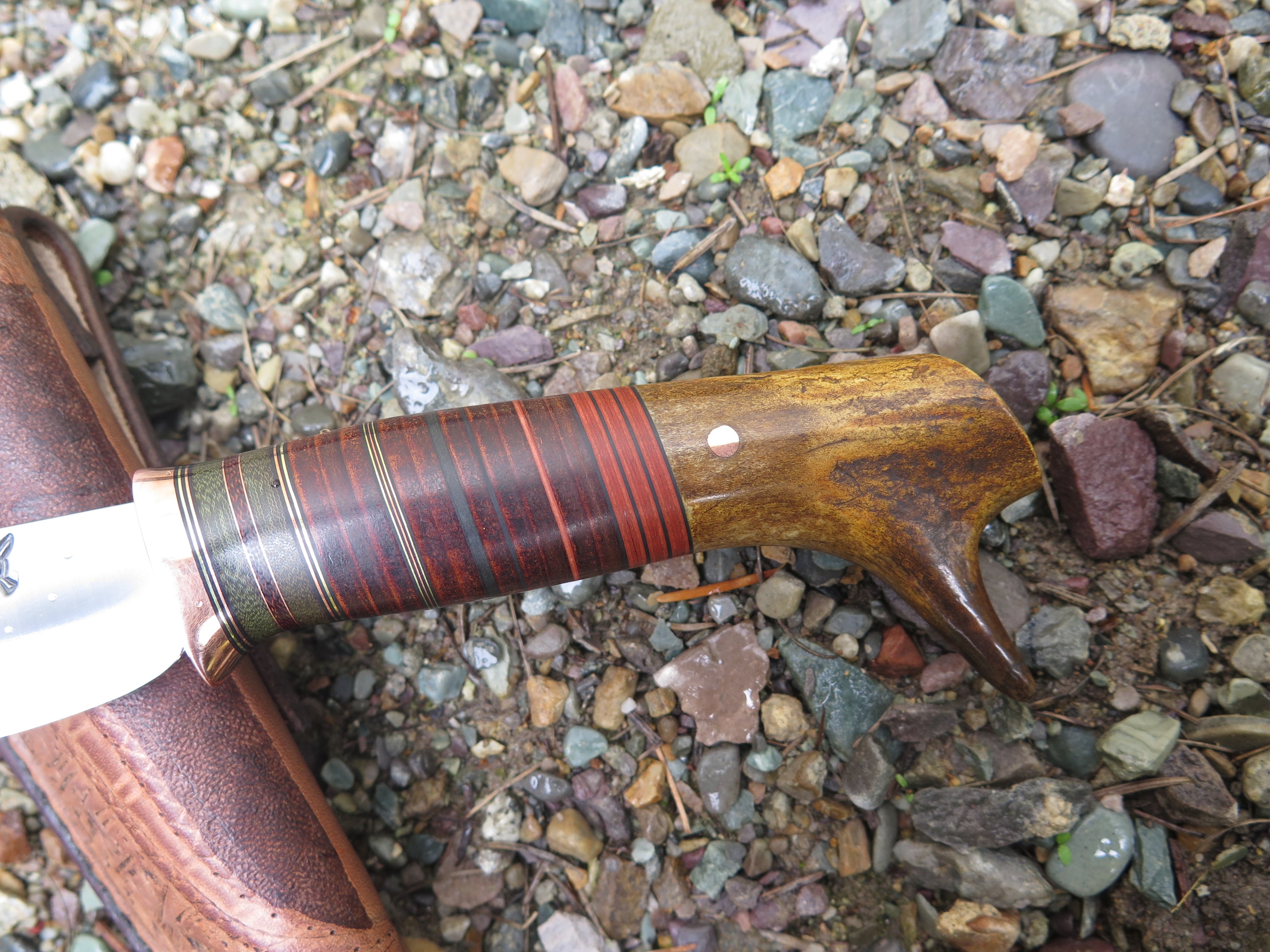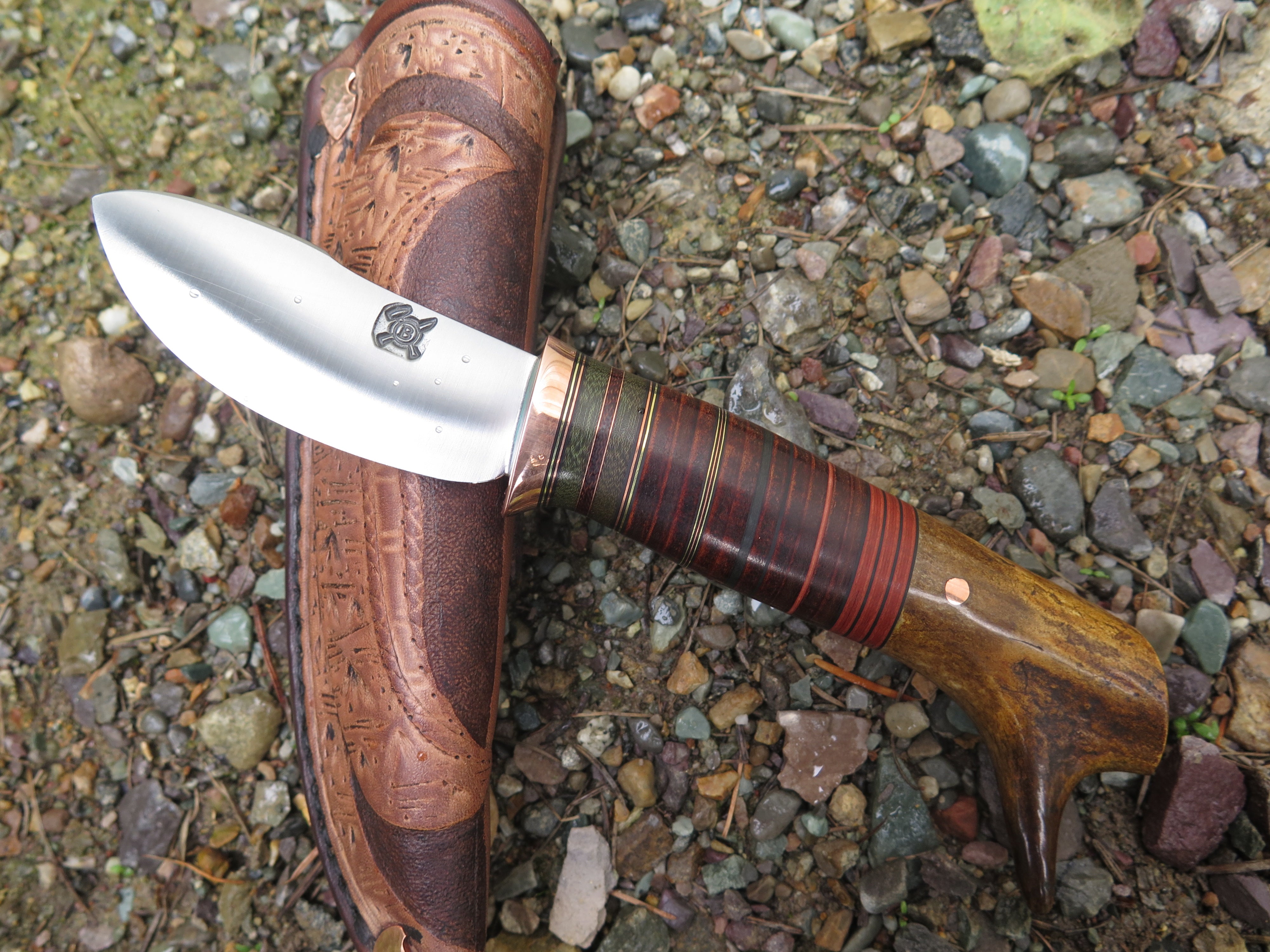 This beautiful new Canoe Knife from Behring Made© is hand forged from 1/8" thick high carbon 01 tool steel and it measures 2 3/4" from tip to guard with a razor sharp convex grind. The copper guard is soldered in place above black and maroon fiber, copper, brass, horsehide and green micarta spacers with a premium whitetail tine butt that's pinned with copper. Overall length is just about 7" and it comes in a custom Roger Mudbone Jones canoe pouch sheath.