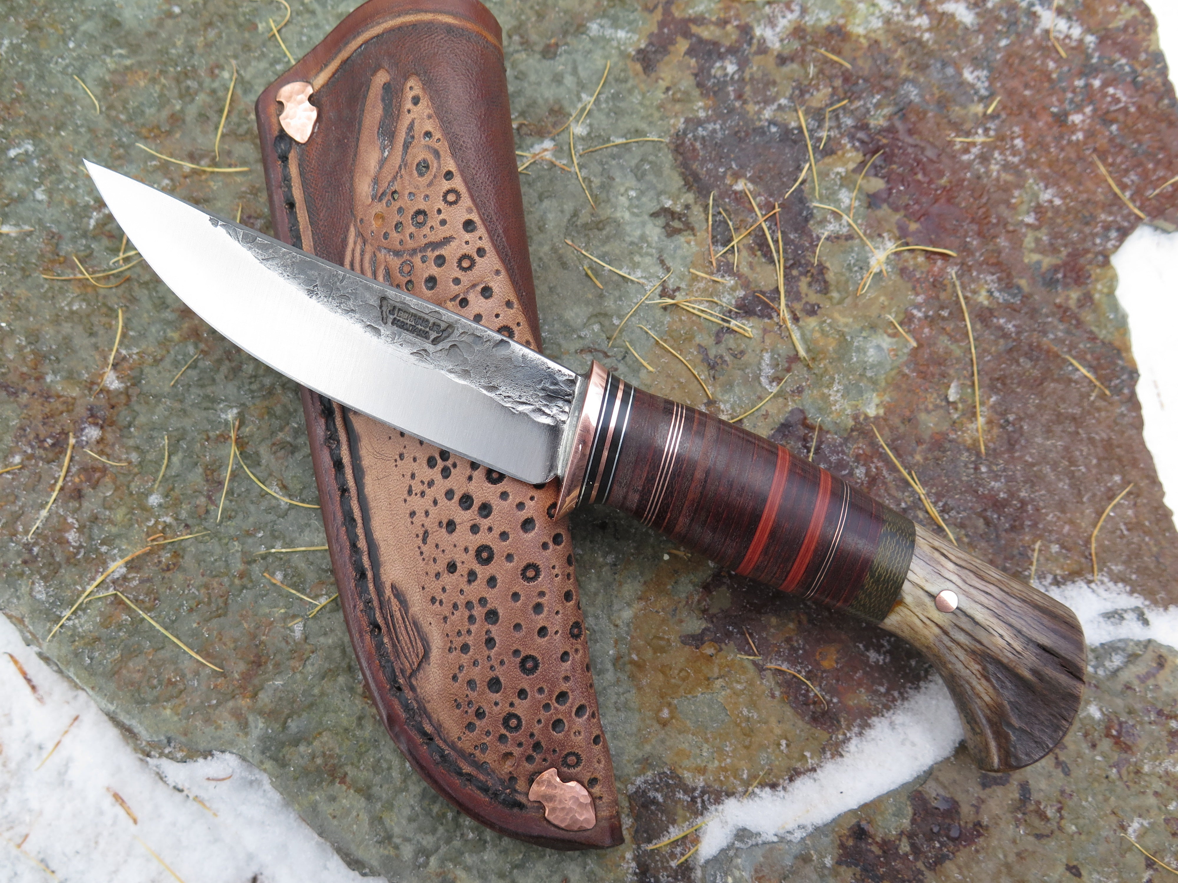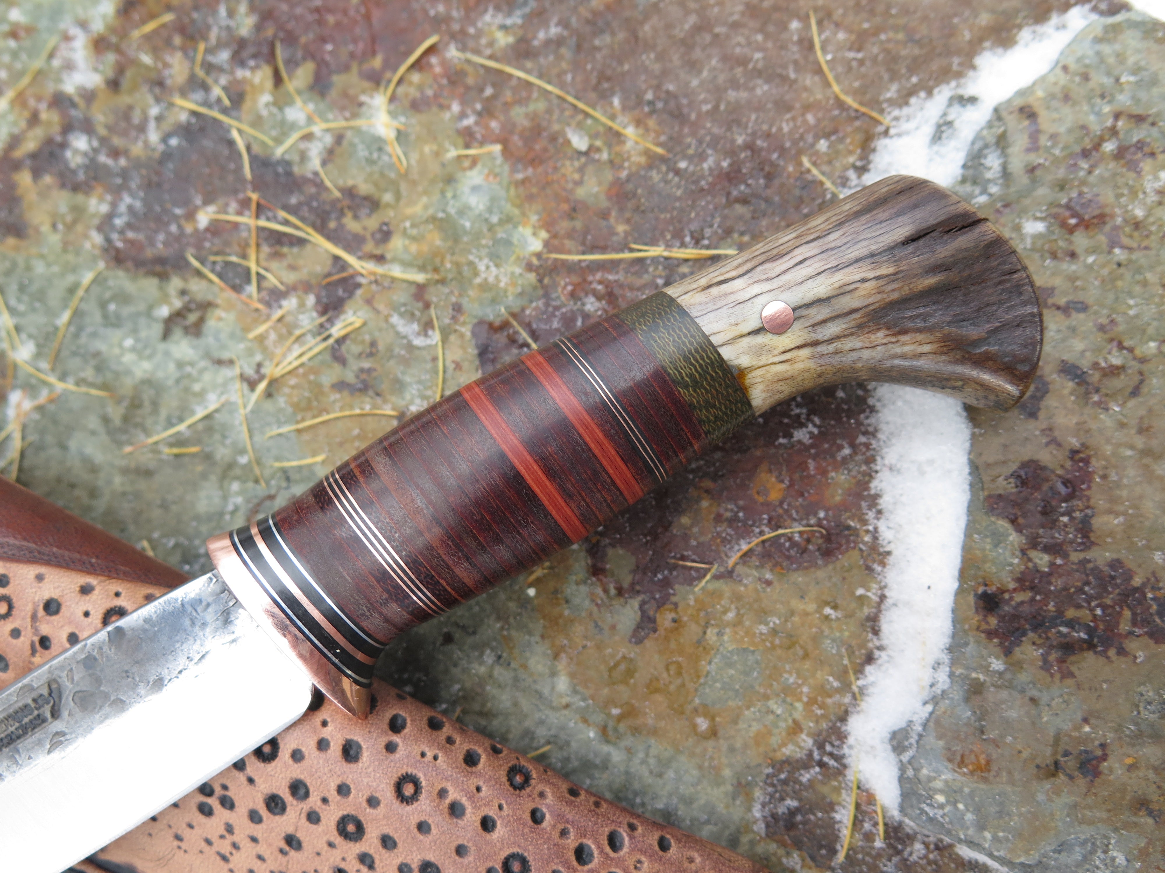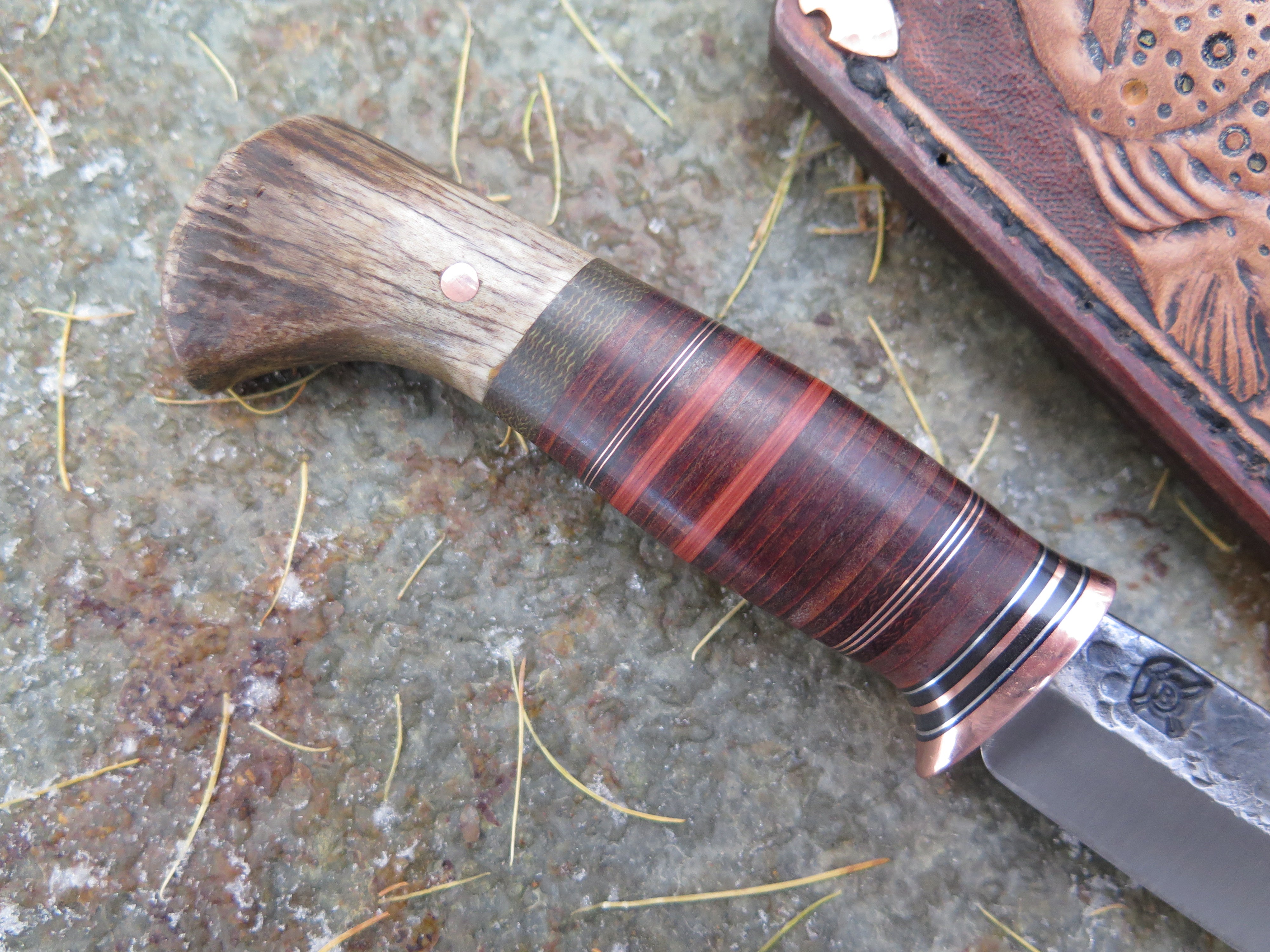 This beautiful new Pintail from Behring Made© is hand forged from 1/8" thick high carbon 01 tool steel and measures 4" from tip to guard with a razor sharp hollow grind and our hammermark finish. The copper guard is soldered in place above black, maroon, green micarta, copper, aluminum and horsehide leather spacers as well as a shiras moose butt that is pinned through the tang with copper. The overall length measures 8" and it comes in the shown custom tooled sheath from Roger Mudbone Jones.