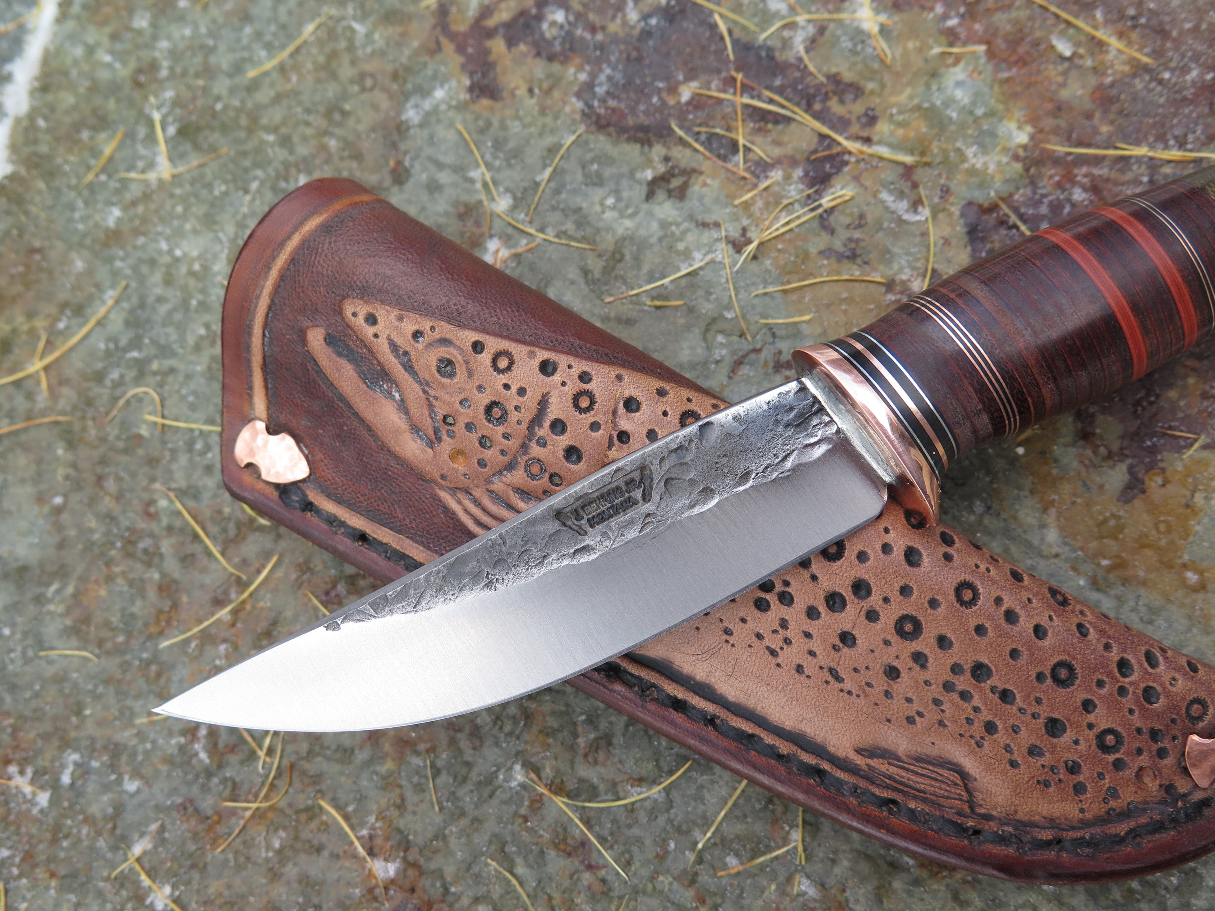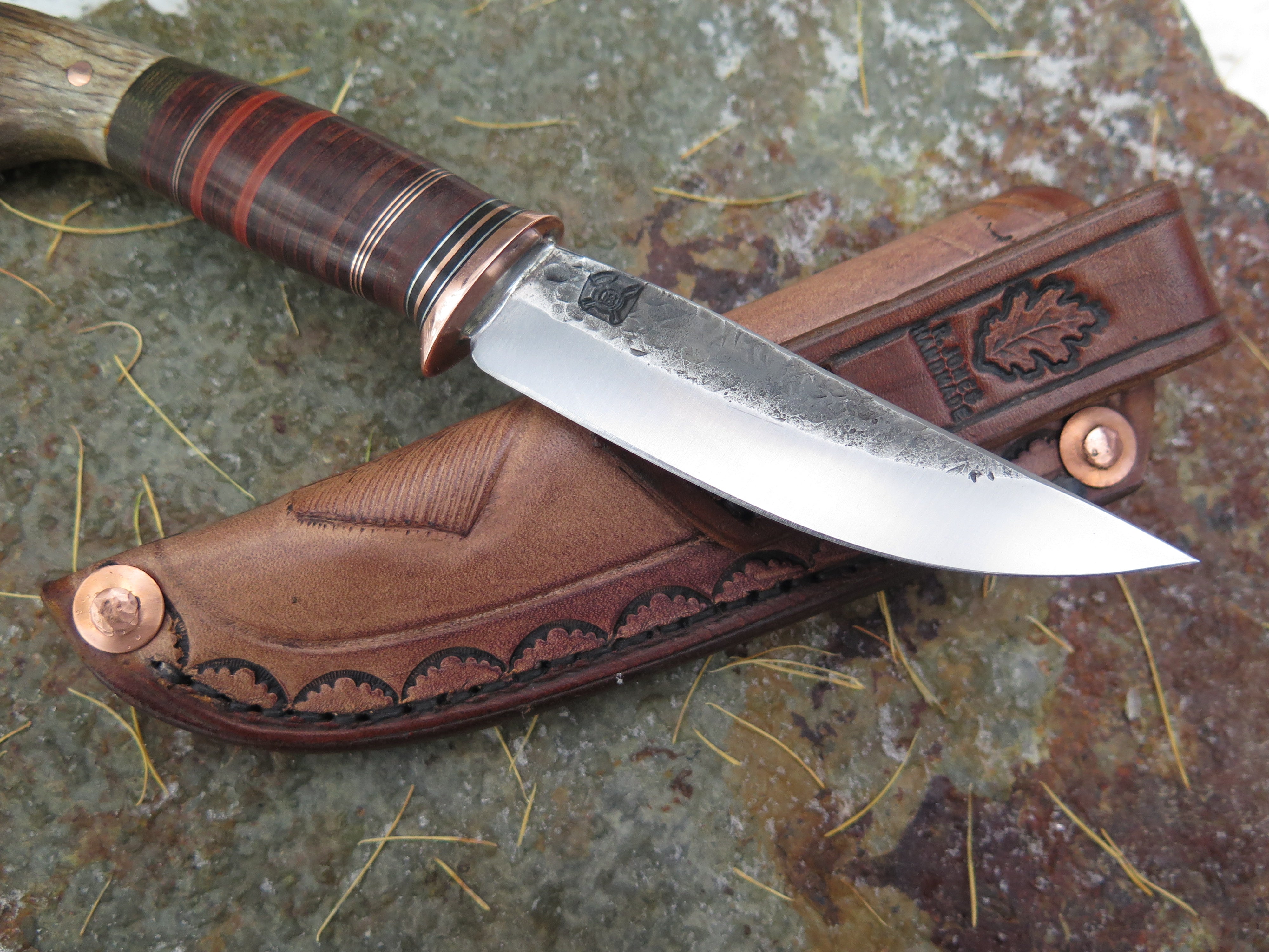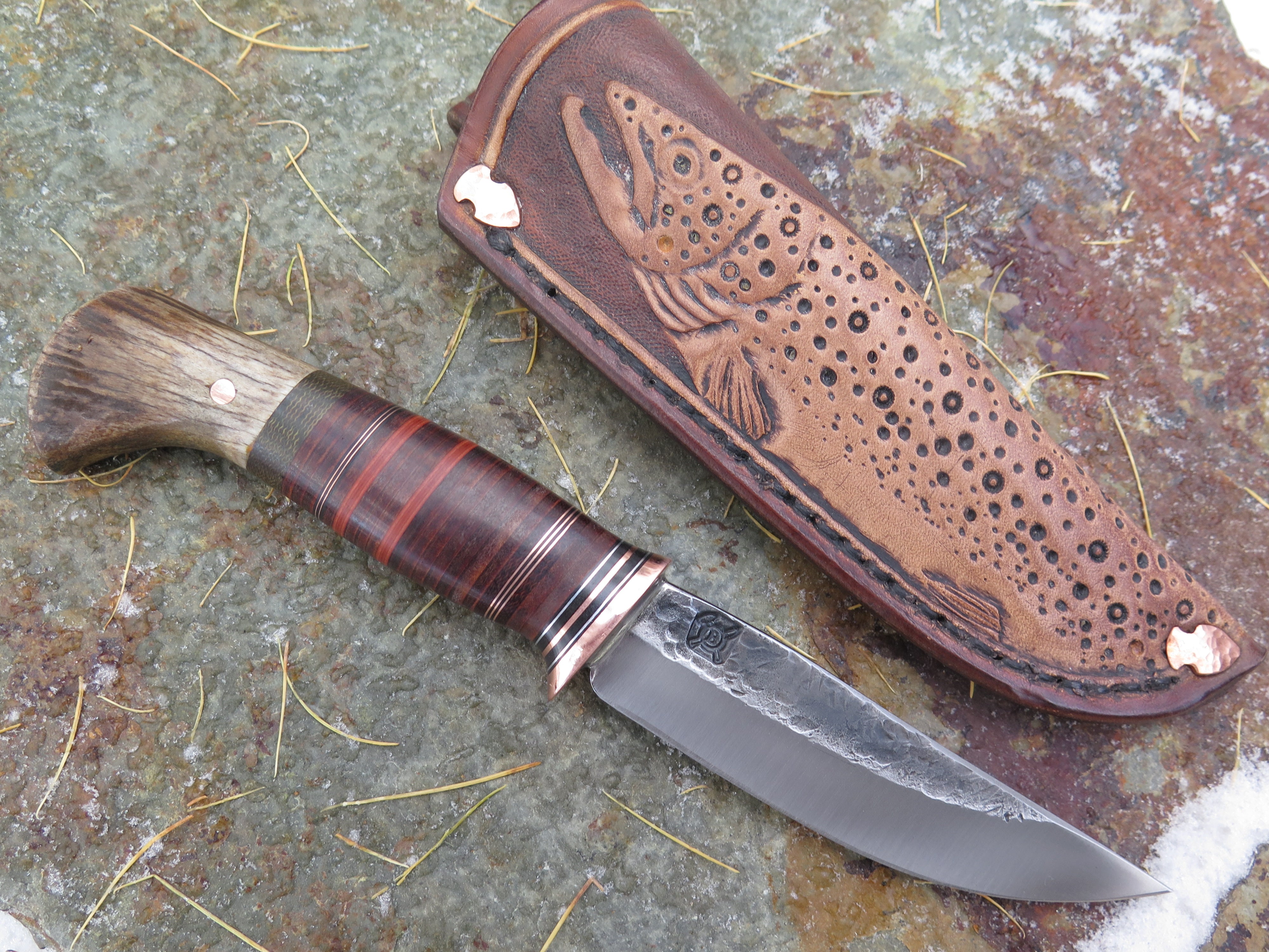 This beautiful new Pintail from Behring Made© is hand forged from 1/8" thick high carbon 01 tool steel and measures 4" from tip to guard with a razor sharp hollow grind and our hammermark finish. The copper guard is soldered in place above black, maroon, green micarta, copper, aluminum and horsehide leather spacers as well as a shiras moose butt that is pinned through the tang with copper. The overall length measures 8" and it comes in the shown custom tooled sheath from Roger Mudbone Jones.