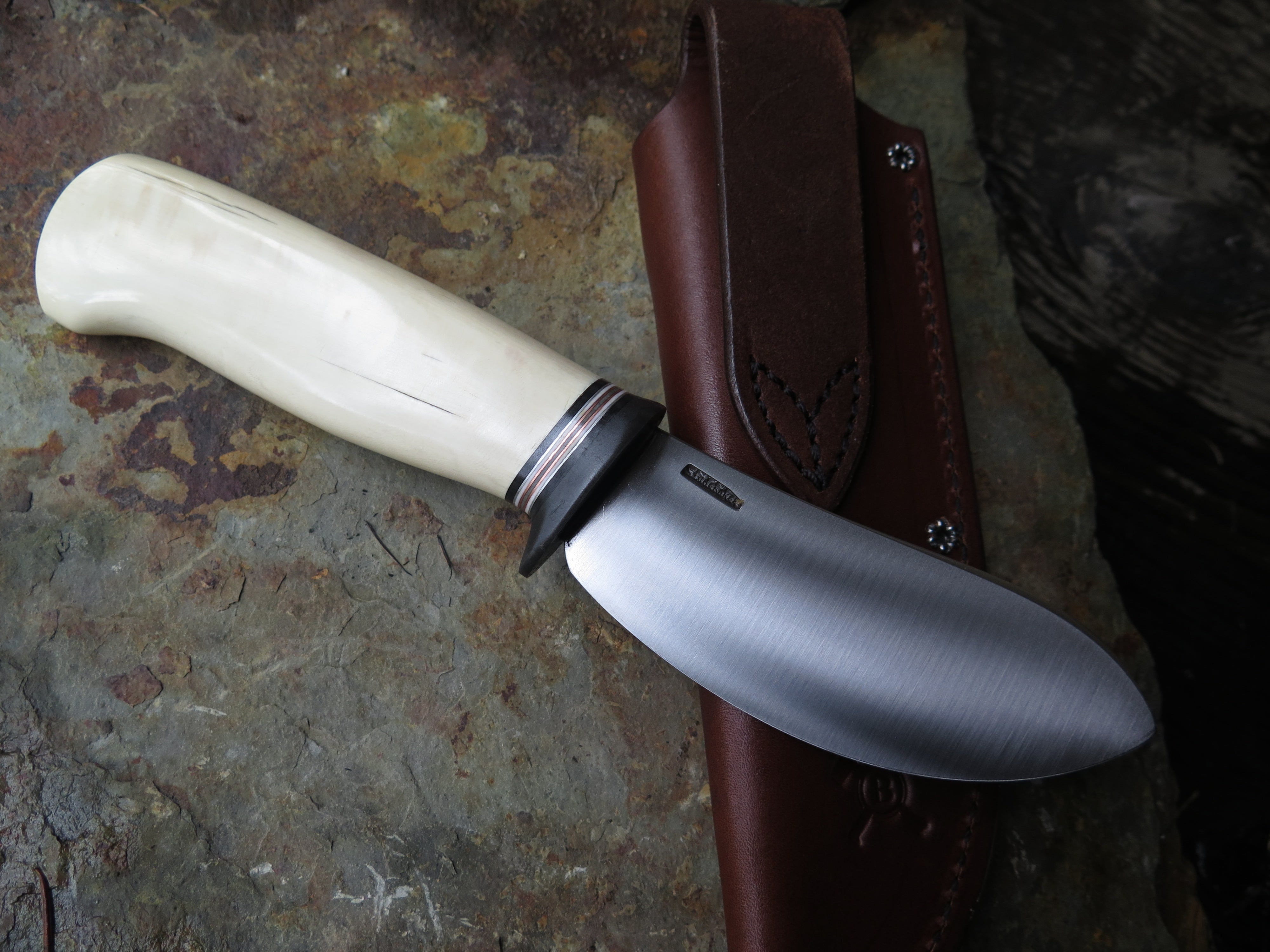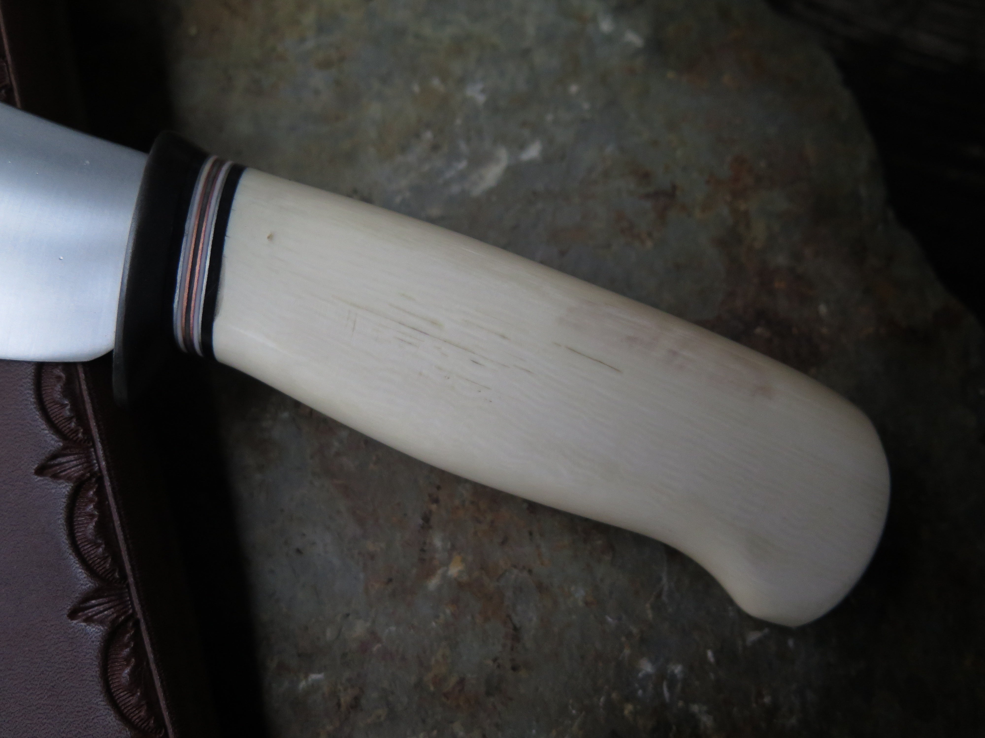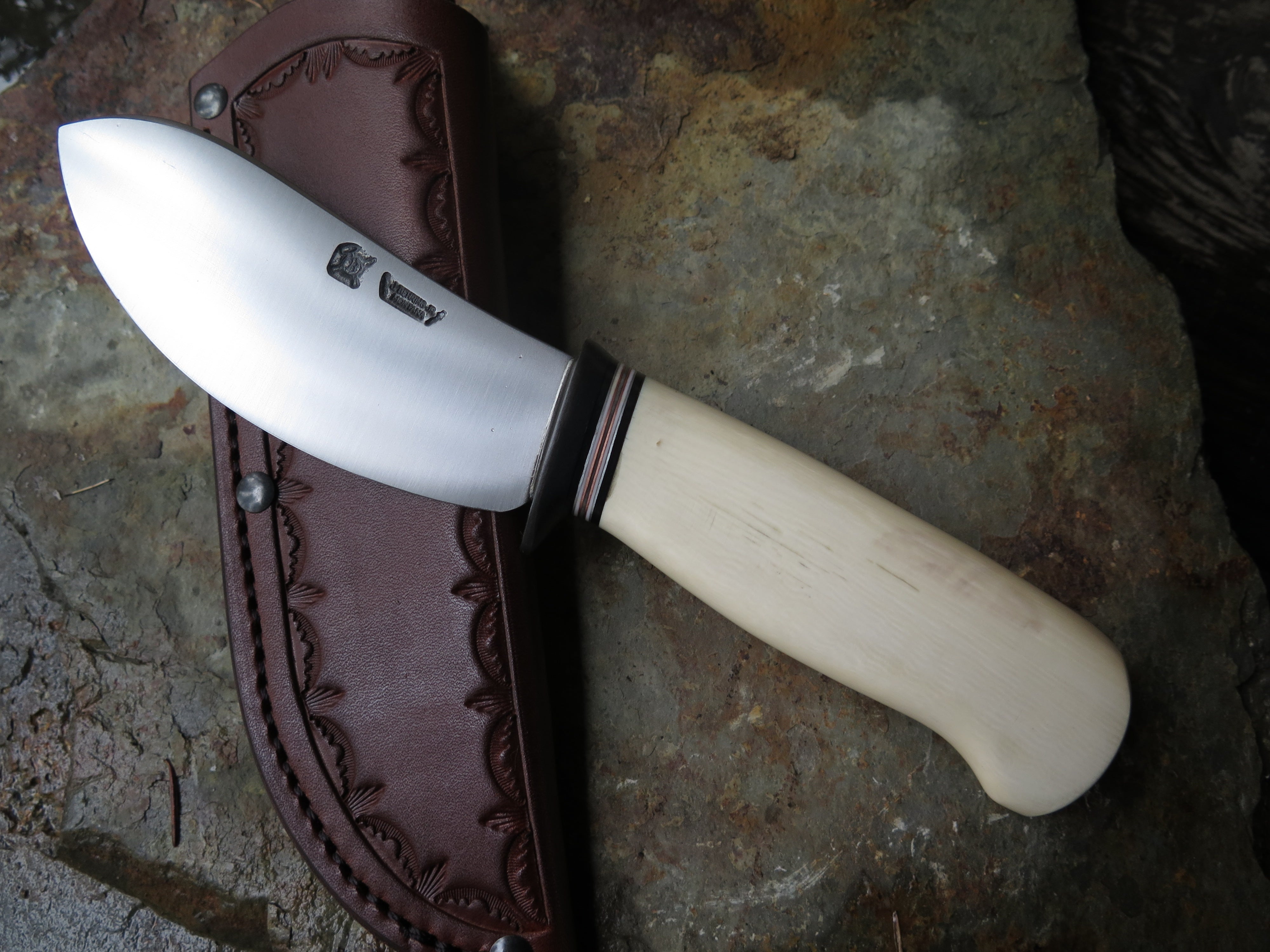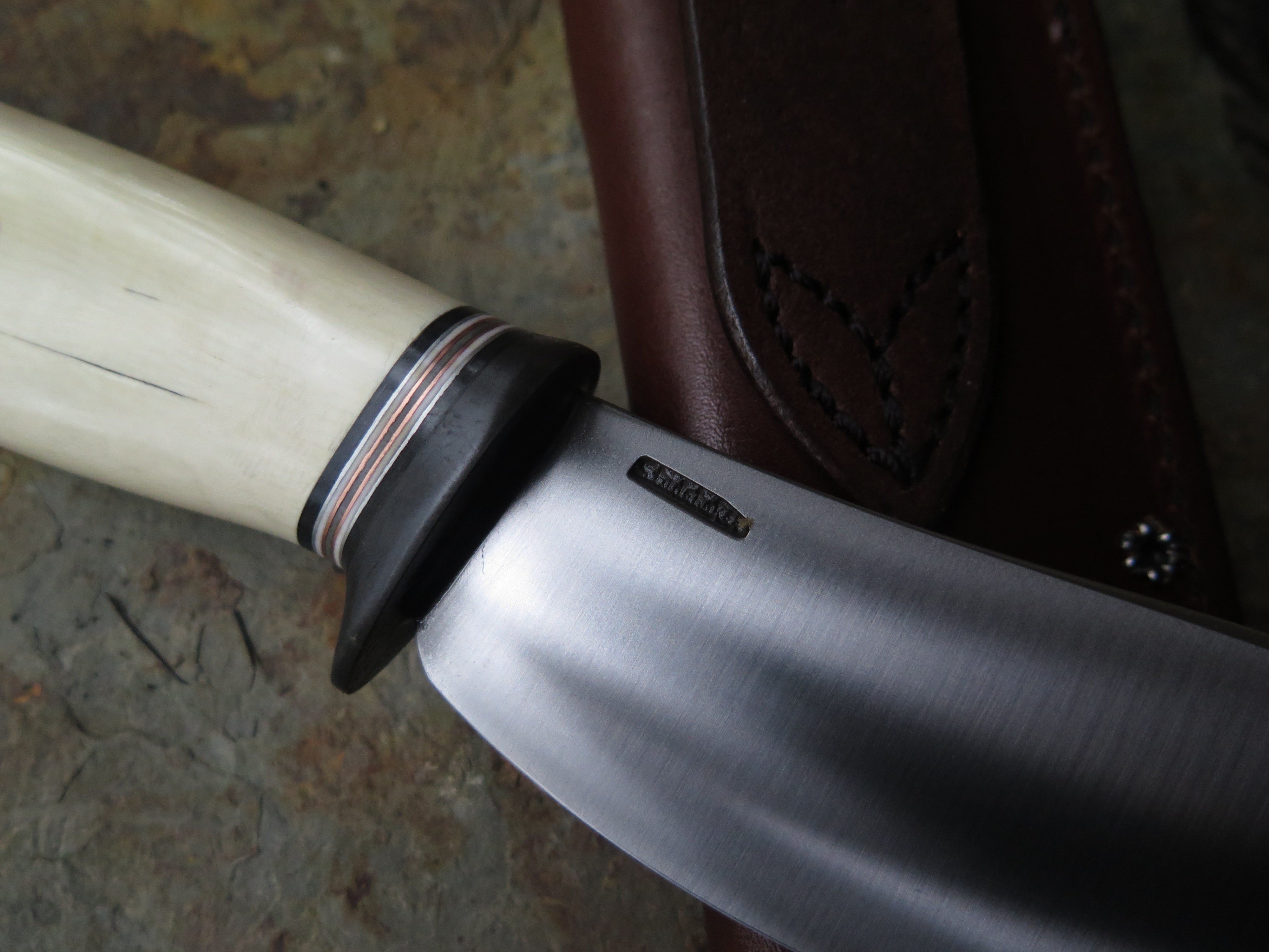 This beautiful new Nessmuk from Behring Made© is hand forged from pre-WWII Studebaker leaf springs and it measures 4 1/4" from tip to guard with a razor sharp true convex grind. The blued steel guard is soldered in place above black, white, gray, copper and aluminum spacers as well as a premium ancient mammoth ivory handle. The overall length measures 8 3/4" and it comes in a border tooled pouch sheath.