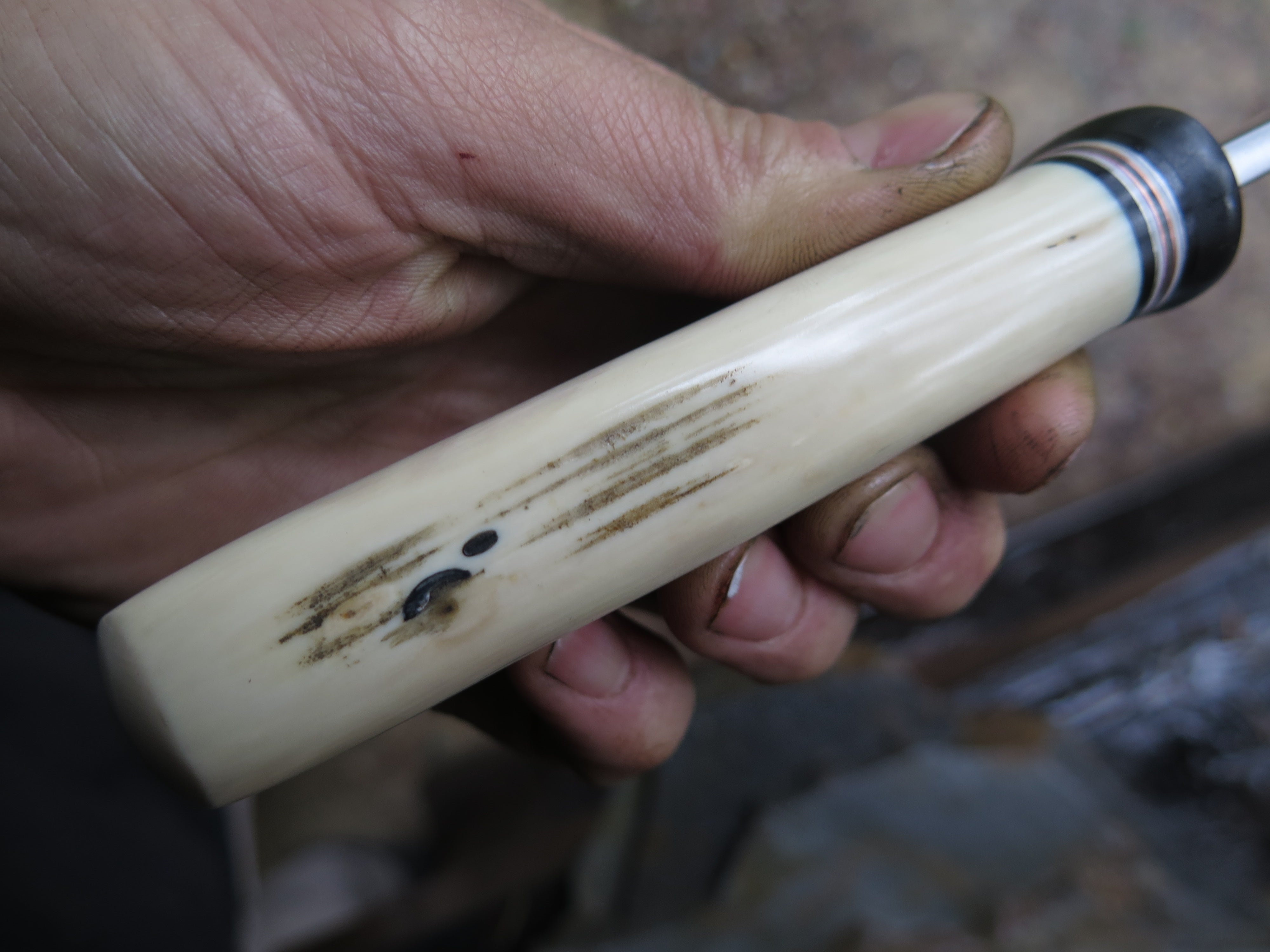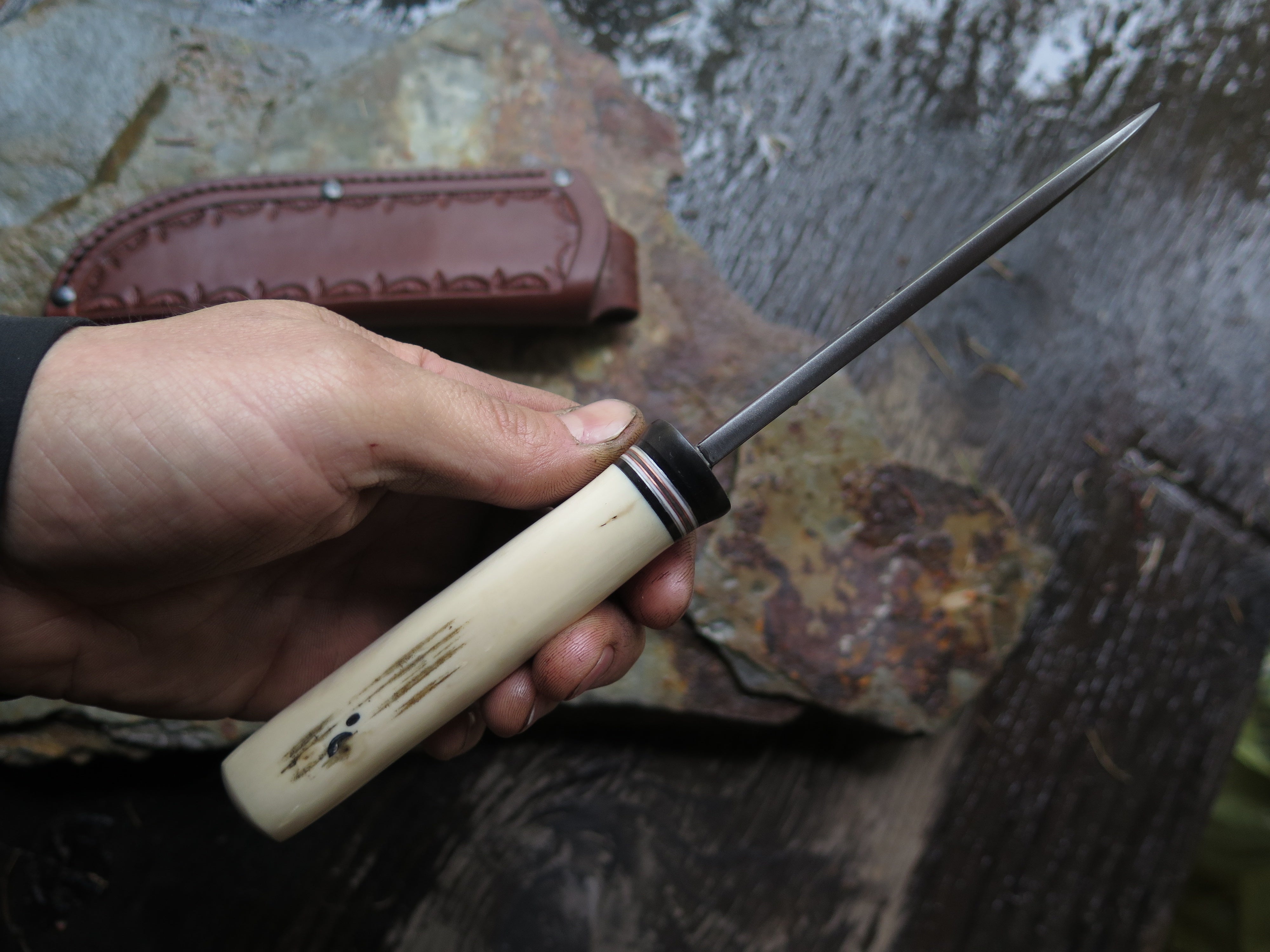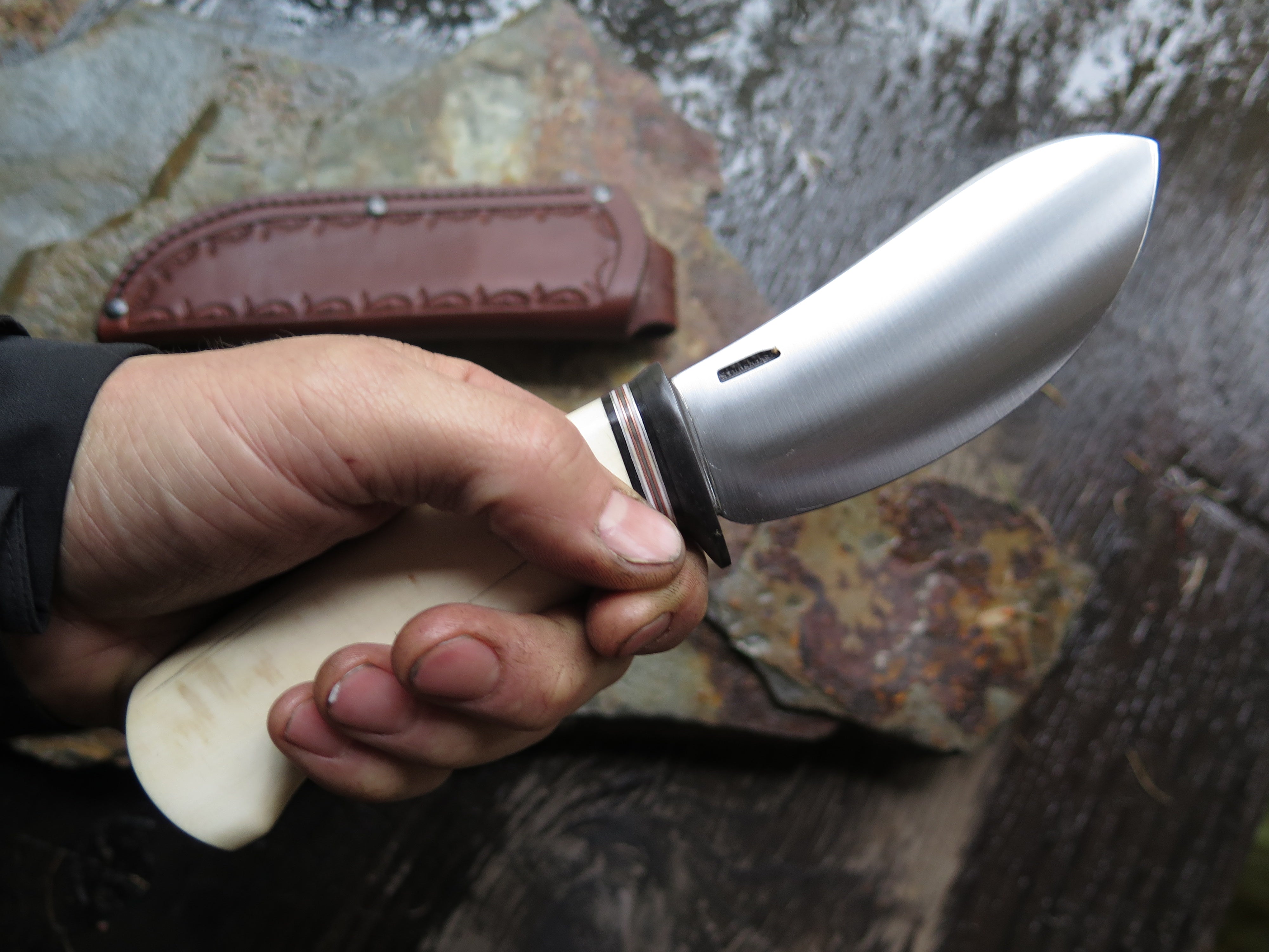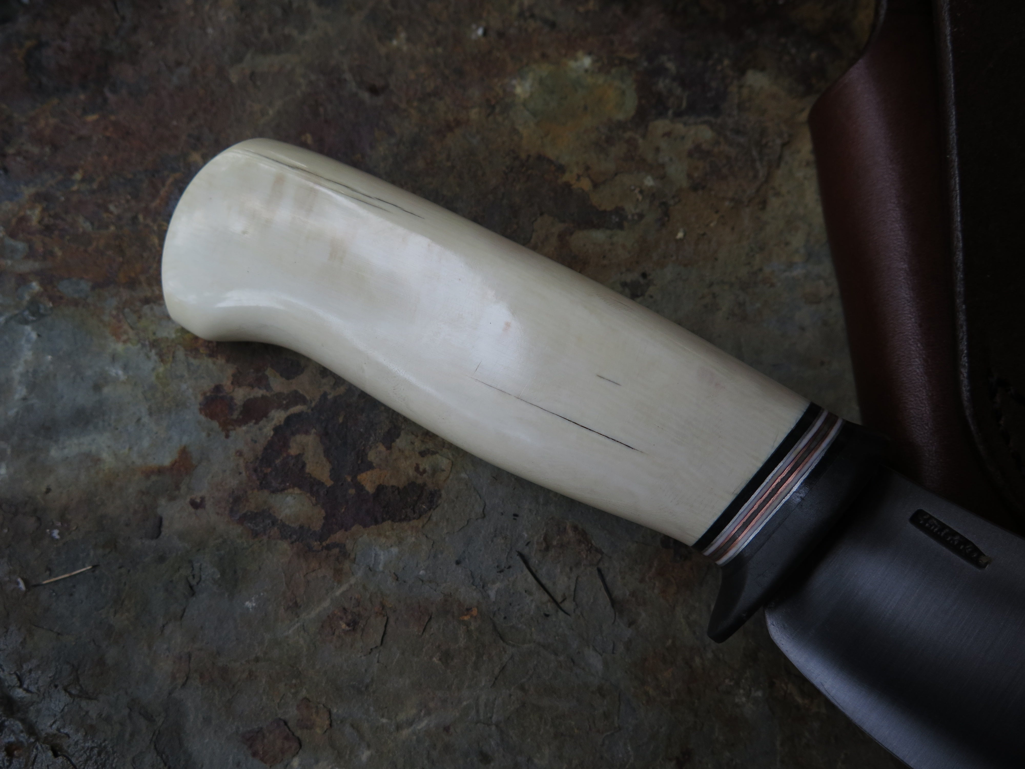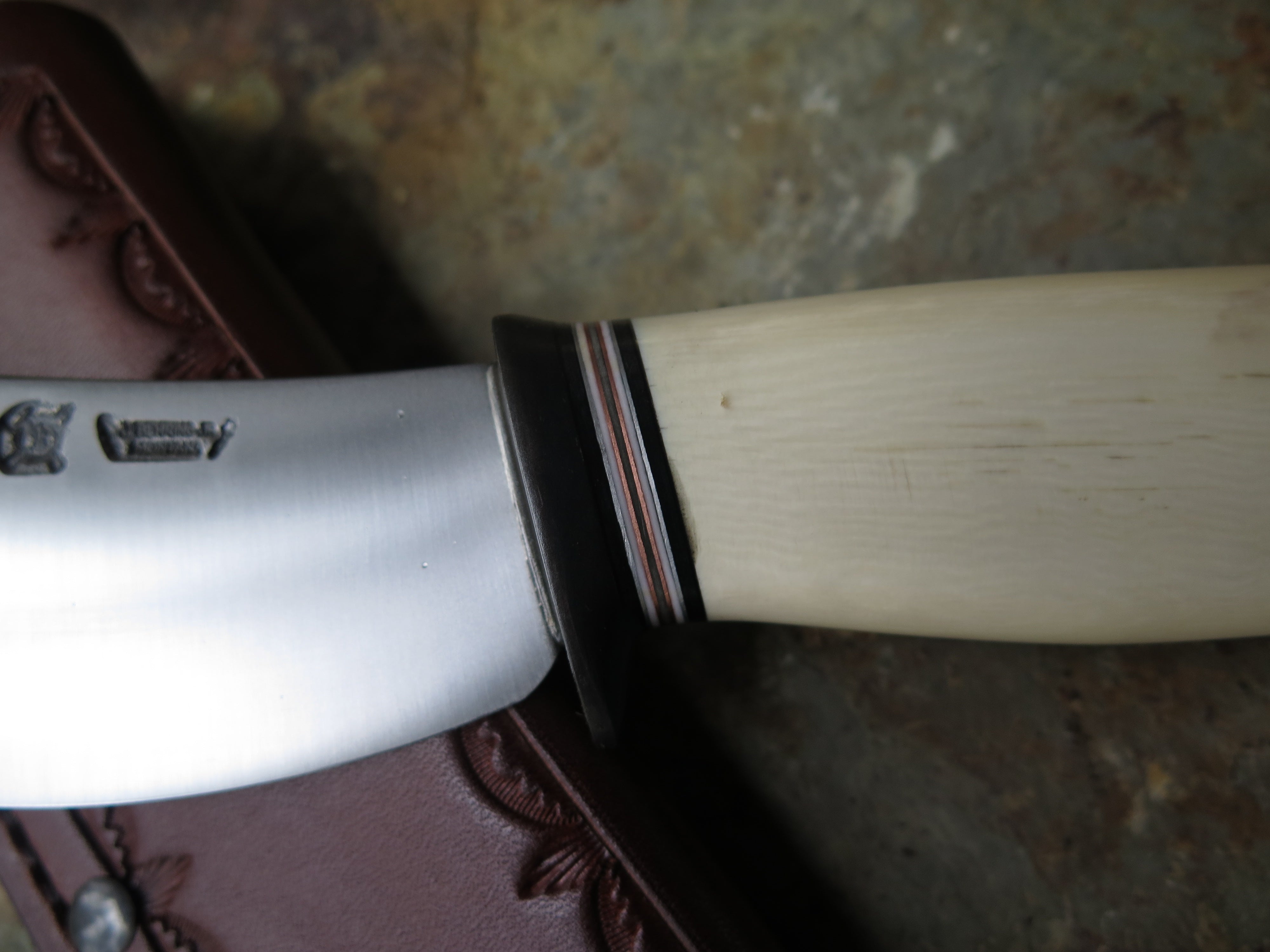 This beautiful new Nessmuk from Behring Made© is hand forged from pre-WWII Studebaker leaf springs and it measures 4 1/4" from tip to guard with a razor sharp true convex grind. The blued steel guard is soldered in place above black, white, gray, copper and aluminum spacers as well as a premium ancient mammoth ivory handle. The overall length measures 8 3/4" and it comes in a border tooled pouch sheath.