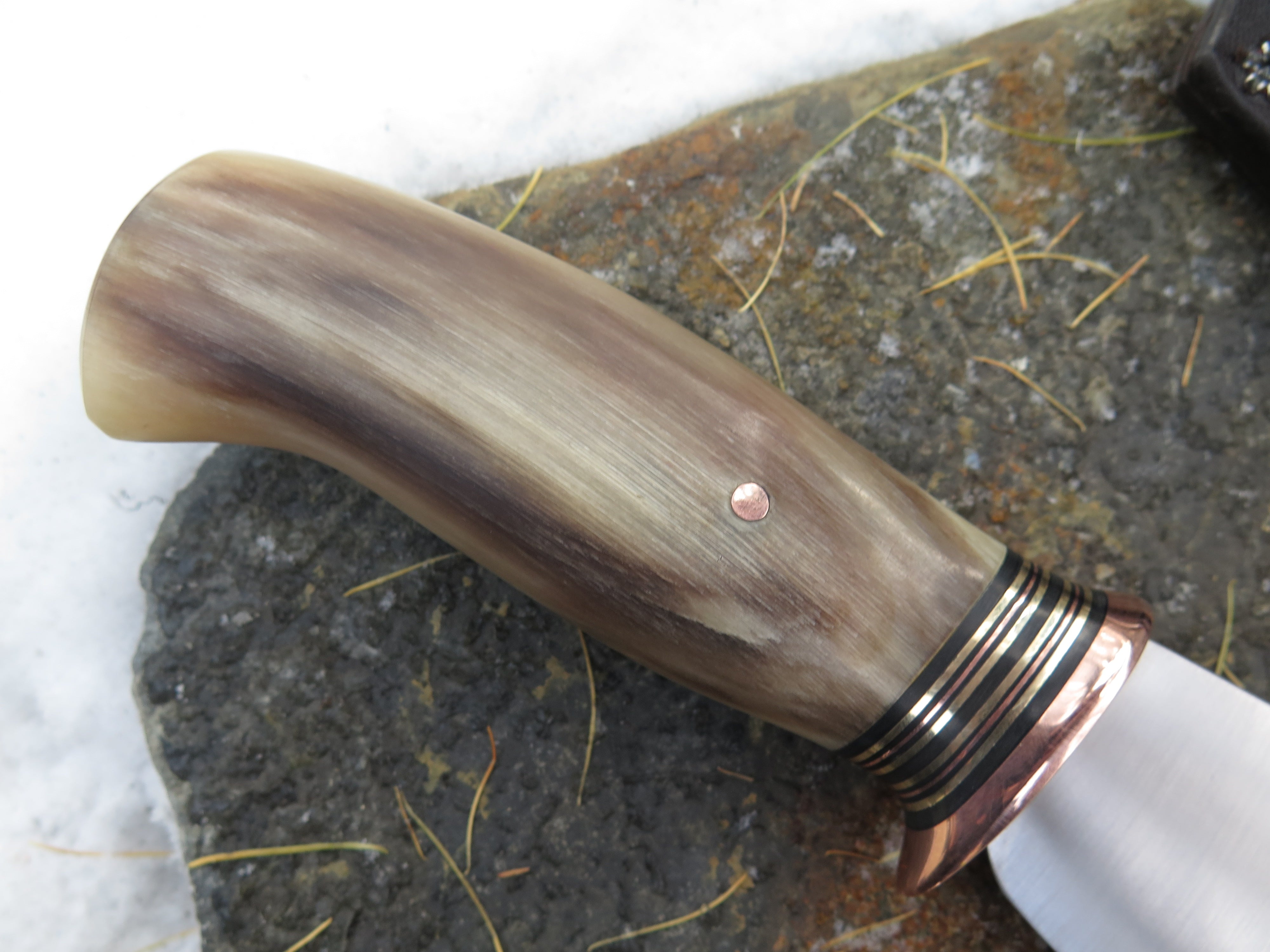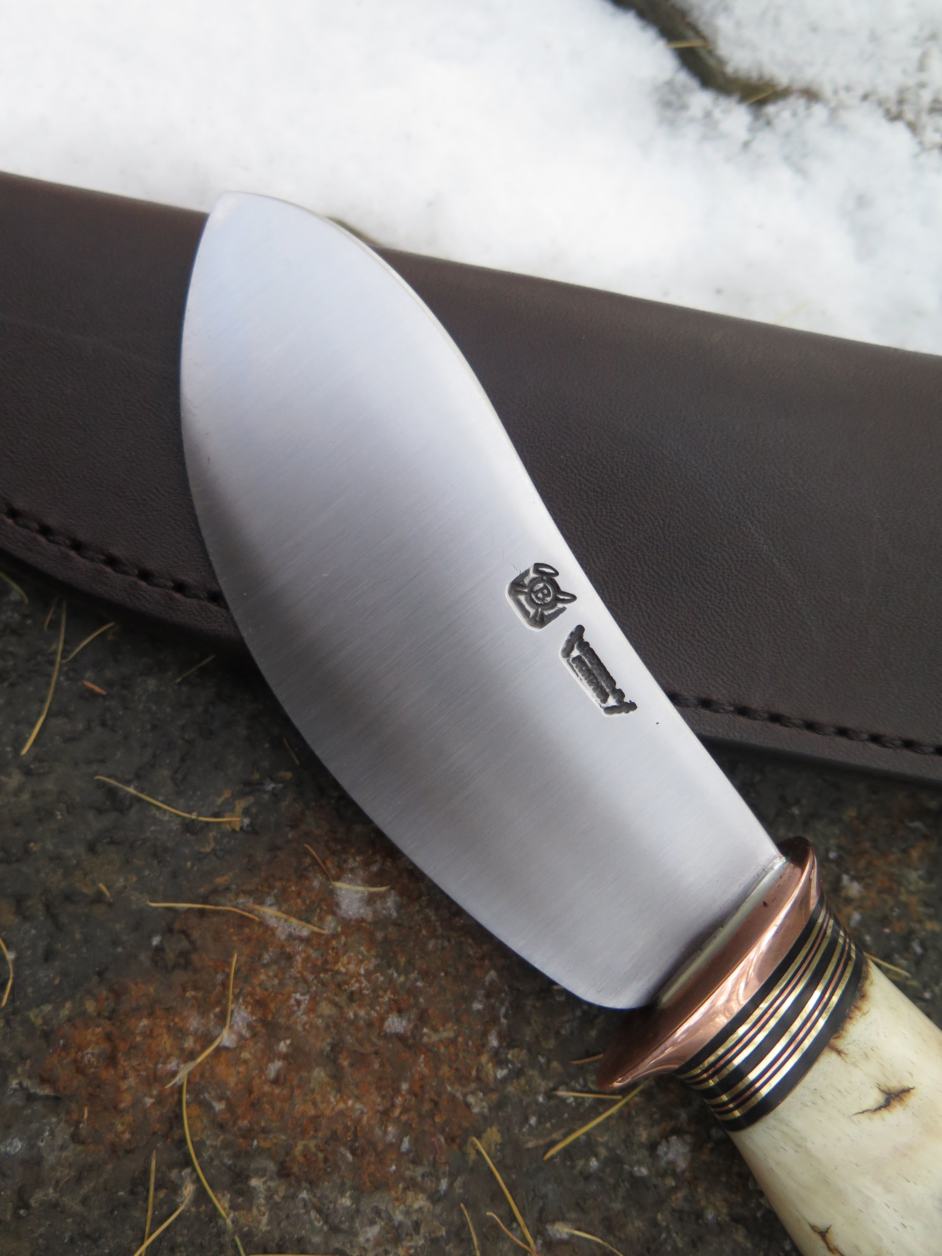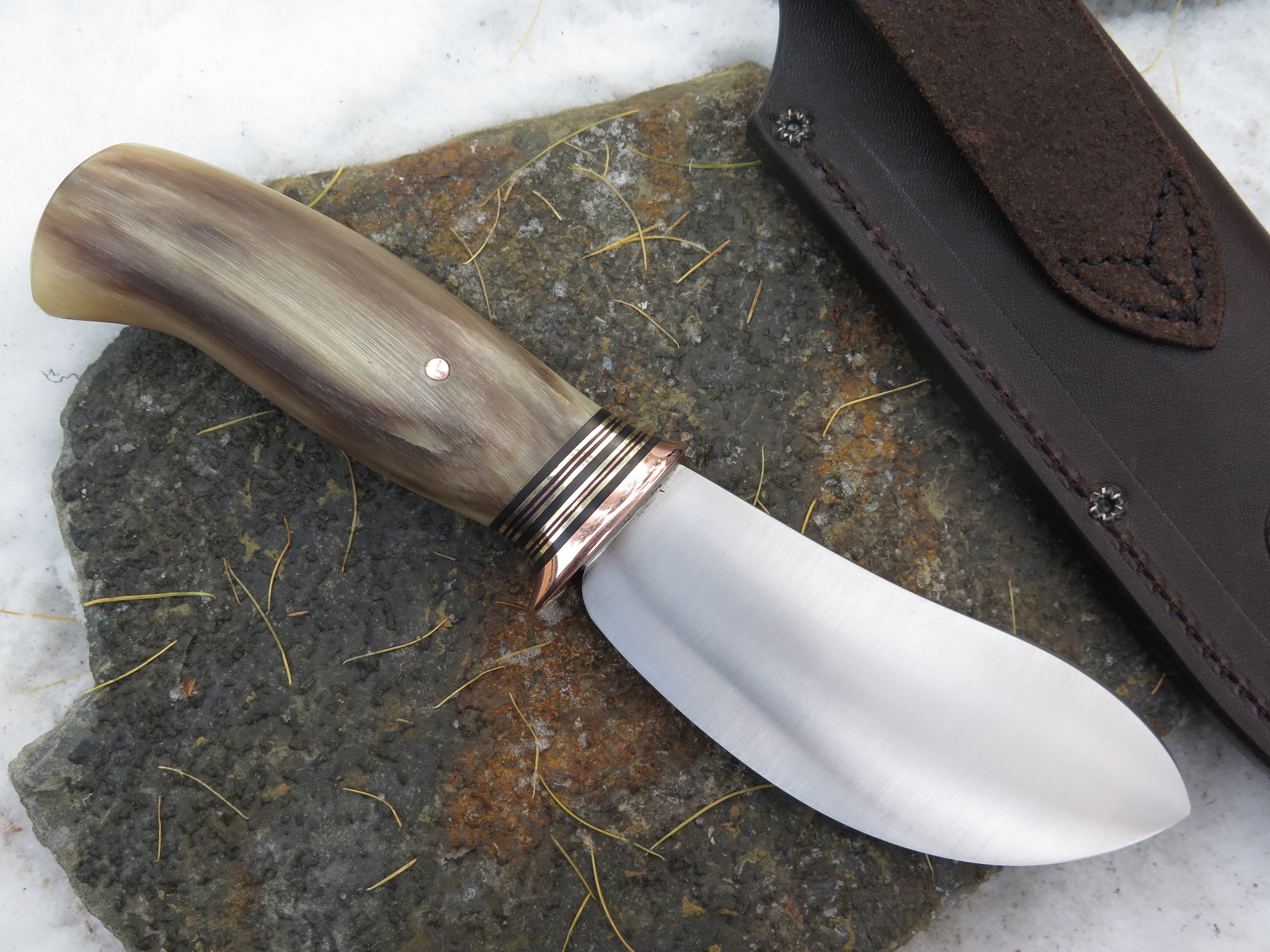 This remarkable Nessmuk from Behring Made© is hand forged from 3/16" thick high carbon 01 tool steel and it measures 4 3/4" from tip to guard with a razor sharp convex grind. The copper guard is soldered in place above black, brass and copper spacers in addition to the top shelf big sheep horn handle with a wonderful texture and color range. The overall length measures 9 3/8" and it comes in a full cover classic belt pouch sheath.