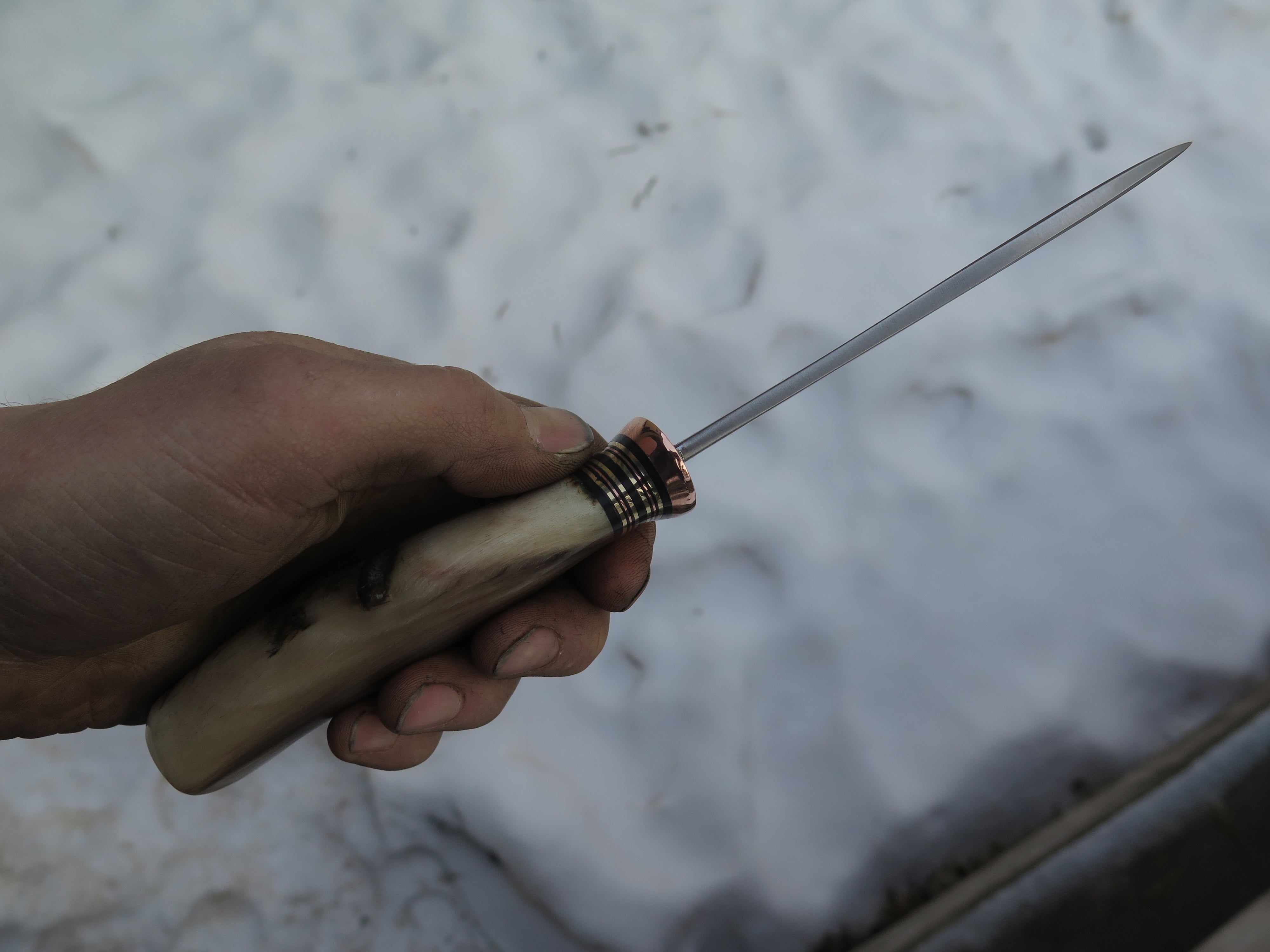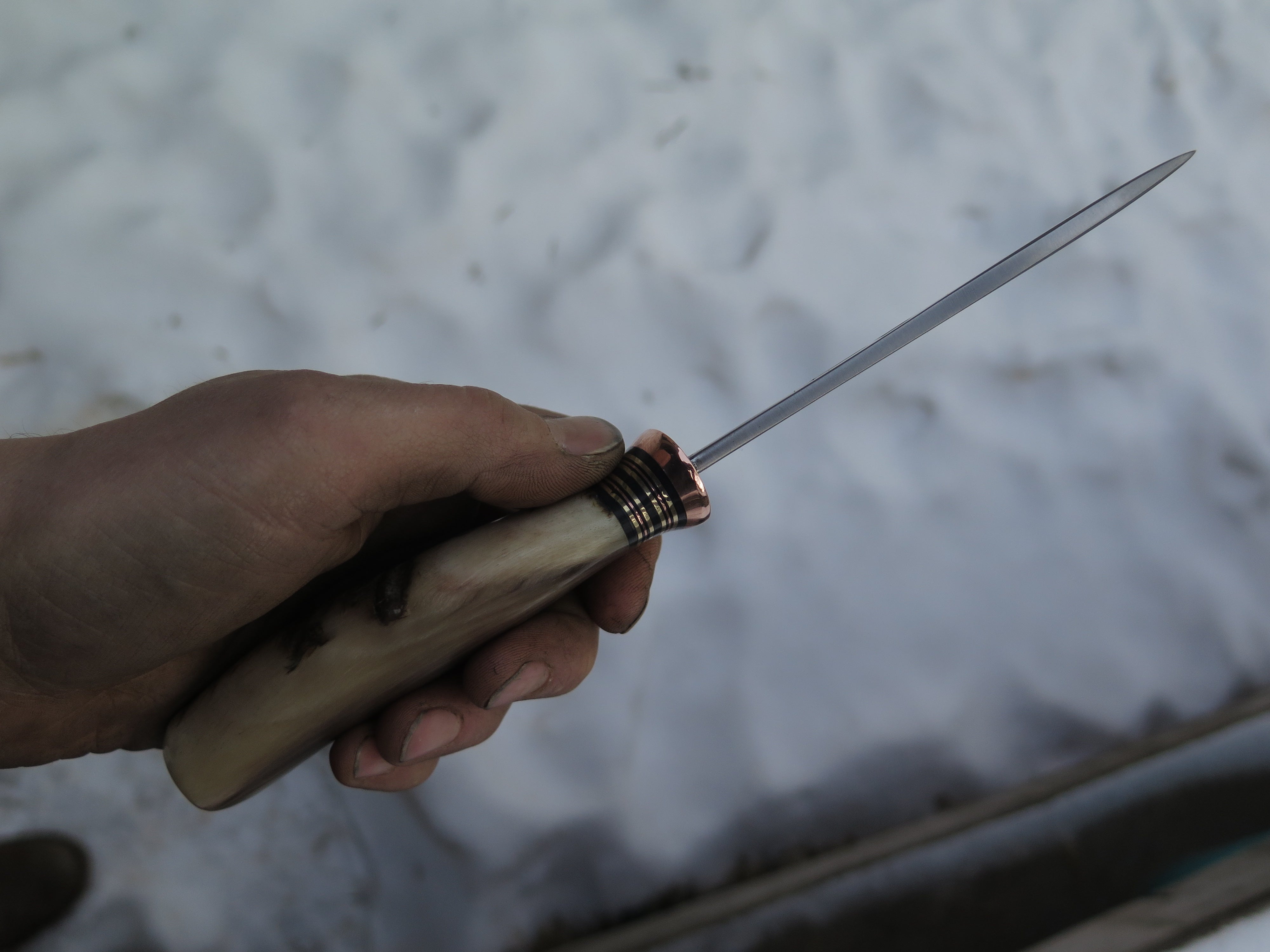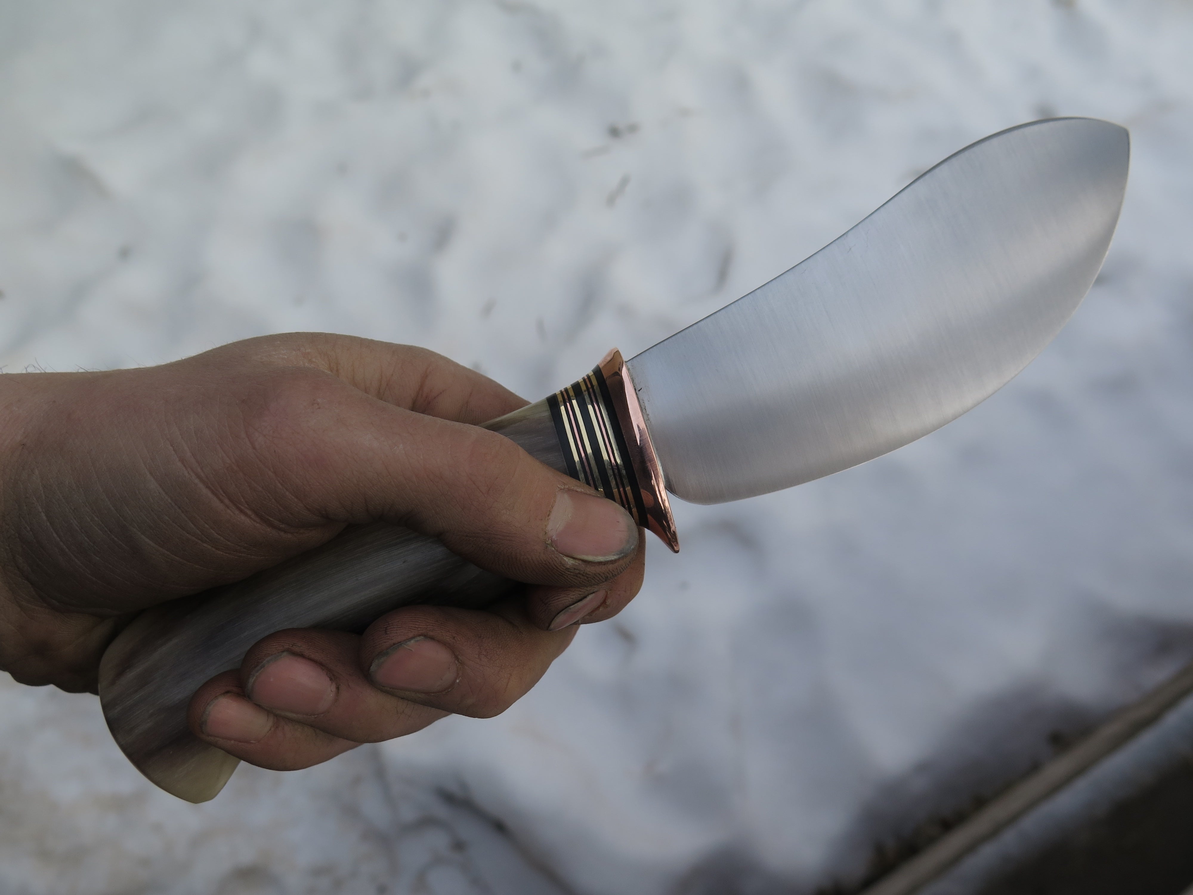 This remarkable Nessmuk from Behring Made© is hand forged from 3/16" thick high carbon 01 tool steel and it measures 4 3/4" from tip to guard with a razor sharp convex grind. The copper guard is soldered in place above black, brass and copper spacers in addition to the top shelf big sheep horn handle with a wonderful texture and color range. The overall length measures 9 3/8" and it comes in a full cover classic belt pouch sheath.
