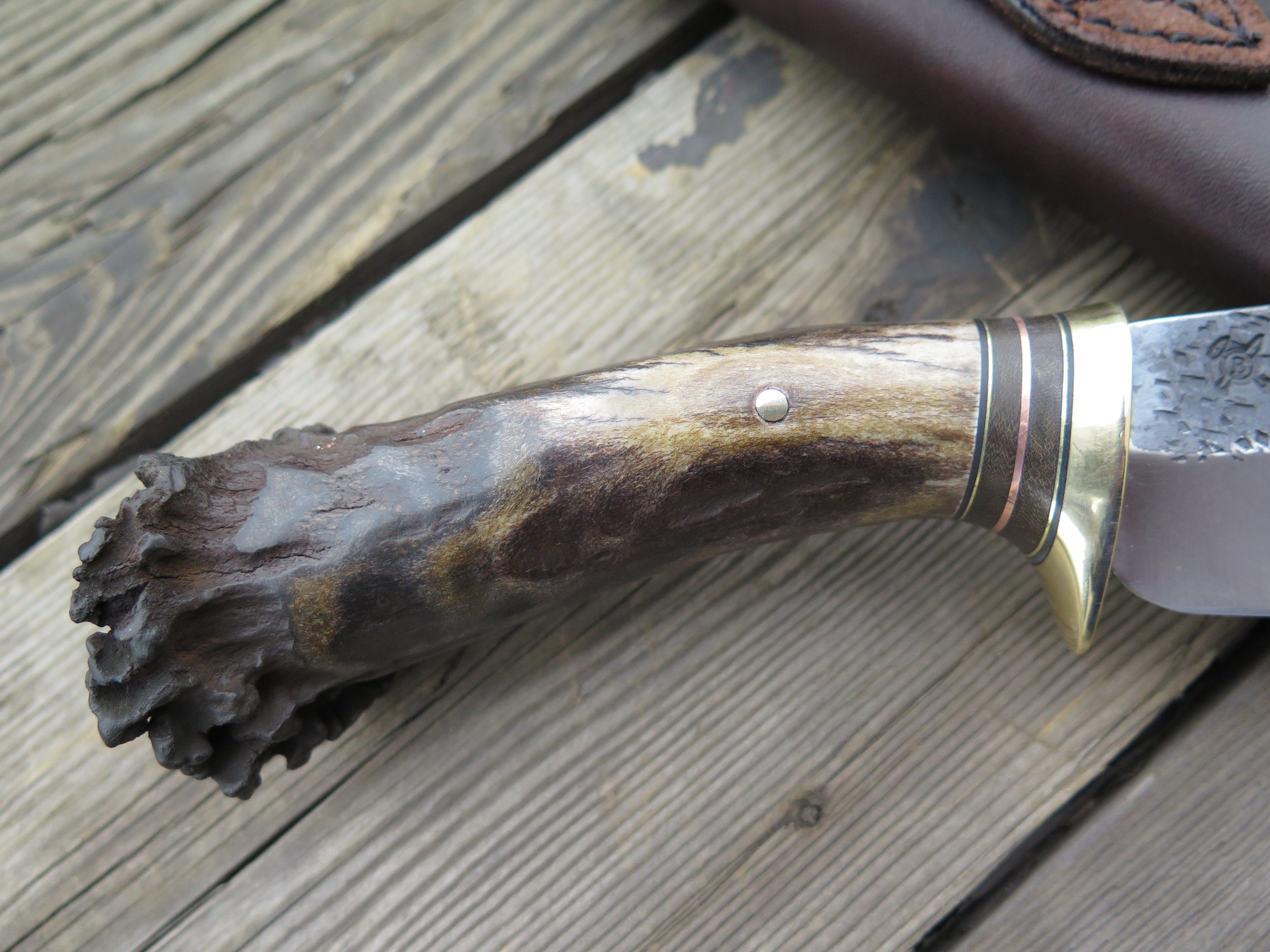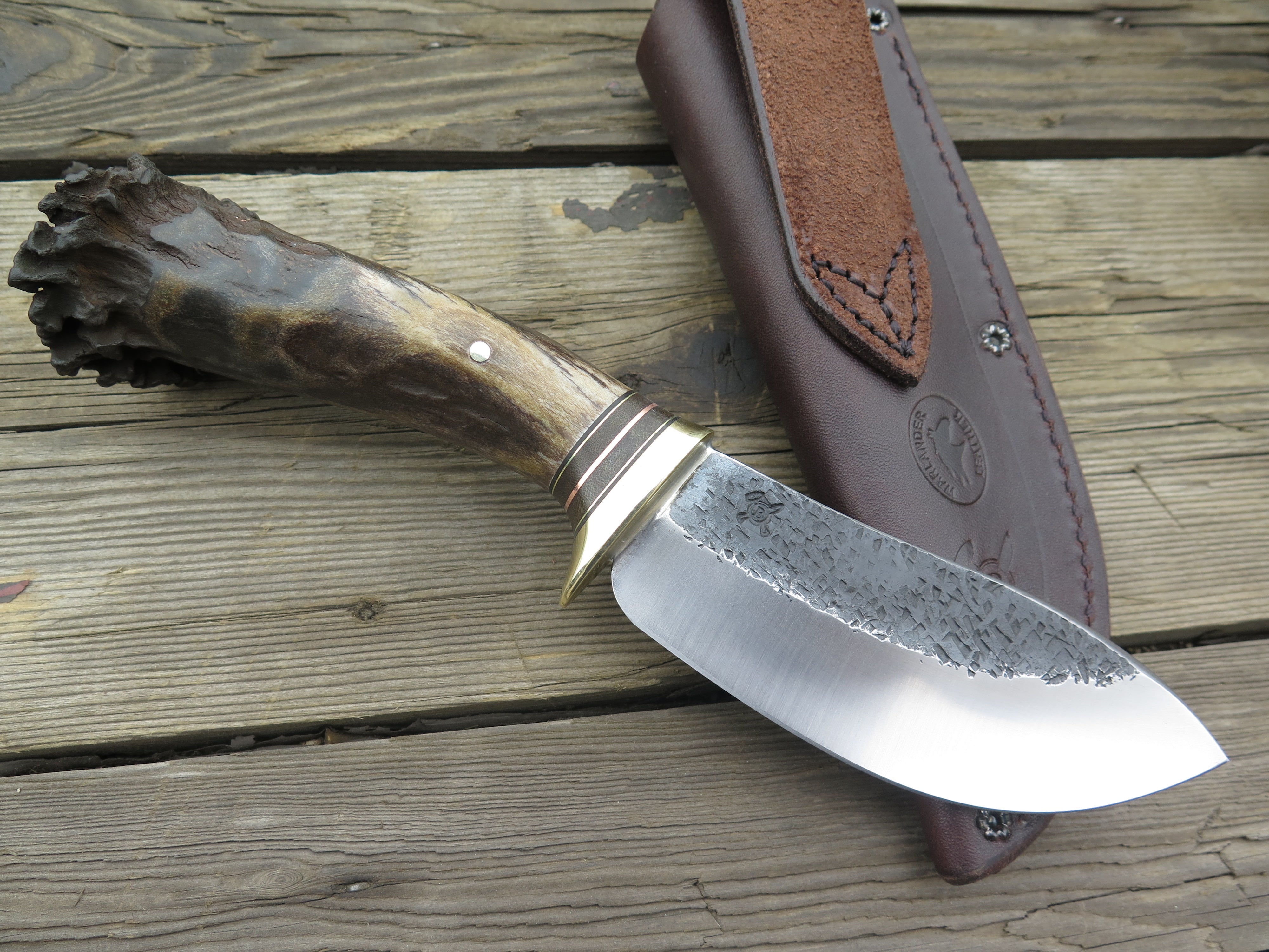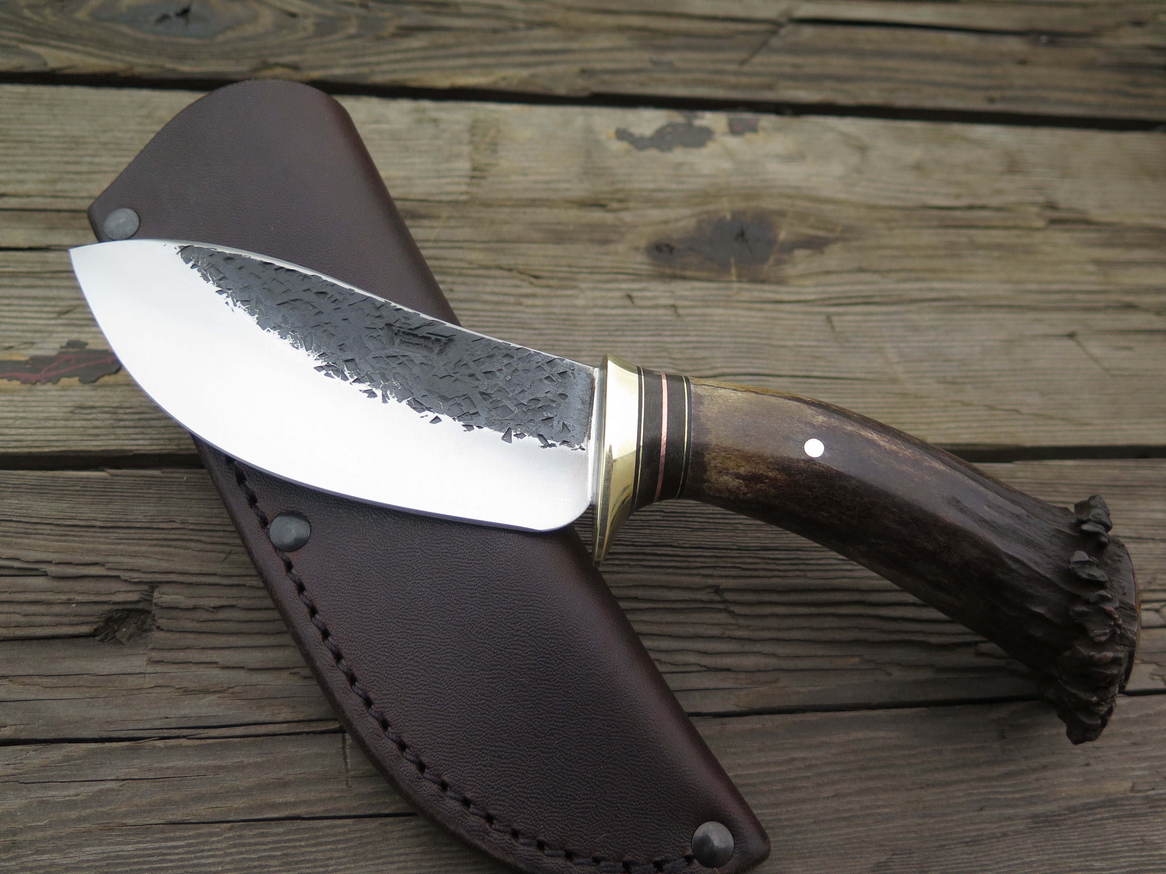 This beautiful Behring Made© Nessmuk is hand forged from 3/16" thick high carbon 01 tool steel and it measures 4 1/2" from tip to guard with a razor sharp hollow grind and our hammermark finish. The brass guard is soldered in place above black, green, copper and brass spacers as well as a premium crown stag handle that's pinned through the tang with brass. The overall length measures just over 9" and it comes snug in a belt pouch sheath.