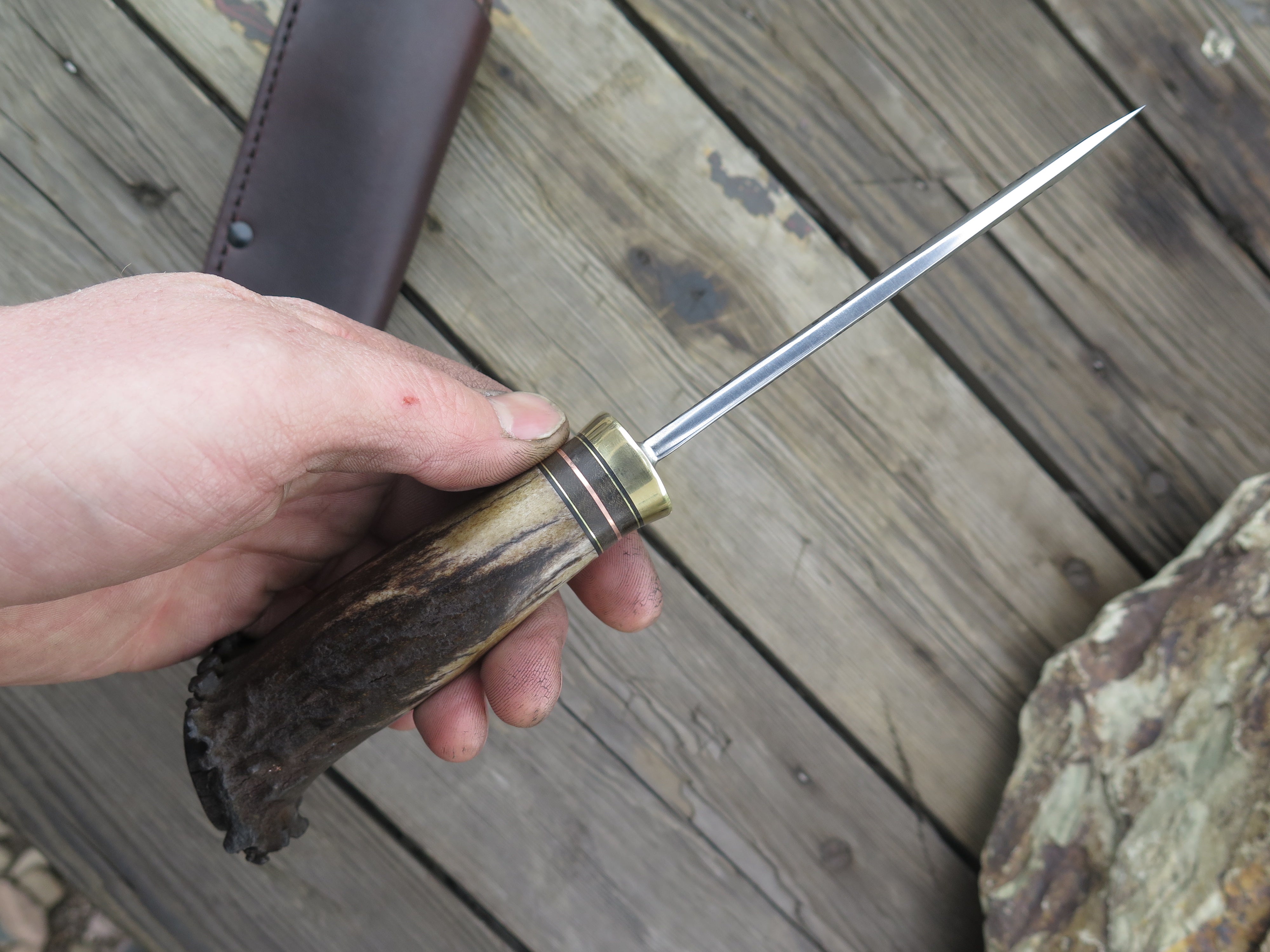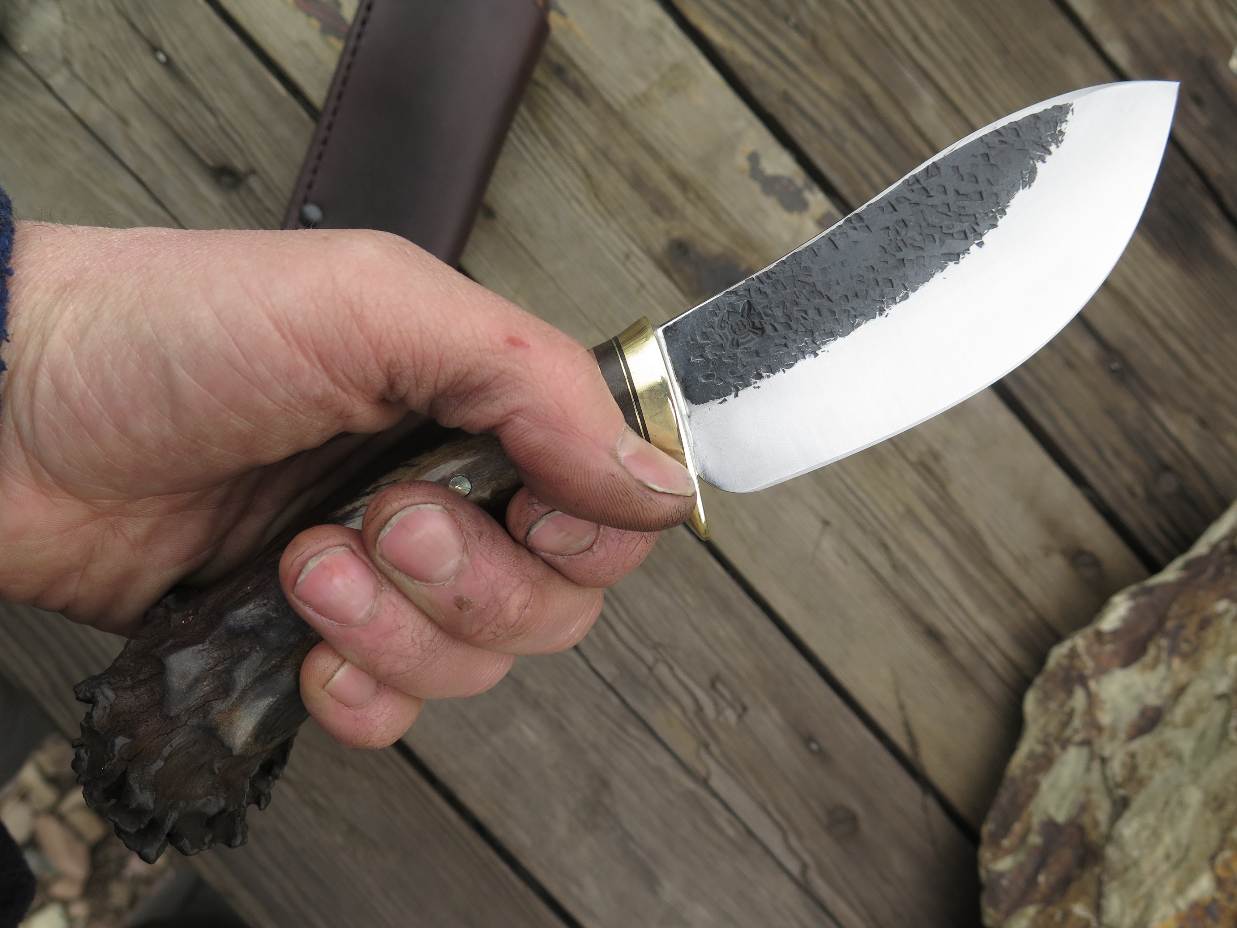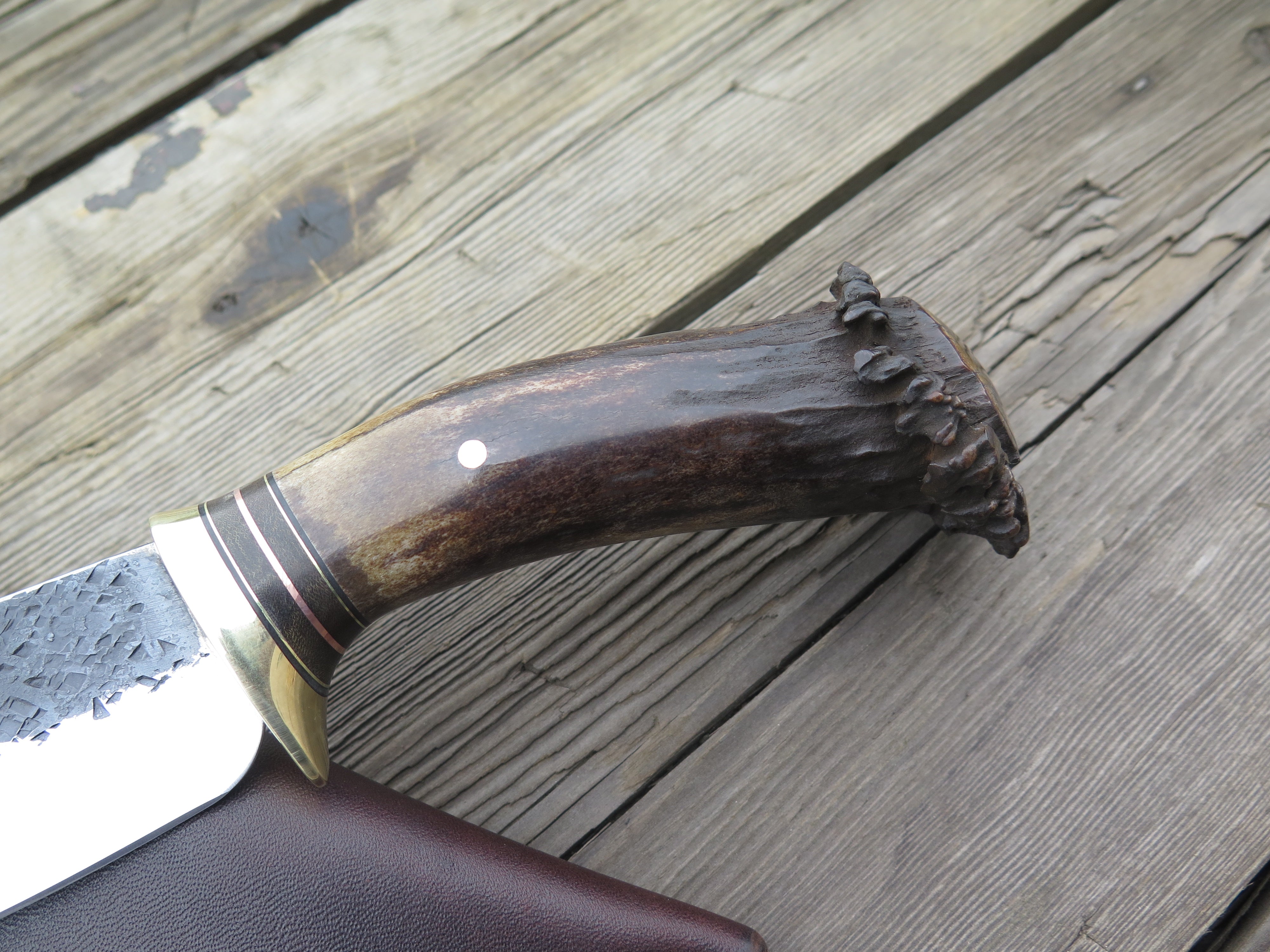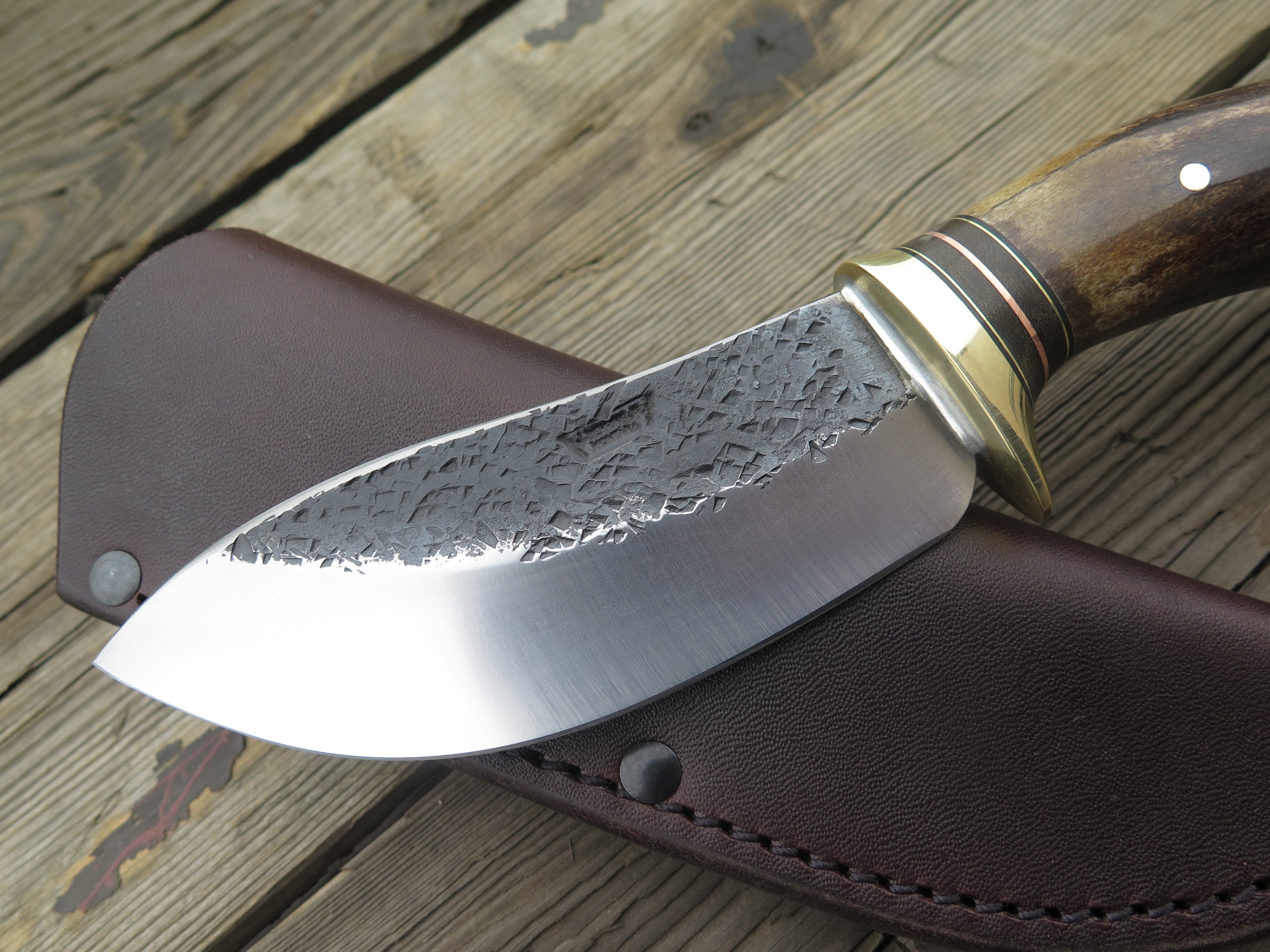 This beautiful Behring Made© Nessmuk is hand forged from 3/16" thick high carbon 01 tool steel and it measures 4 1/2" from tip to guard with a razor sharp hollow grind and our hammermark finish. The brass guard is soldered in place above black, green, copper and brass spacers as well as a premium crown stag handle that's pinned through the tang with brass. The overall length measures just over 9" and it comes snug in a belt pouch sheath.