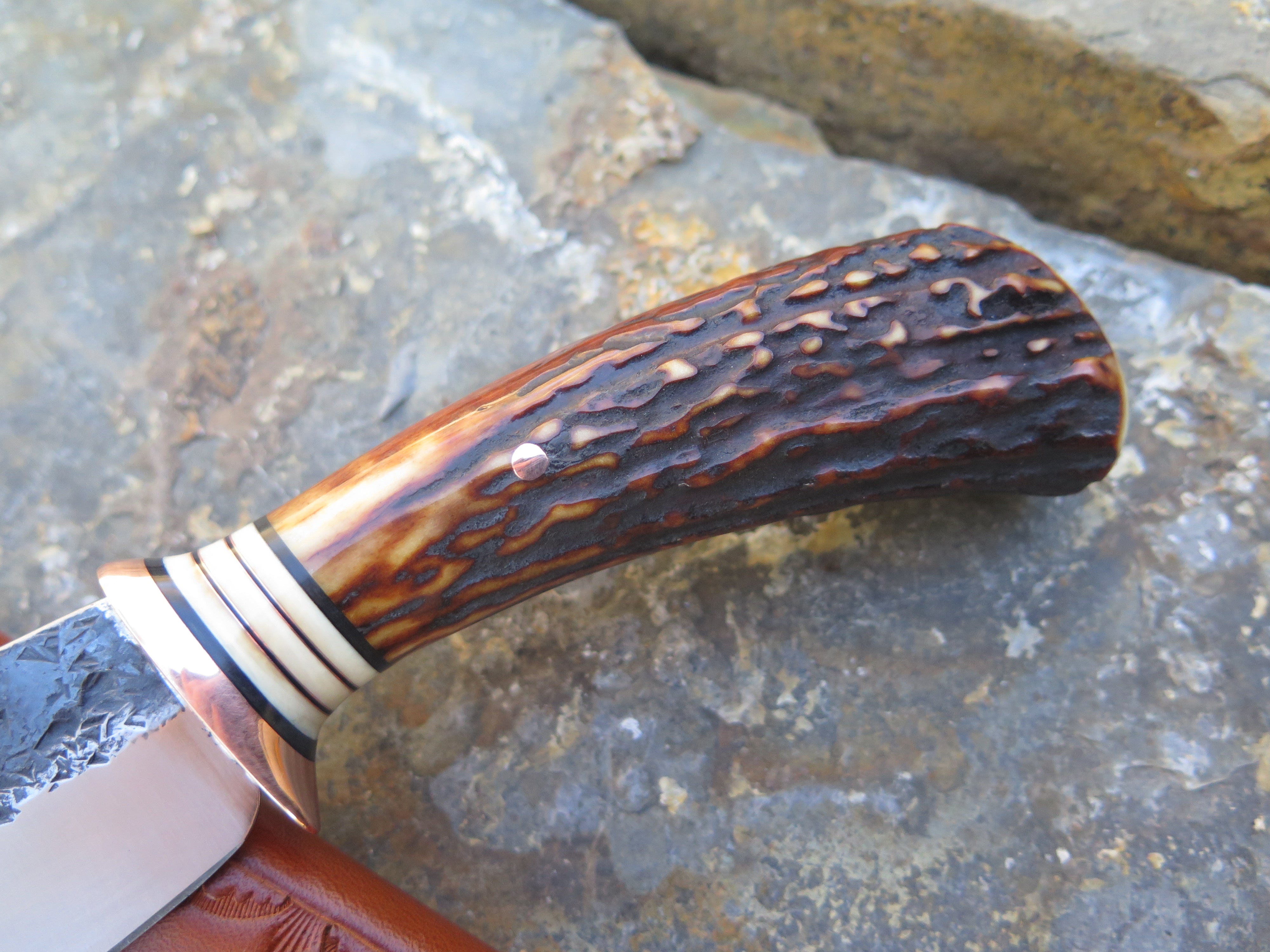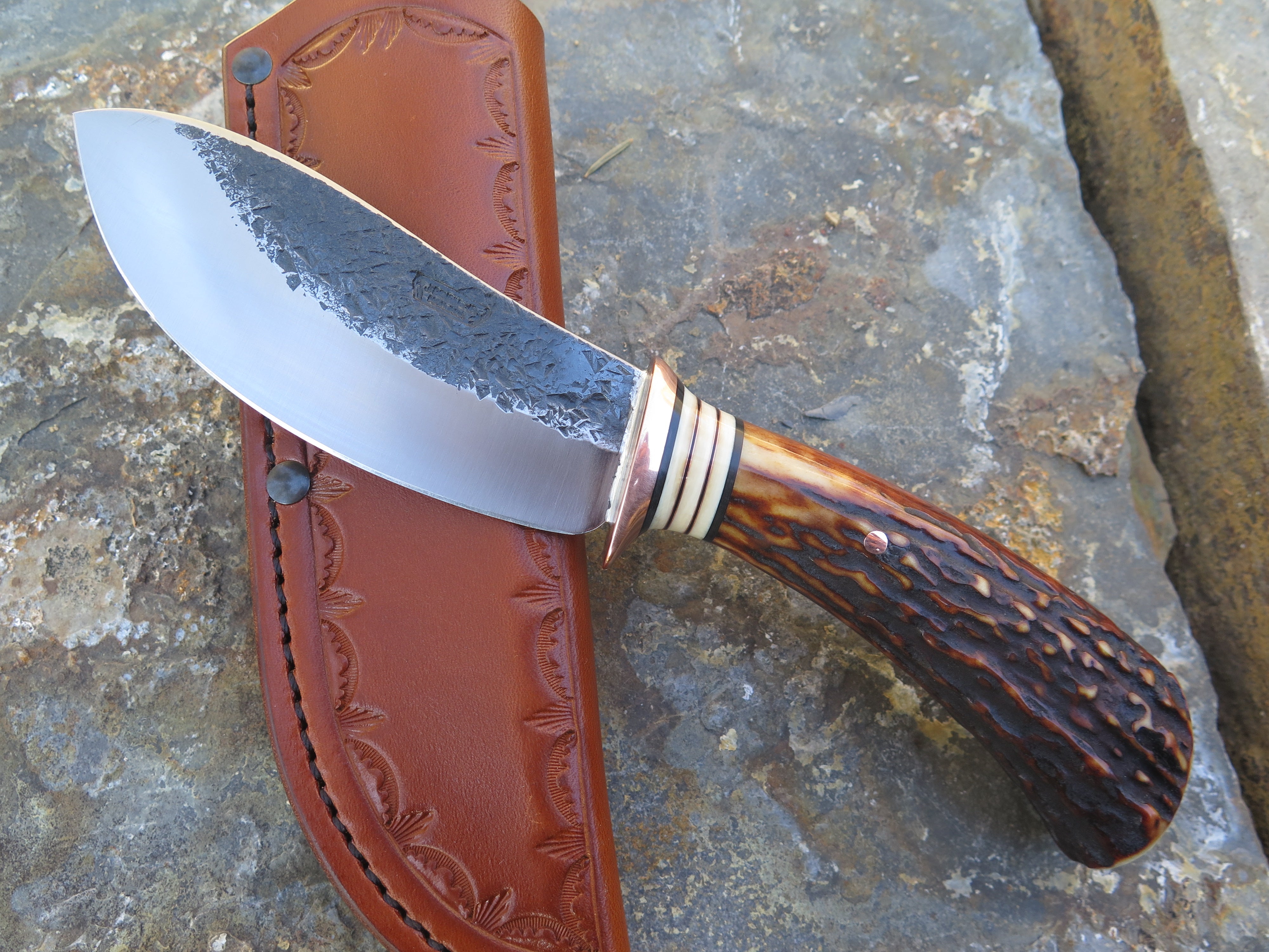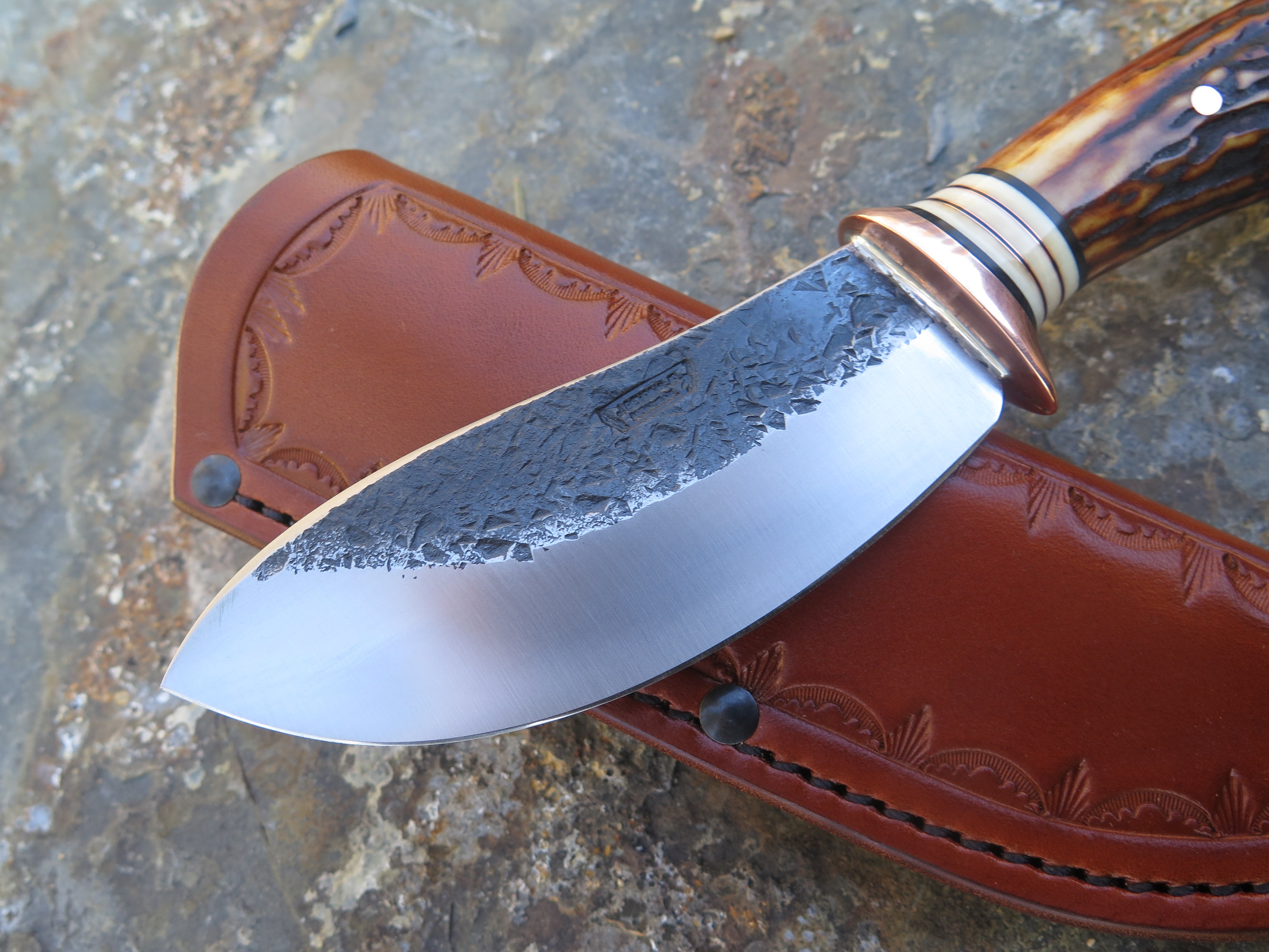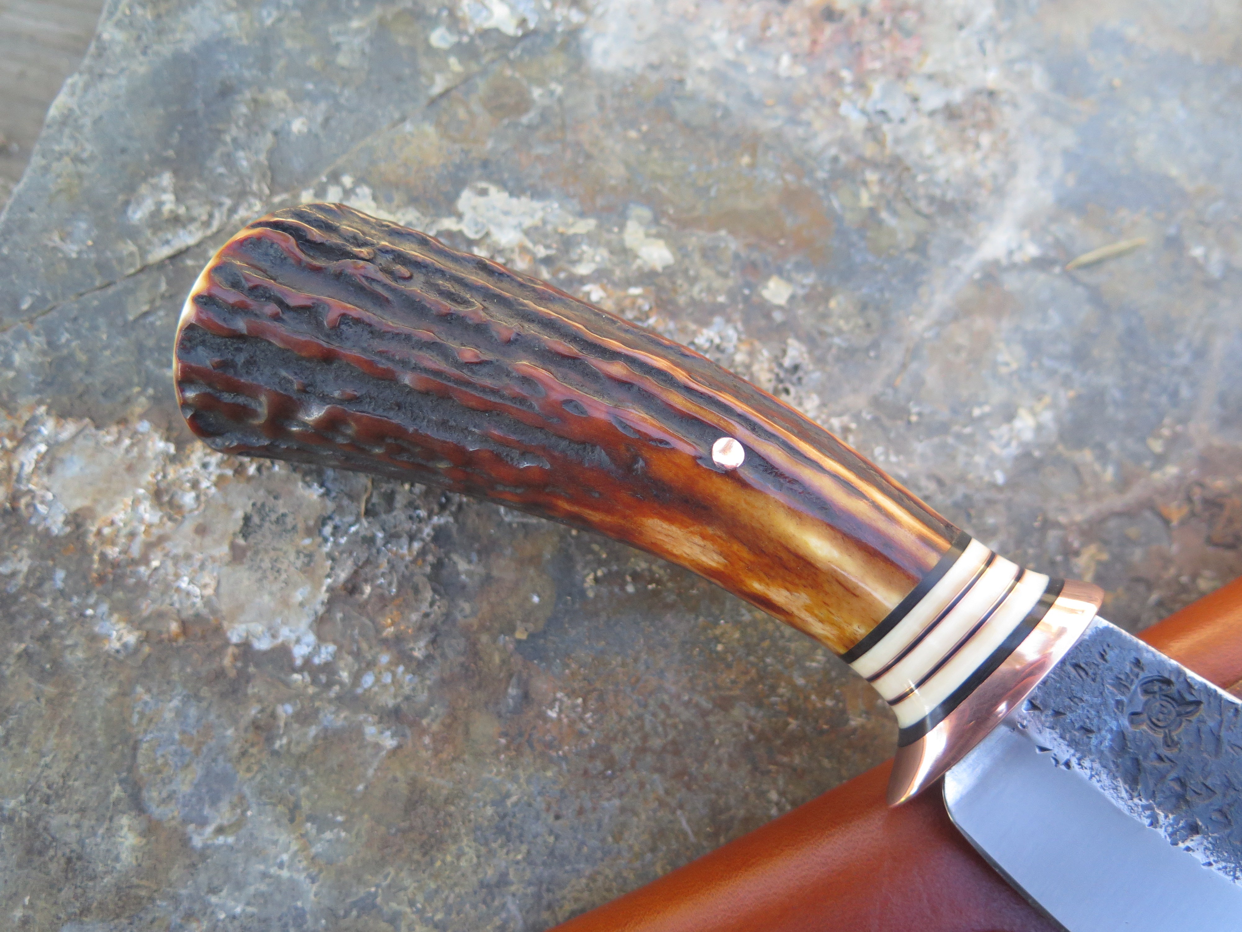 This incredible new Behring Made© Nessmuk is hand forged from 3/16" thick high carbon 01 tool steel and it measures 4 1/2" from tip to guard with a razor sharp hollow grind and our hammermark finish. The copper guard is soldered in place above a clean stack of black fiber, copper and three mammoth ivory spacers as well as a truly top notch sambar stag handle that's pinned through the tang with copper. The overall length measures just shy of 9" and it comes in a border tooled belt pouch sheath.