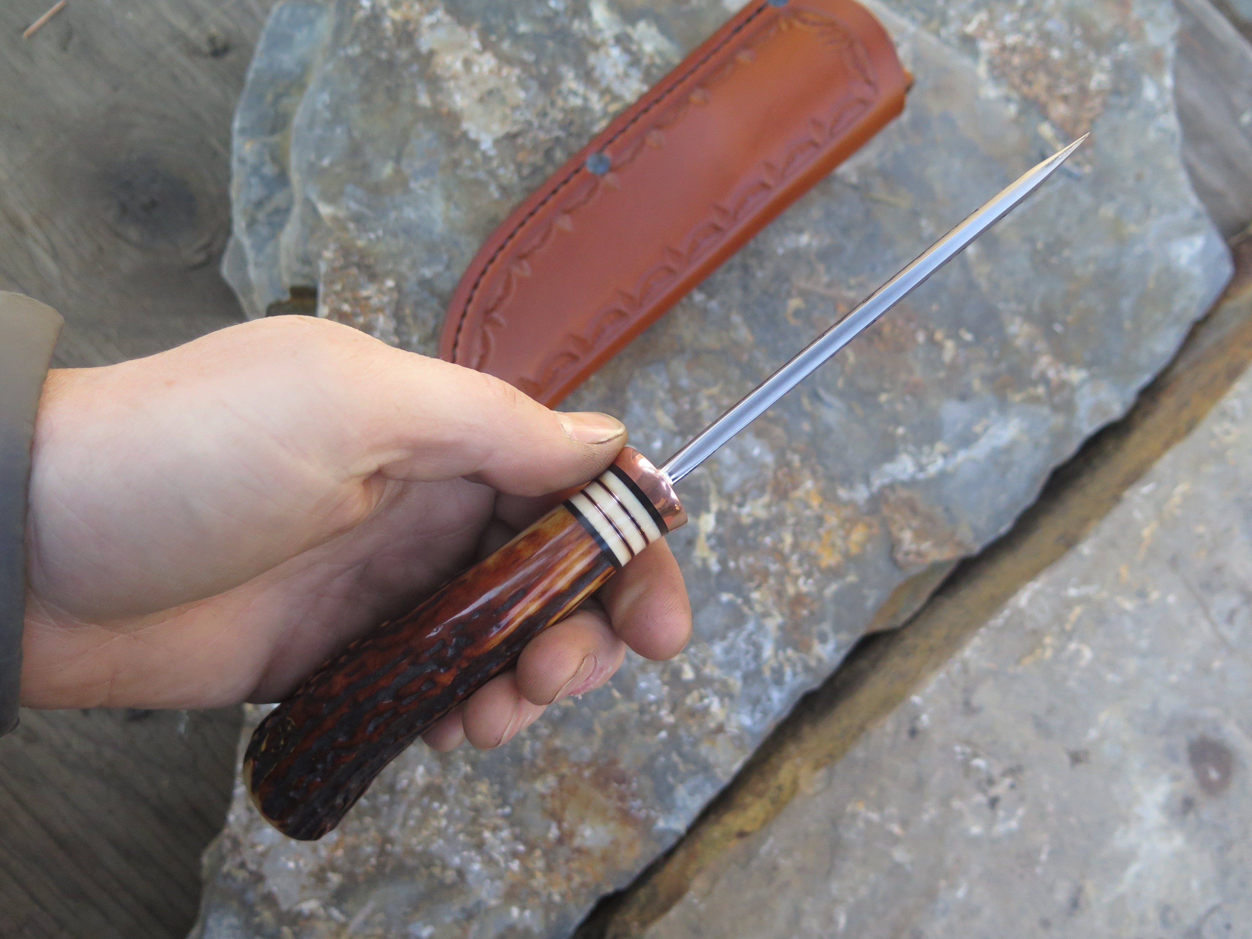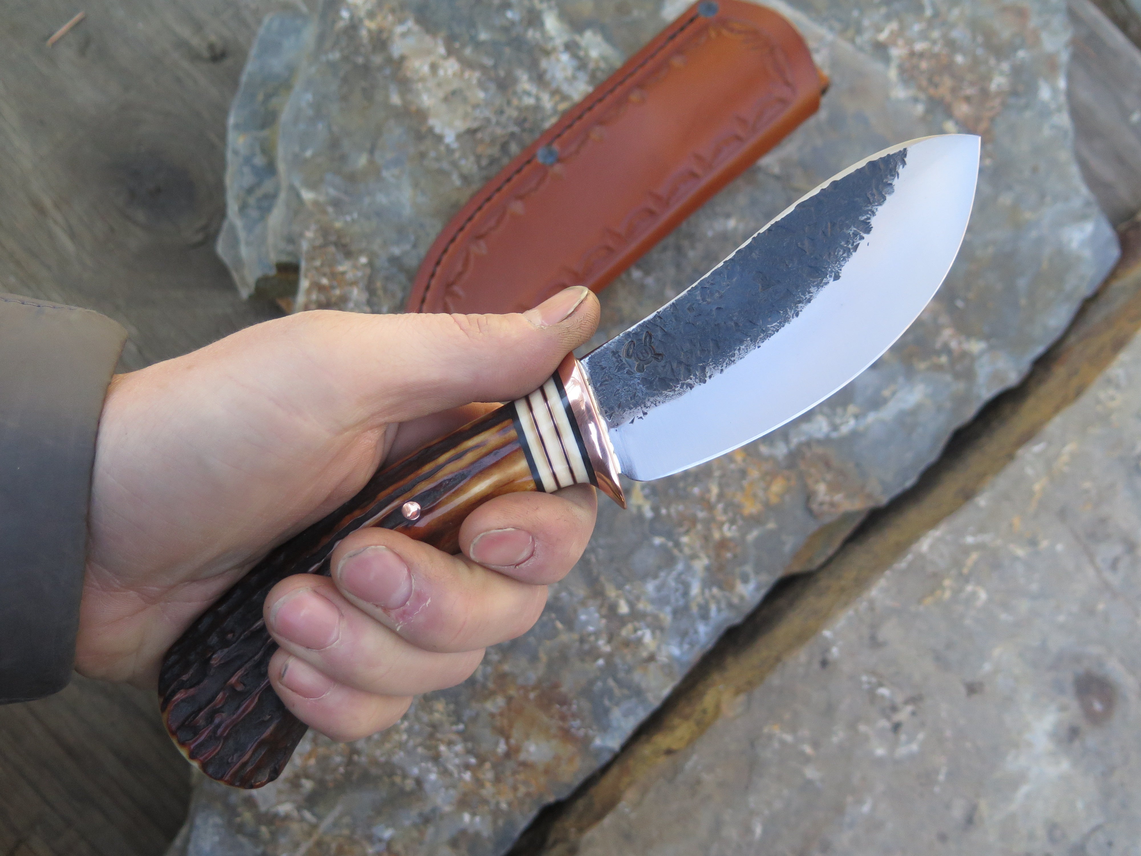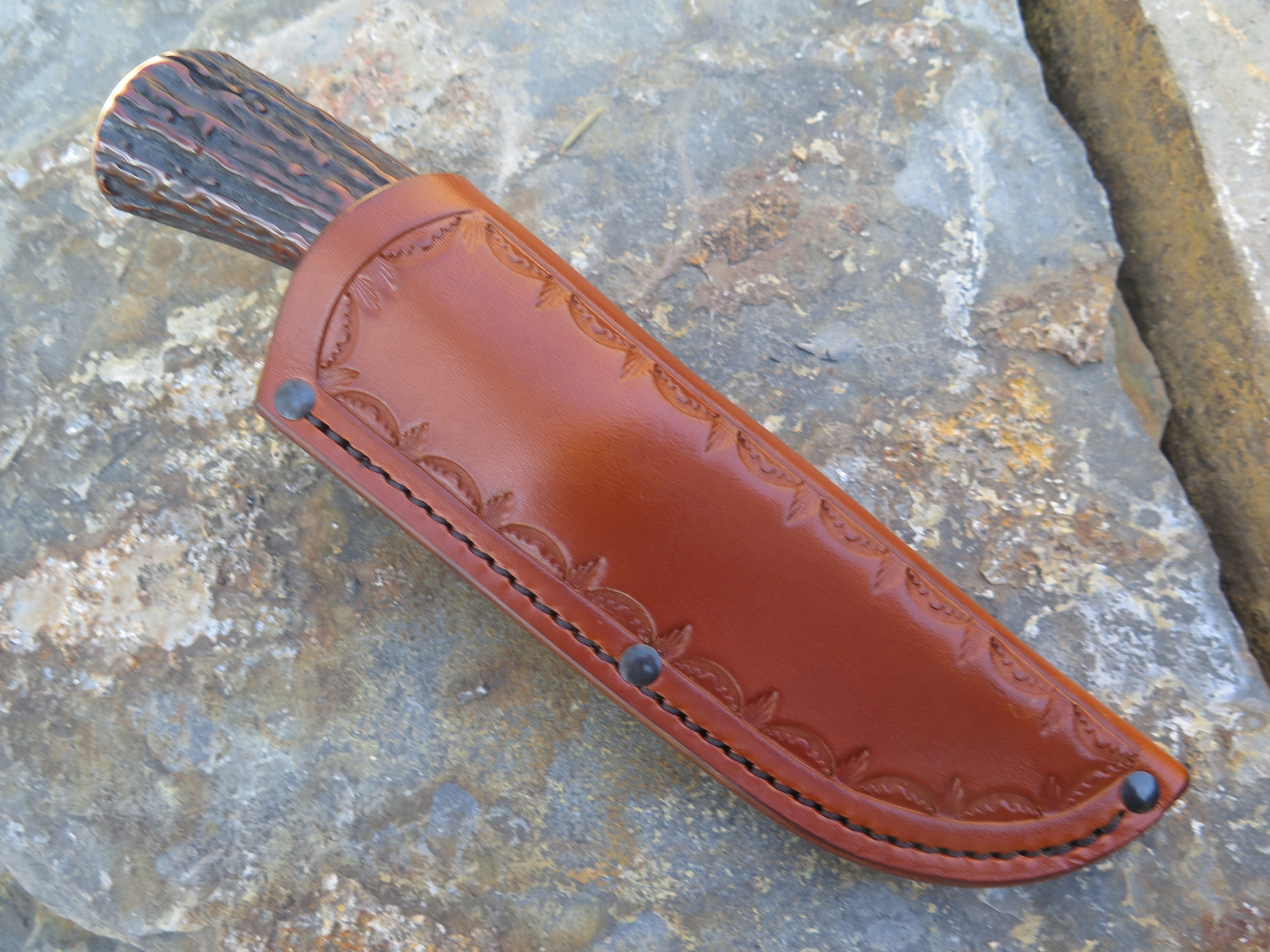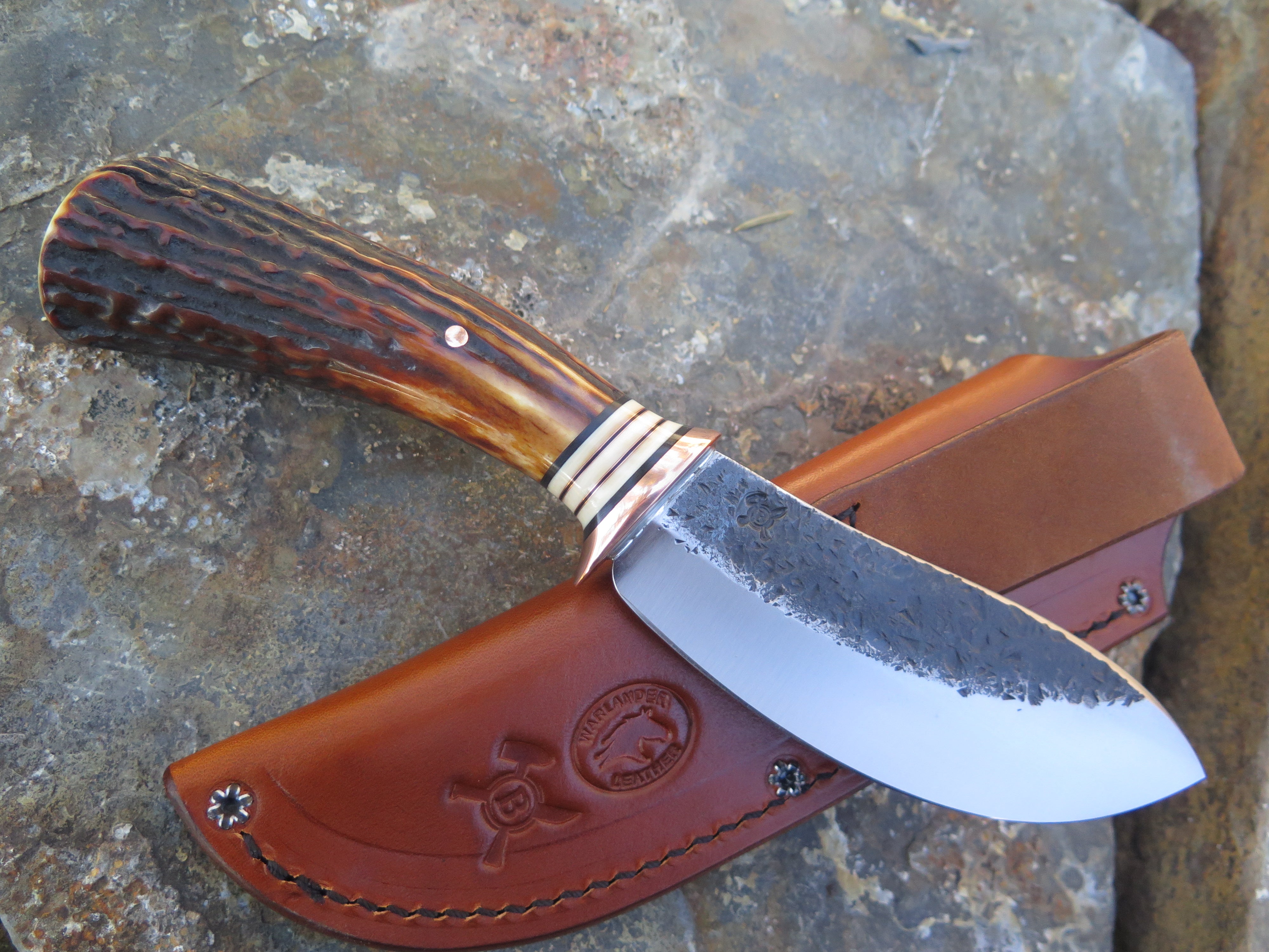 This incredible new Behring Made© Nessmuk is hand forged from 3/16" thick high carbon 01 tool steel and it measures 4 1/2" from tip to guard with a razor sharp hollow grind and our hammermark finish. The copper guard is soldered in place above a clean stack of black fiber, copper and three mammoth ivory spacers as well as a truly top notch sambar stag handle that's pinned through the tang with copper. The overall length measures just shy of 9" and it comes in a border tooled belt pouch sheath.