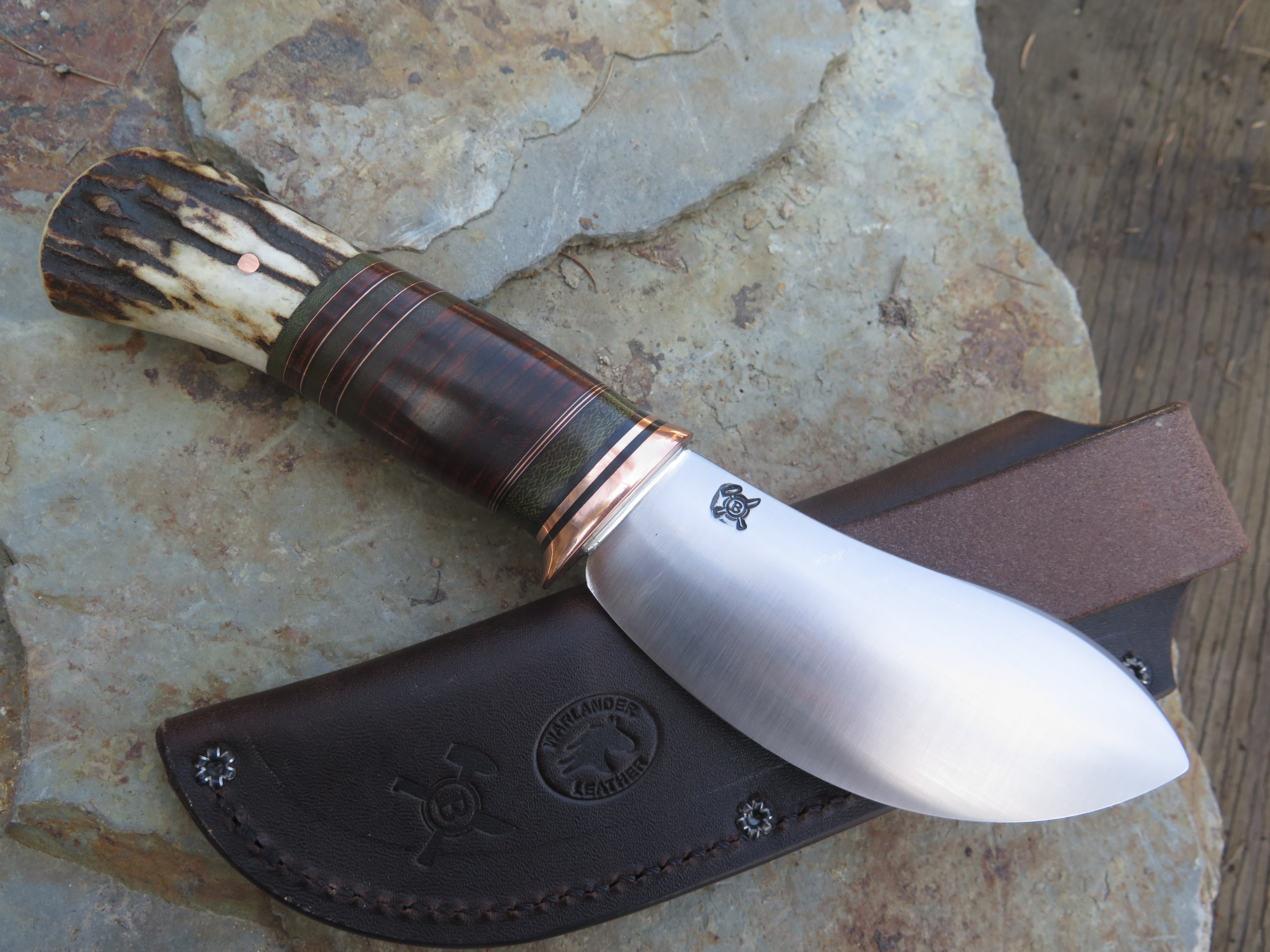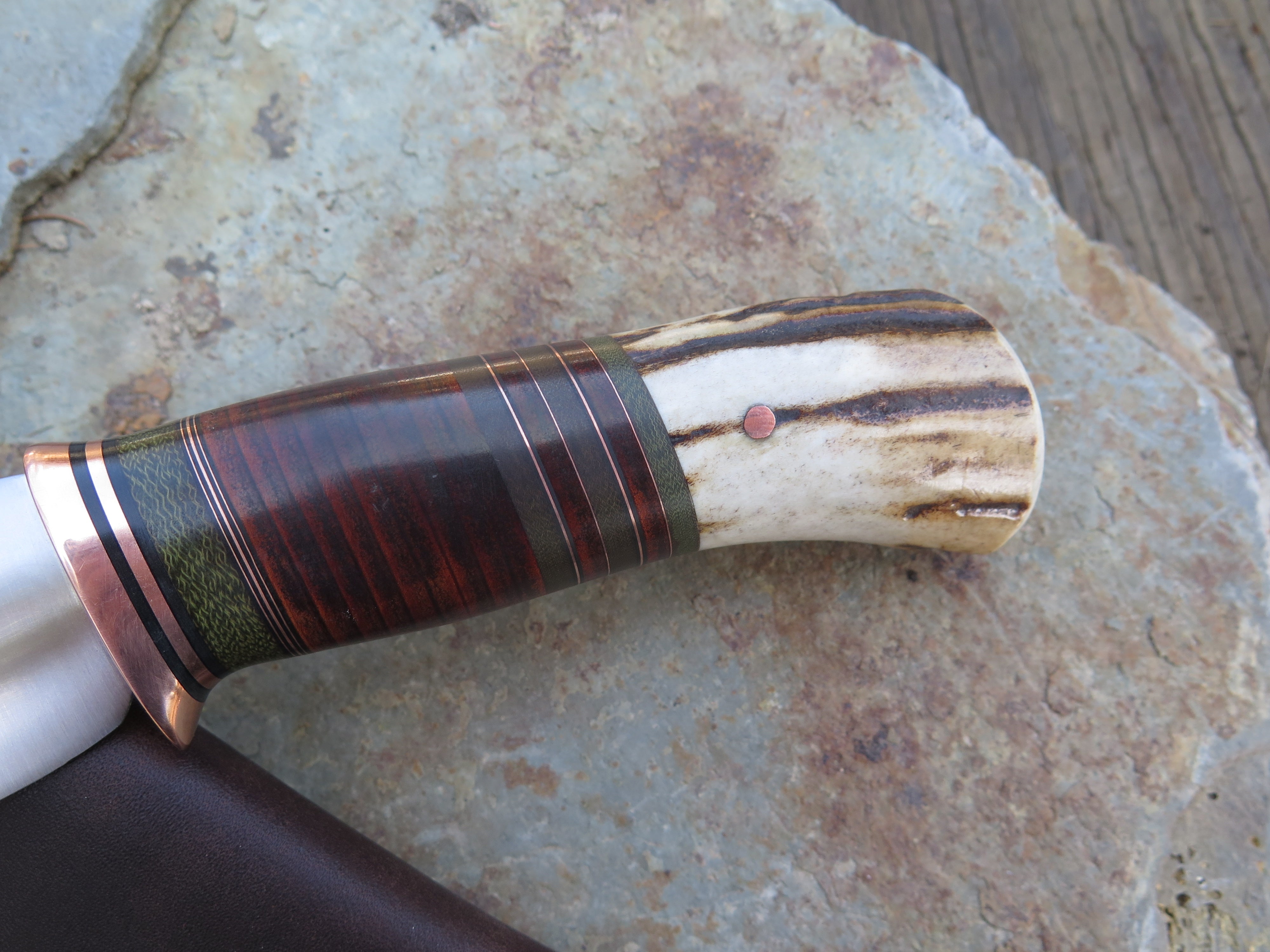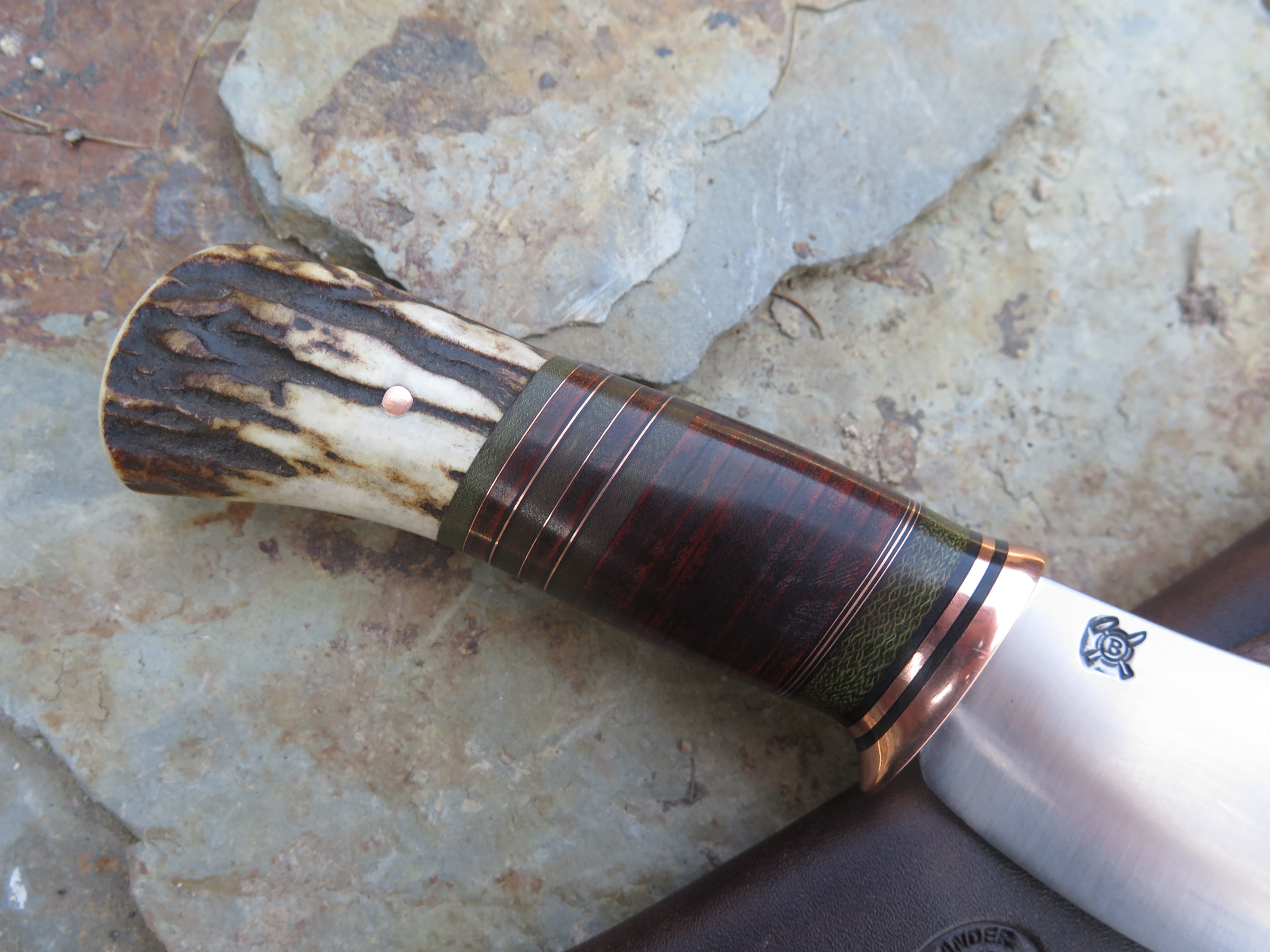 This beautiful Behring Made© Nessmuk is hand forged from 3/16" thick high carbon 01 tool steel and it measures 4 1/2" from tip to guard with a razor sharp convex grind. The copper guard is soldered in place above black fiber, green micarta, horsehide and copper spacers as well as a premium sambar stag butt that's pinned with aluminum. The overall length measures just over 9" and this one comes in a classic leather belt pouch sheath.