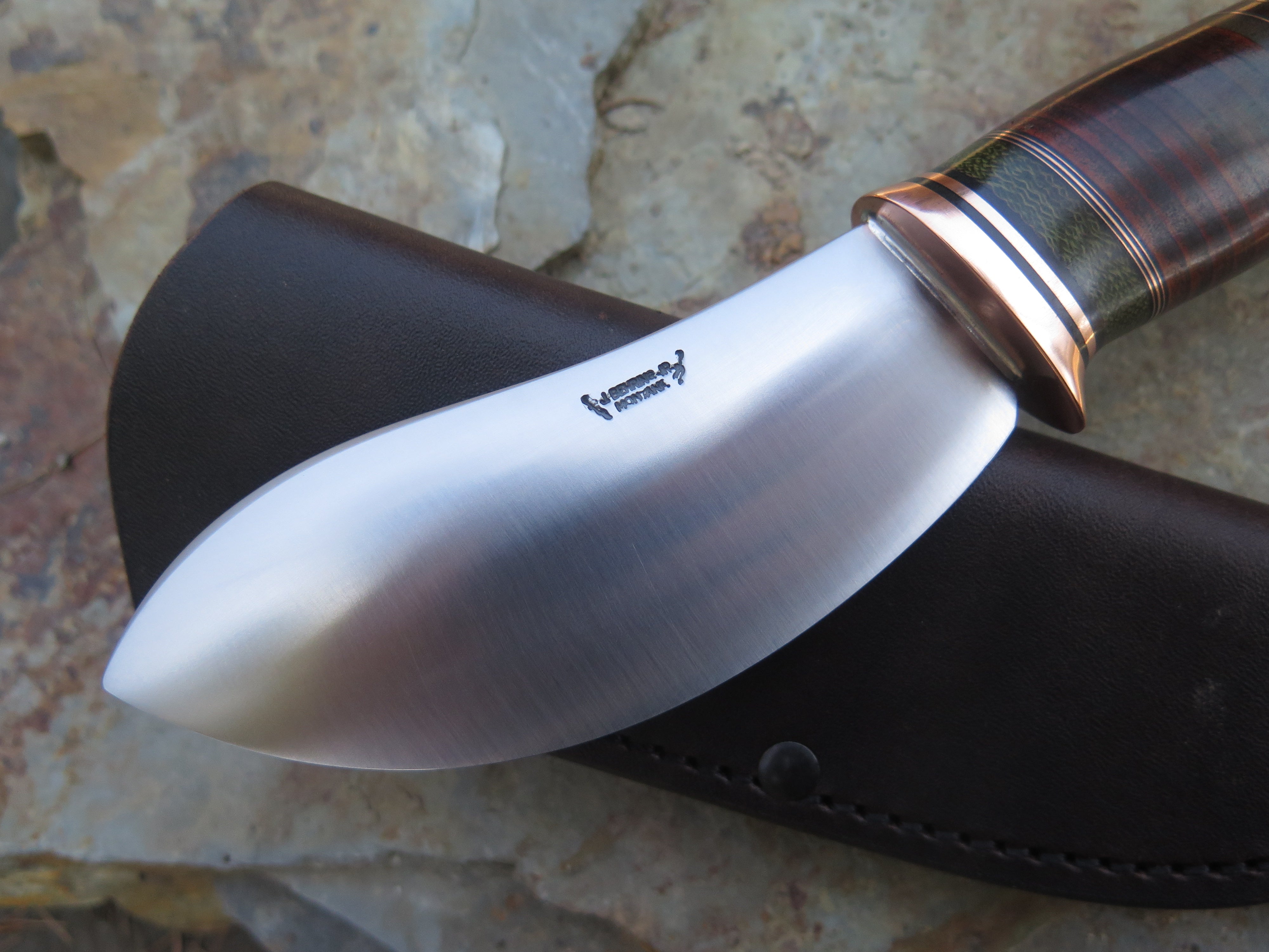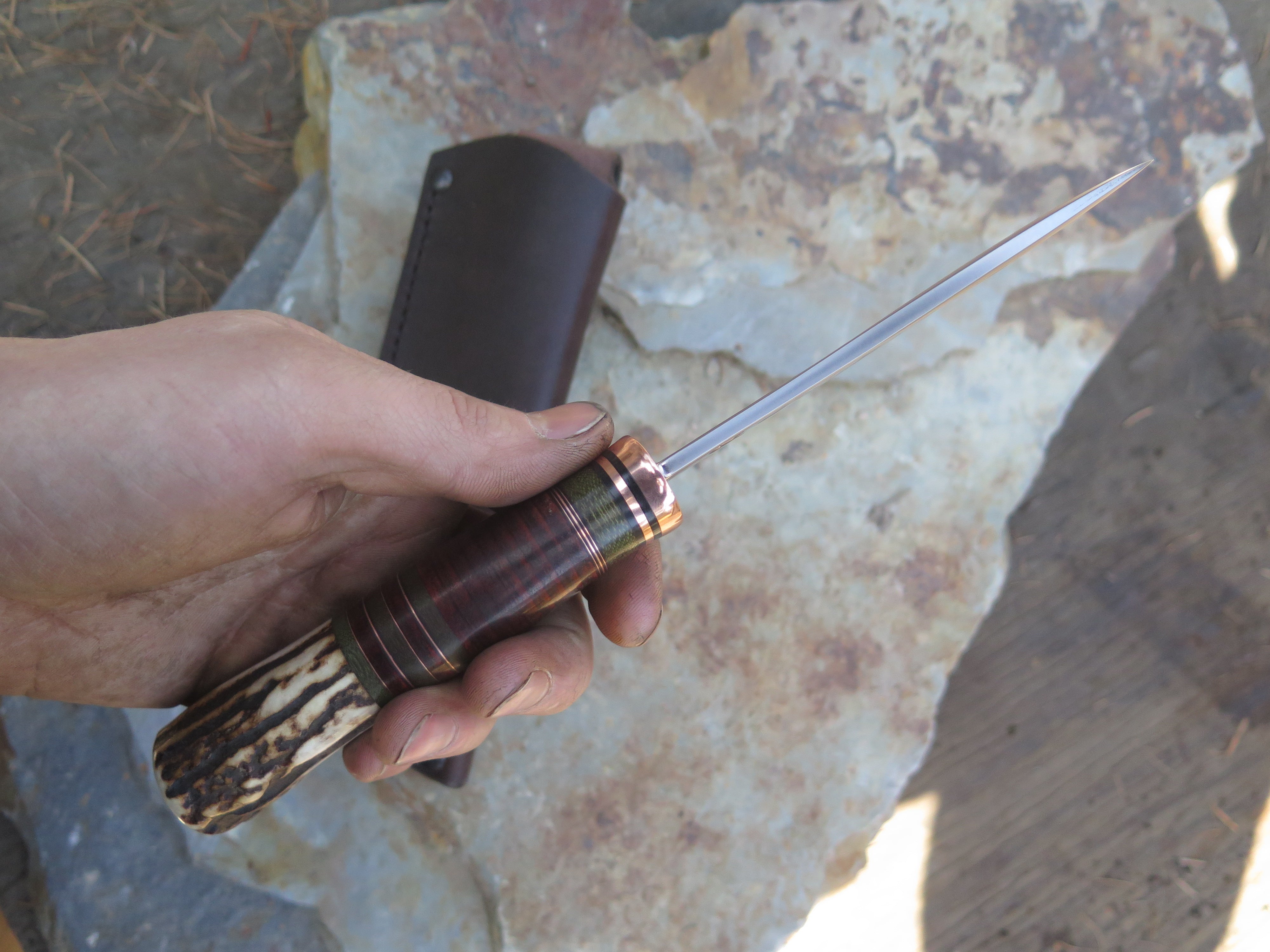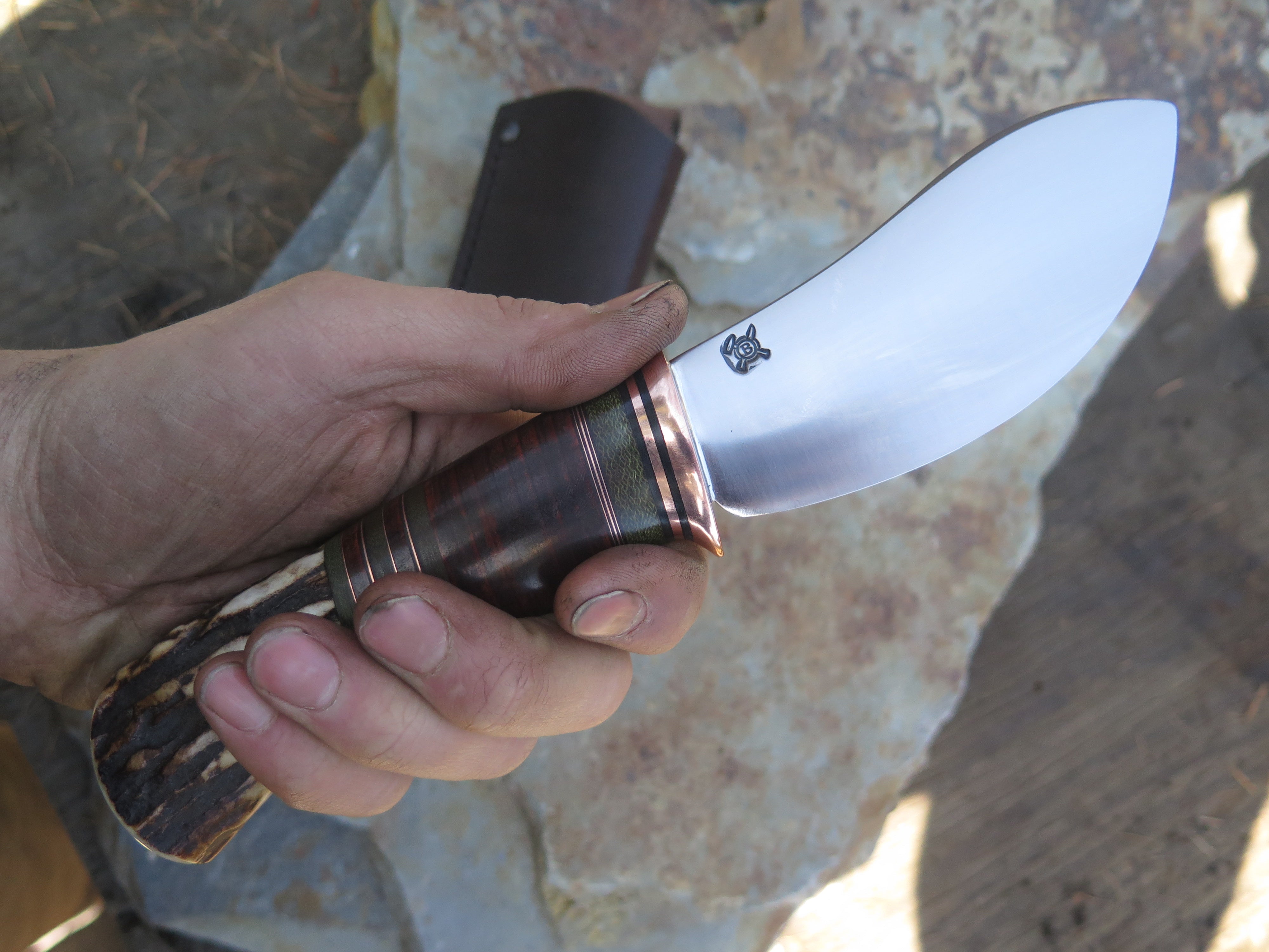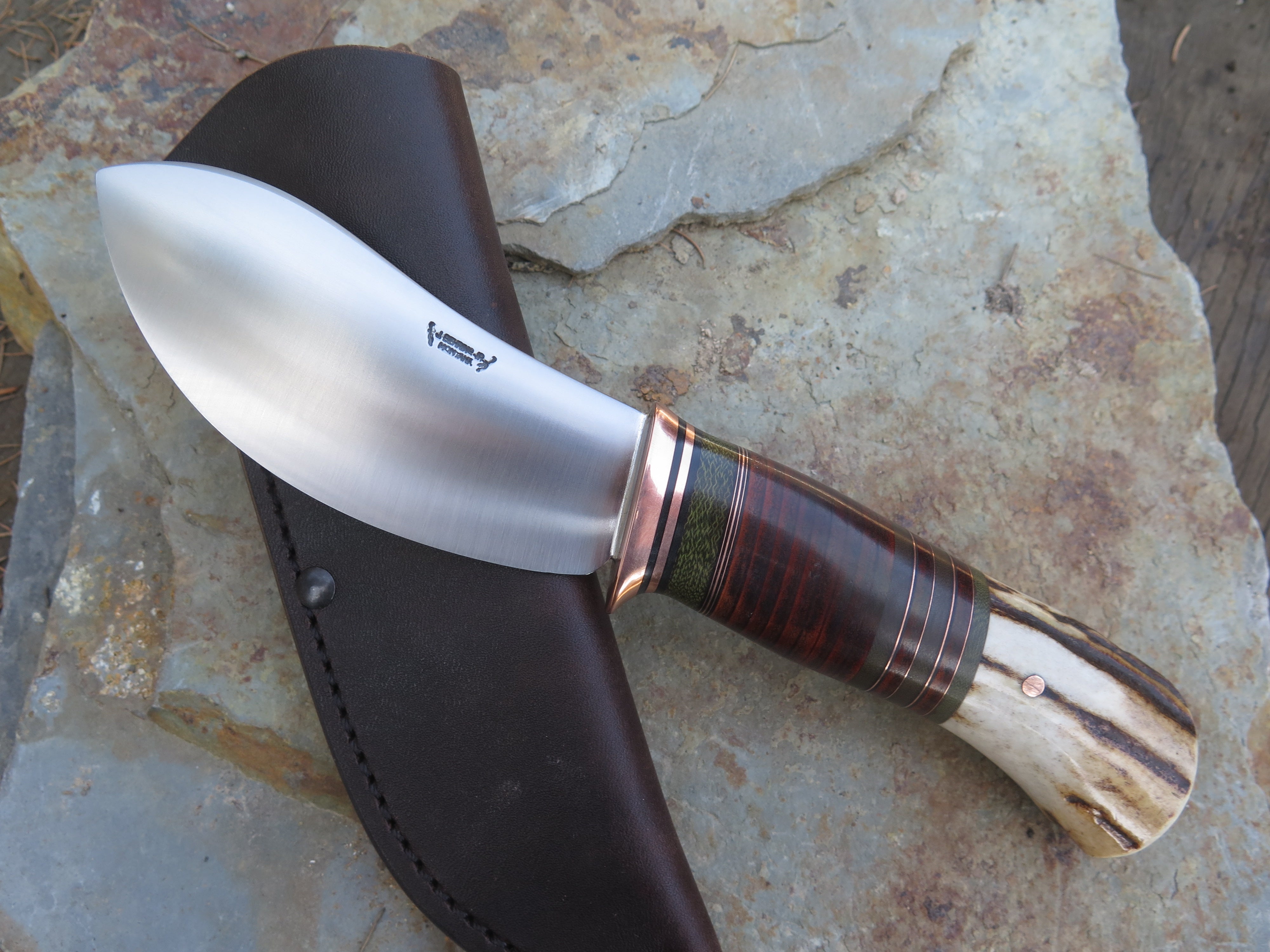 This beautiful Behring Made© Nessmuk is hand forged from 3/16" thick high carbon 01 tool steel and it measures 4 1/2" from tip to guard with a razor sharp convex grind. The copper guard is soldered in place above black fiber, green micarta, horsehide and copper spacers as well as a premium sambar stag butt that's pinned with aluminum. The overall length measures just over 9" and this one comes in a classic leather belt pouch sheath.