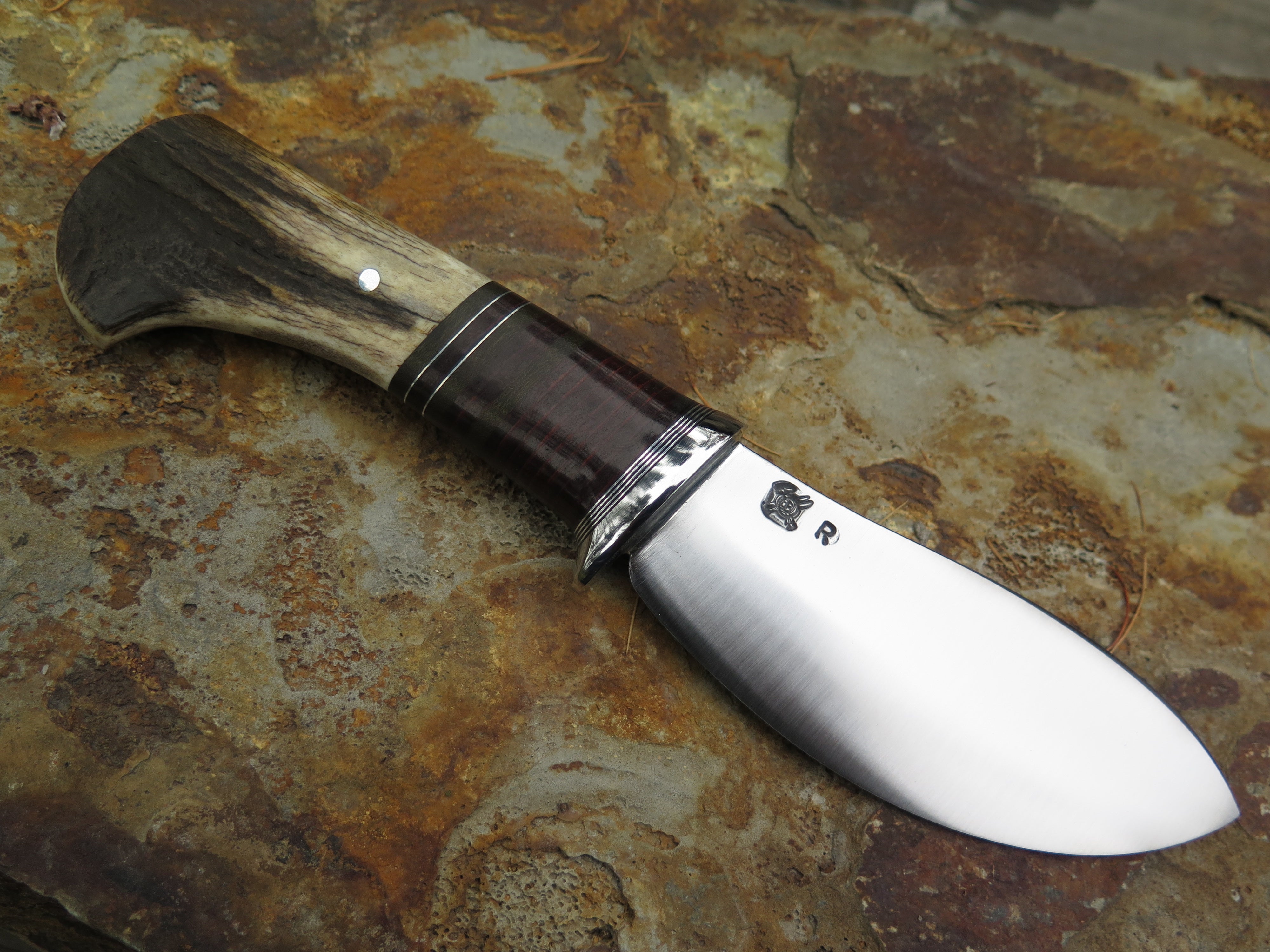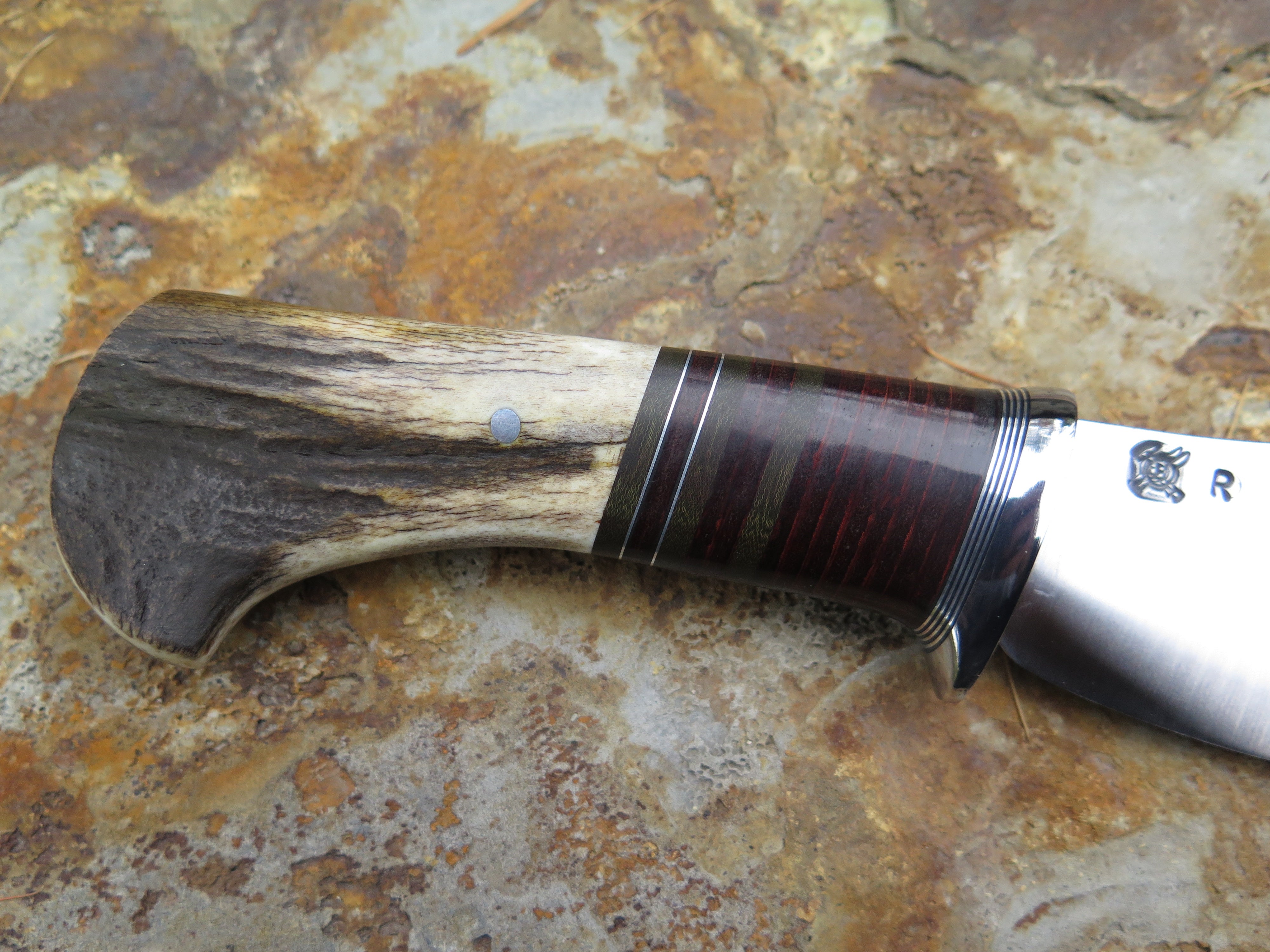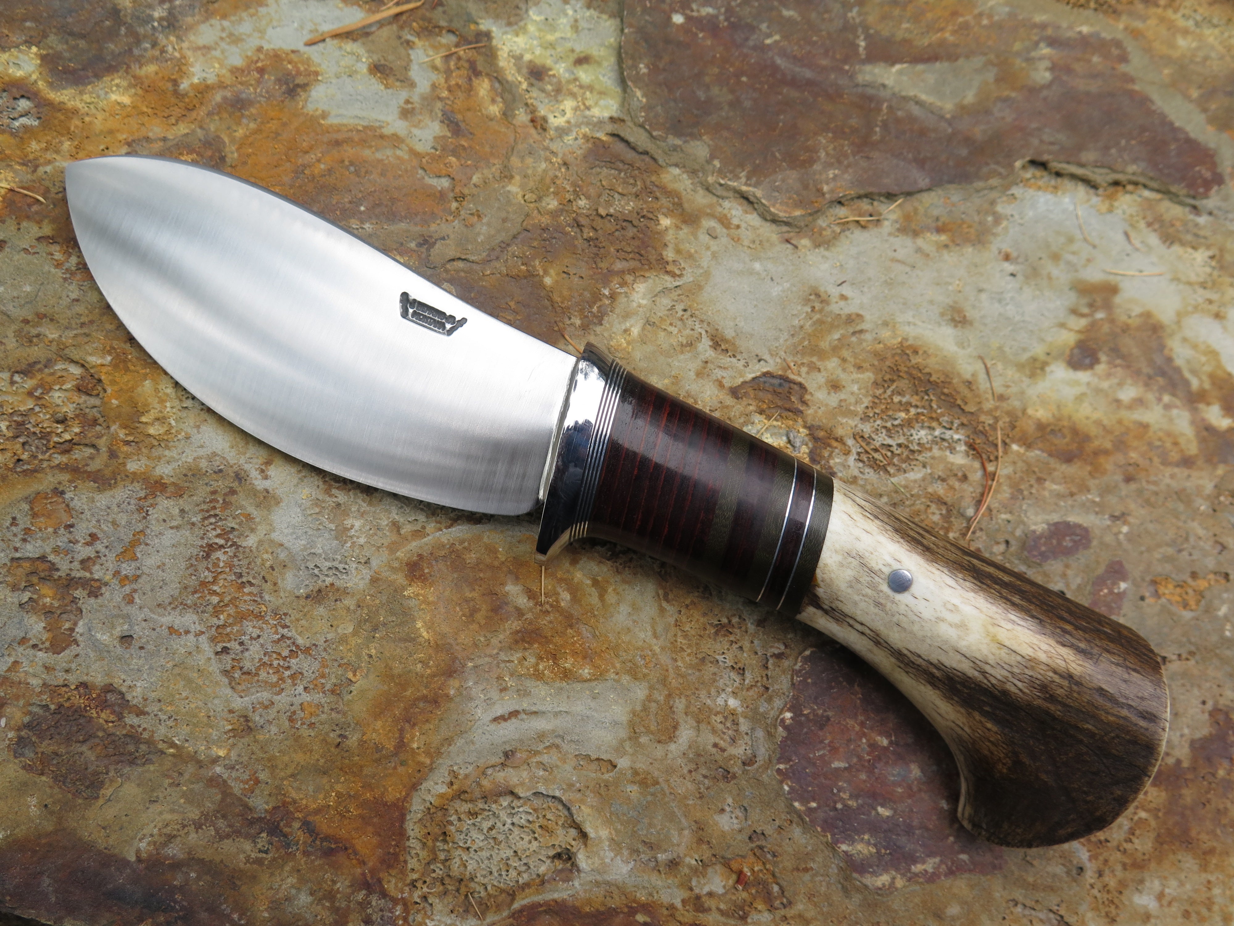 This Nessmuk from Behring Made© is hand forged from 3/16" thick 80CRV2 steel (and stamped with an R to signify) and it measures 4 1/2" from tip to guard with a razor sharp convex grind. The stainless steel guard is soldered in place above black, green, aluminum and horsehide leather spacers as well as a shiras moose butt that is pinned through the tang with aluminum. The overall length measures 9 1/4" and it will come in a classic leather belt pouch sheath.