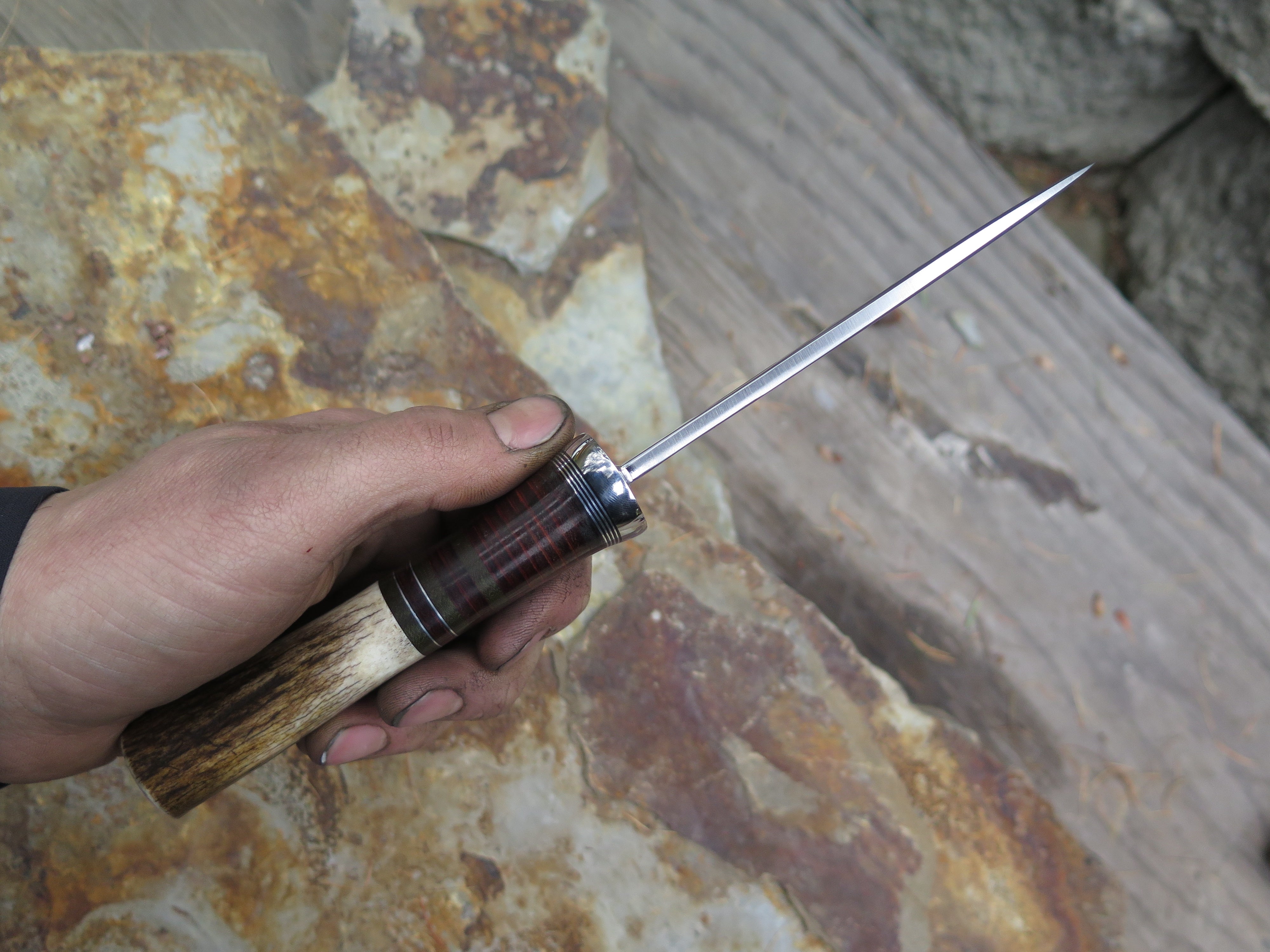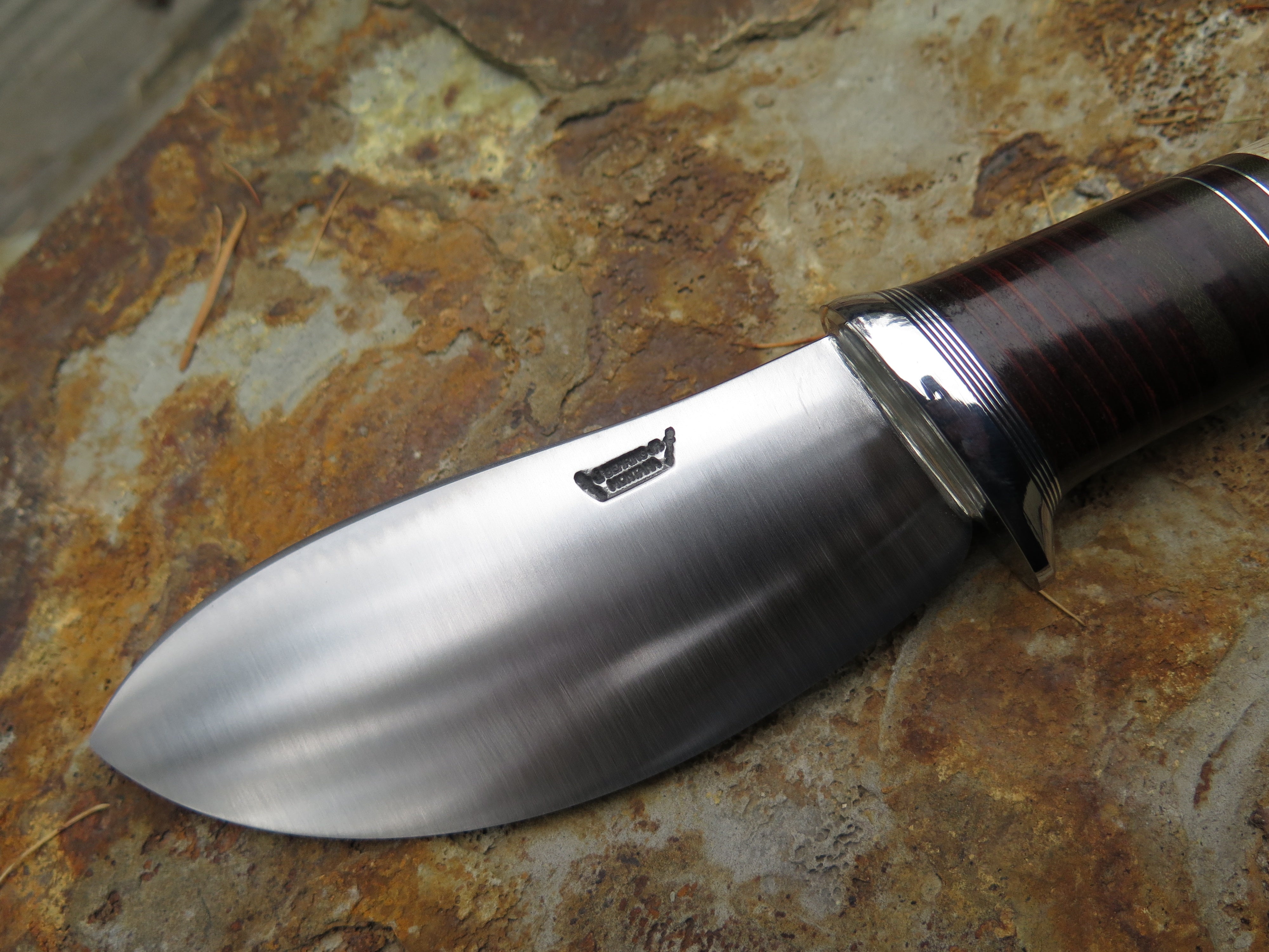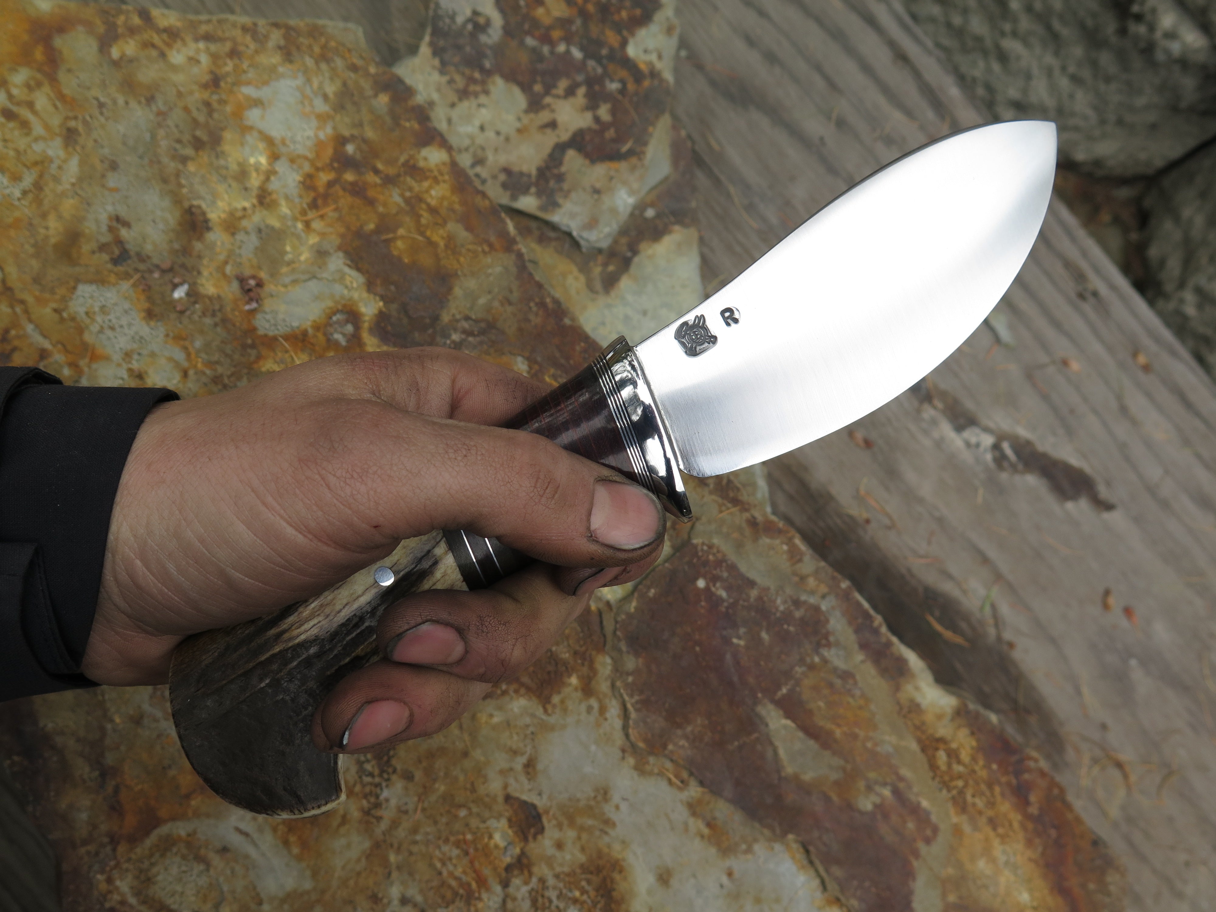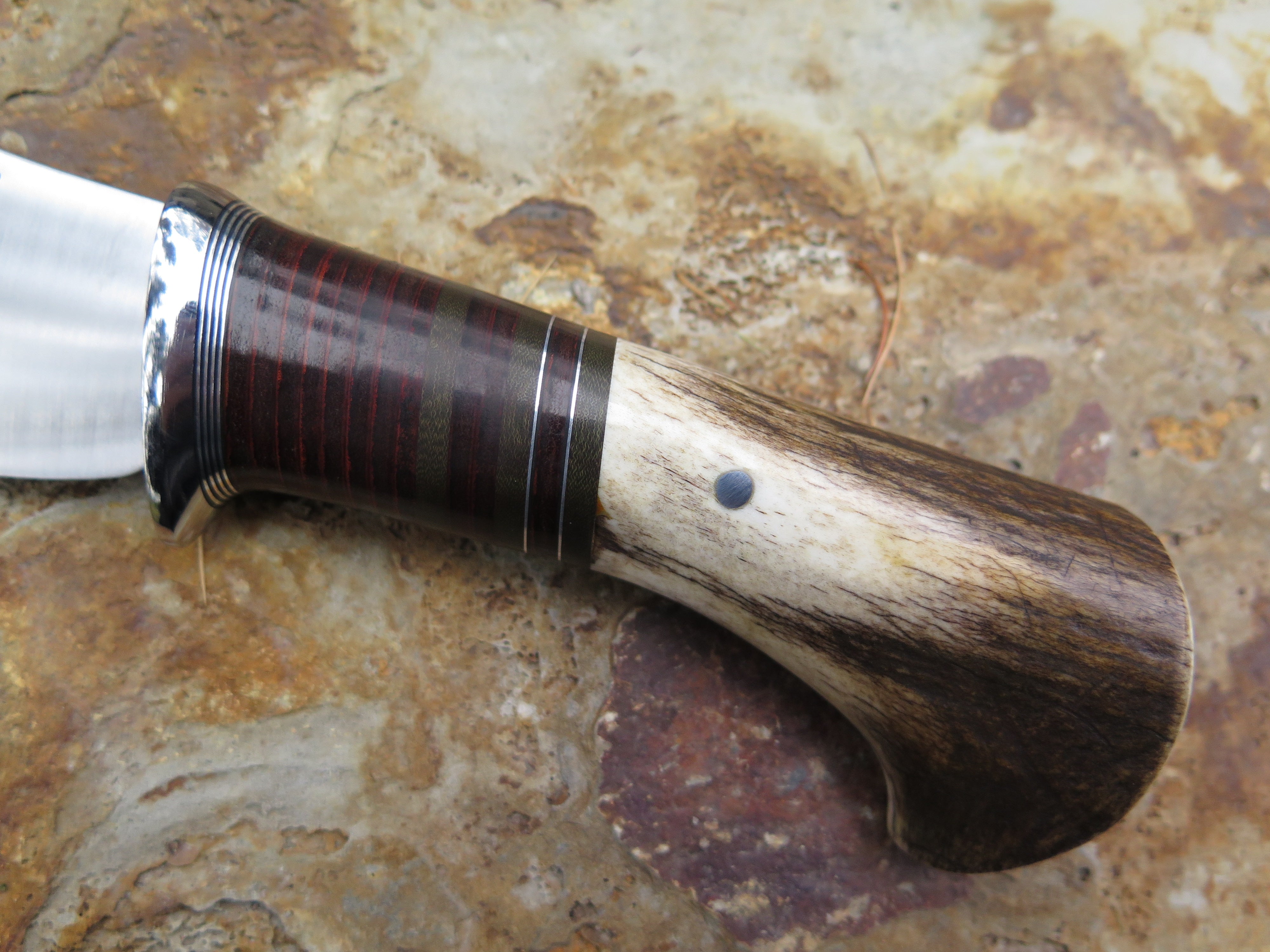 This Nessmuk from Behring Made© is hand forged from 3/16" thick 80CRV2 steel (and stamped with an R to signify) and it measures 4 1/2" from tip to guard with a razor sharp convex grind. The stainless steel guard is soldered in place above black, green, aluminum and horsehide leather spacers as well as a shiras moose butt that is pinned through the tang with aluminum. The overall length measures 9 1/4" and it will come in a classic leather belt pouch sheath.