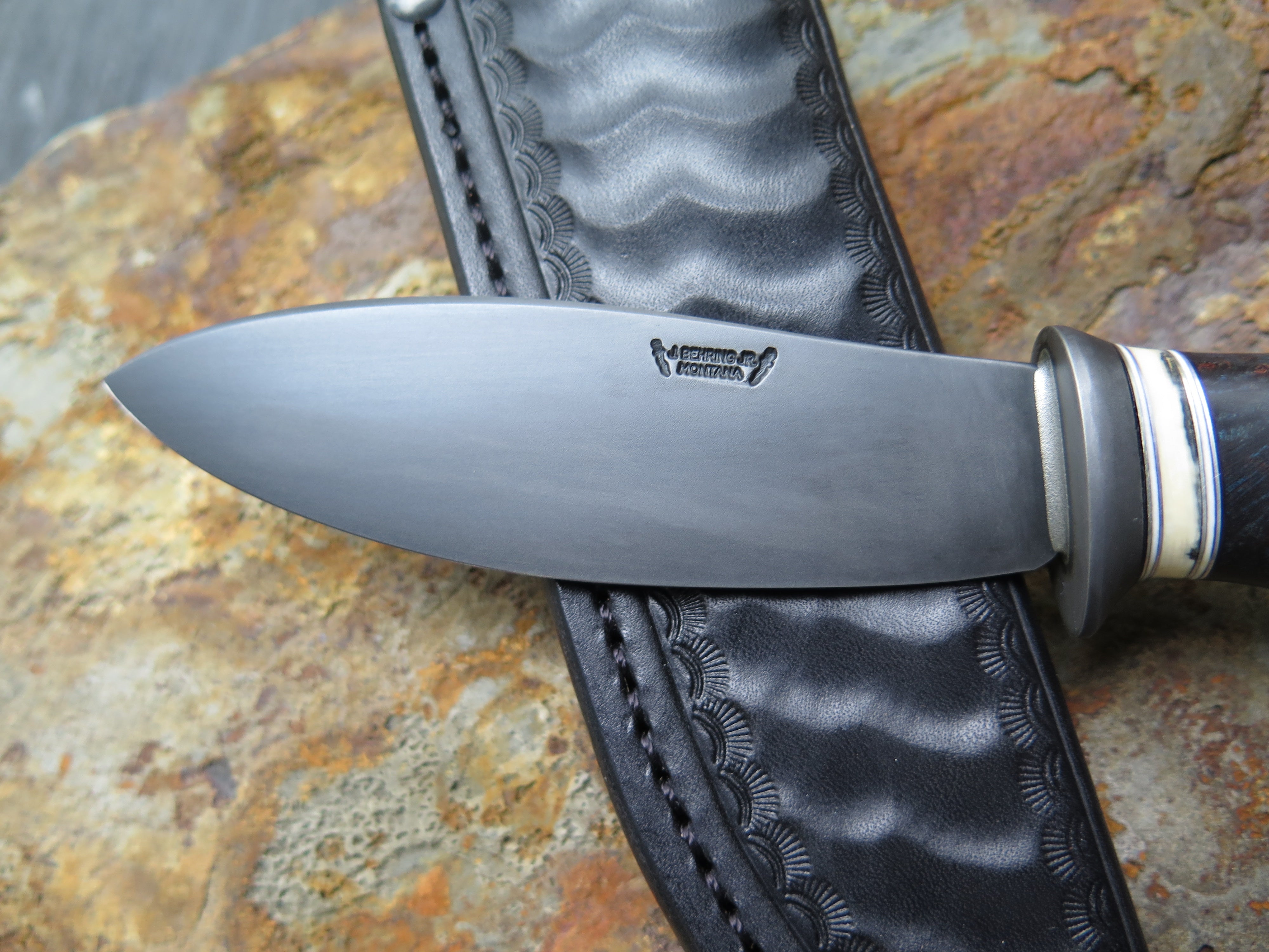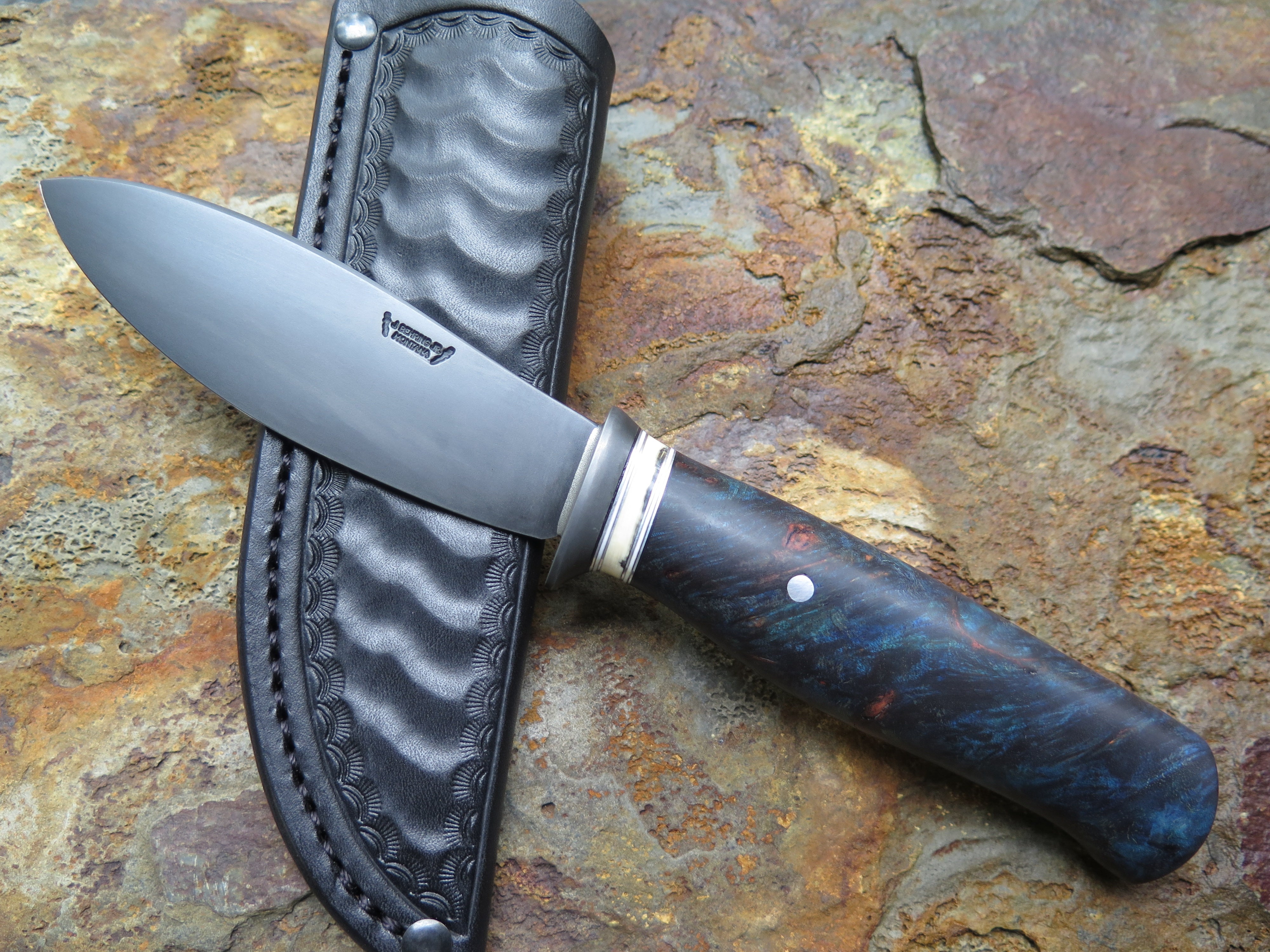 This new Behring Made© Nessmuk is a little closer to the original designs from George Sears, and truly excellent addition to the kit. We hand forged the 1/8" thick high carbon 01 tool steel blade and it measures 4 1/4" from tip to guard with a razor sharp convex grind and our blued finish. The blued guard is soldered in place above black and white fiber, aluminum and mammoth ivory spacers as well as a beautiful stabilized maple wood handle with an aluminum pin through the tang. Overall length measures 8 7/8" and it comes in a ripple tooled pouch sheath.