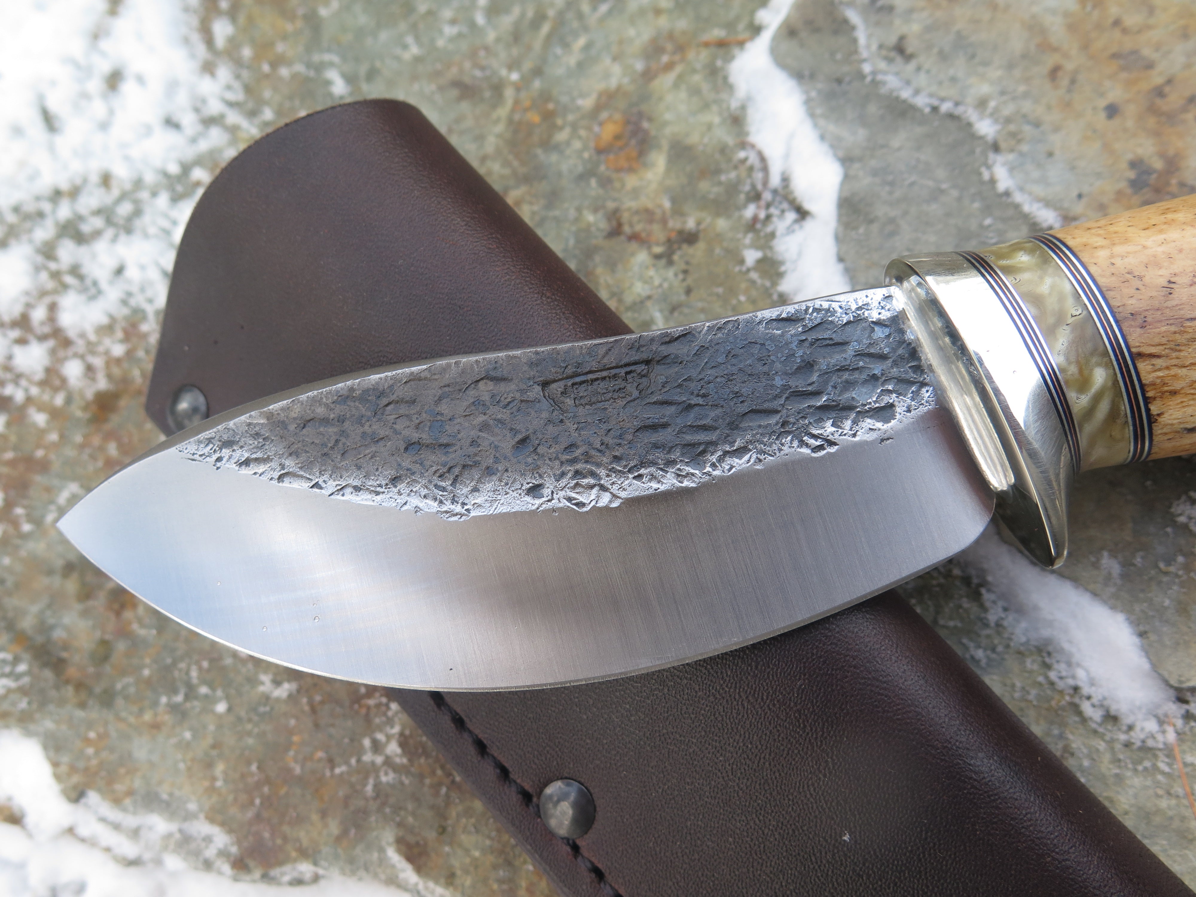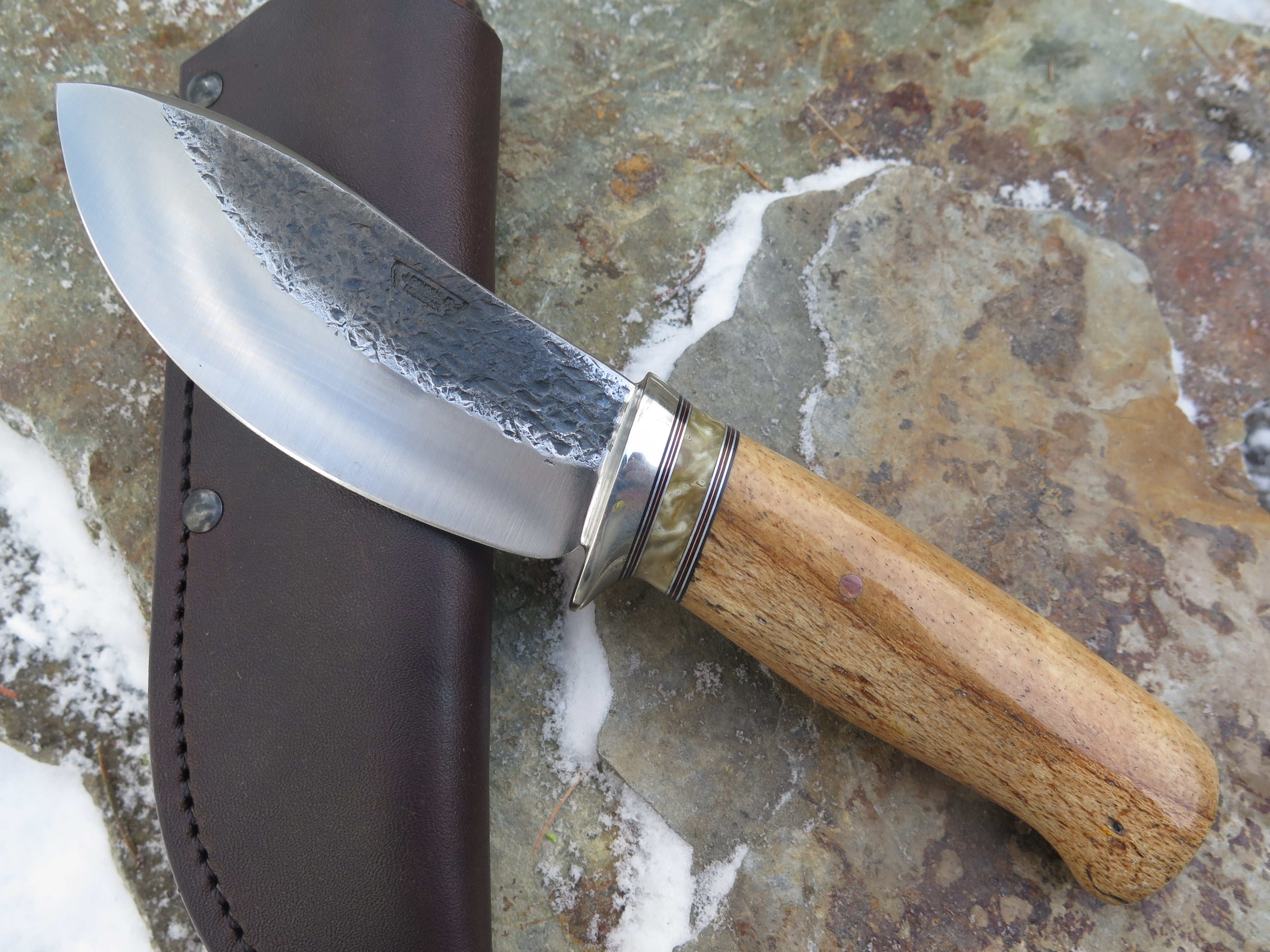 This beautiful Behring Made© Nessmuk is hand forged from 3/16" thick high carbon 01 tool steel and it measures 4 1/2" from tip to guard with a razor sharp hollow grind and our hammermark finish. The nickel silver guard is soldered in place above black fiber, aluminum, copper and musk ox boss spacers which top a premium Stellar's sea cow rib handle that's pinned with copper. The overall length measures 9" and it comes in a classic leather belt pouch sheath.