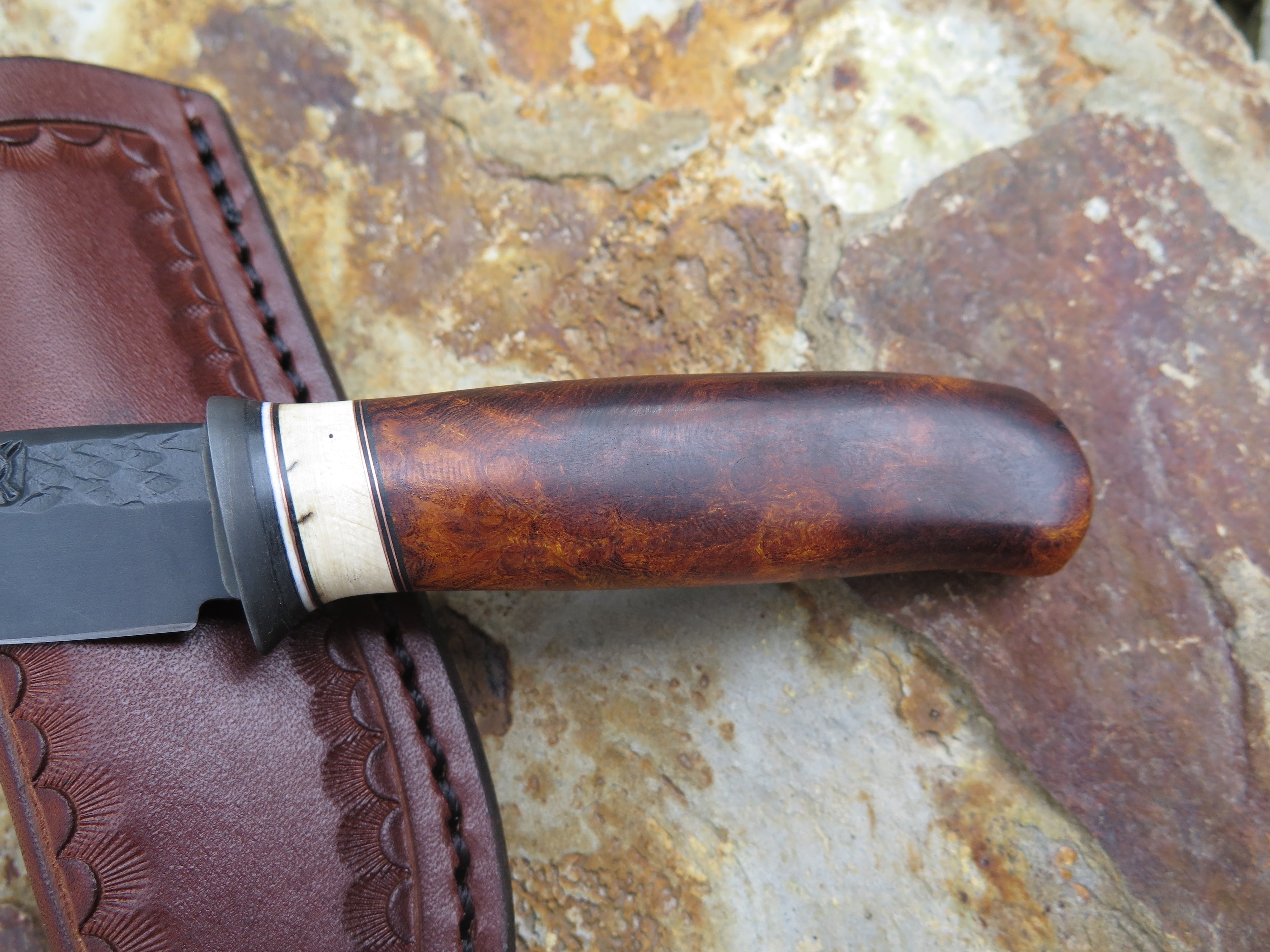 This Ironwood Pocket Knife from Behring Made© is hand forged from 1/8" thick high carbon 01 tool steel and it measures 2 3/4" from tip to guard with a razor sharp hollow grind, hammermarks and our forced patina blued finish. The blued steel guard is soldered in place above black and white fiber, copper and ancient mammoth ivory spacers in addition to the premium desert ironwood burl handle that brings the overall length to measure 6 1/4". This one comes in a Behring Made clip pocket sheath. Lead time is 6-8 weeks.