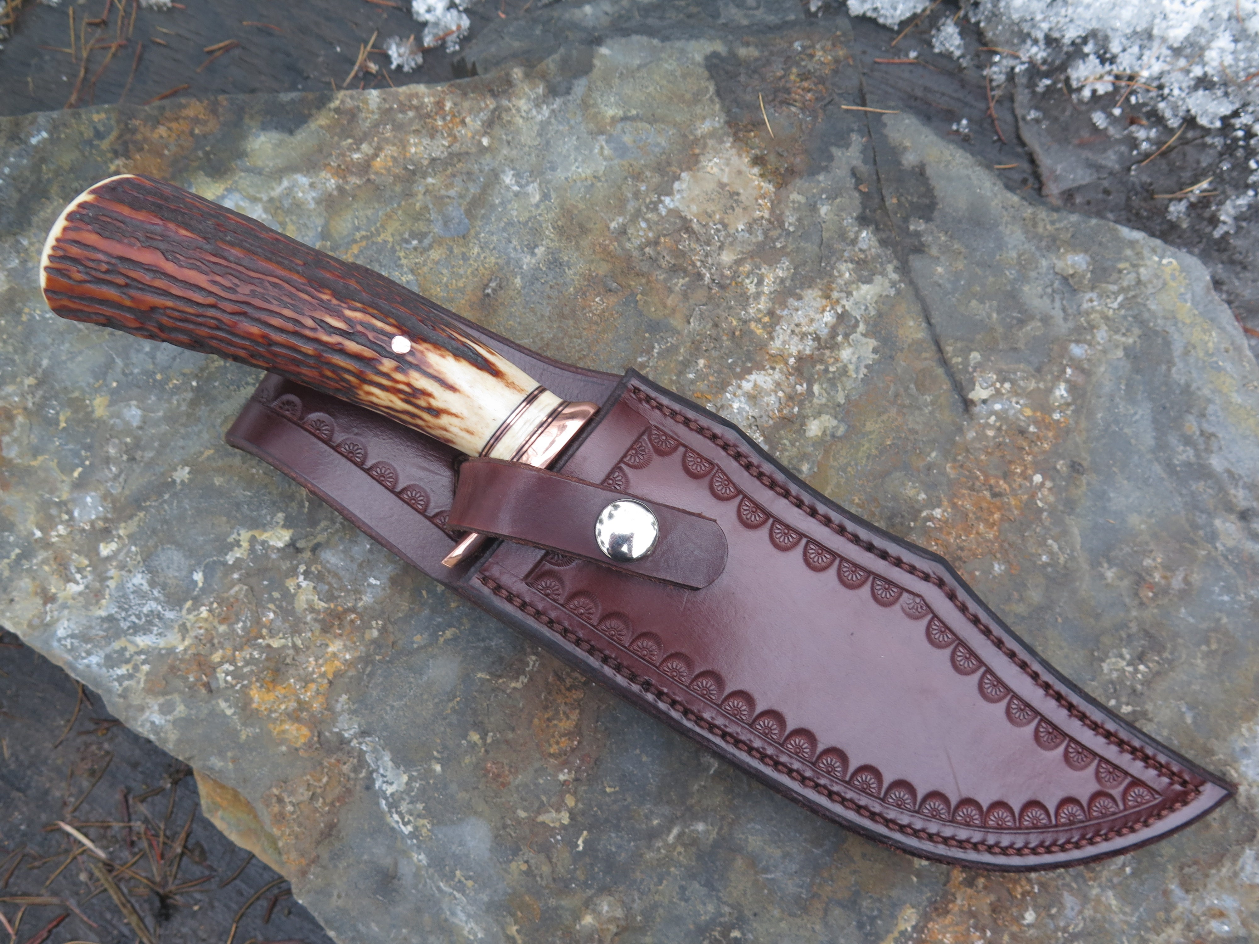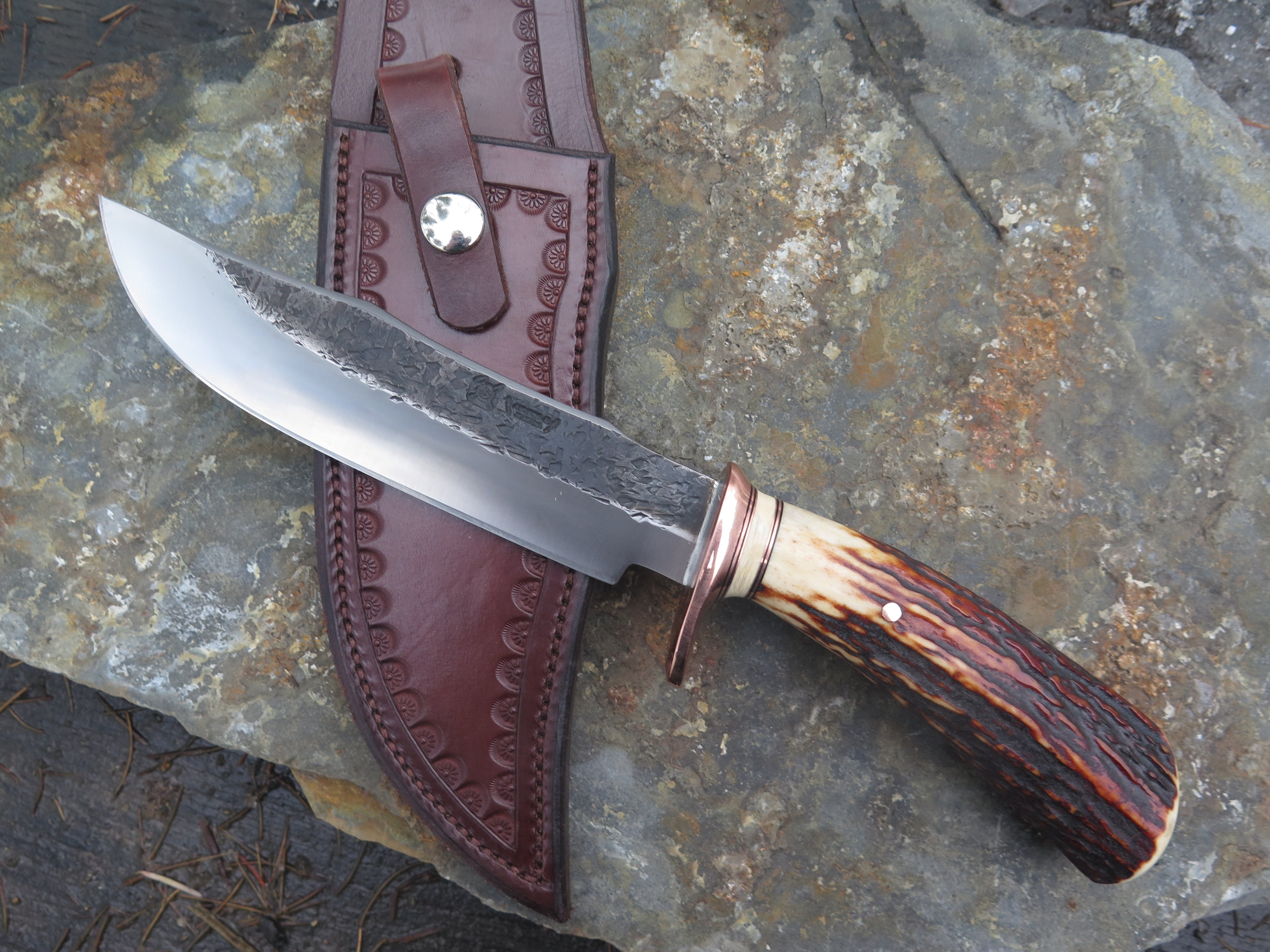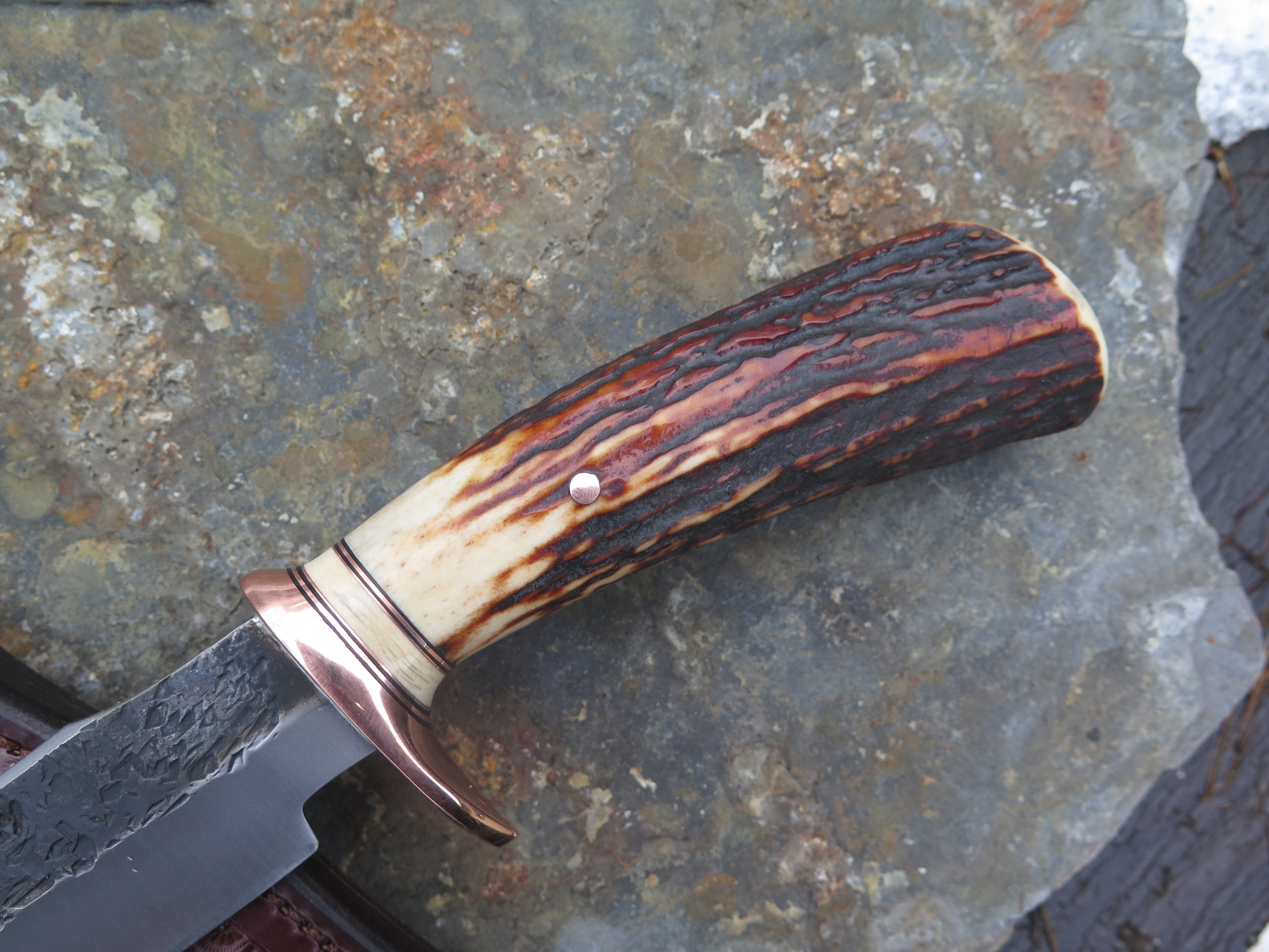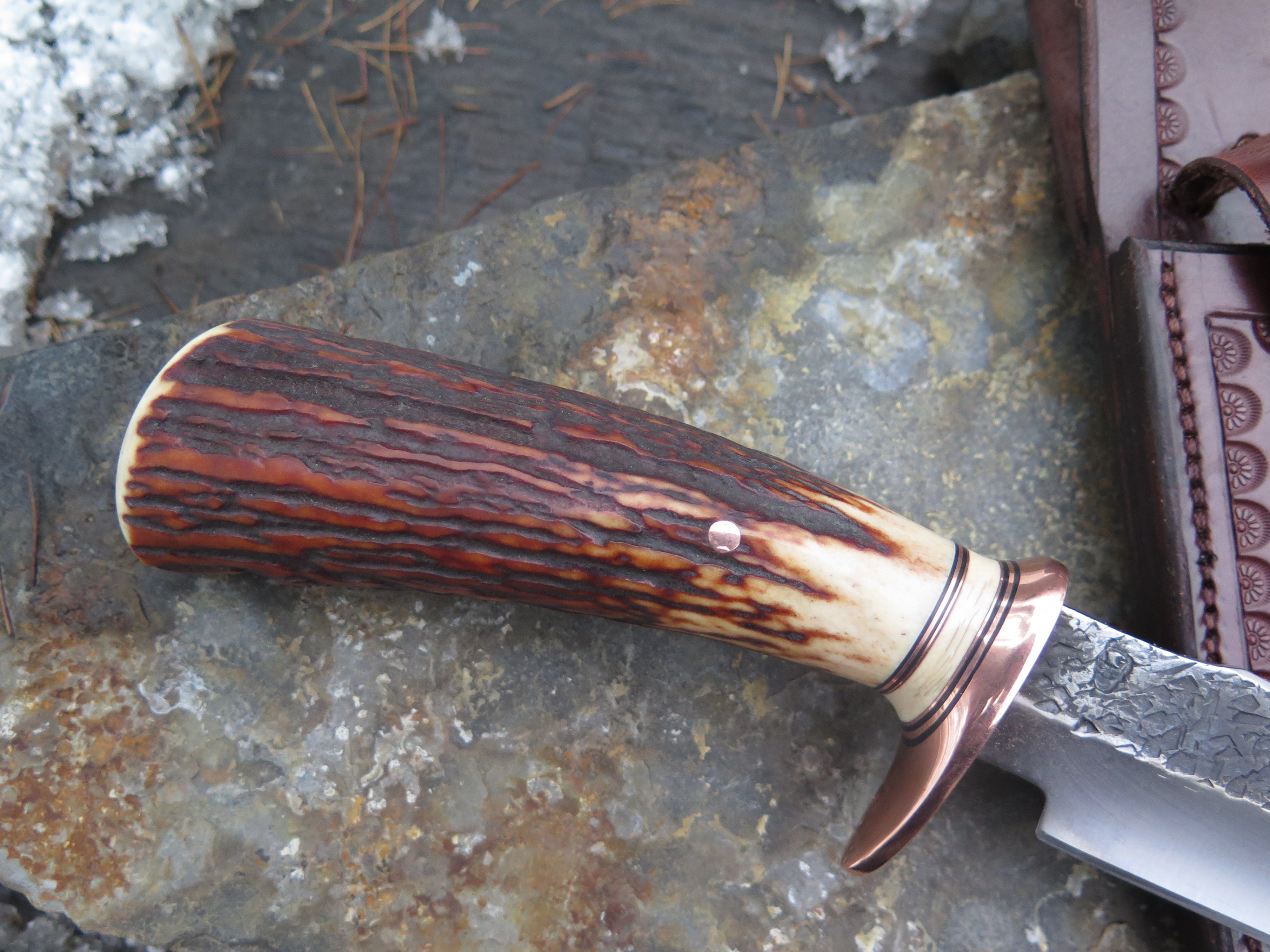 This is the Behring Made Special Ops Tribute in stag. The 6 1/2" blade is hand forged 1/4" thick 5160 spring. The hammermarks, well-struckIamps, and a little skull stamp are fitting for a knife of this caliber and pedigree. This variation has a copper guard with black, copper, and creamy mammoth ivory spacers. I selected a hefty piece of amber-red sambar stag and pinned it with copper. This knife has a great solid feel and weight! The overall length measures 11 5/8". Will Hutch, our customer leather crafter, made you a border tooled strap over guard sheath dyed in a complimentary tone to complete the package. Lead times are 6-8 weeks.