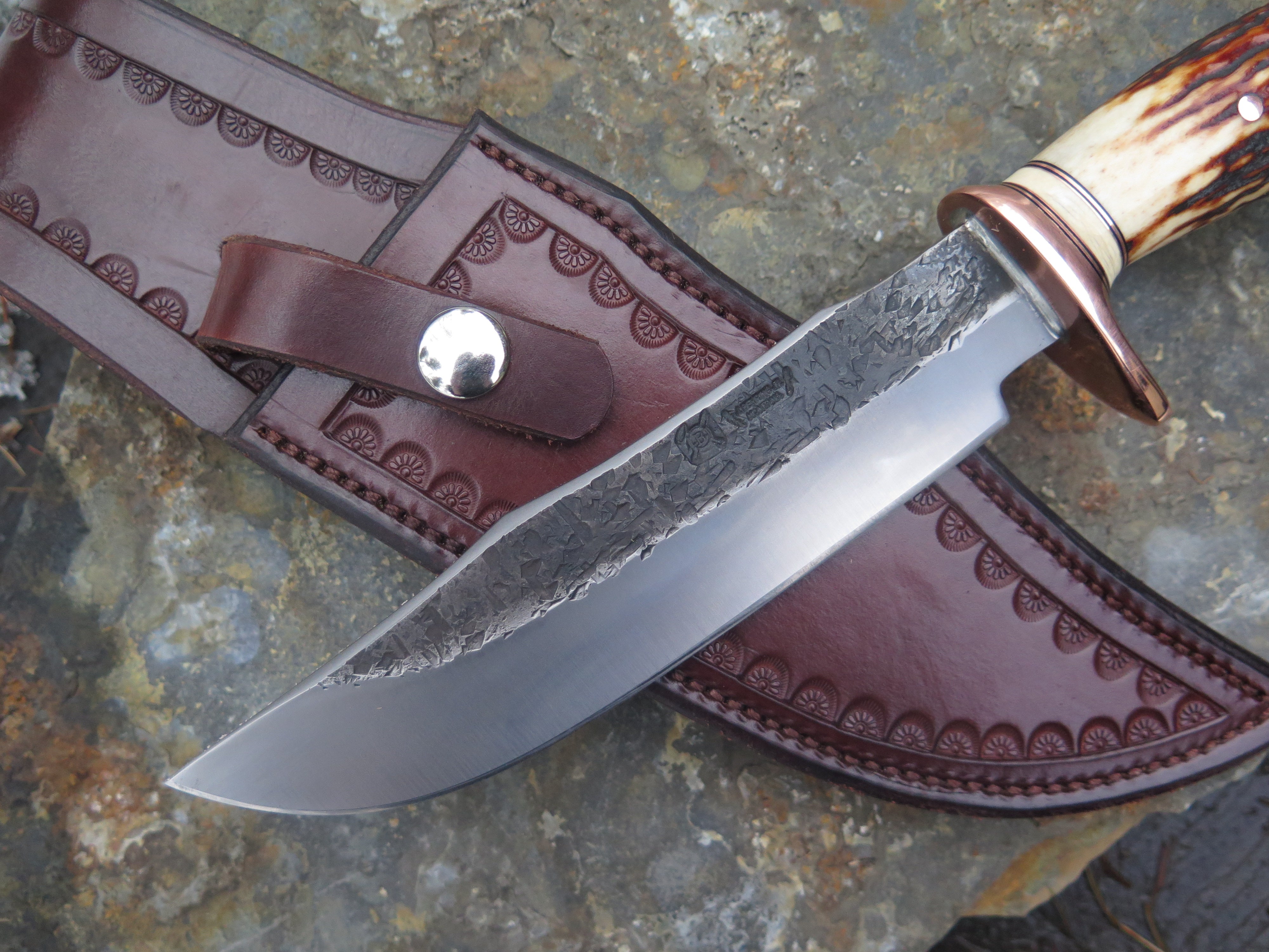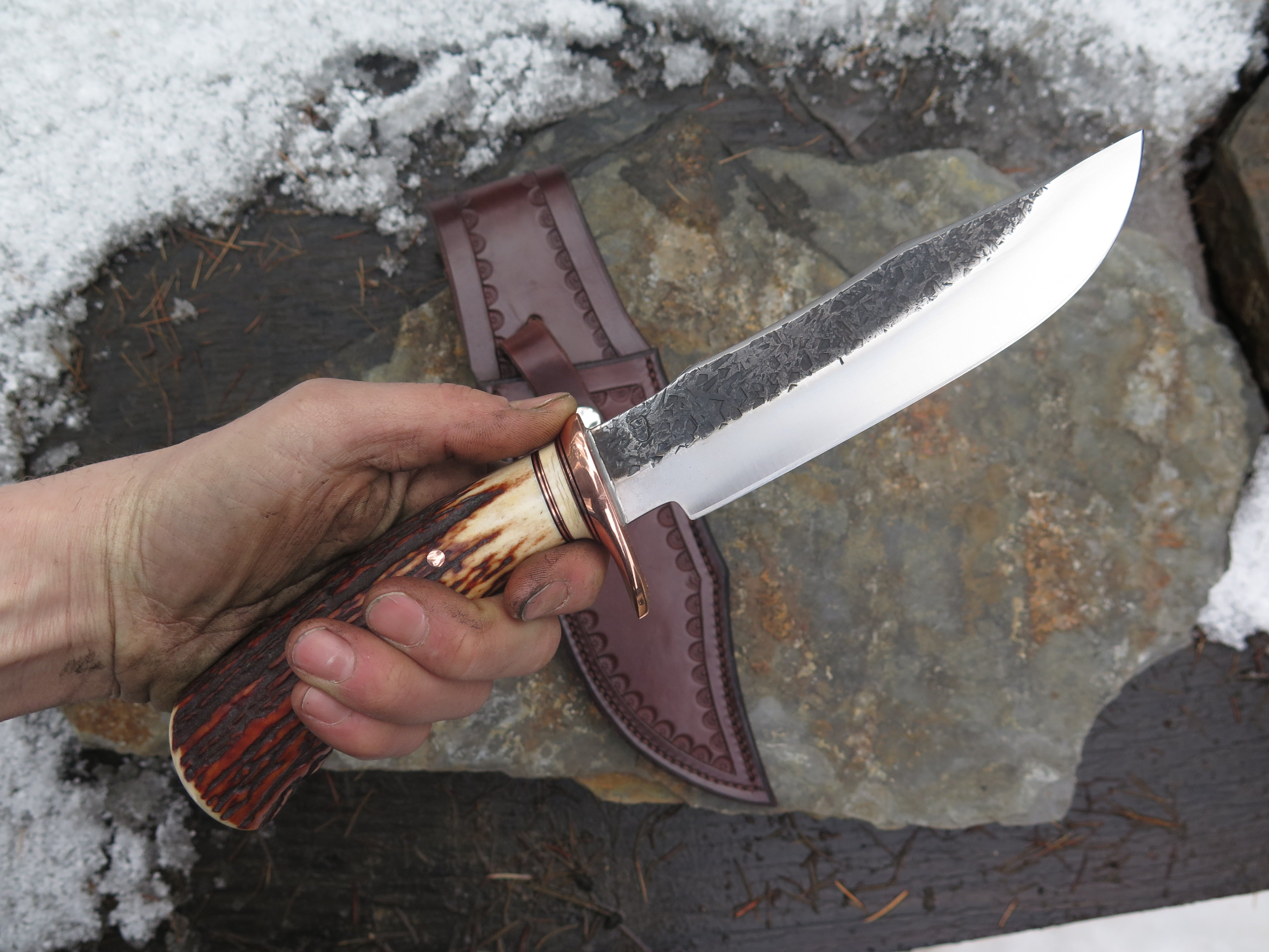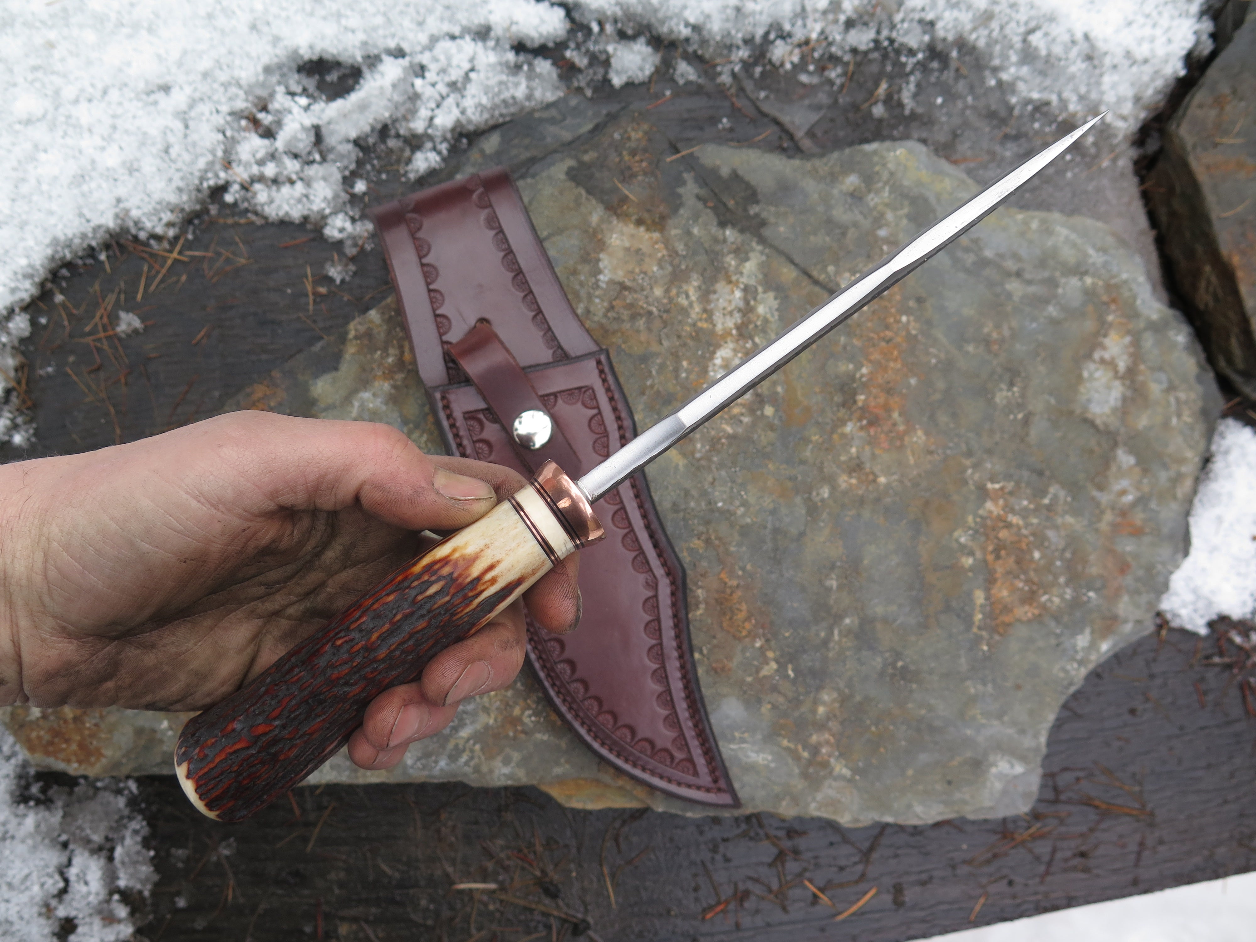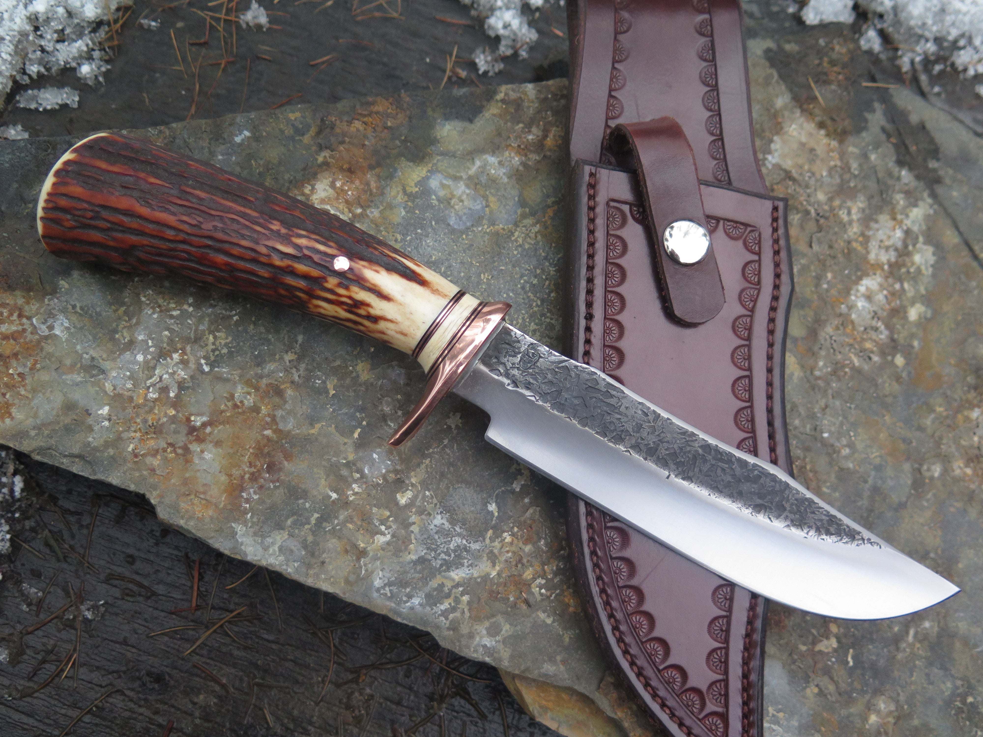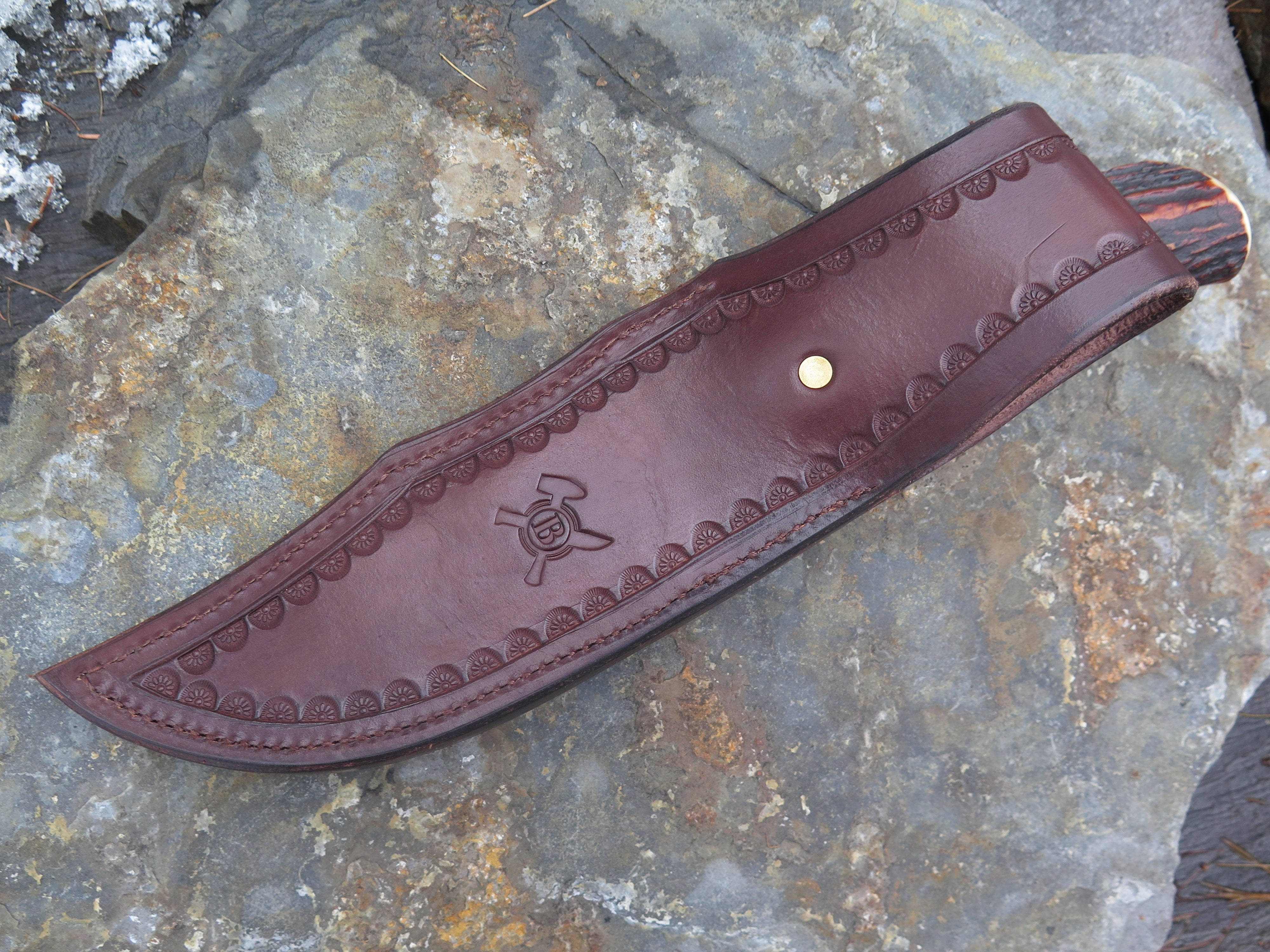 This is the Behring Made Special Ops Tribute in stag. The 6 1/2" blade is hand forged 1/4" thick 5160 spring. The hammermarks, well-struckIamps, and a little skull stamp are fitting for a knife of this caliber and pedigree. This variation has a copper guard with black, copper, and creamy mammoth ivory spacers. I selected a hefty piece of amber-red sambar stag and pinned it with copper. This knife has a great solid feel and weight! The overall length measures 11 5/8". Will Hutch, our customer leather crafter, made you a border tooled strap over guard sheath dyed in a complimentary tone to complete the package. Lead times are 6-8 weeks.