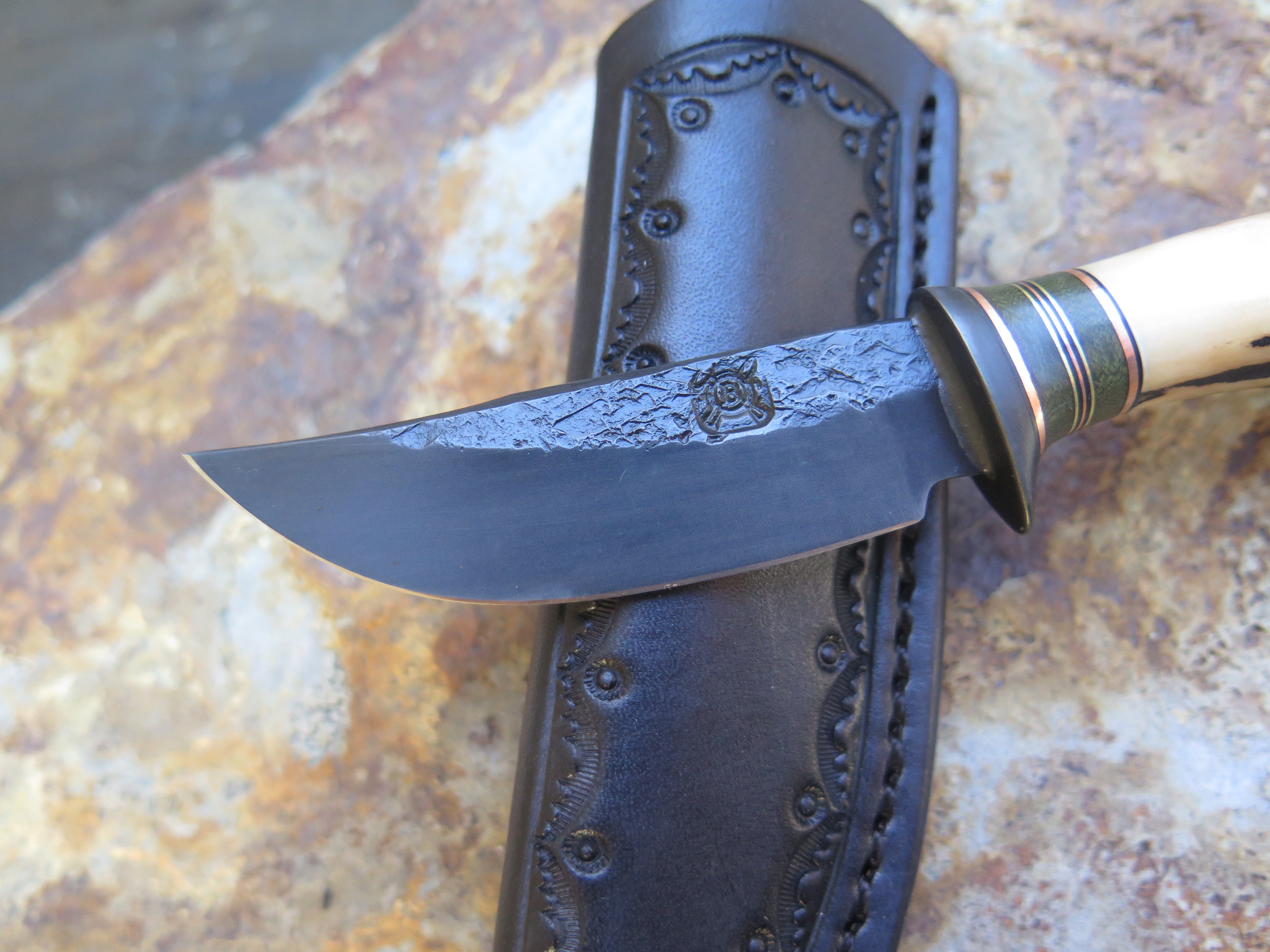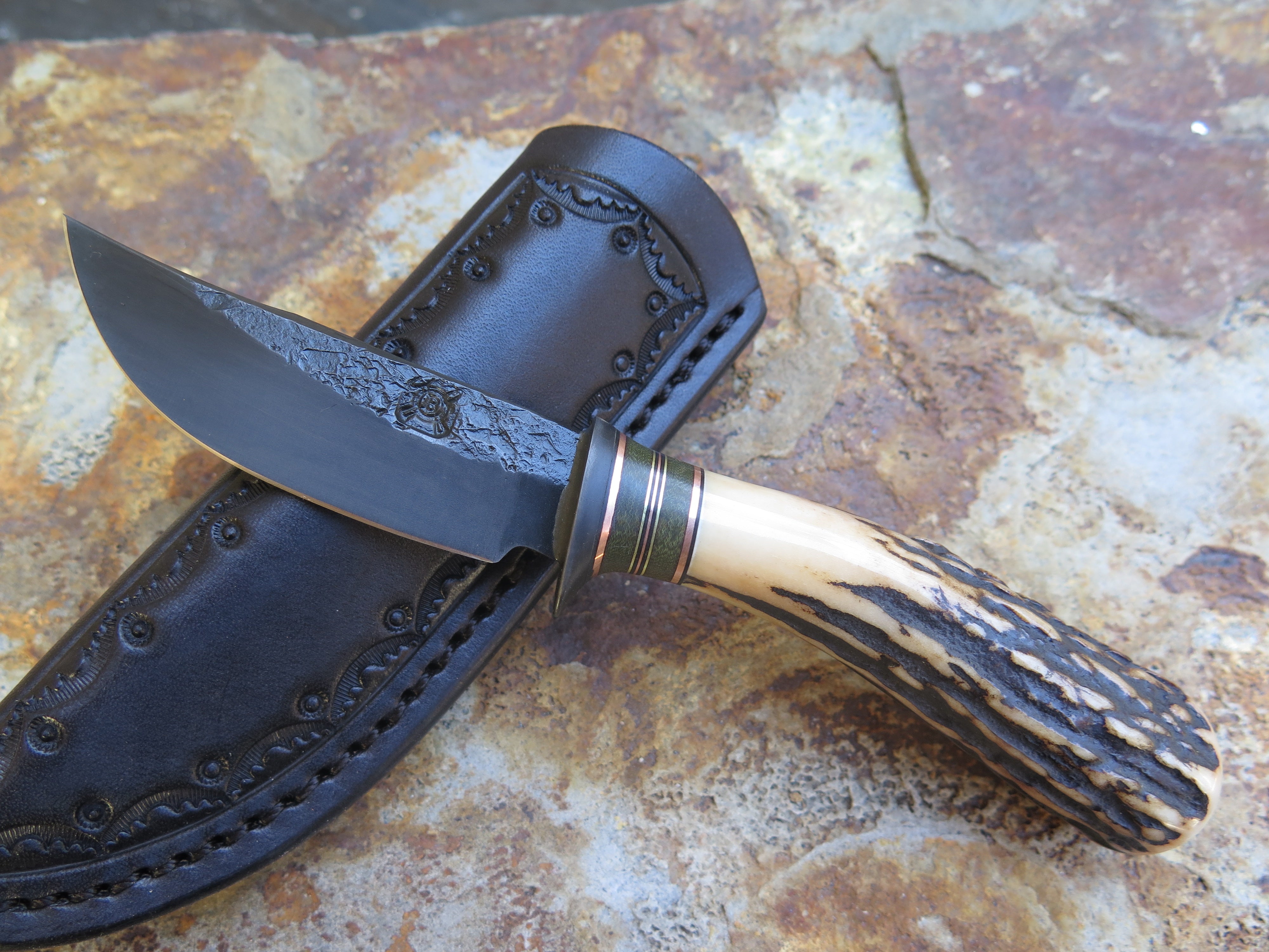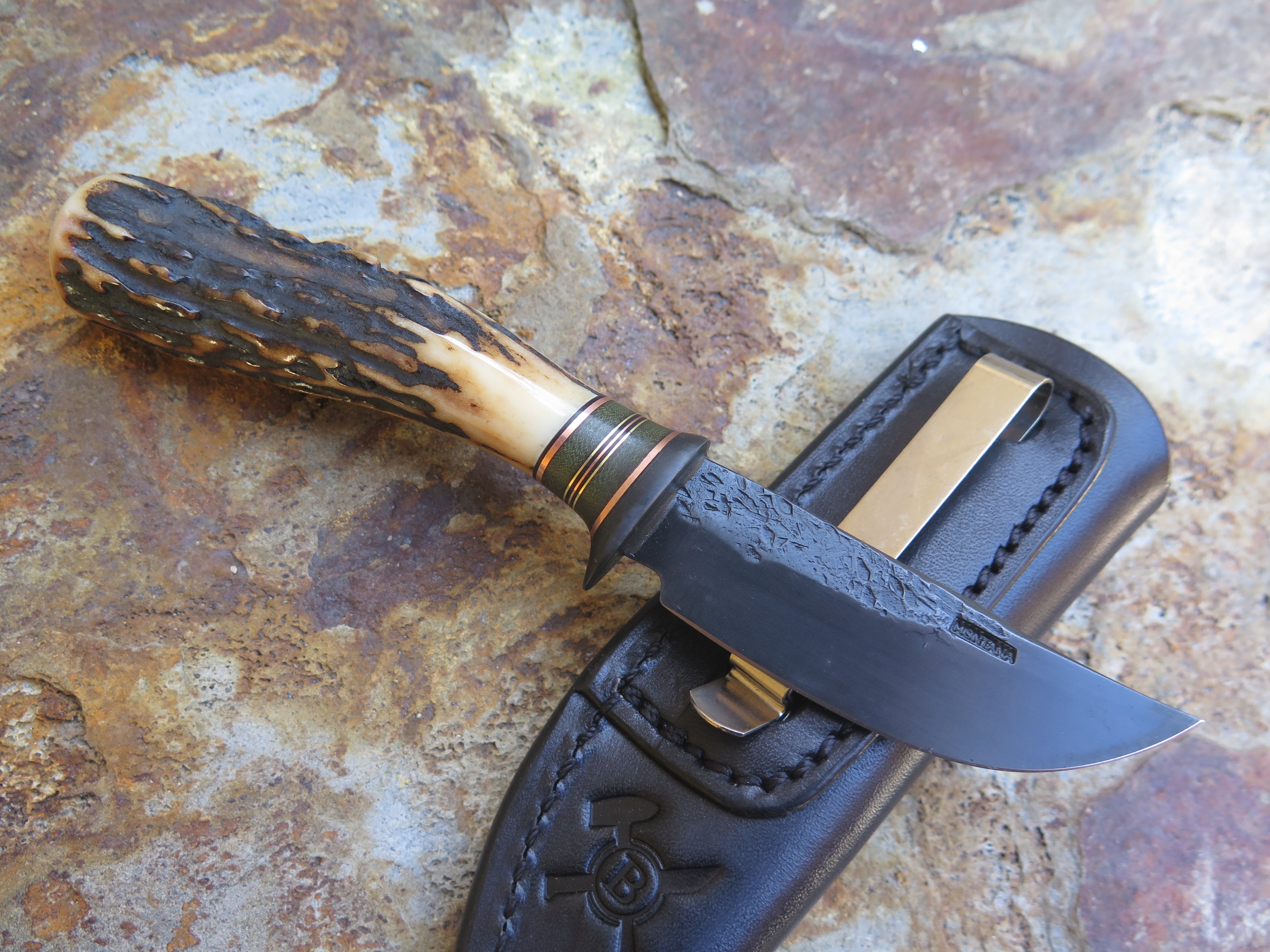 This beautiful new blued pocket knife from Behring Made© is hand forged from 1/8" thick high carbon 01 tool steel and it measures 3" from tip to guard with a razor sharp hollow grind, hammermarks and our forced patina blued finish. The blued steel guard is soldered in place above black fiber, green micarta, brass and copper spacers as well as a premium sambar stag handle that brings the overall length to measure out to 6 1/2". This one comes in a custom pocket clip sheath from Warlander Leather, designed to ride in the right hand pocket of your britches.