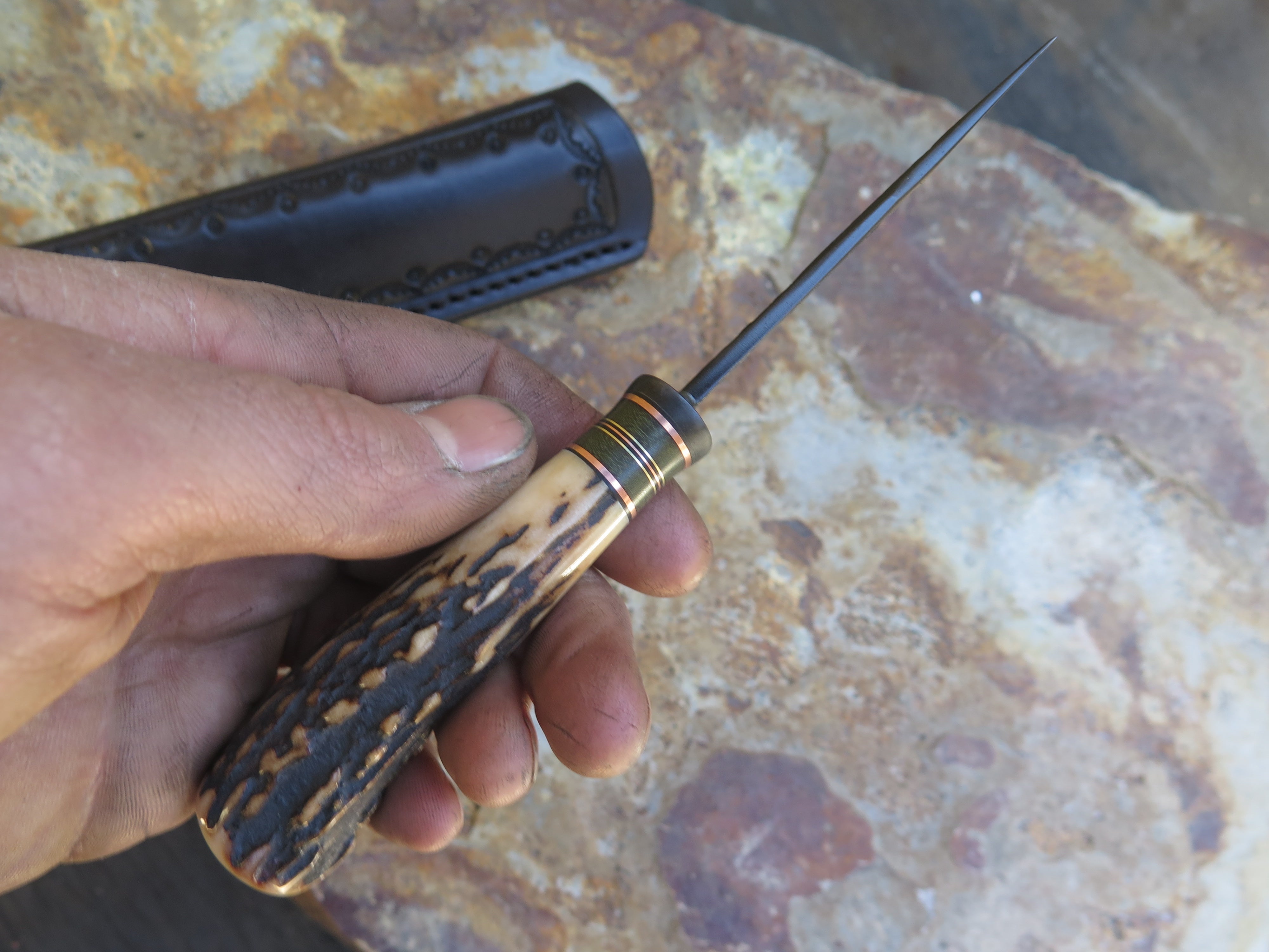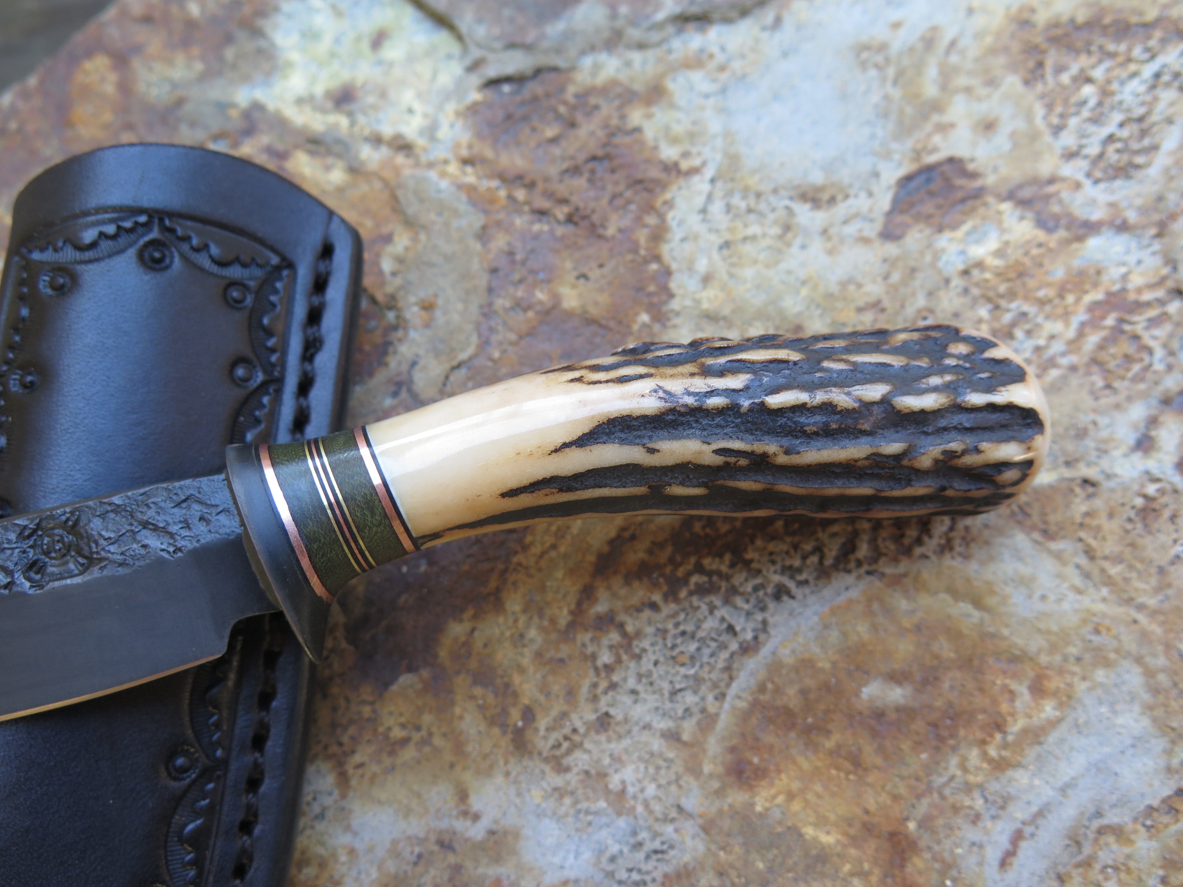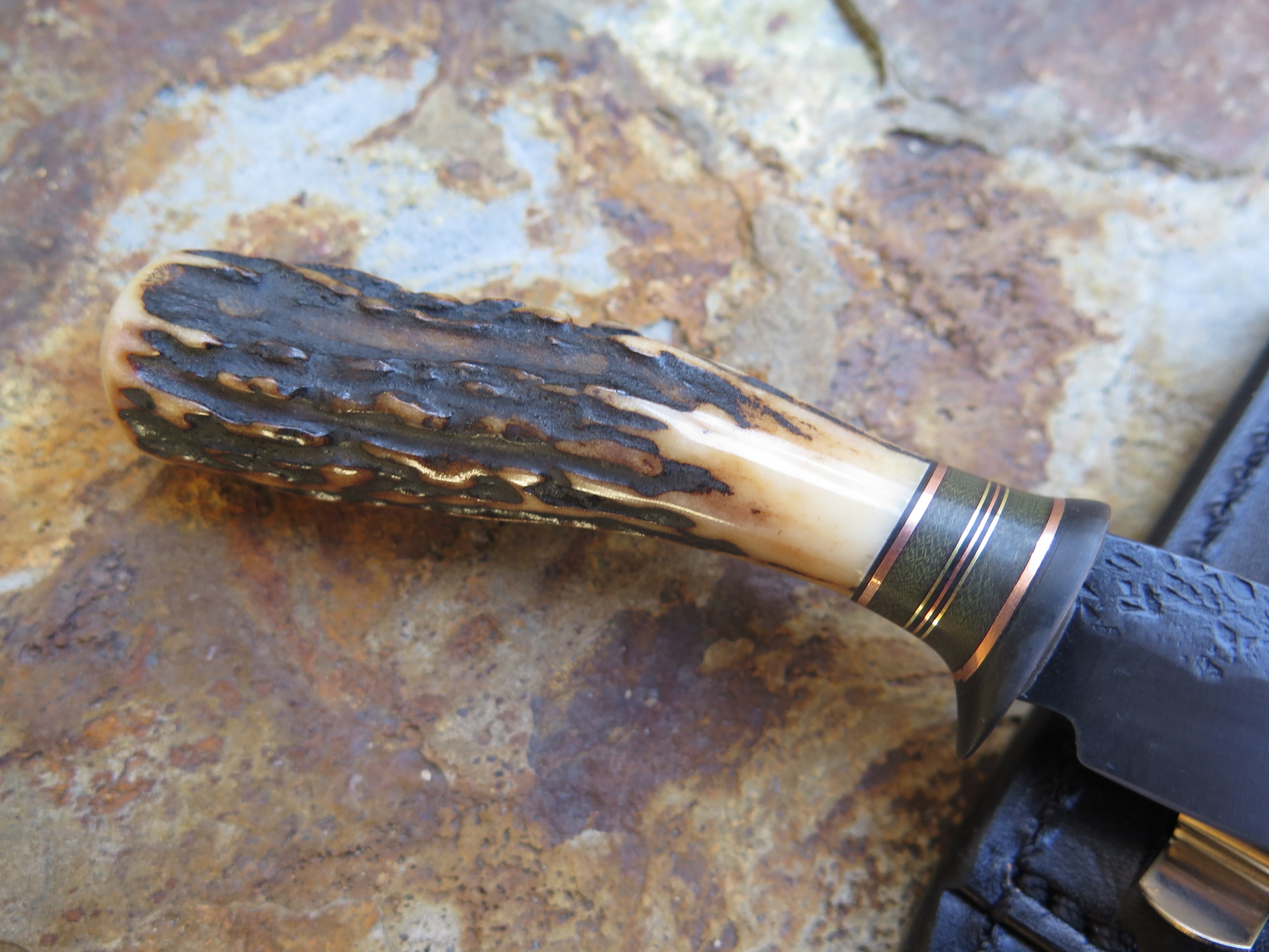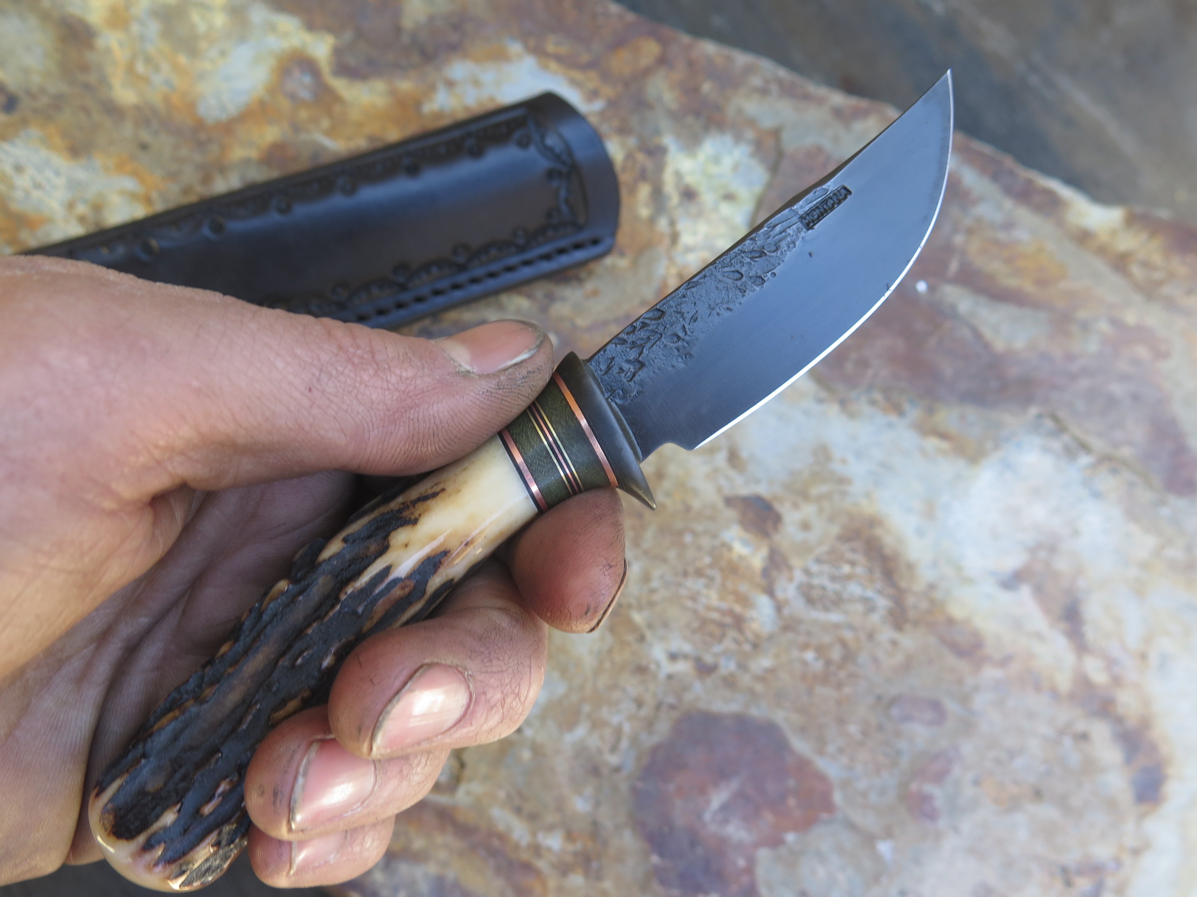 This beautiful new blued pocket knife from Behring Made© is hand forged from 1/8" thick high carbon 01 tool steel and it measures 3" from tip to guard with a razor sharp hollow grind, hammermarks and our forced patina blued finish. The blued steel guard is soldered in place above black fiber, green micarta, brass and copper spacers as well as a premium sambar stag handle that brings the overall length to measure out to 6 1/2". This one comes in a custom pocket clip sheath from Warlander Leather, designed to ride in the right hand pocket of your britches.