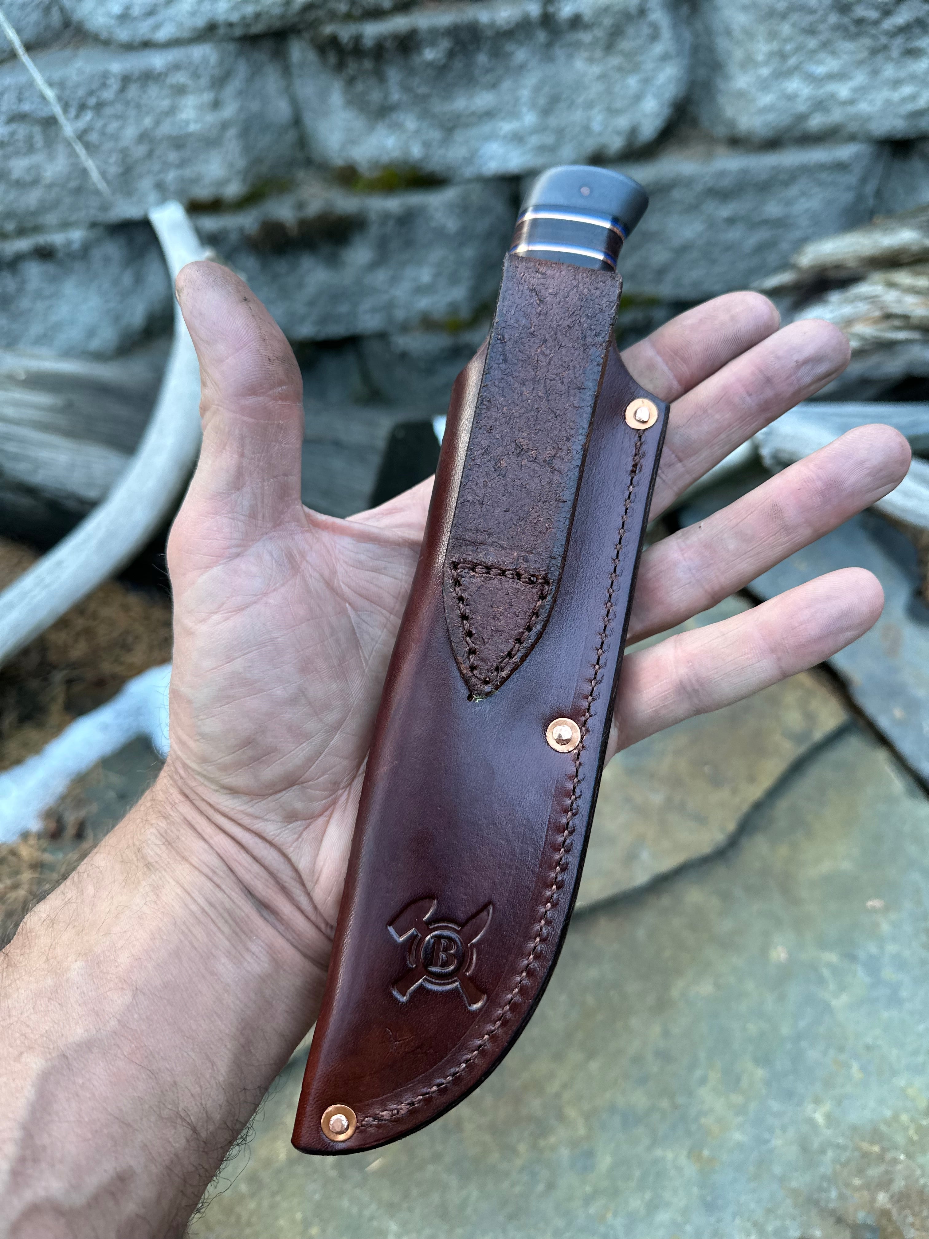 - Brown Border Tooled Pouch Sheath w/ Copper Rivets