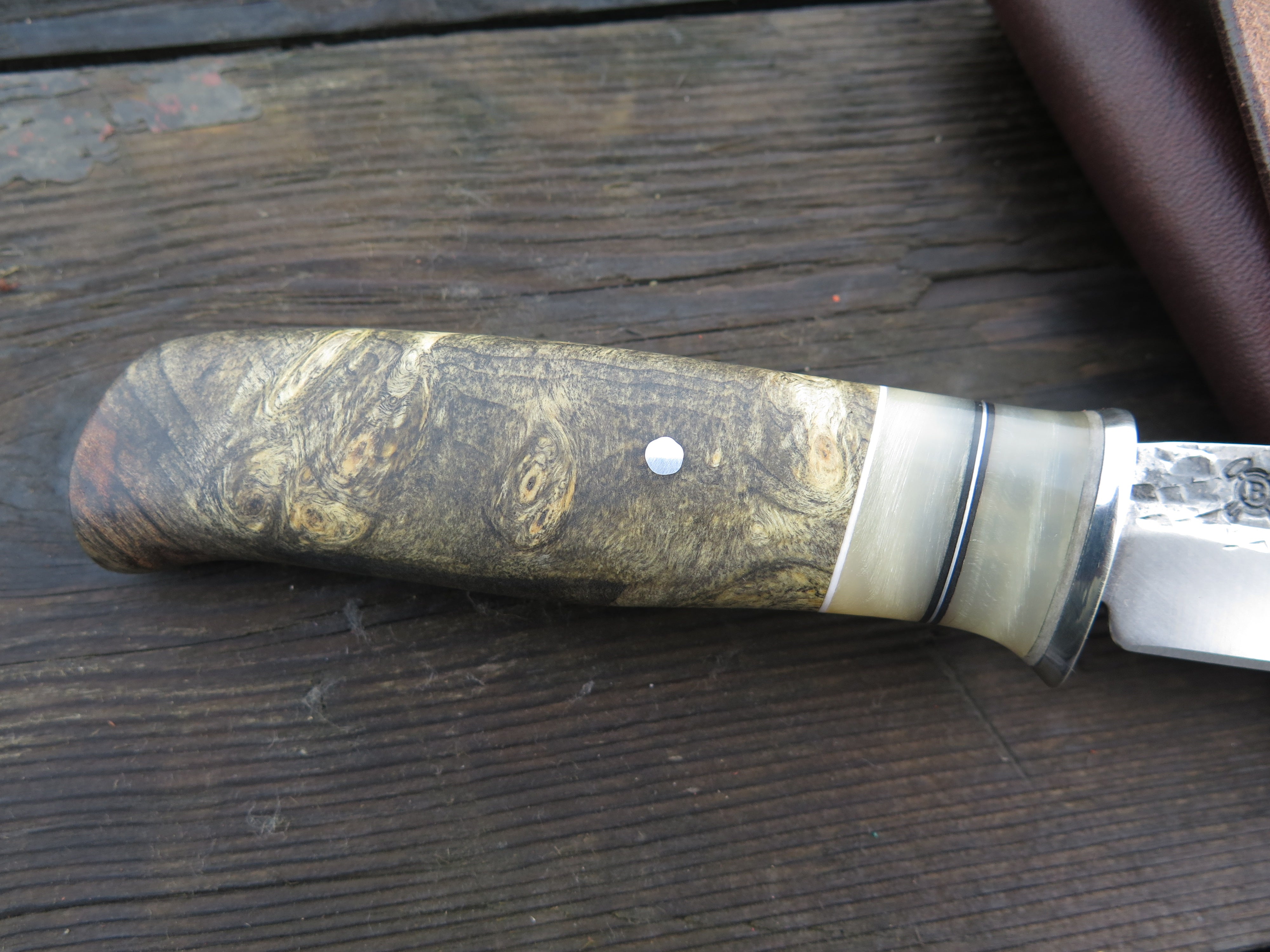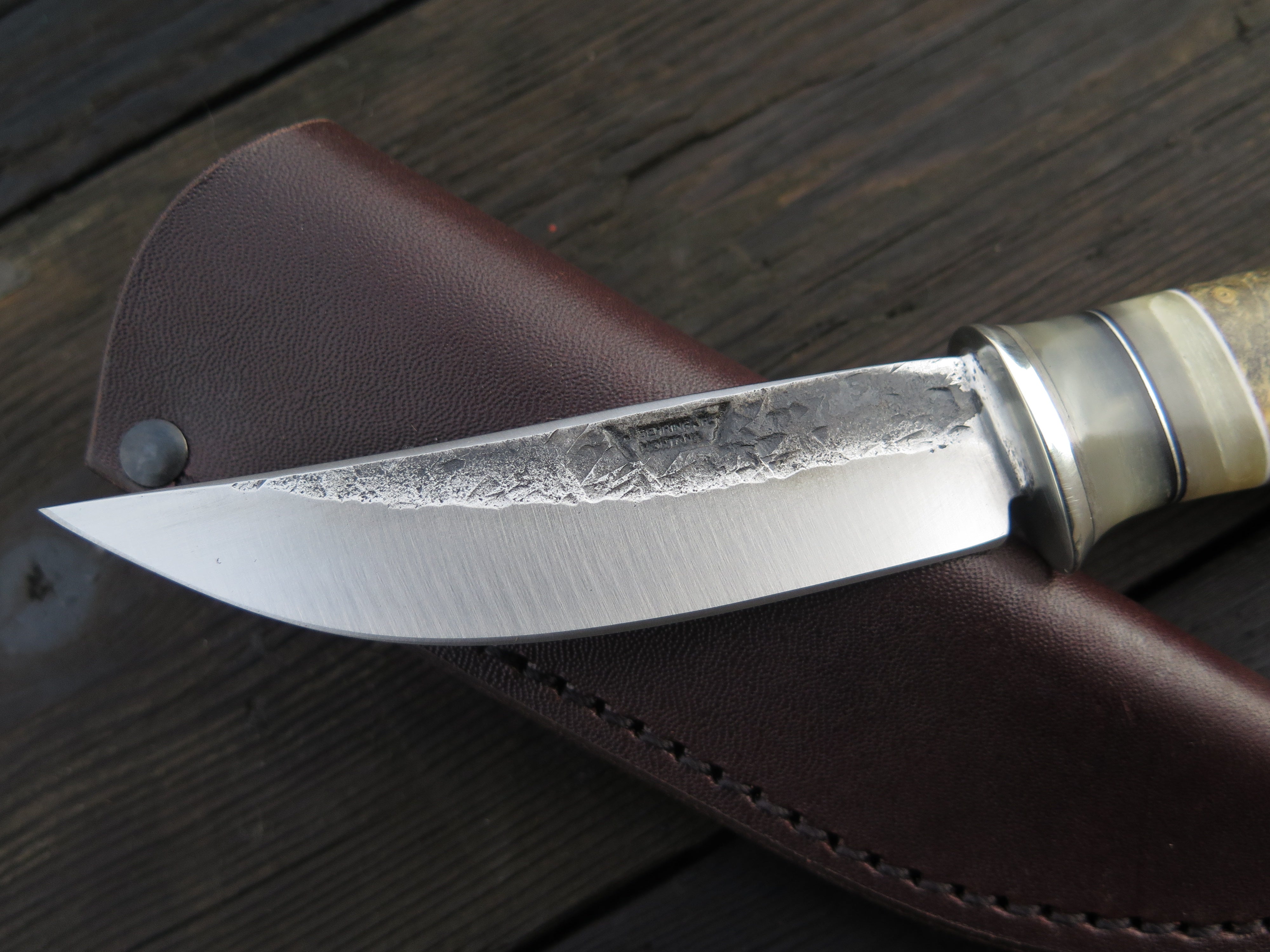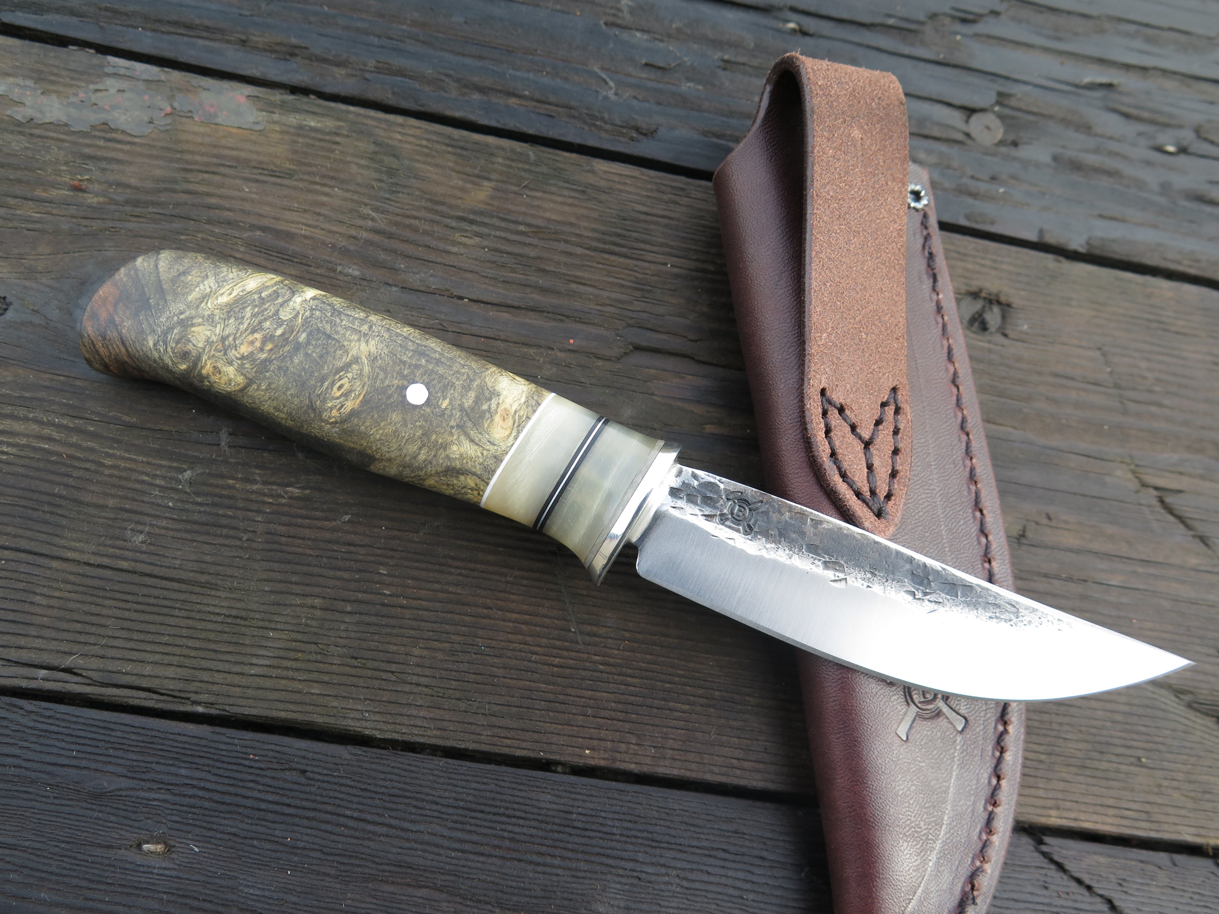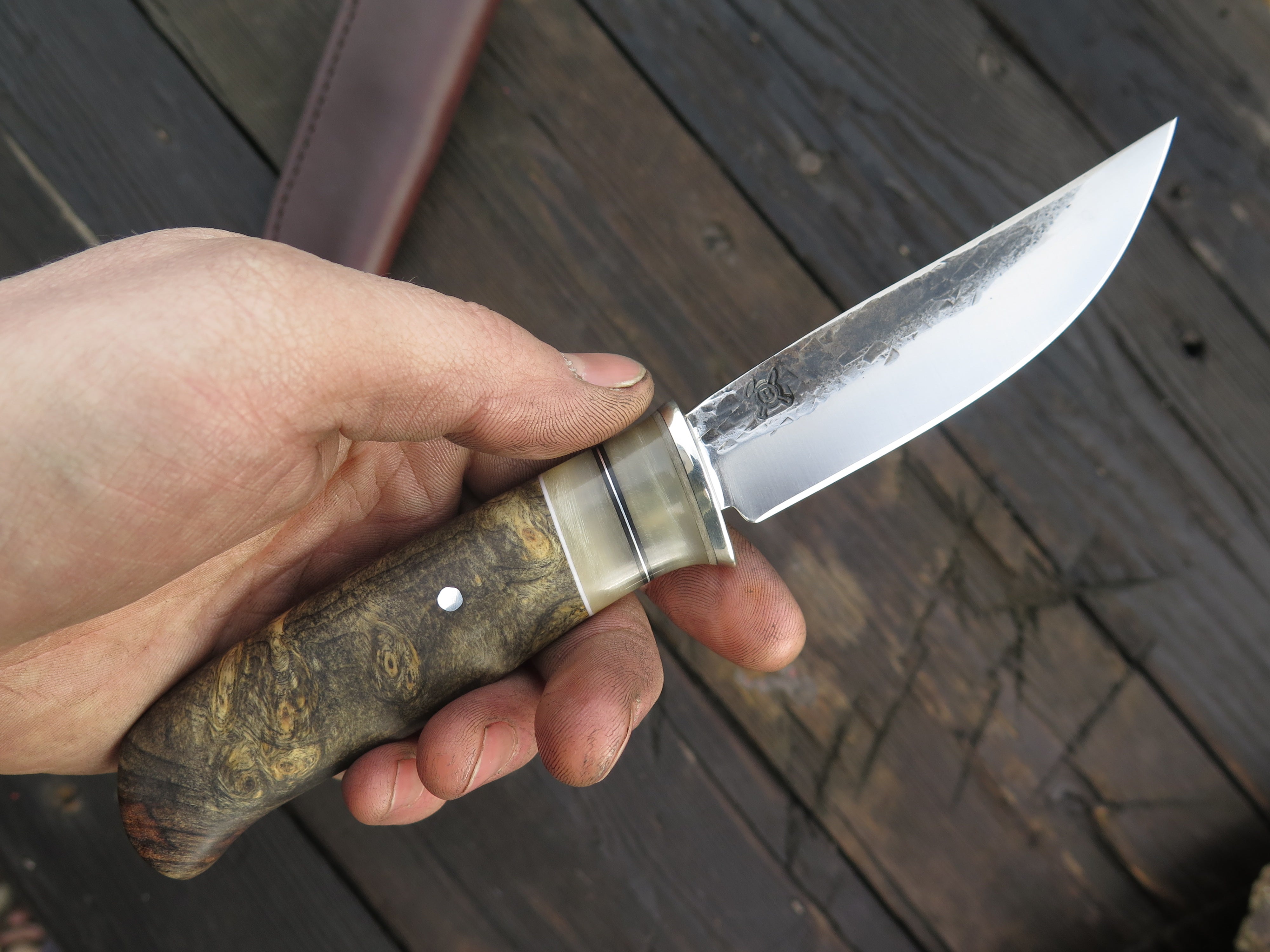 This incredible new Pintail from Behring Made© is hand forged from 1/8" thick high carbon 01 tool steel and it measures 4" from tip to guard with a razor sharp hollow grind and our hammermark finish. The nickel silver guard is soldered in place above black, white and grey fiber spacers in addition to two premium sheep horn accents with aluminum as well. The gorgeous buckeye burl handle is pinned through the tang with aluminum and overall length measures out to 8 1/4". This one comes in a classic pouch sheath and is guaranteed for life.