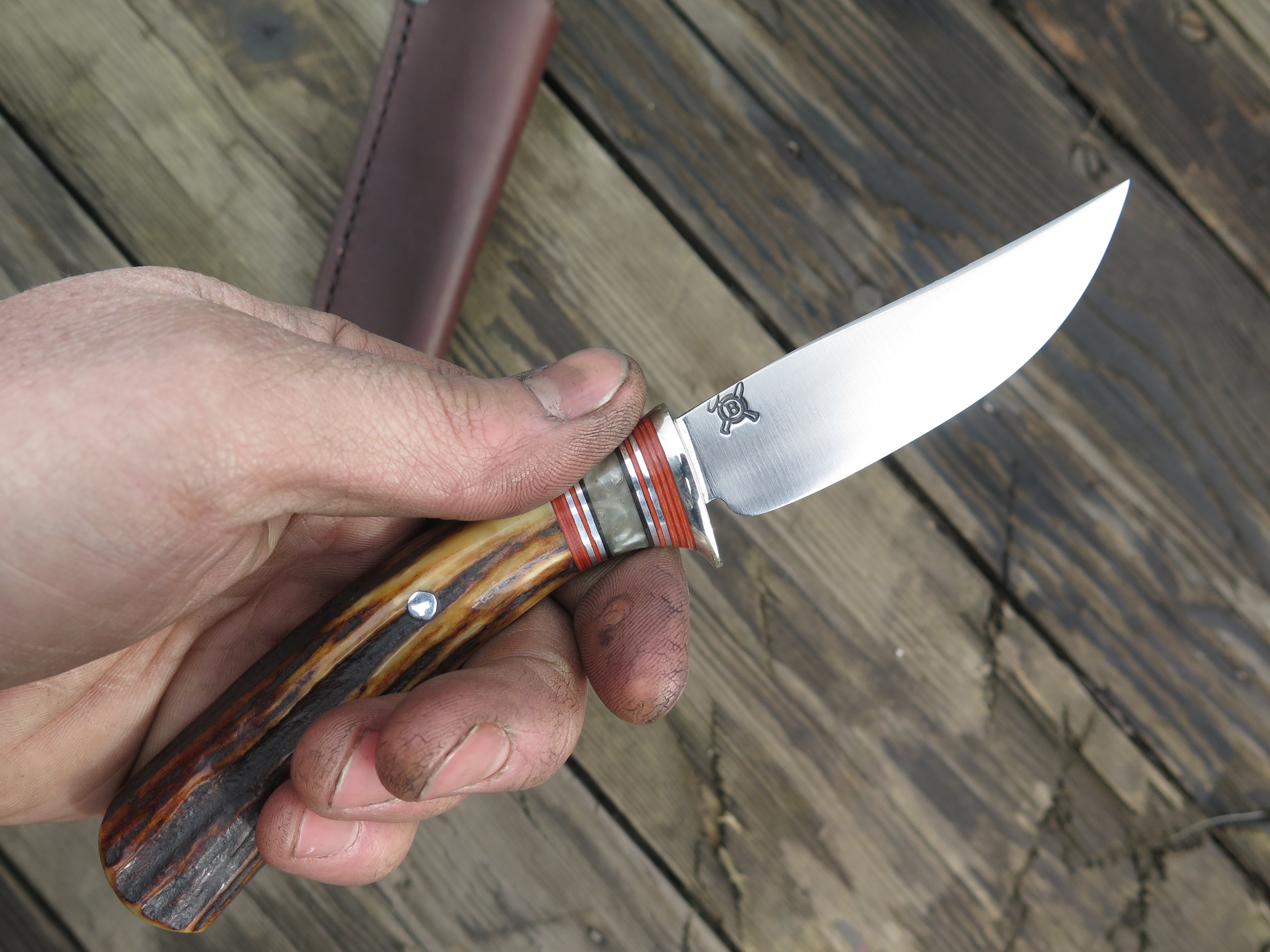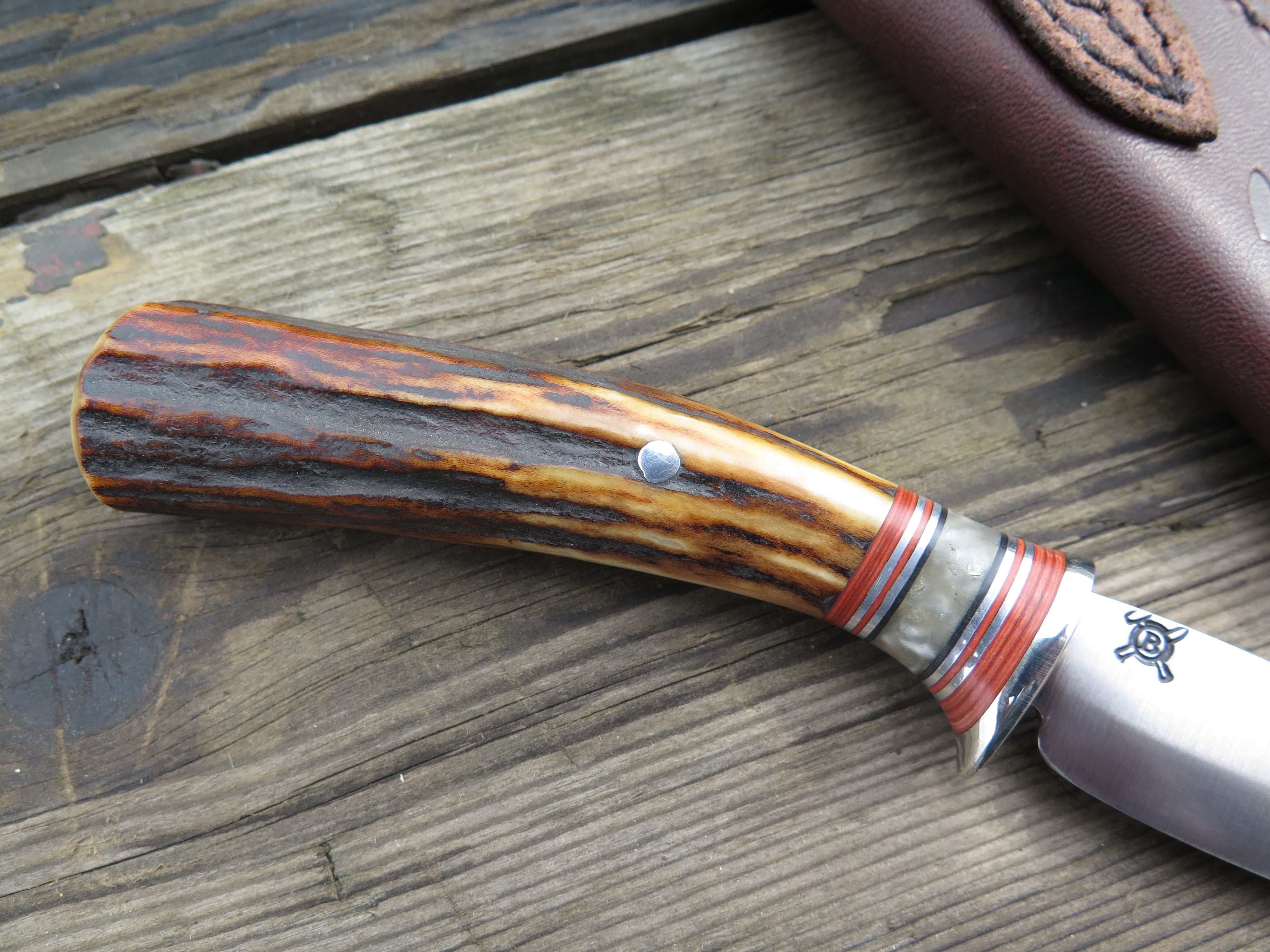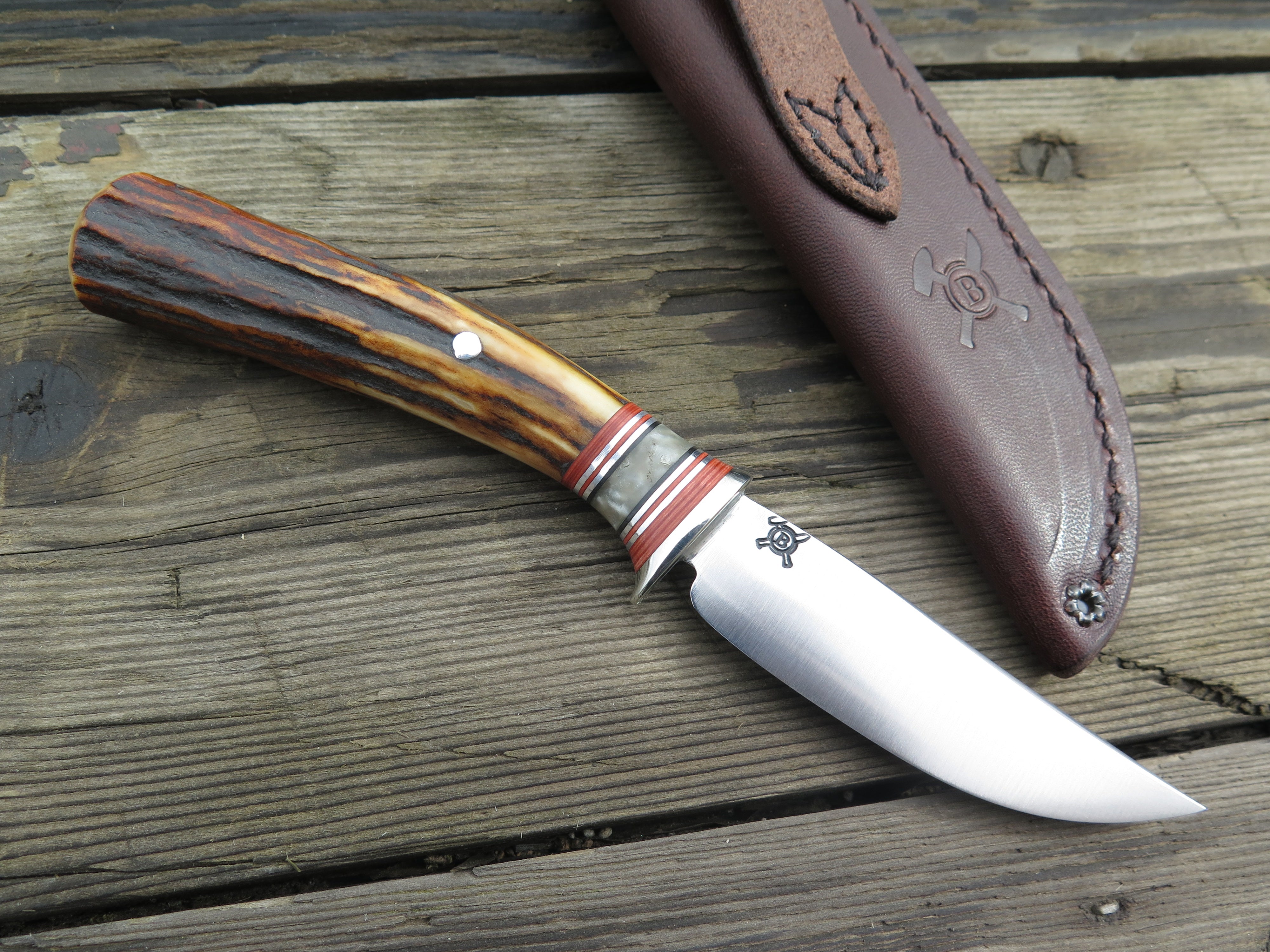 This beautiful new Pintail from Behring Made© is hand forged from 1/8" thick high carbon 01 tool steel and it measures 3 1/4" from tip to guard with a razor sharp convex grind. The nickel silver guard is soldered in place above black and maroon fiber, musk ox boss and aluminum spacers atop a premium sambar stag handle that's pinned through the tang with aluminum. The overall length measures 7 1/4" and it comes in a simple belt pouch sheath though upgrades are always available on request.