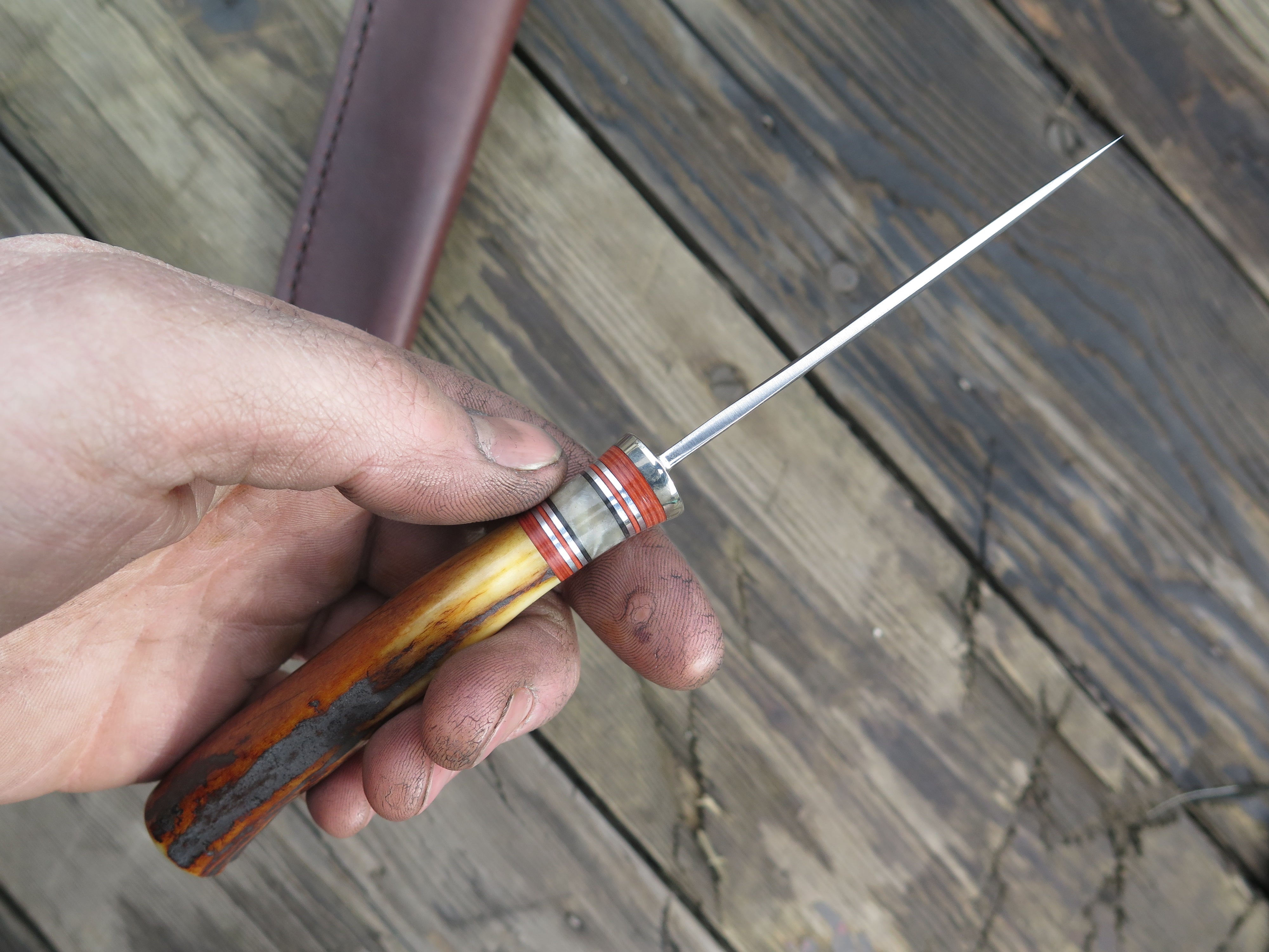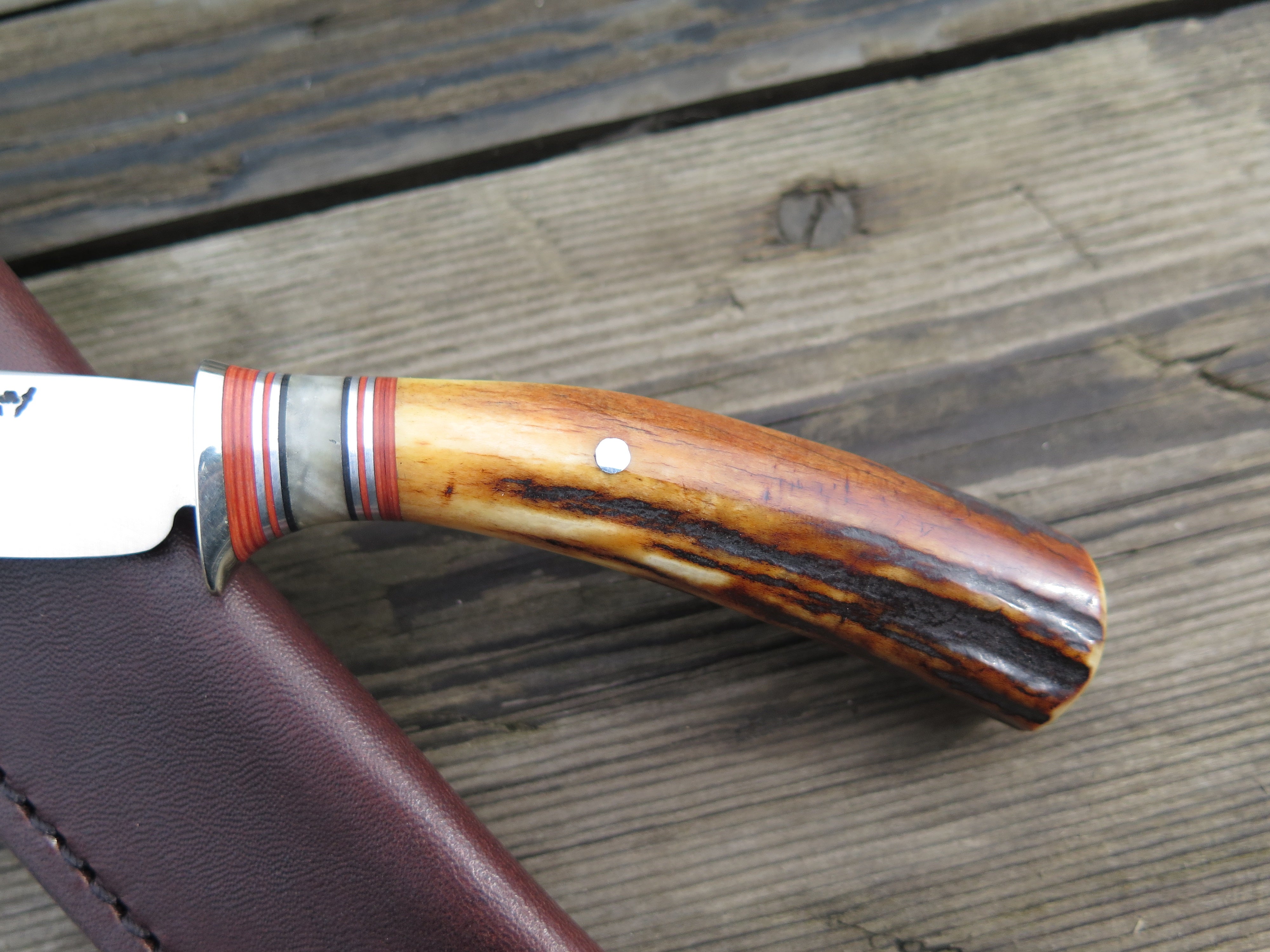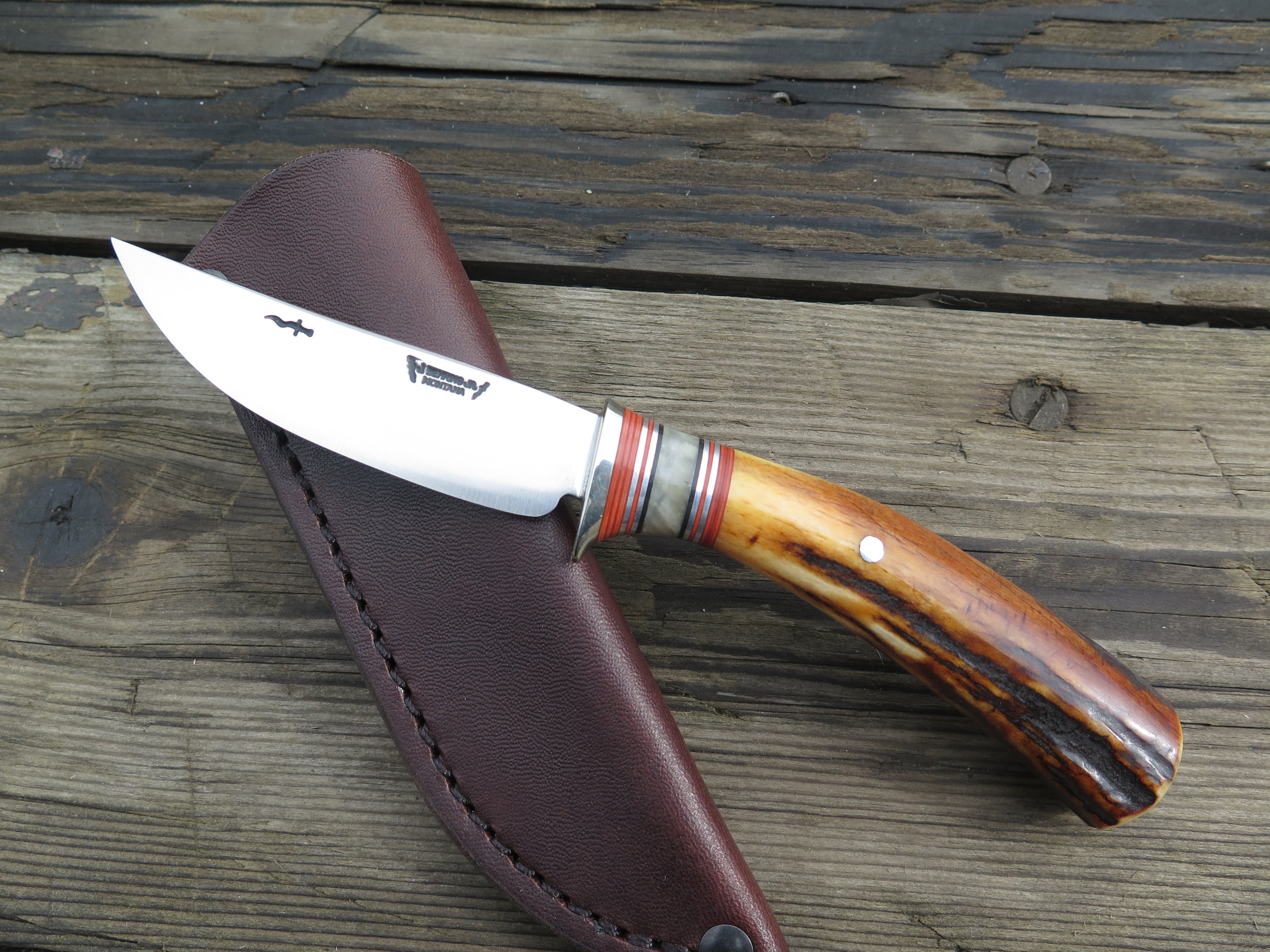 This beautiful new Pintail from Behring Made© is hand forged from 1/8" thick high carbon 01 tool steel and it measures 3 1/4" from tip to guard with a razor sharp convex grind. The nickel silver guard is soldered in place above black and maroon fiber, musk ox boss and aluminum spacers atop a premium sambar stag handle that's pinned through the tang with aluminum. The overall length measures 7 1/4" and it comes in a simple belt pouch sheath though upgrades are always available on request.