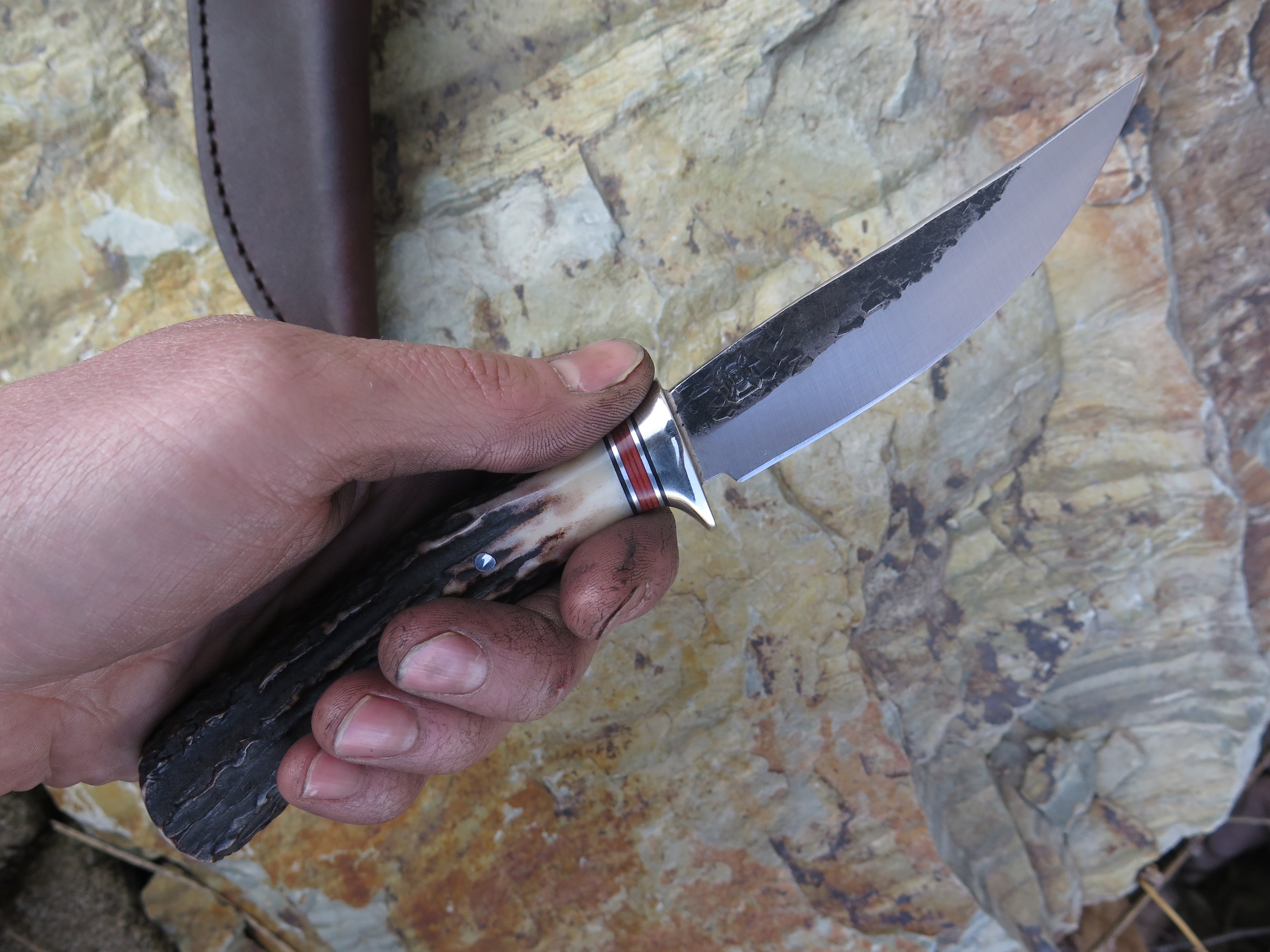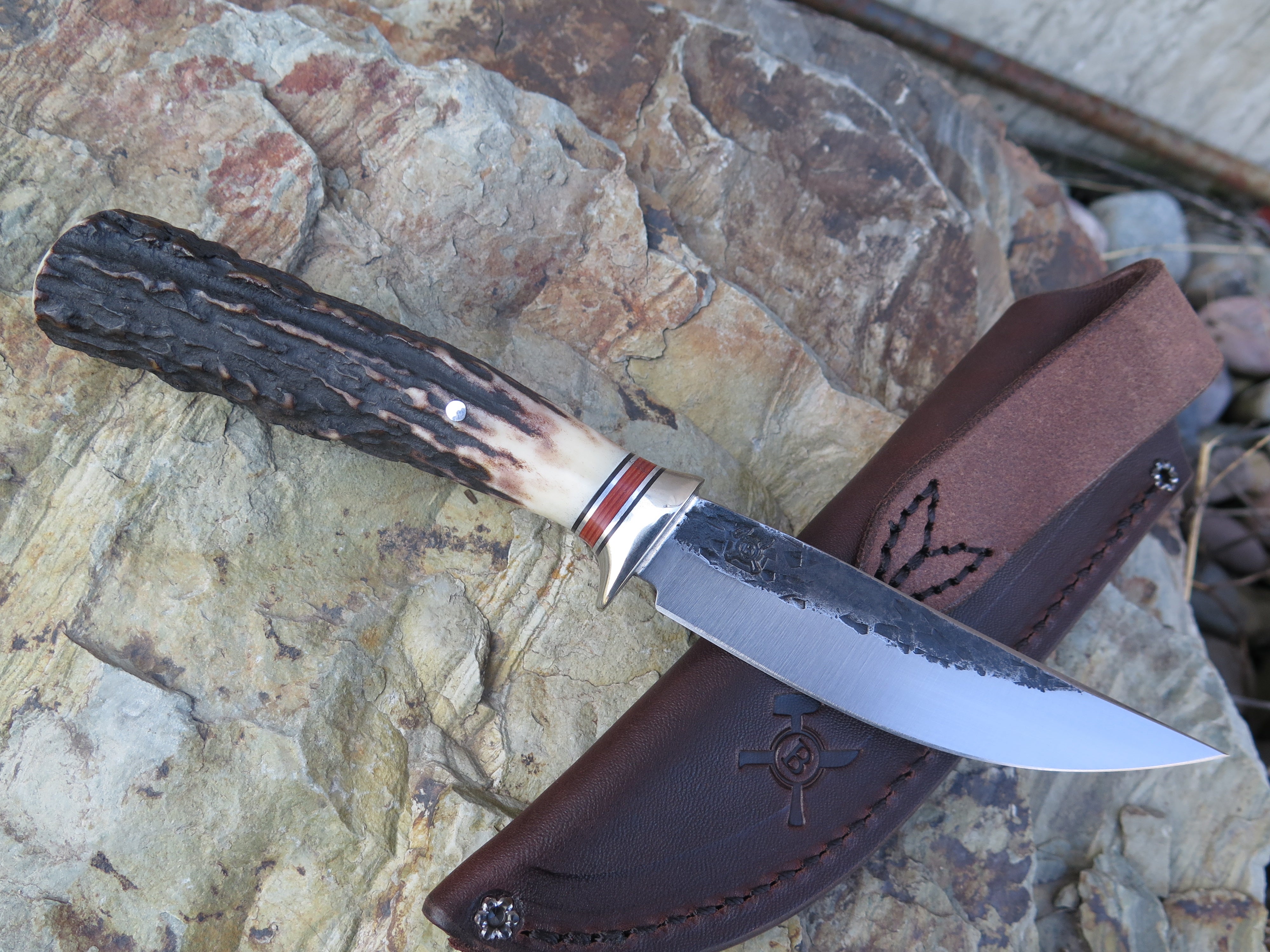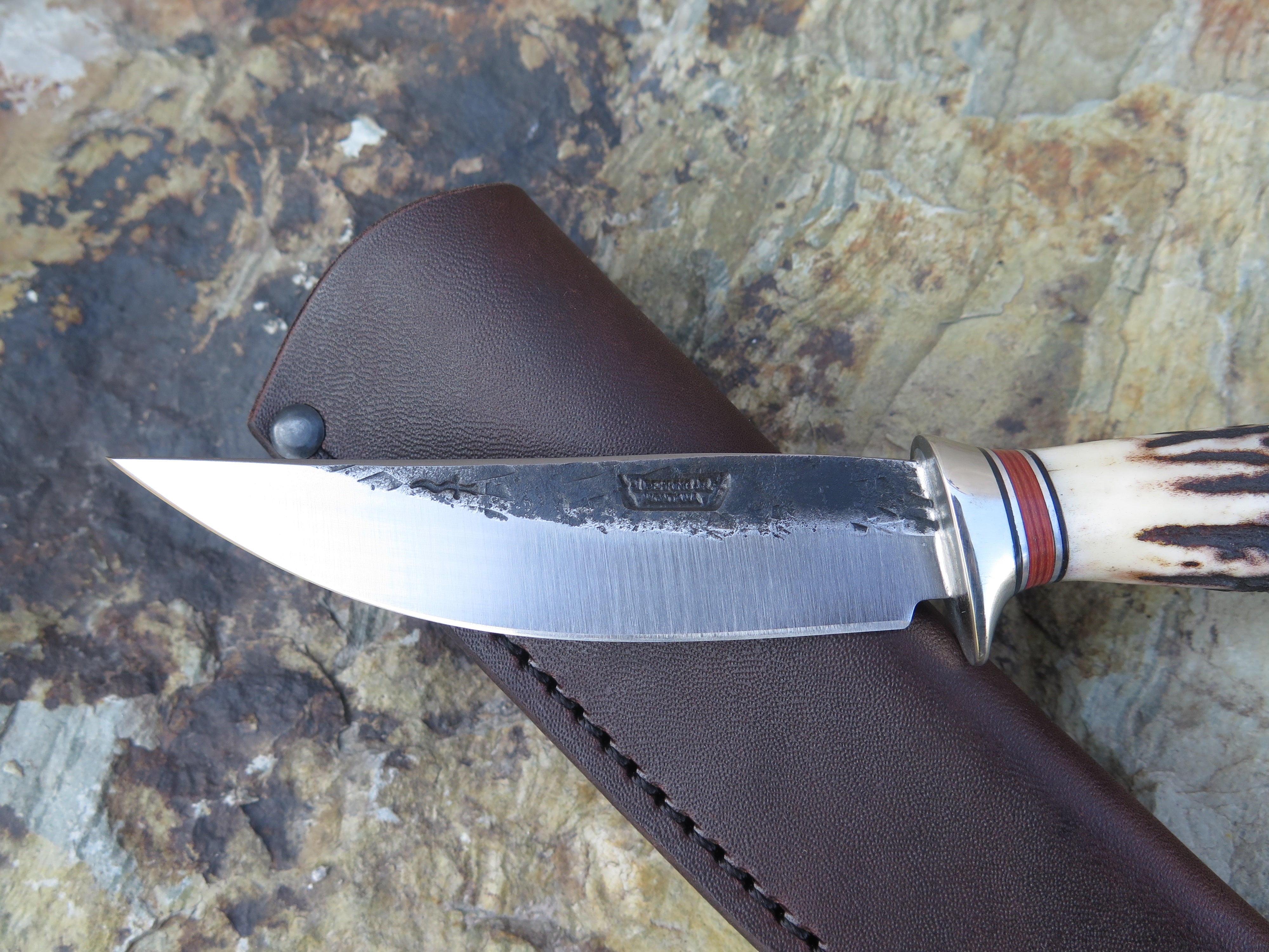 This instant classic Pintail from Behring Made© is hand forged from 1/8" thick high carbon 01 tool steel and it measures 4" from tip to guard with a razor sharp hollow grind and our hammermark finish. The nickel silver guard is soldered in place above black and maroon fiber with aluminum spacers atop a beautiful sambar stag handle that's pinned through the tang with aluminum. The overall length measures 8 1/2" and it comes in the shown belt pouch sheath- might just be the last knife you ever need!