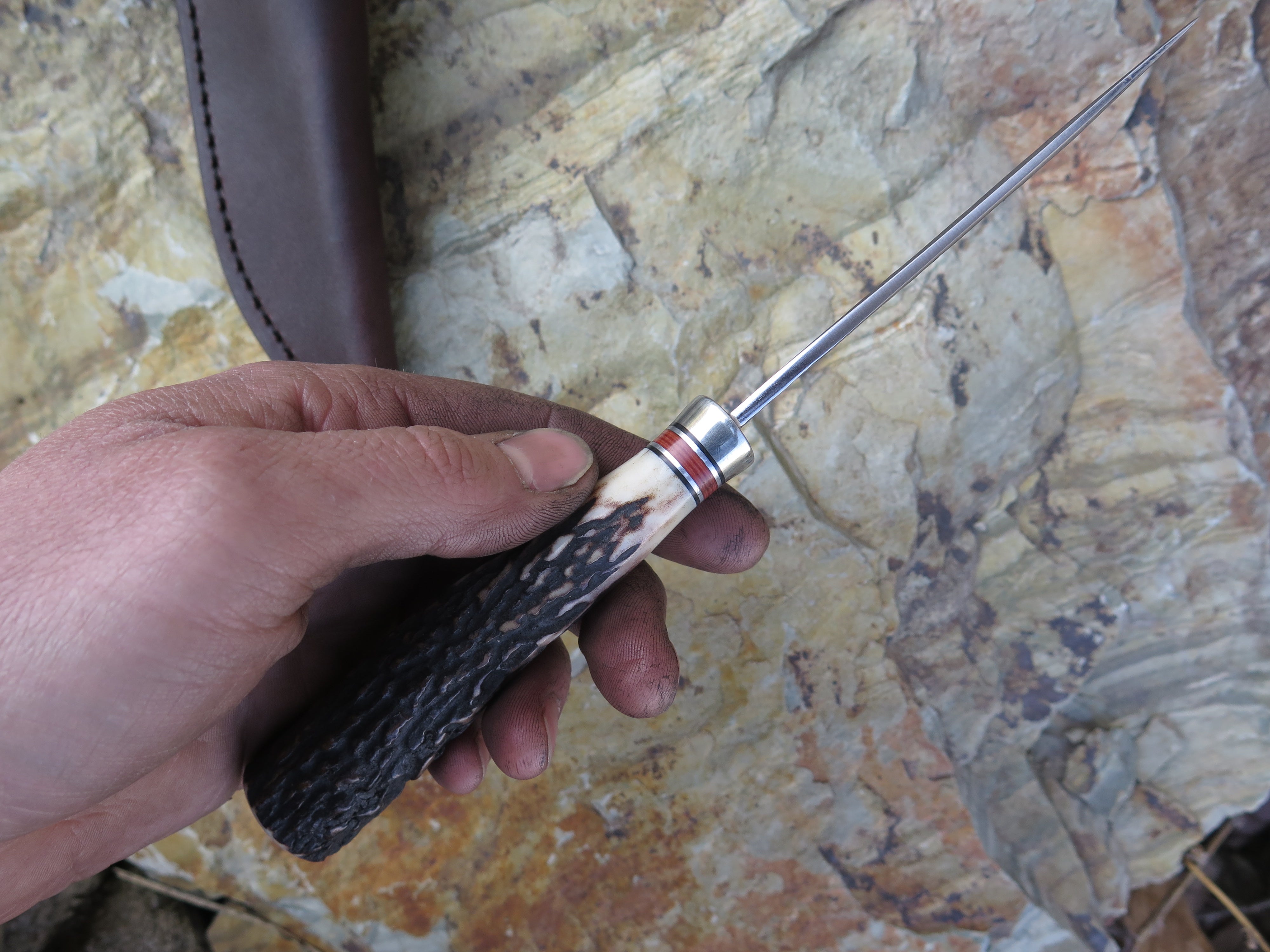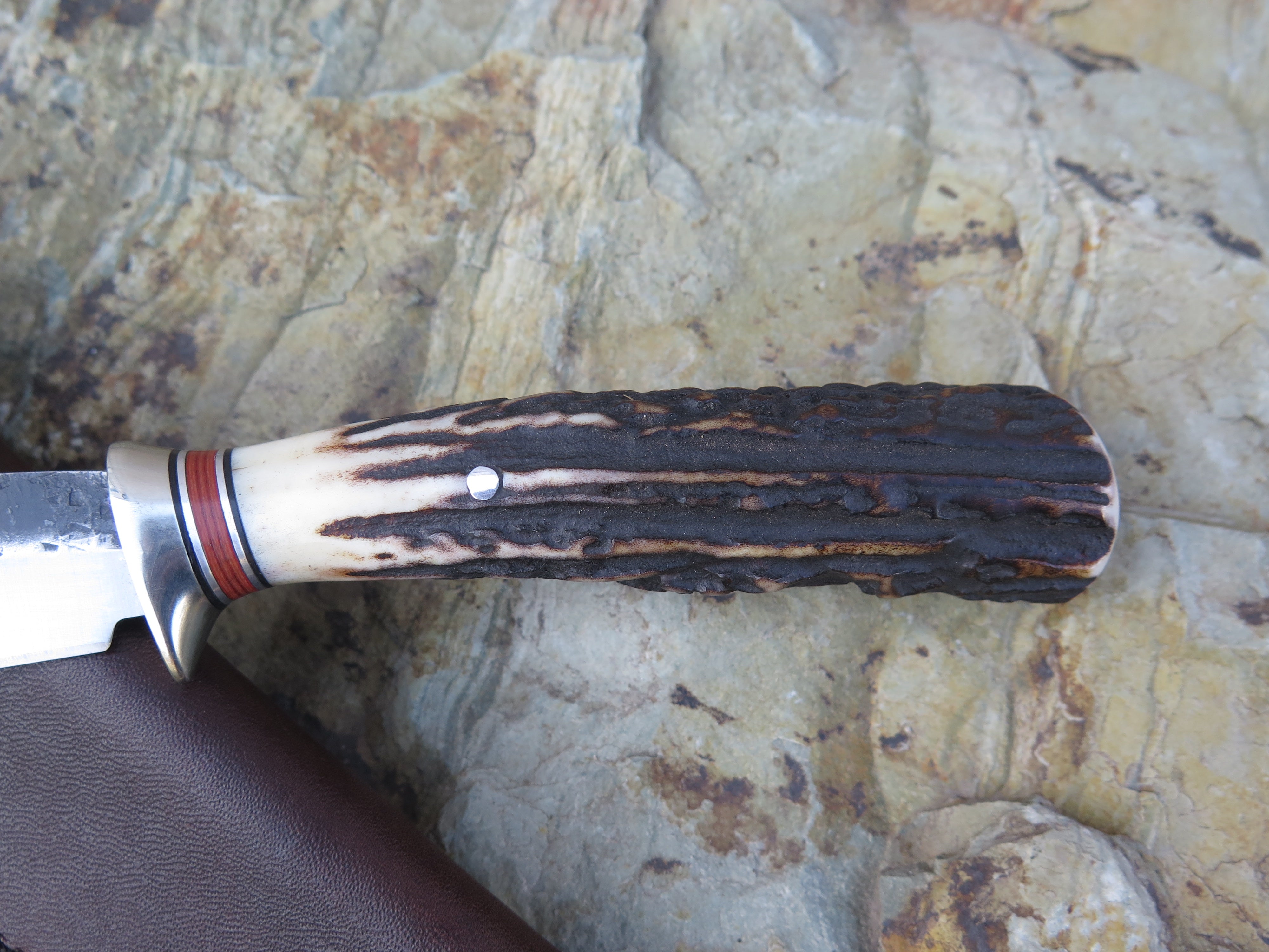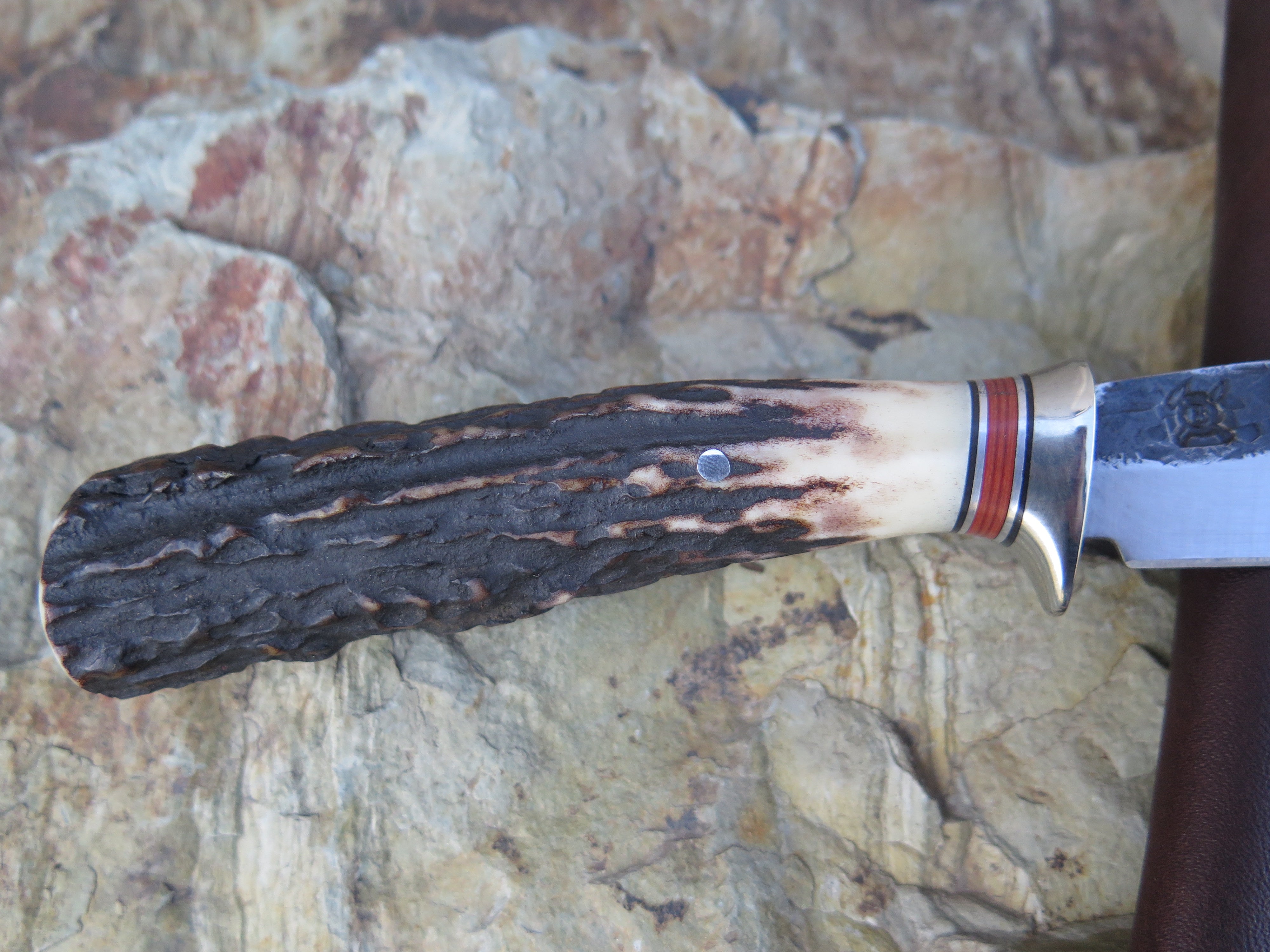 This instant classic Pintail from Behring Made© is hand forged from 1/8" thick high carbon 01 tool steel and it measures 4" from tip to guard with a razor sharp hollow grind and our hammermark finish. The nickel silver guard is soldered in place above black and maroon fiber with aluminum spacers atop a beautiful sambar stag handle that's pinned through the tang with aluminum. The overall length measures 8 1/2" and it comes in the shown belt pouch sheath- might just be the last knife you ever need!