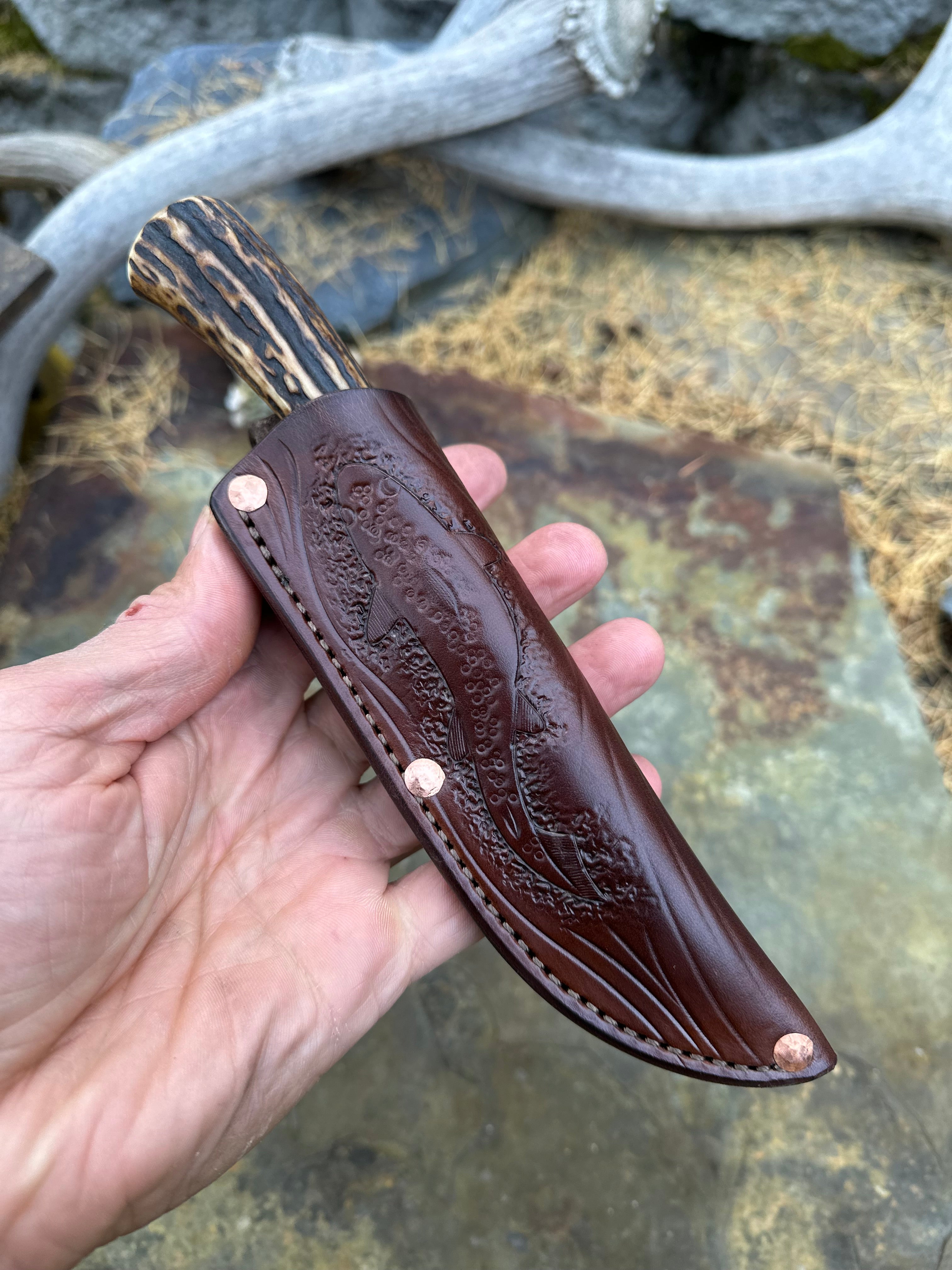 - Brown Pouch Sheath with Hand Carved Trout Theme, & Copper Rivets