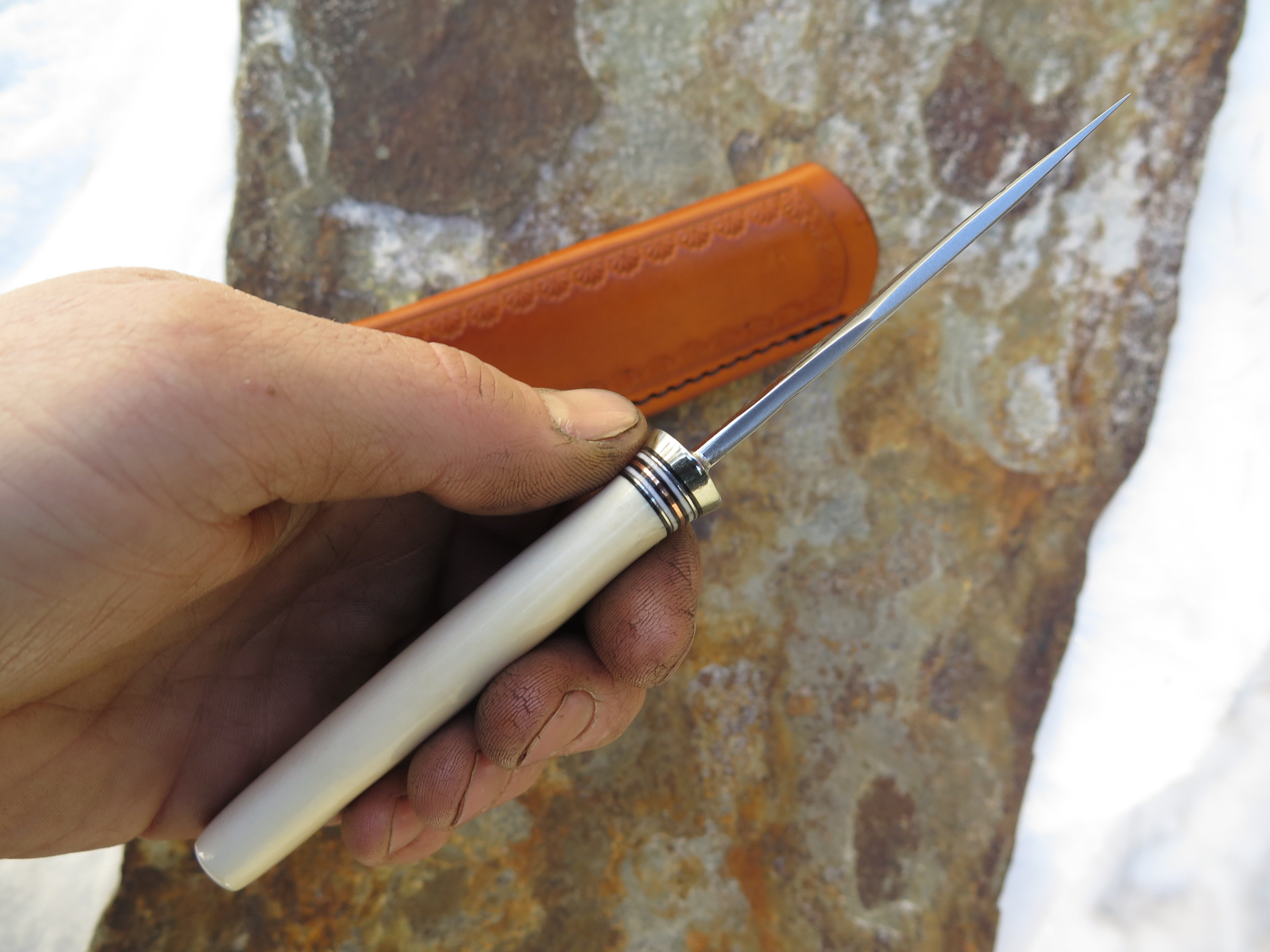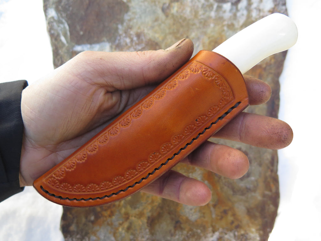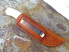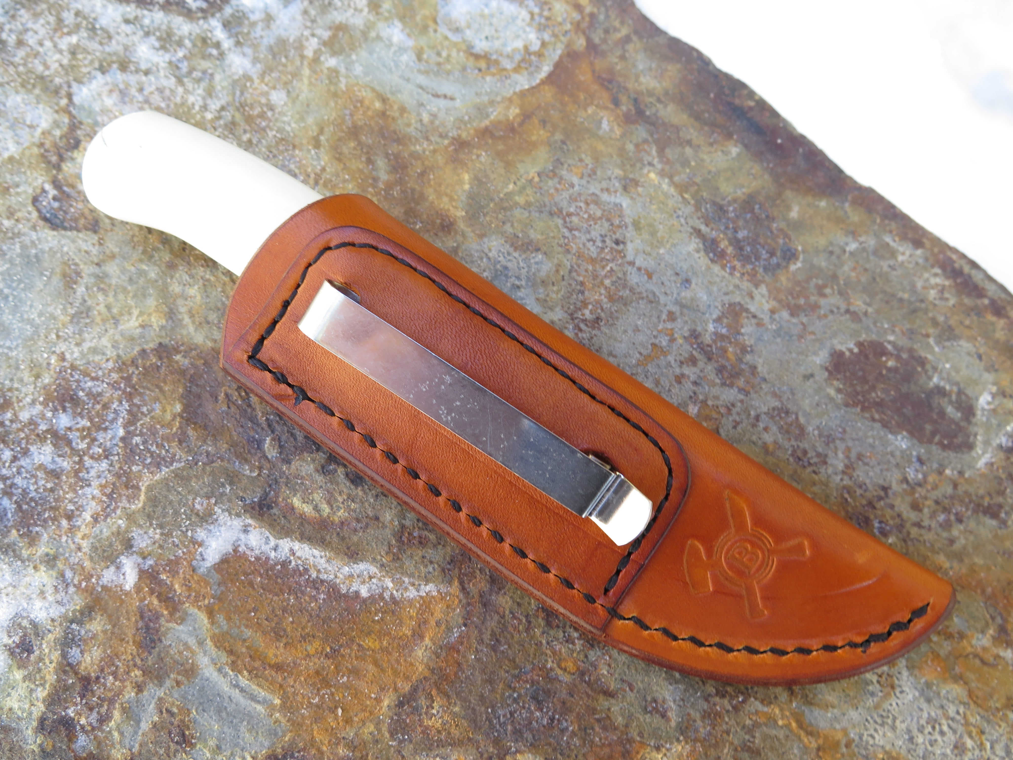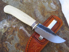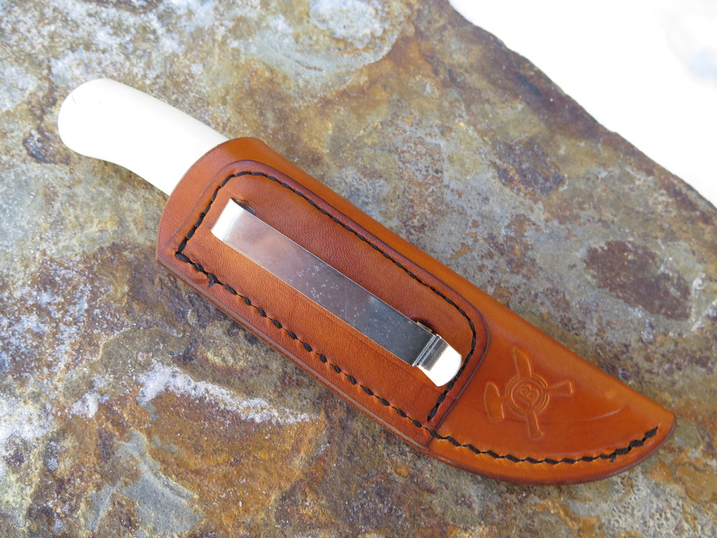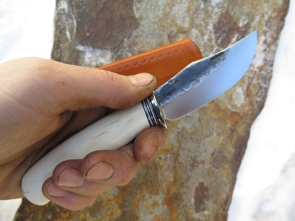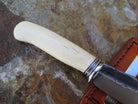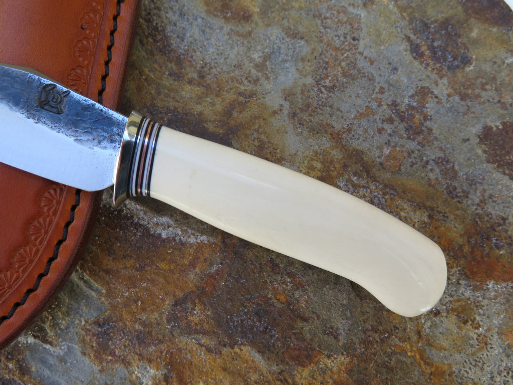 This cozy new Clip Point Pocket Knife from Behring Made© is hand forged from 1/8" thick high carbon 01 tool steel and it measures 3" from tip to guard with a razor sharp hollow grind with our hammermark finish. The nickel silver guard is soldered in place above black and white fiber, aluminum and copper spacers atop an ancient mammoth ivory handle that brings the overall to 6 3/4". To top it off this guy comes in a custom spring clip sheath designed to right in the hand pocket of your britches and we guarantee it for life!