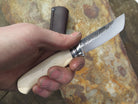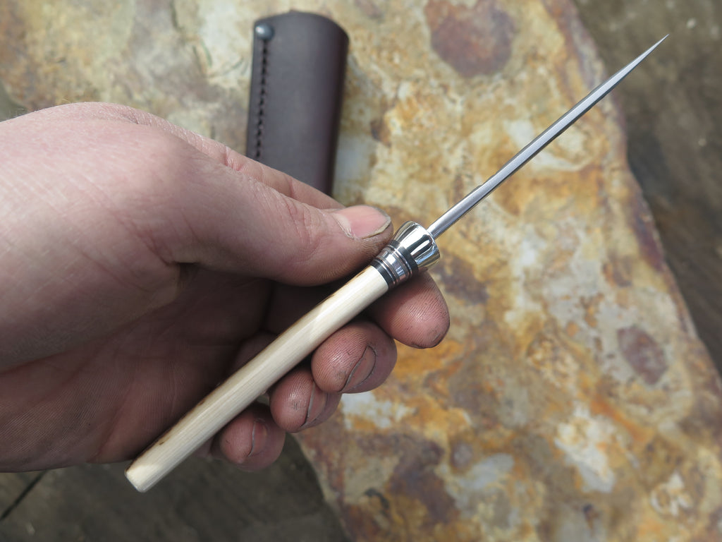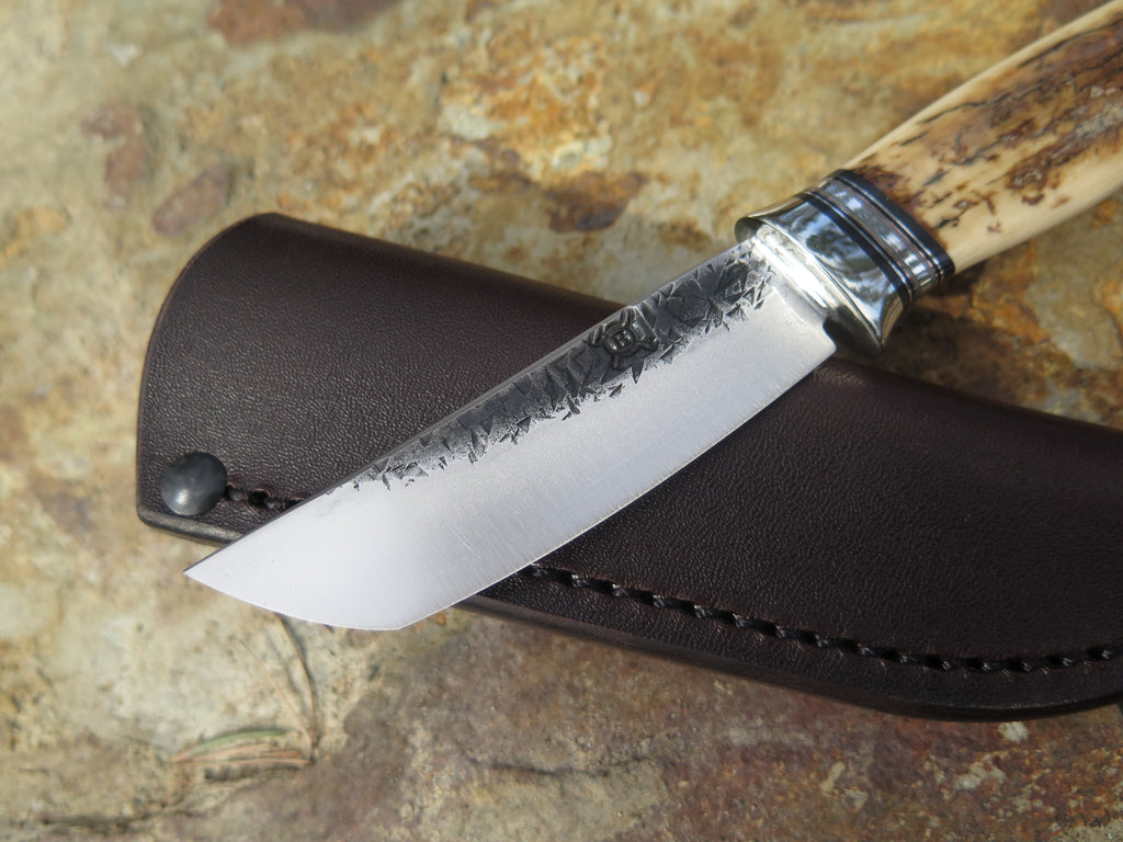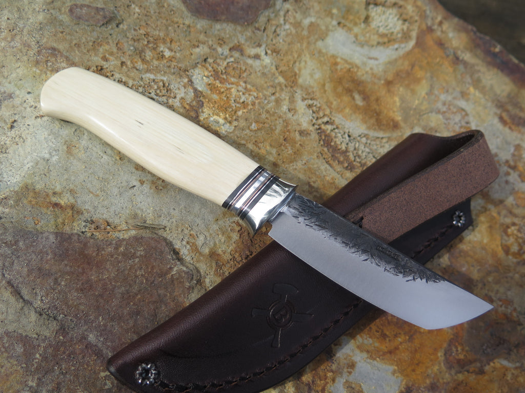 This awesome new Pocket Tanto from Behring Made© is hand forged from 1/8" thick high carbon 01 tool steel and it measures 3 1/4" from tip to guard with a razor sharp hollow grind and our hammermark finish. The nickel silver guard is soldered in place above black and grey fiber, copper and aluminum spacers as well as an astounding handle fashioned from an ancient mammoth ivory tusk. The overall length measures 6 7/8" and it comes in a classic leather belt pouch sheath, though substitutions can be made upon request.