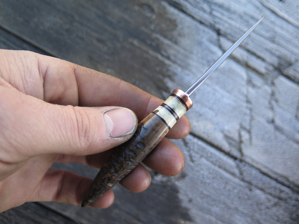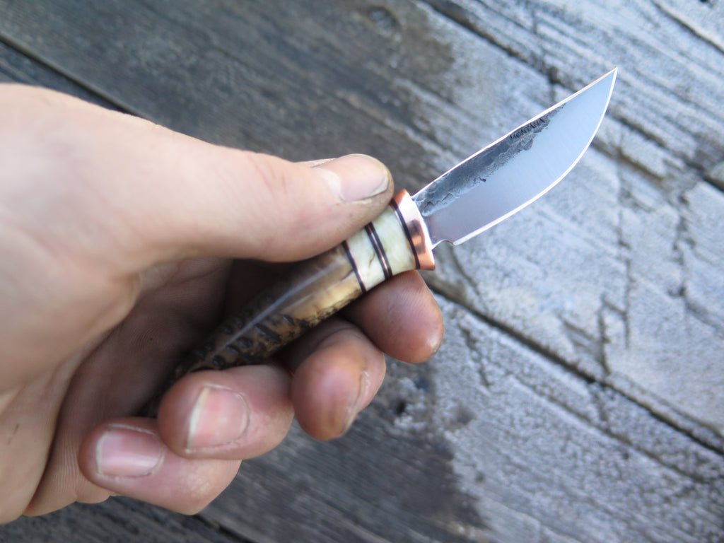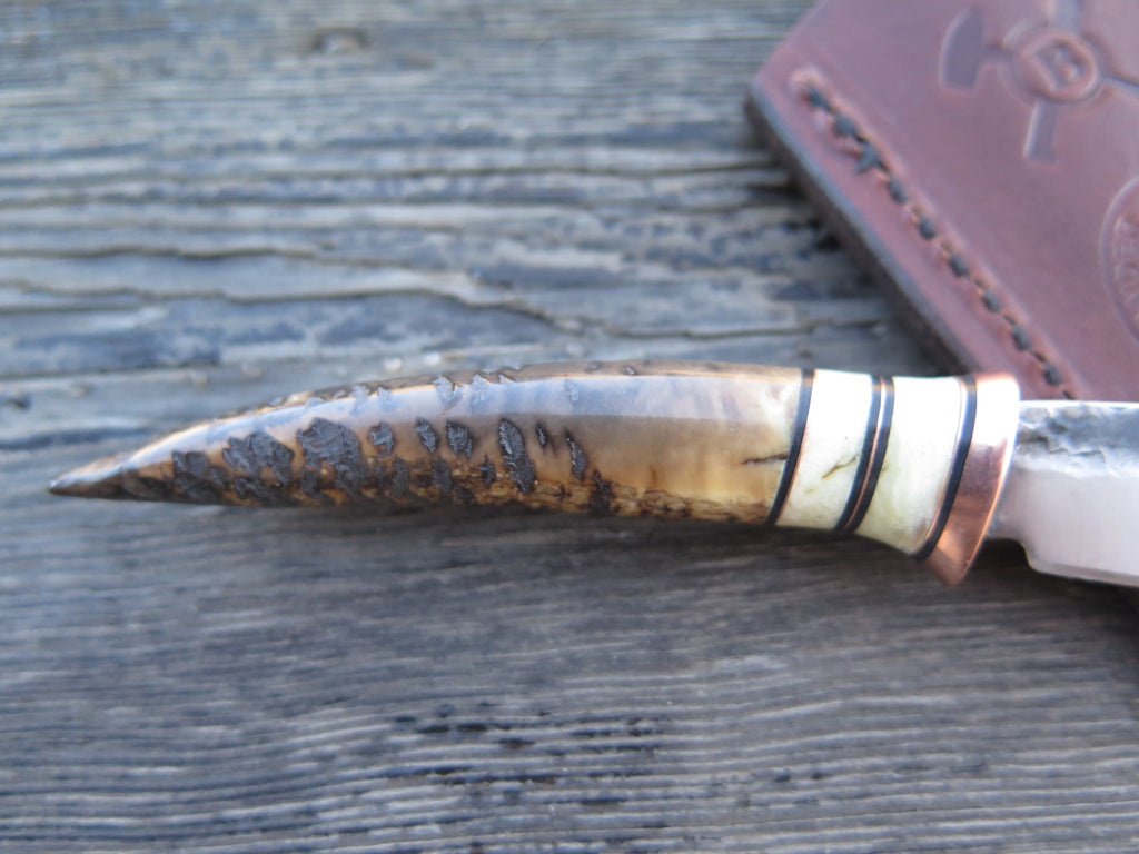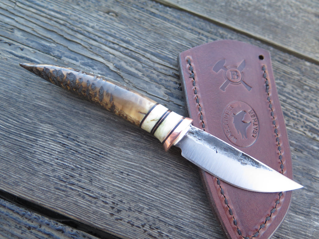 This beautiful new 5th pocket from Behring Made© is a sweet little knife that'll take a big bite! It's hand forged from 1/8" thick high carbon 01 tool steel and it measures 2 1/4" from tip to guard with a razor sharp hollow grind and our hammermark finish. The copper guard is soldered in place above black fiber, copper and two musk ox boss spacers. The handle is an artifact walrus ivory ice probe used by Inuit tribes hundreds (if not thousands) of years ago and overall length measures 5 1/2" and it comes in the shown leather sleeve for the 5th pocket of your britches.