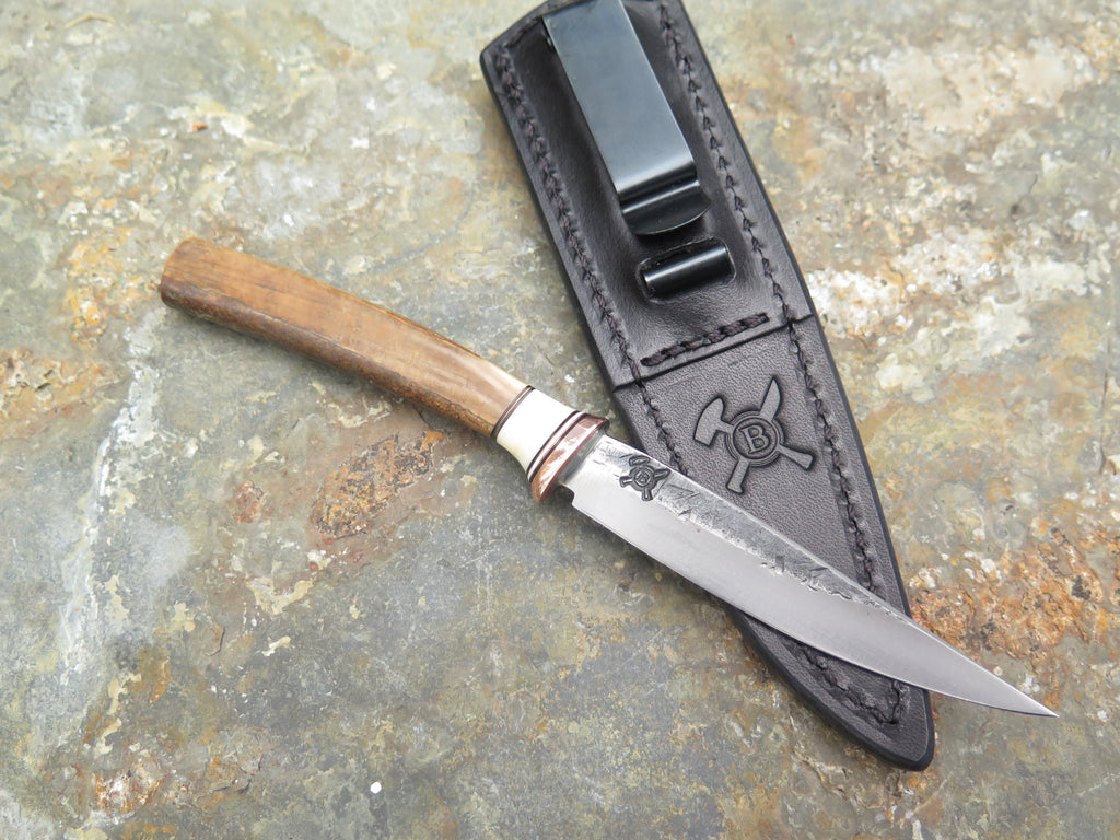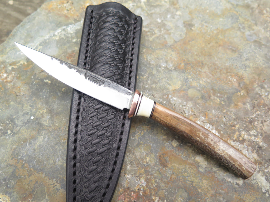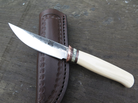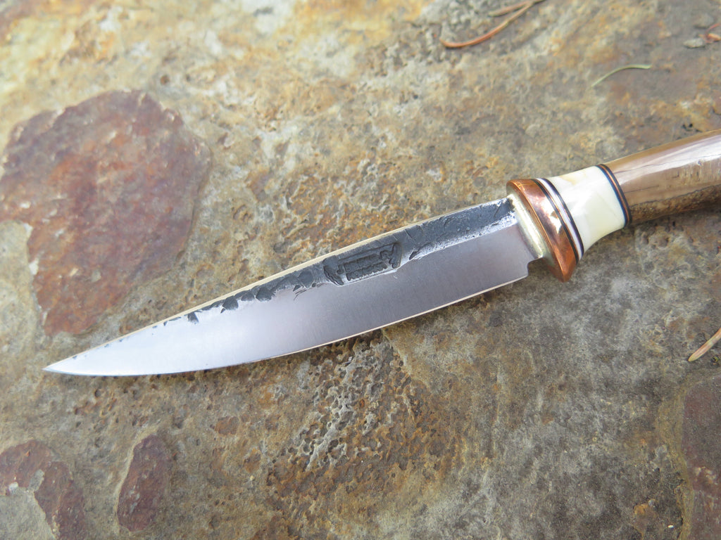 This outstanding new Behring Made© pocket knife is hand forged from 1/8" thick high carbon 01 tool steel and it measures 3 1/2" from tip to guard with a razor sharp hollow grind and our hammermark finish. The copper guard is soldered in place above black and white fiber, copper and a fossil walrus tooth spacer which top an artifact walrus ivory handle. The overall length measures 7 1/4" and it will come in a custom Warlander Leather pocket knife sheath.