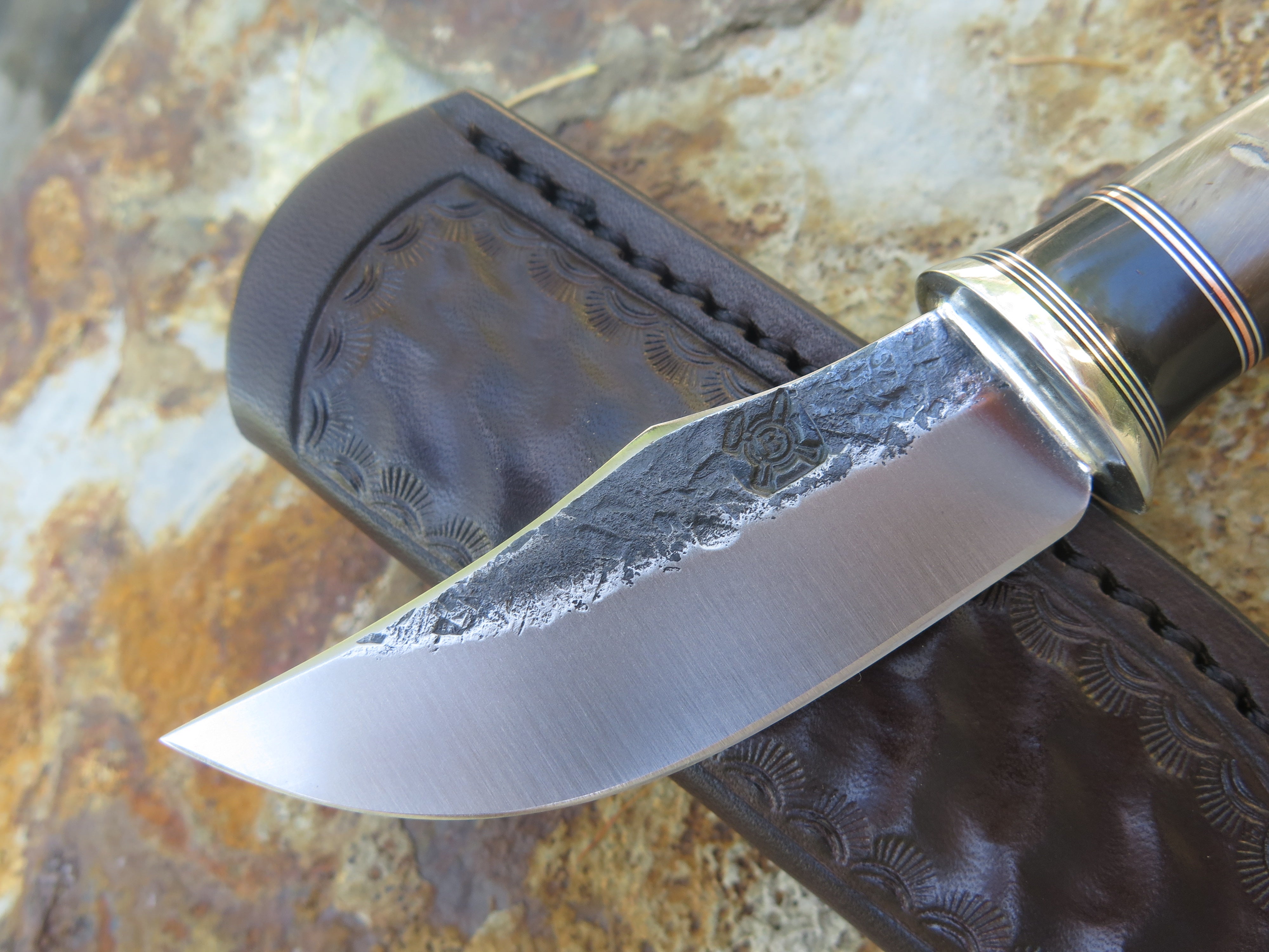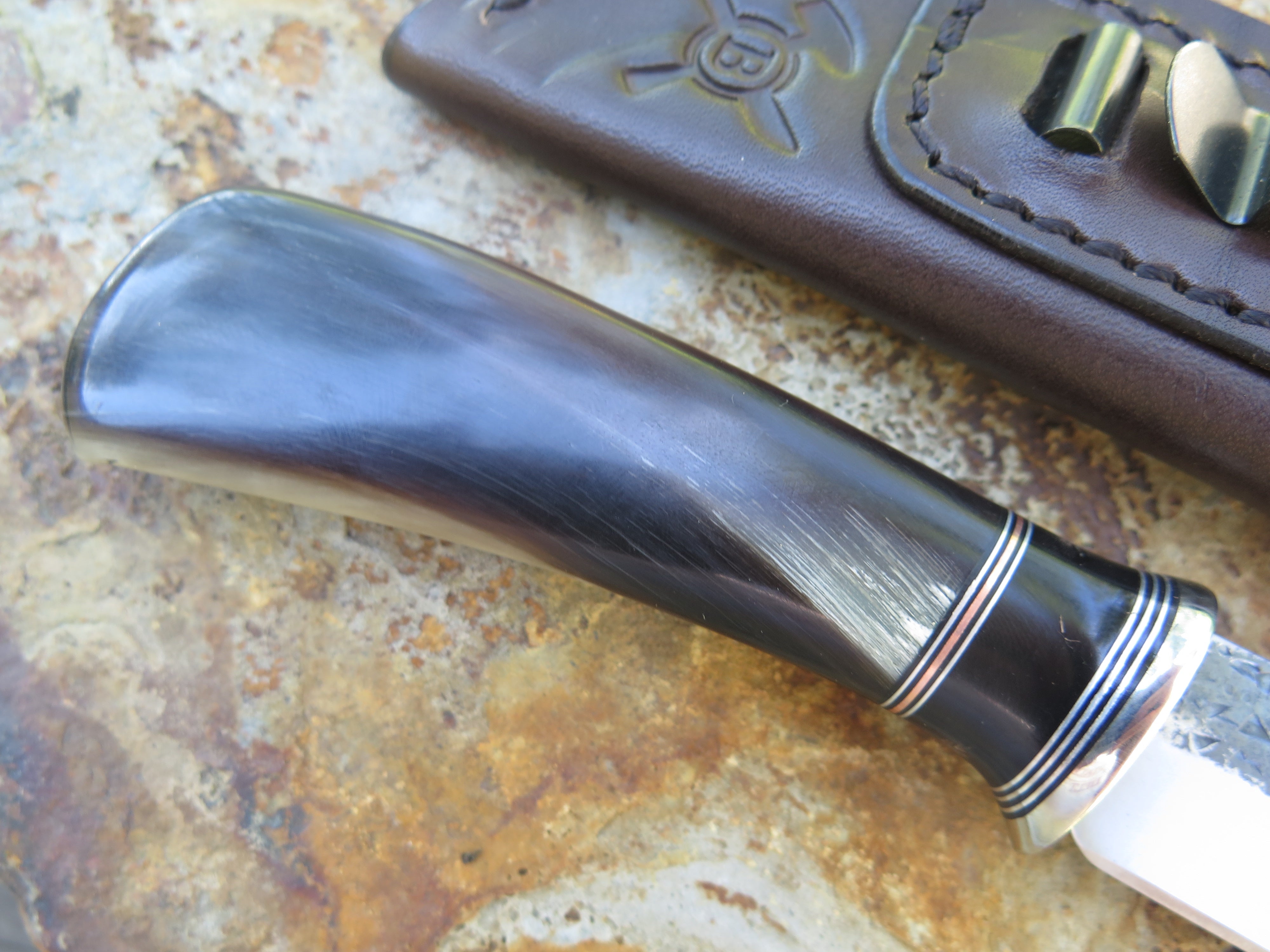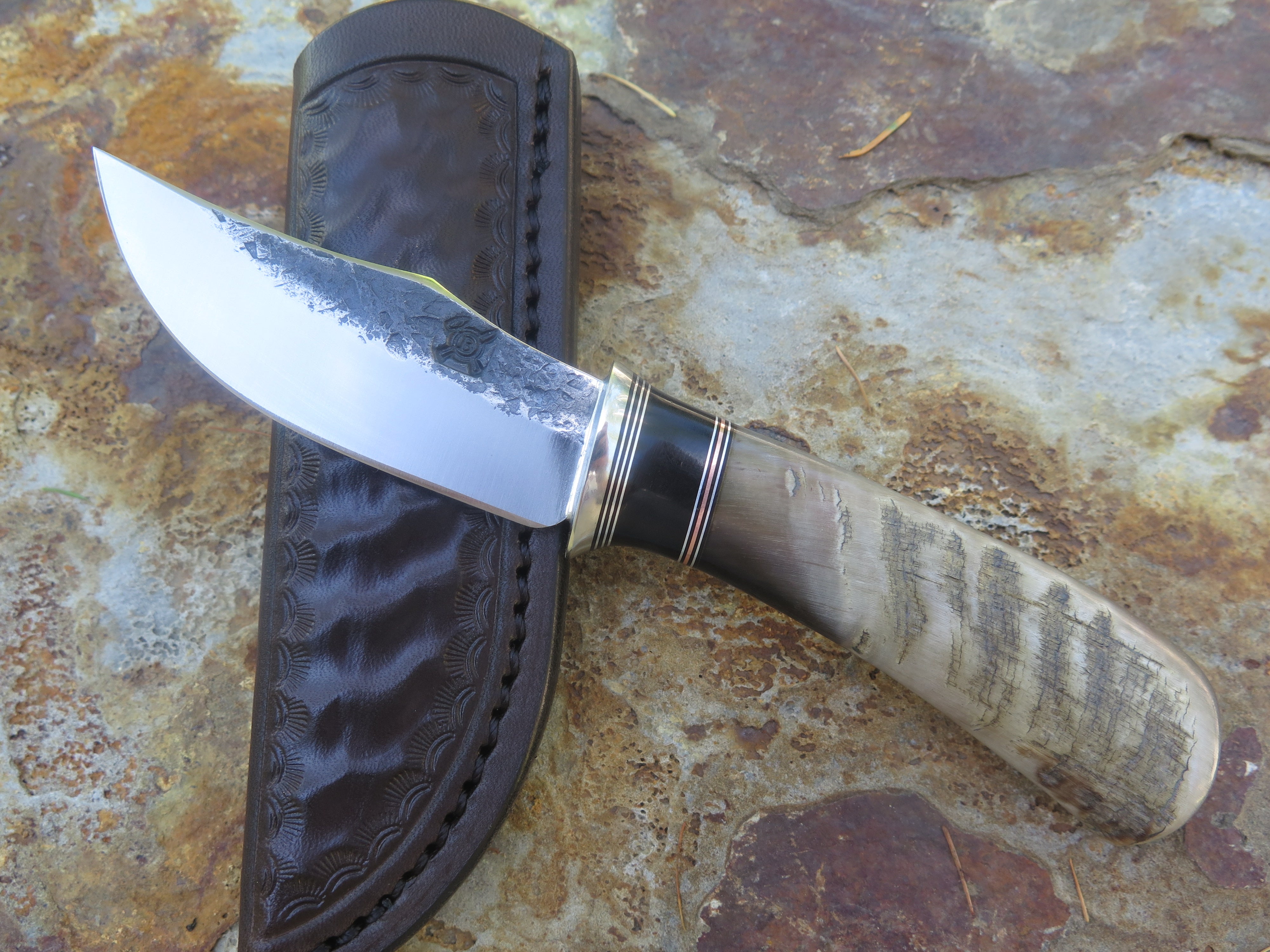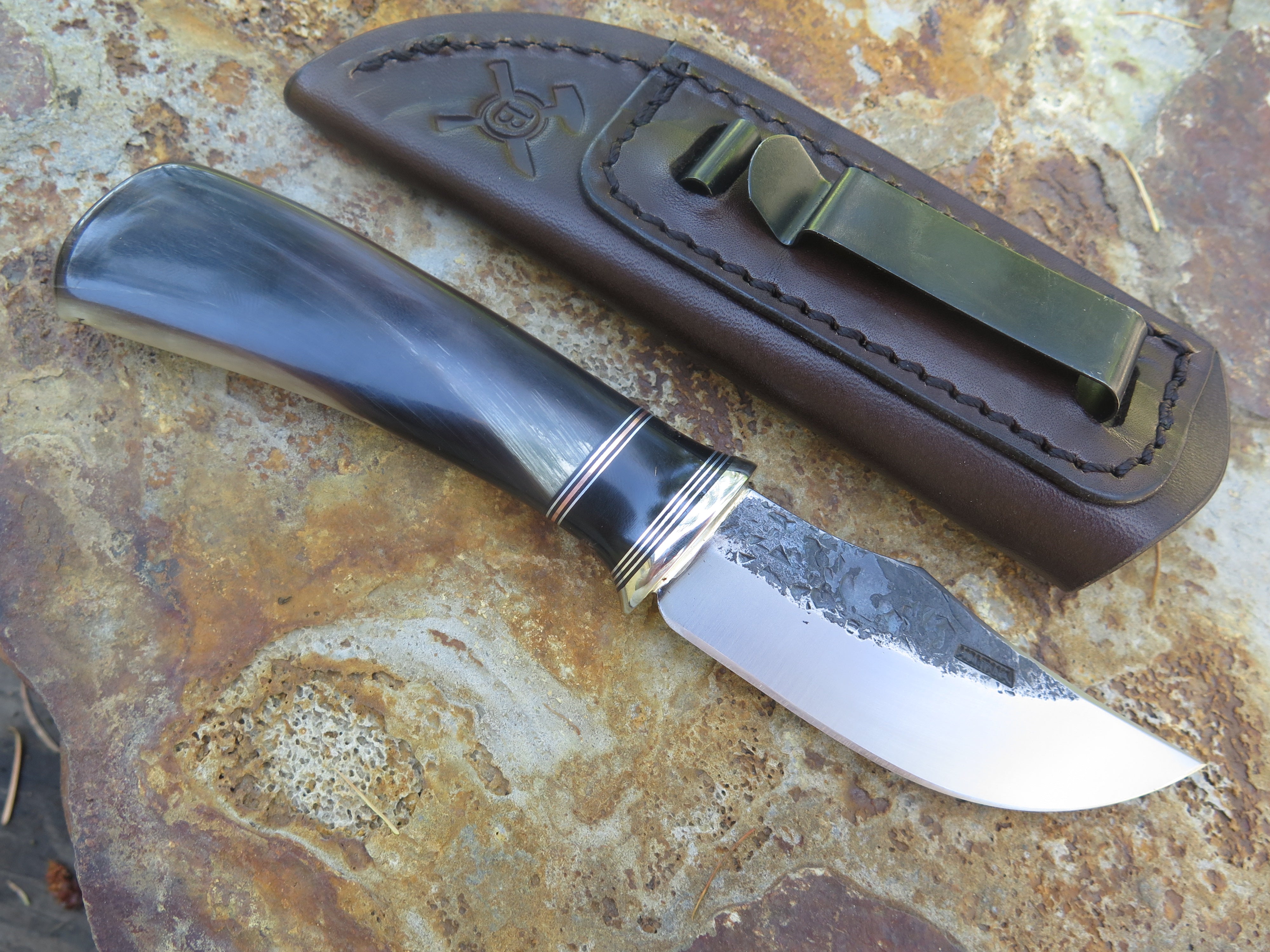 This beautiful new Pocket Knife from Behring Made© is hand forged from 1/8" thick high carbon 01 tool steel and it measures 3 1/4" from tip to guard with a razor sharp hollow grind and our hammermark finish. The nickel silver guard is soldered in place above black fiber, aluminum, copper and a remarkable black figure musk ox spacer which tops the high figure big horn sheep handle. The overall length measures 6 7/8" and it comes in a sheep tooled pocket clip sheath.